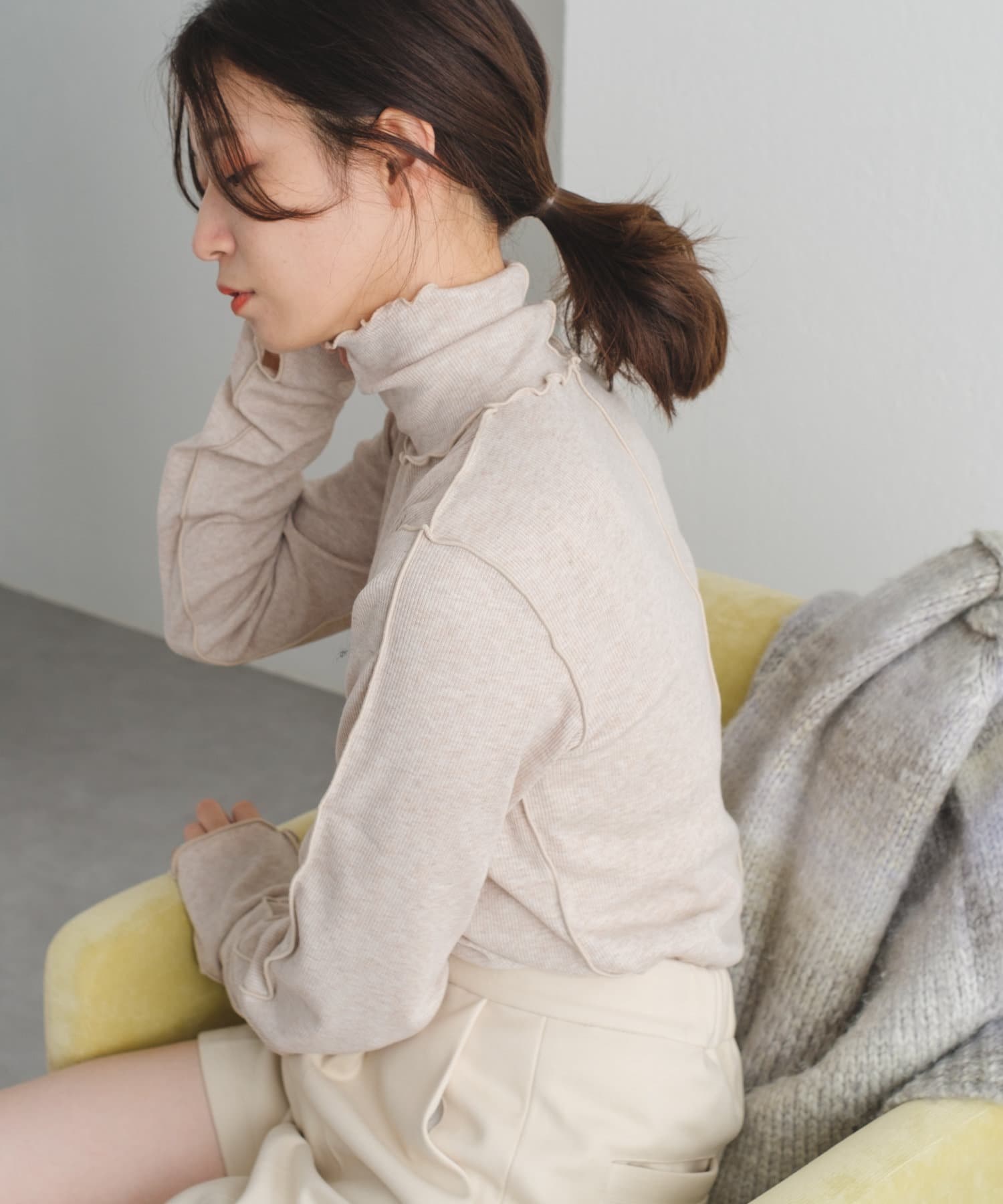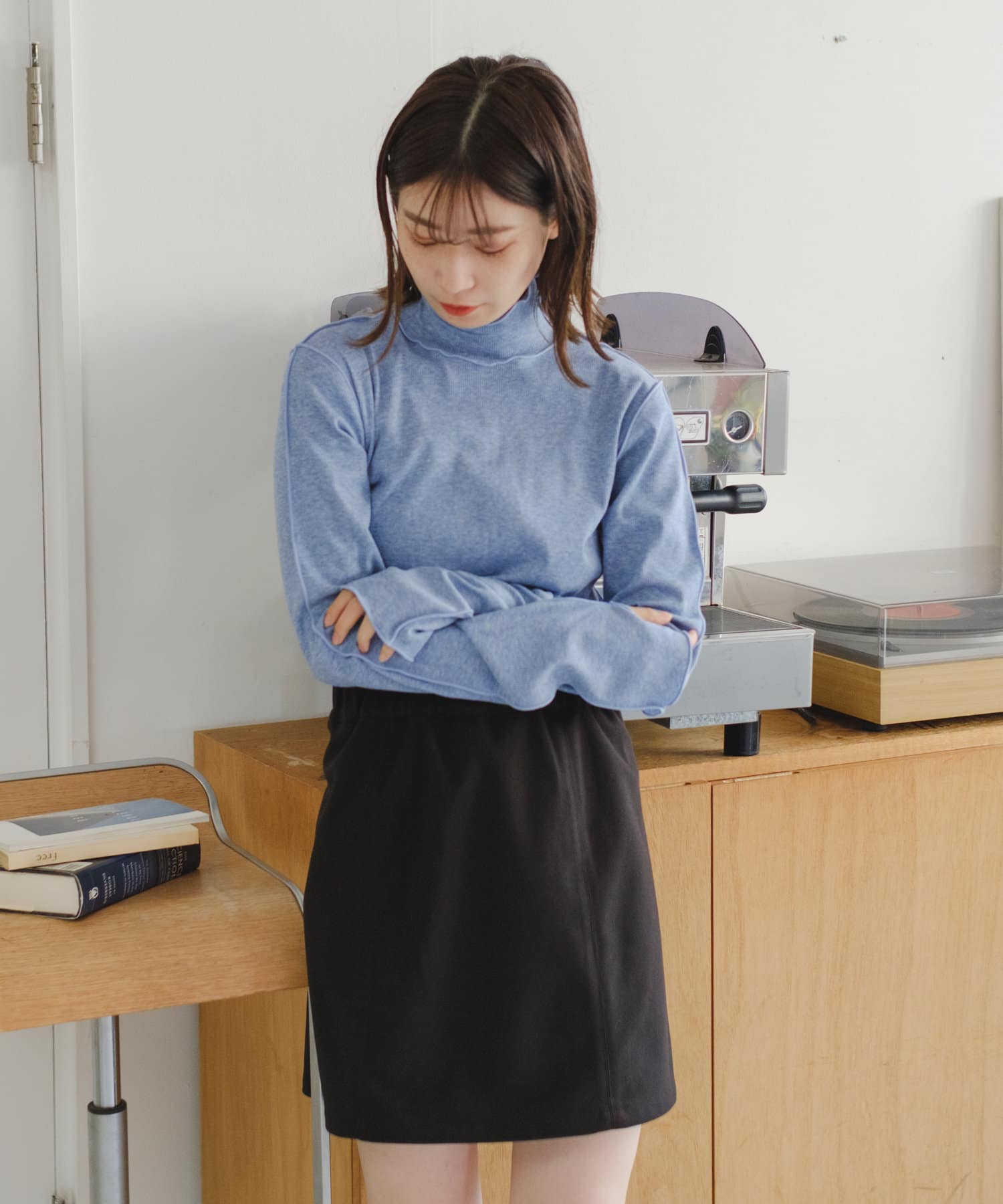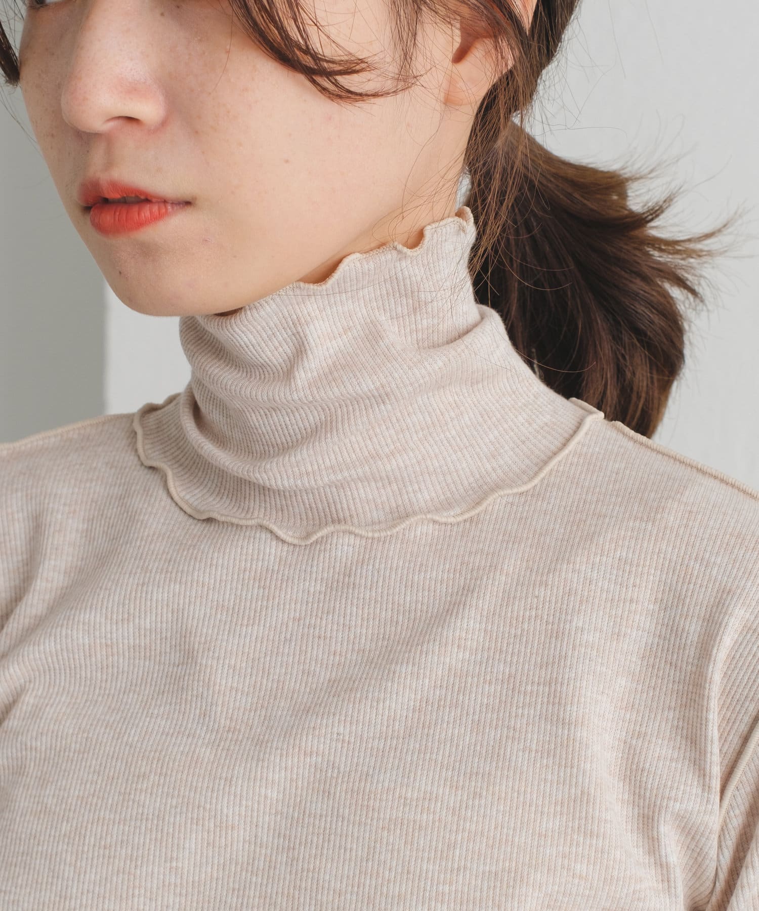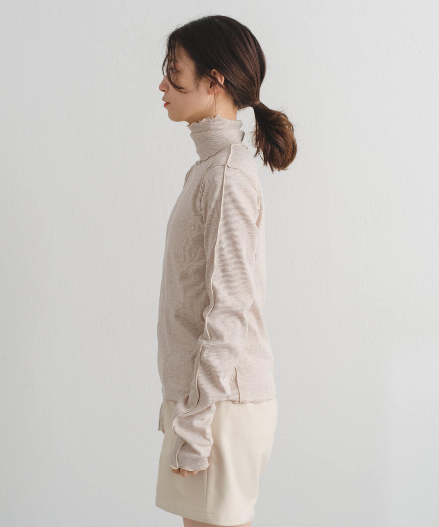 薄手な生地とハイネックを活かしてカーディガン、ニット、スウェット、ワンピースなどの様々なシーンのインナーとしてお使い頂けます。