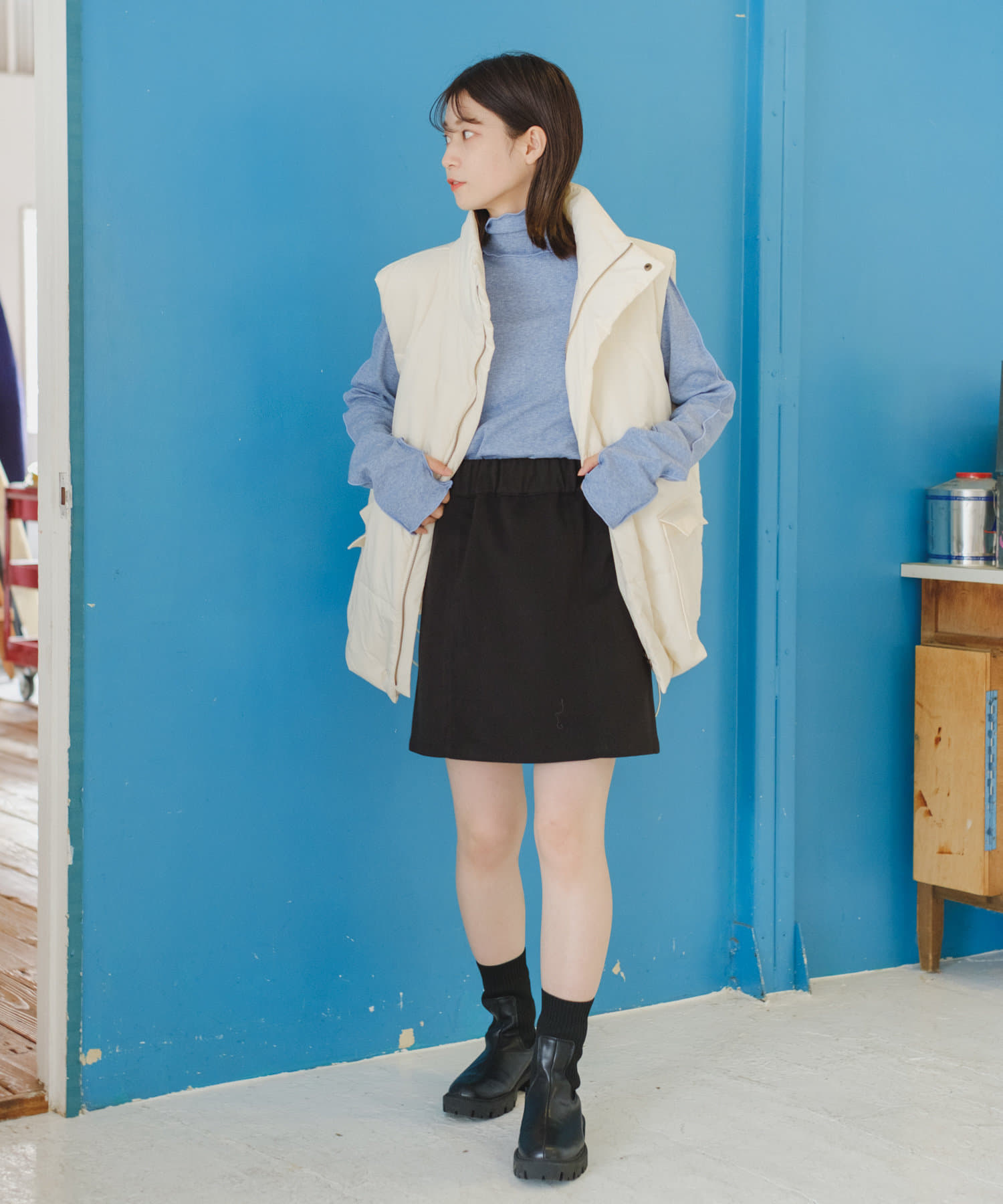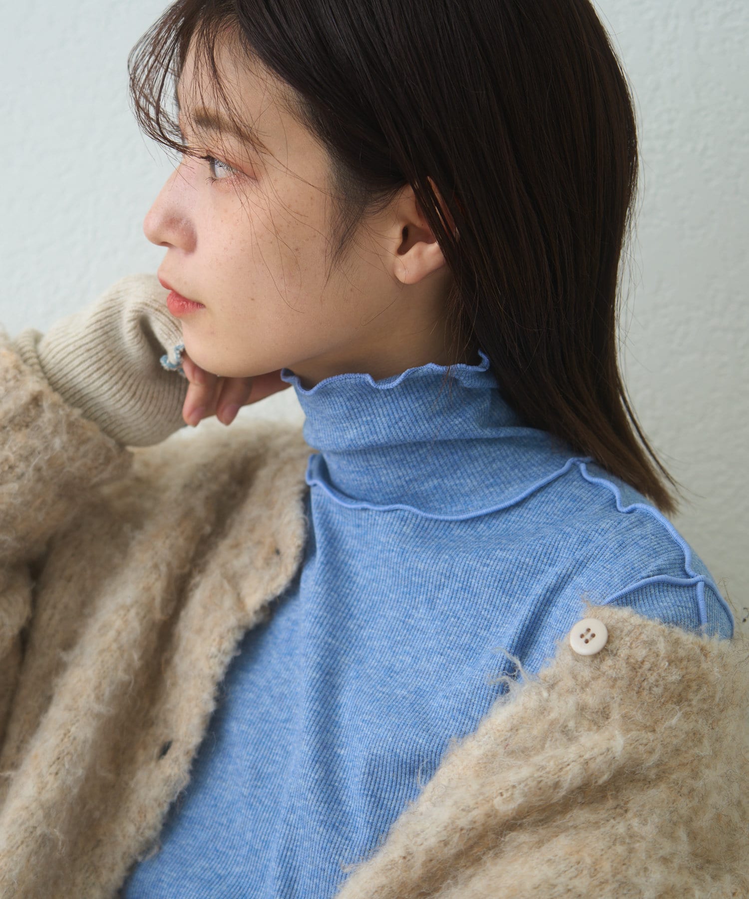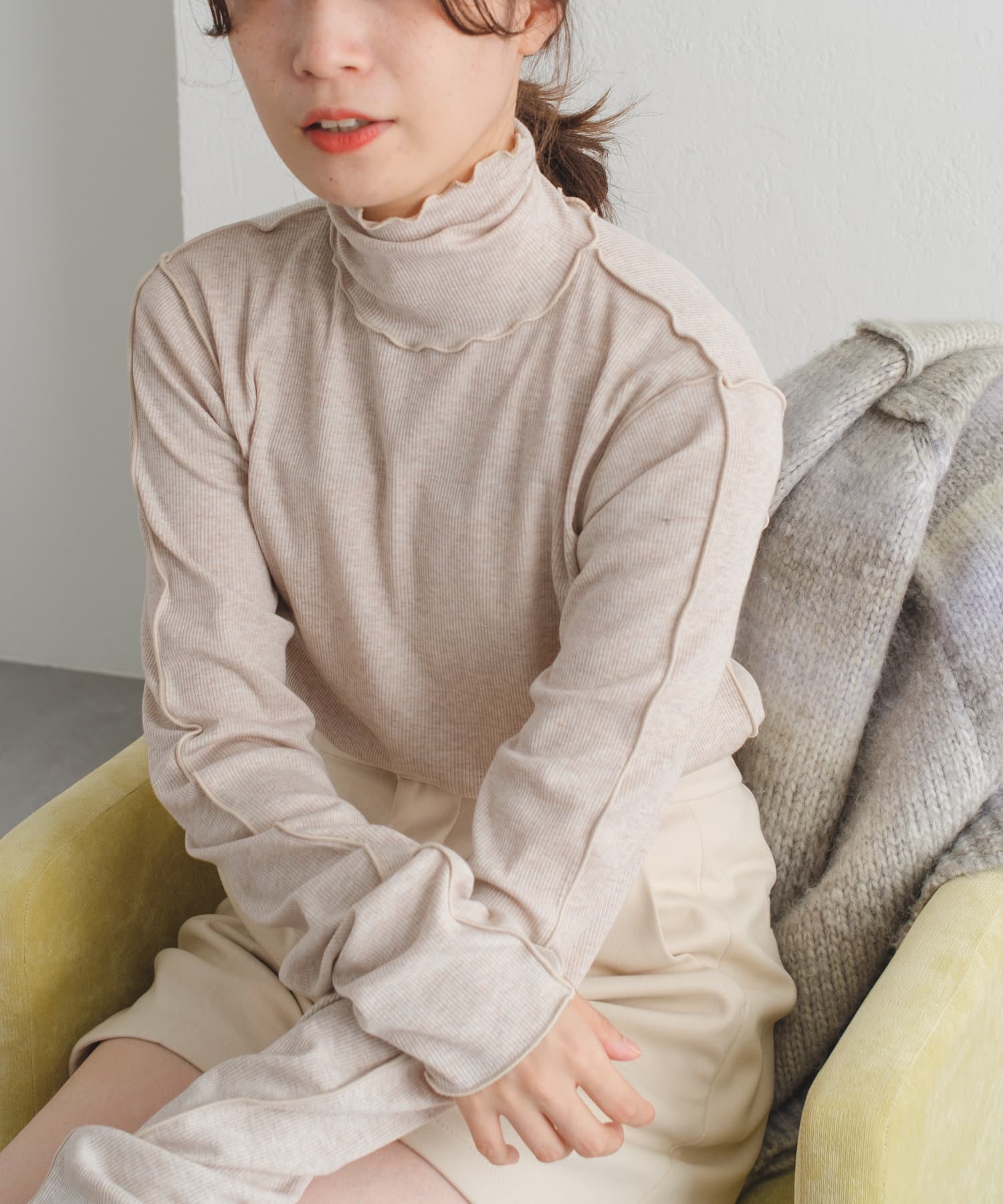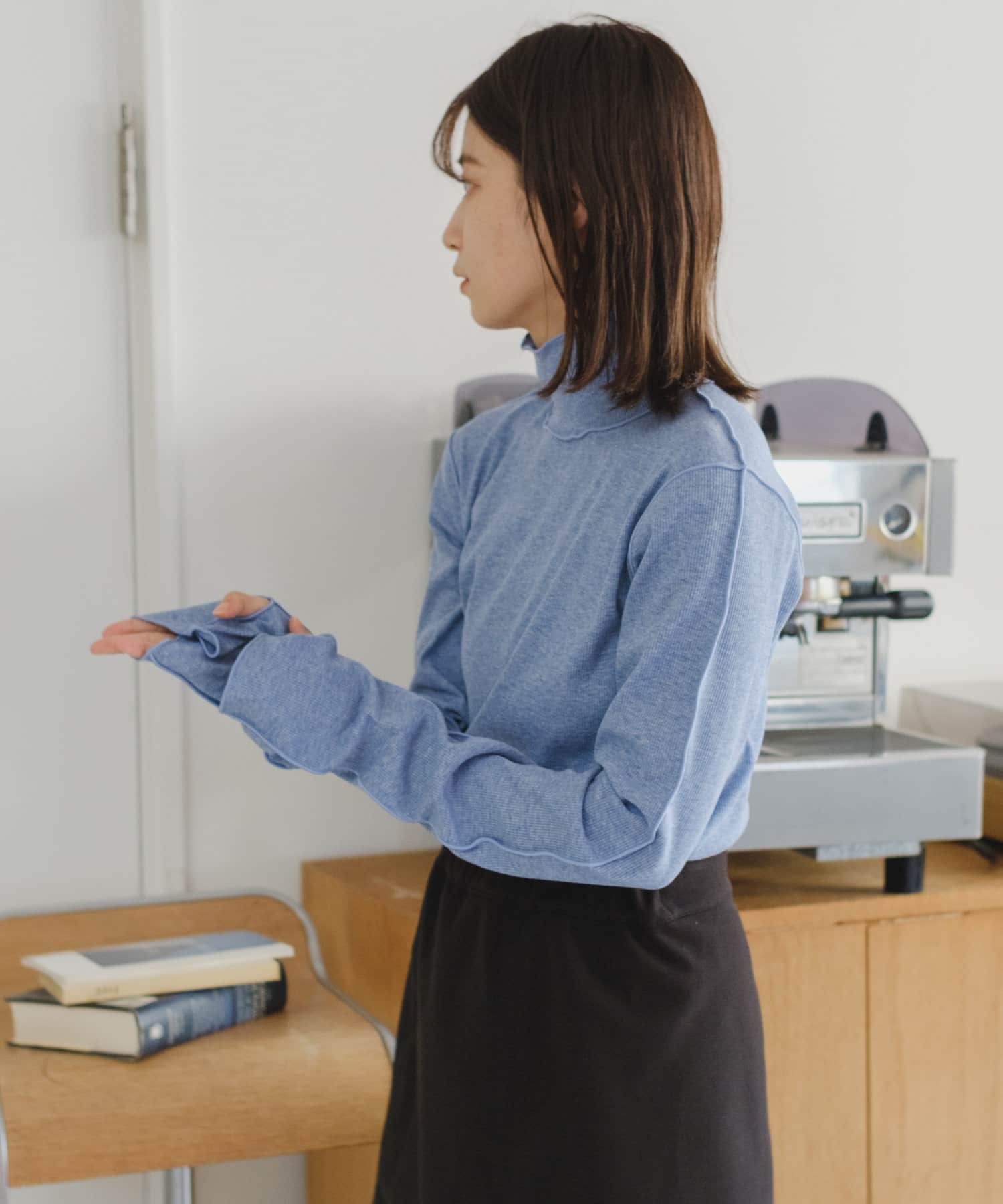 薄手な生地とハイネックを活かしてカーディガン、ニット、スウェット、ワンピースなどの様々なシーンのインナーとしてお使い頂けます。