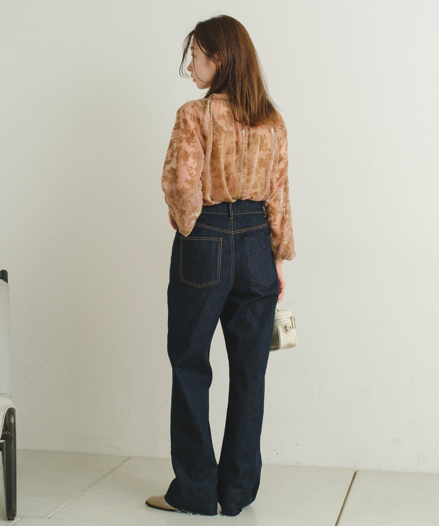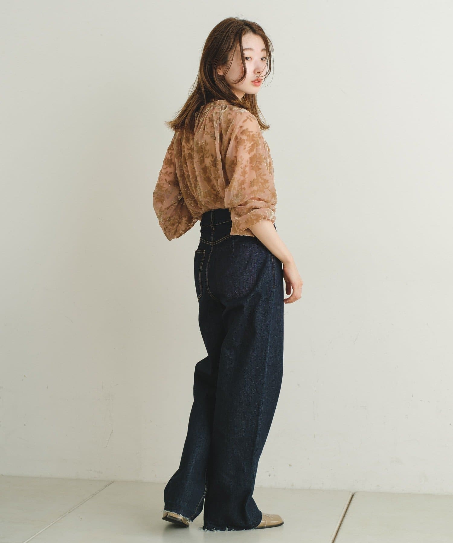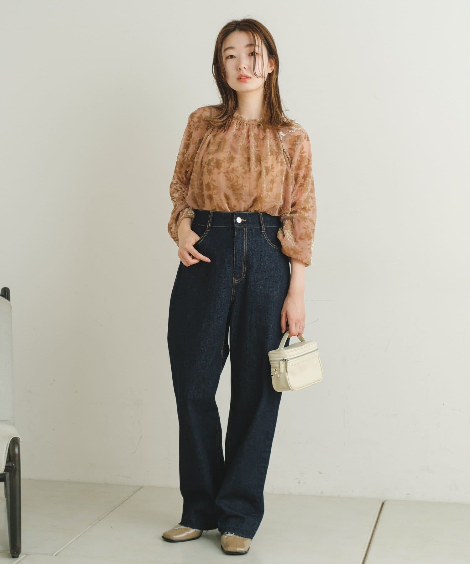 ブラウスが透け感があり女性らしい印象なので、シンプルにデニム合わせがおすすめです。