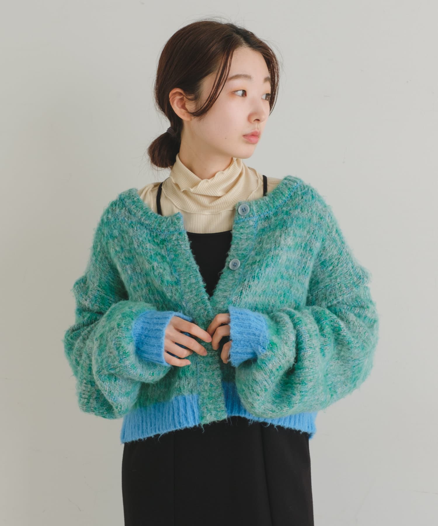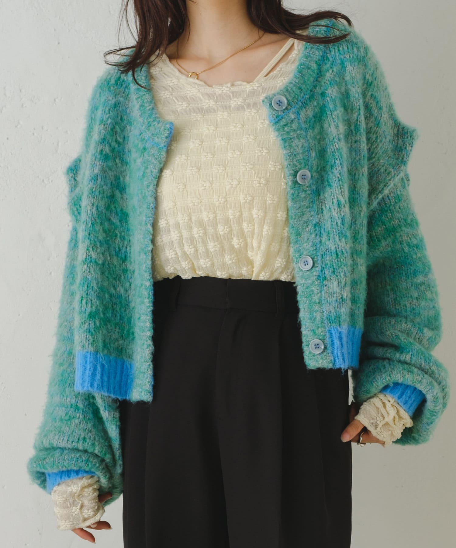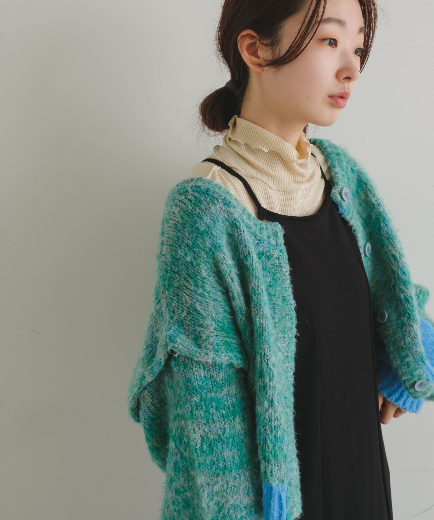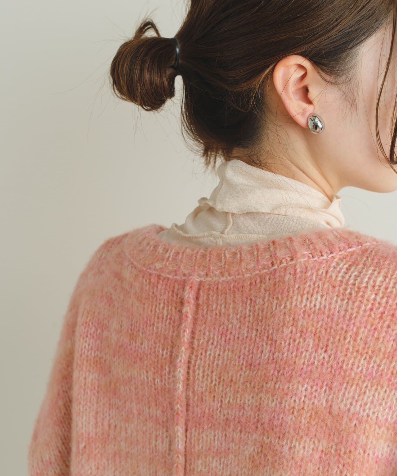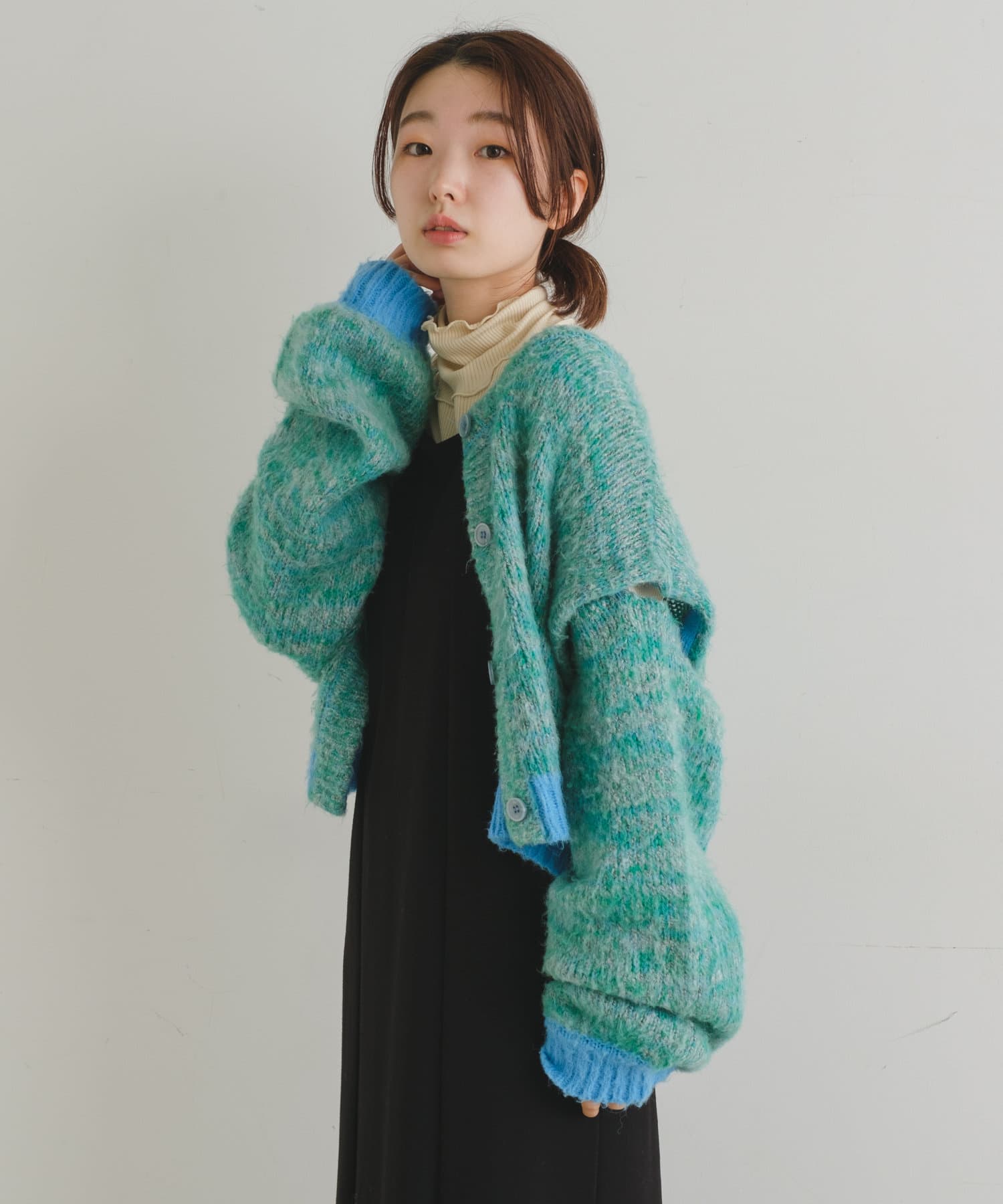 前後どちらでもお使い頂けるデザインなので、ボタンを前にするとカーディガンとして着用可能、