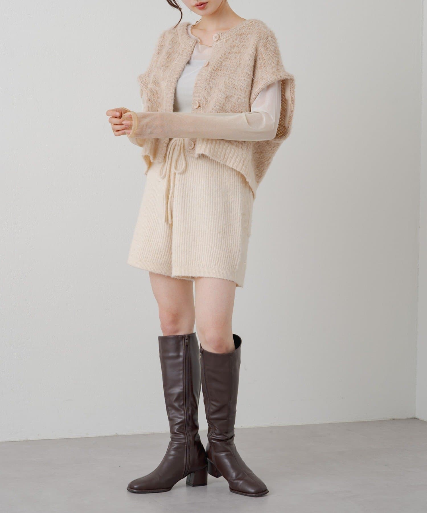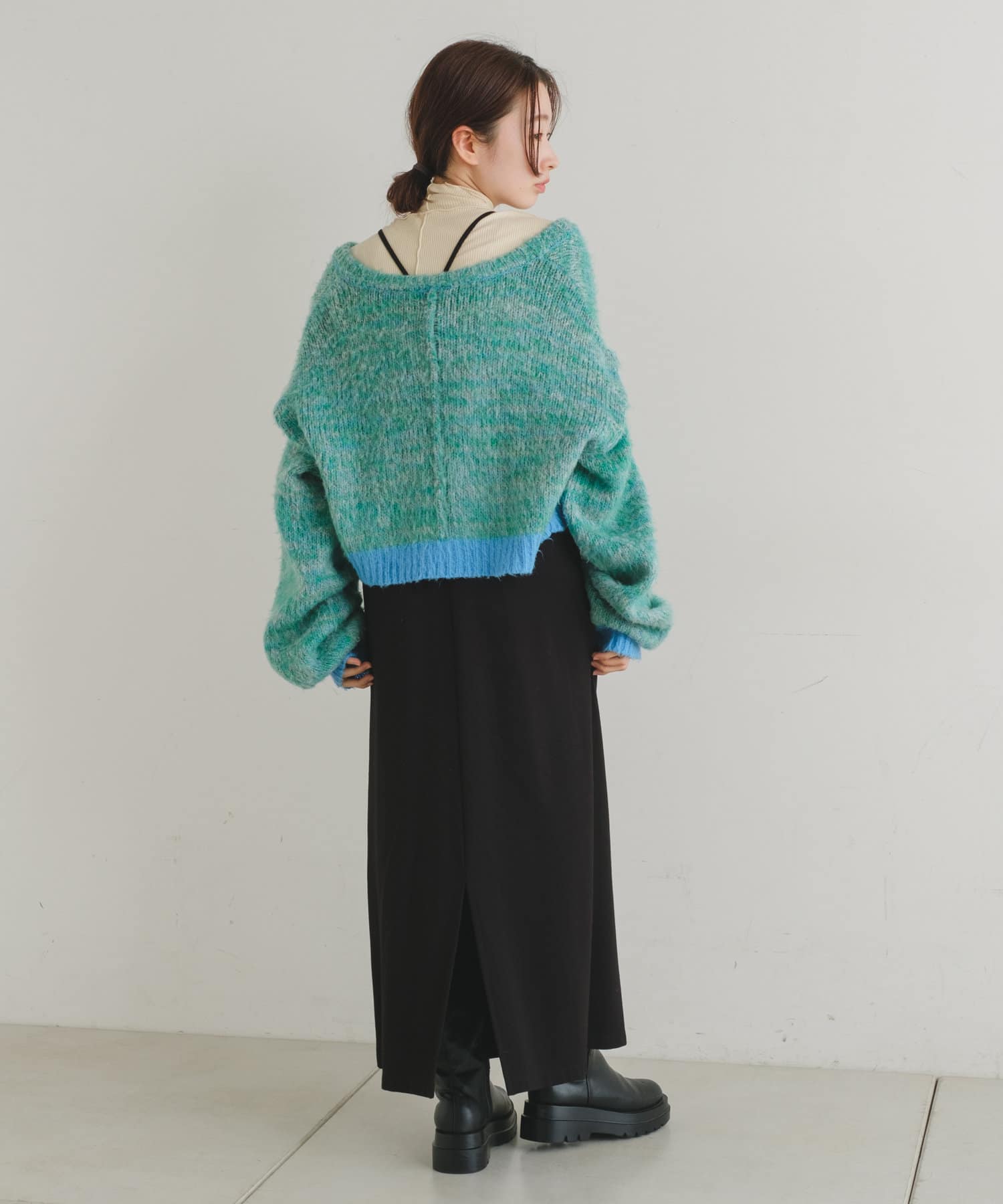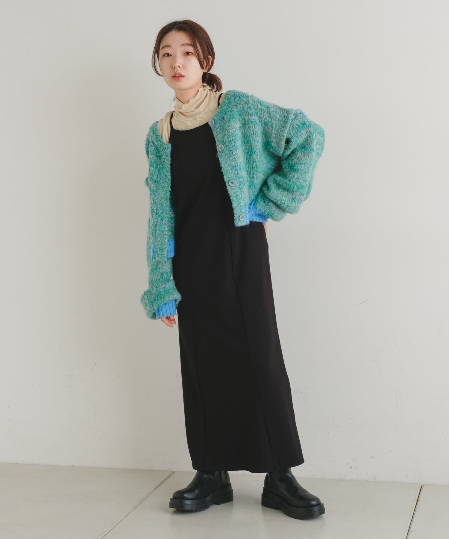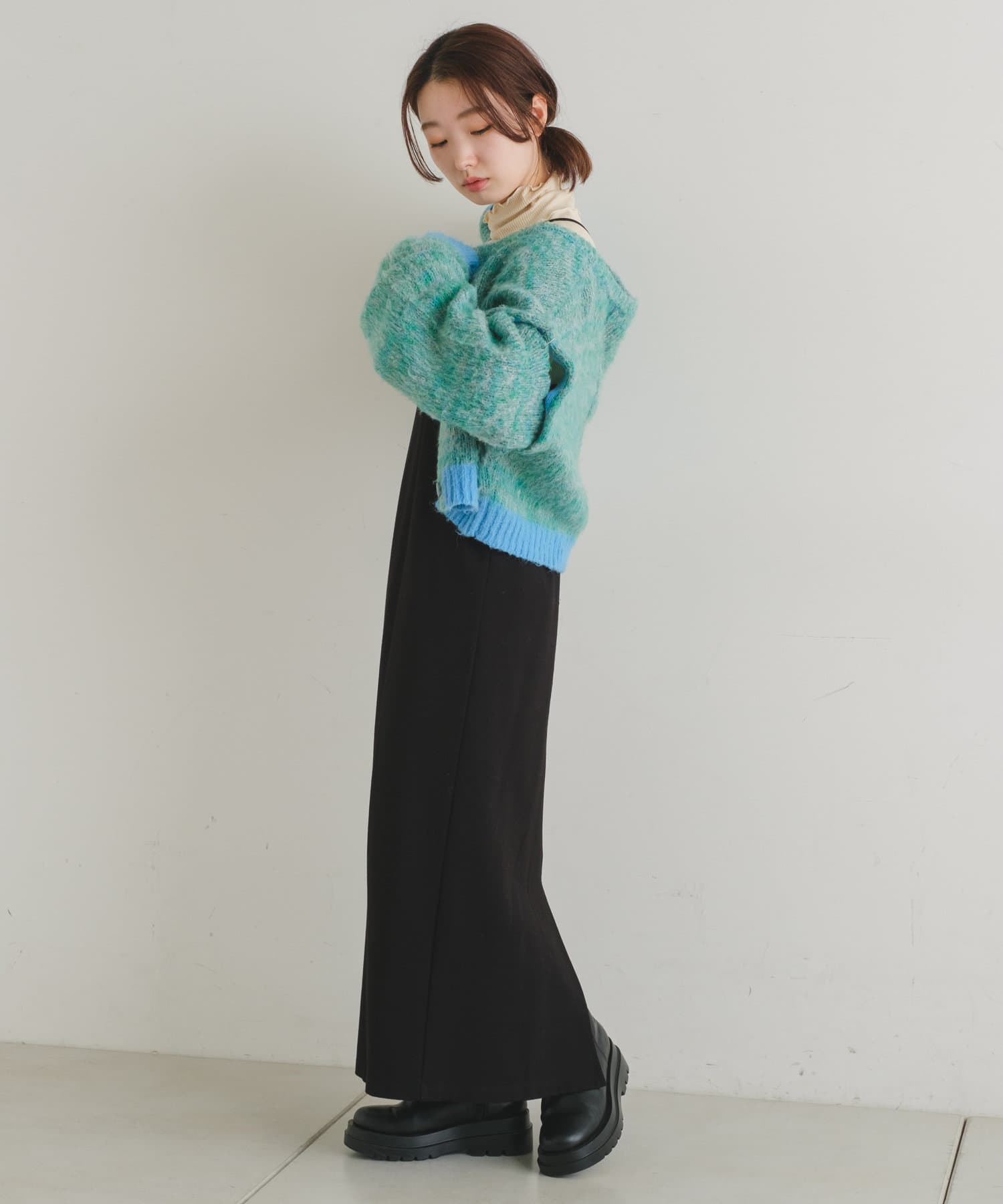 短丈なので、ロングスカートやワンピースと重ねて着るのがおすすめです。