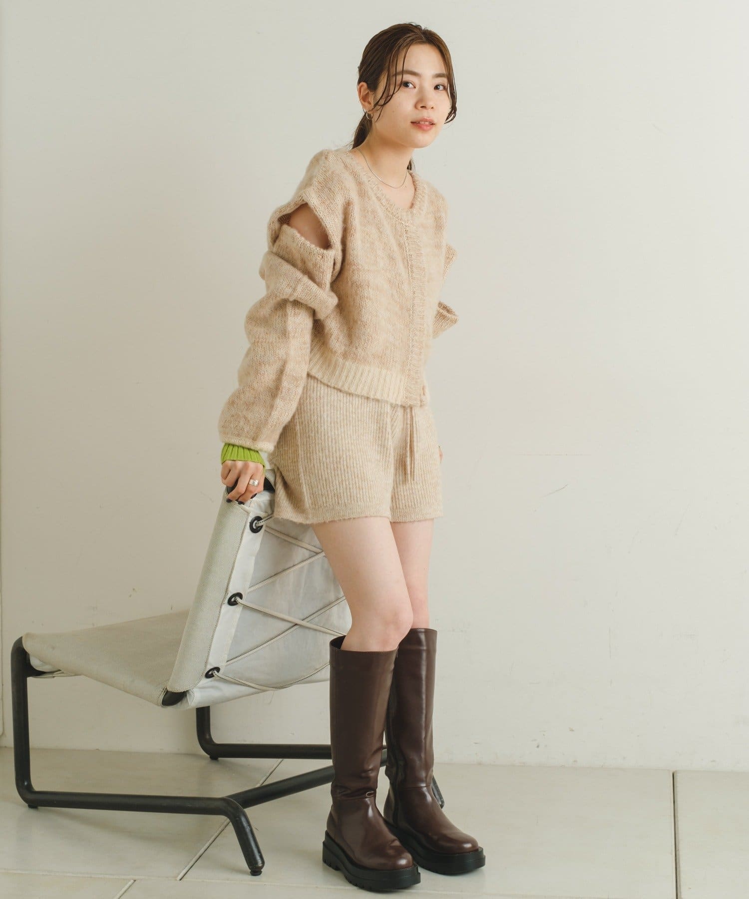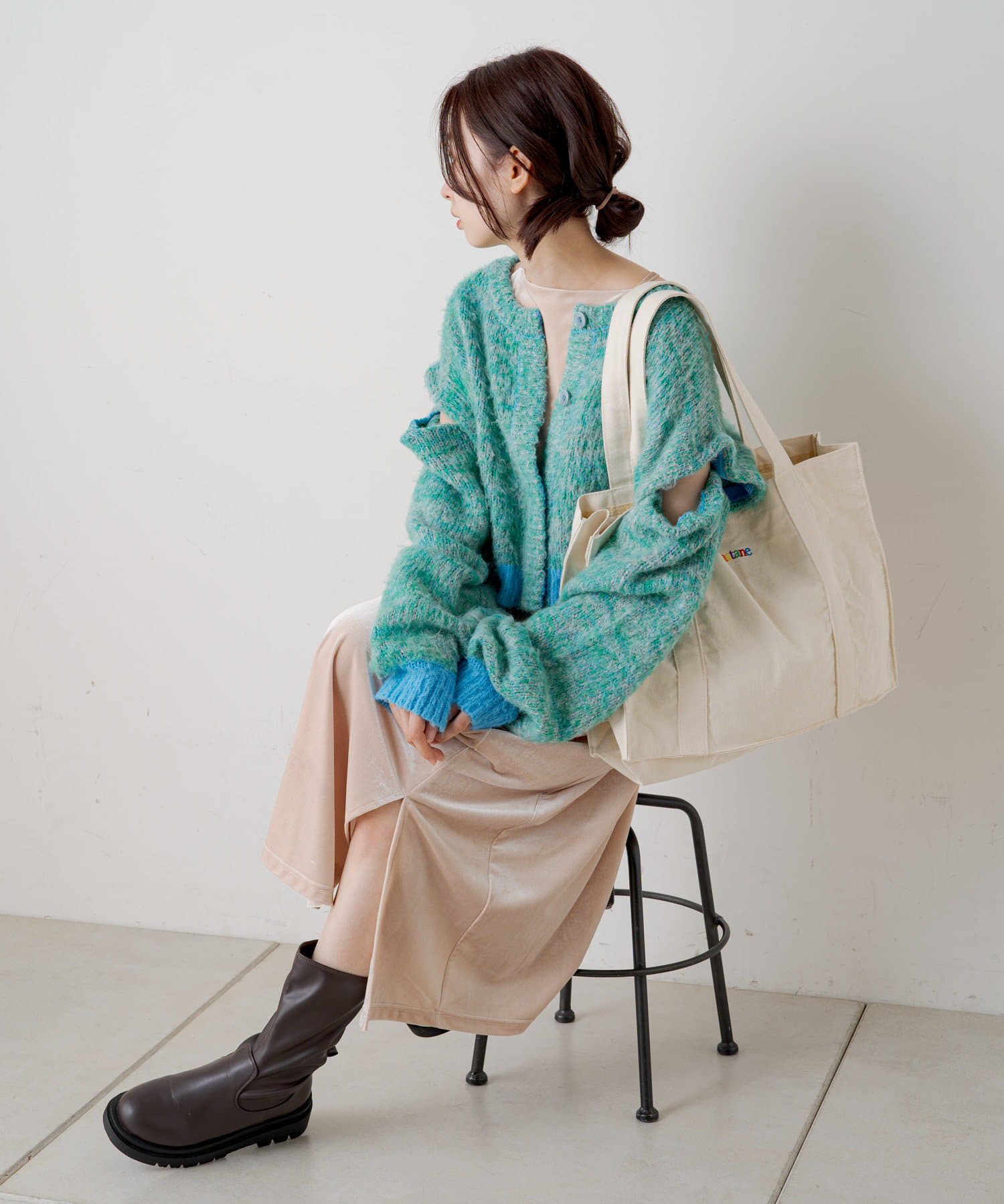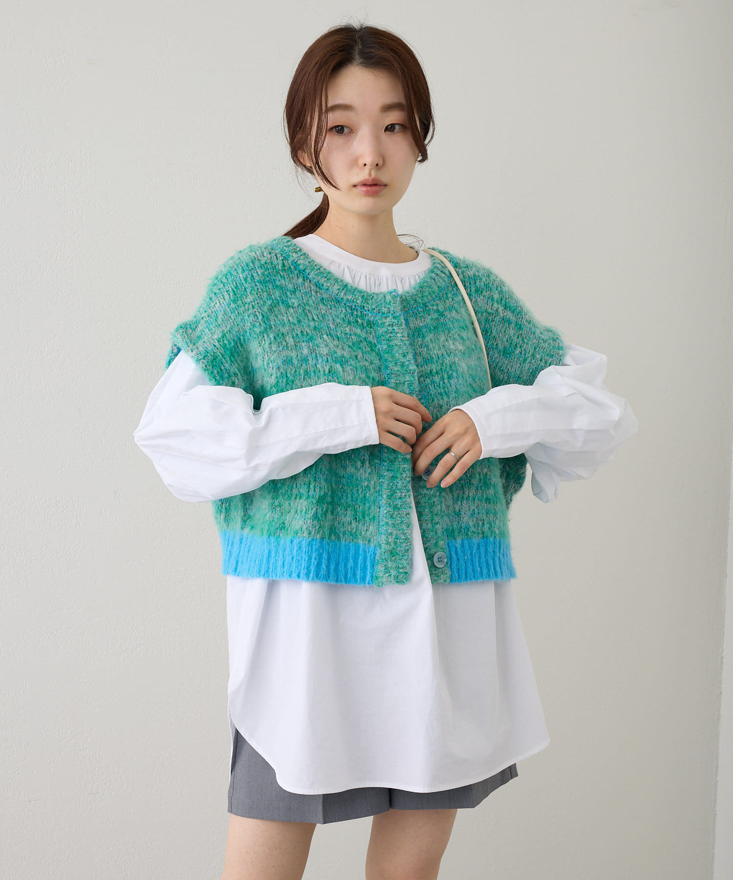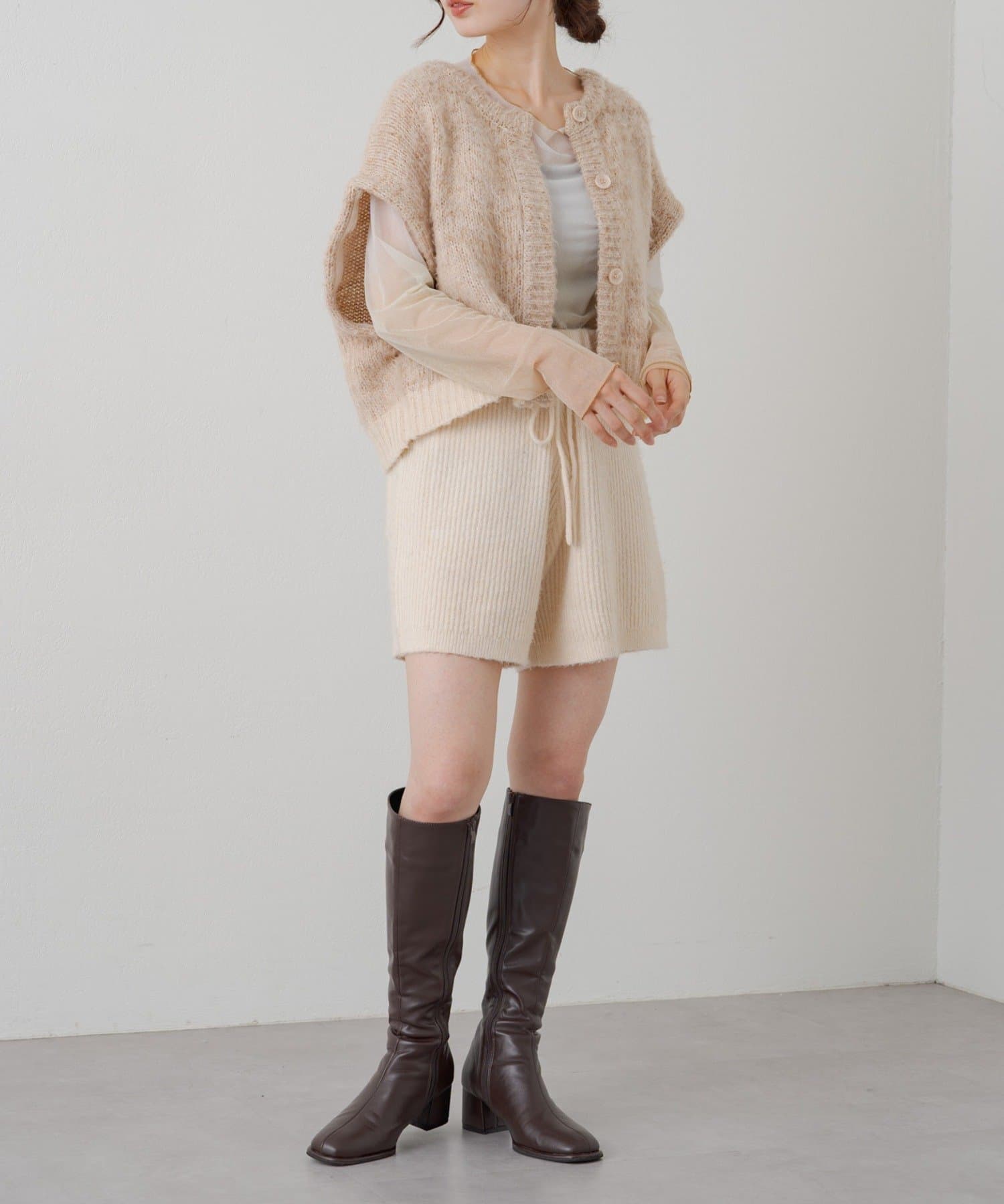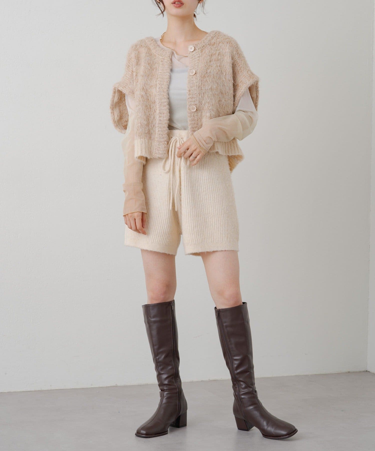 短丈なので、ロングスカートやワンピースと重ねて着るのがおすすめです。