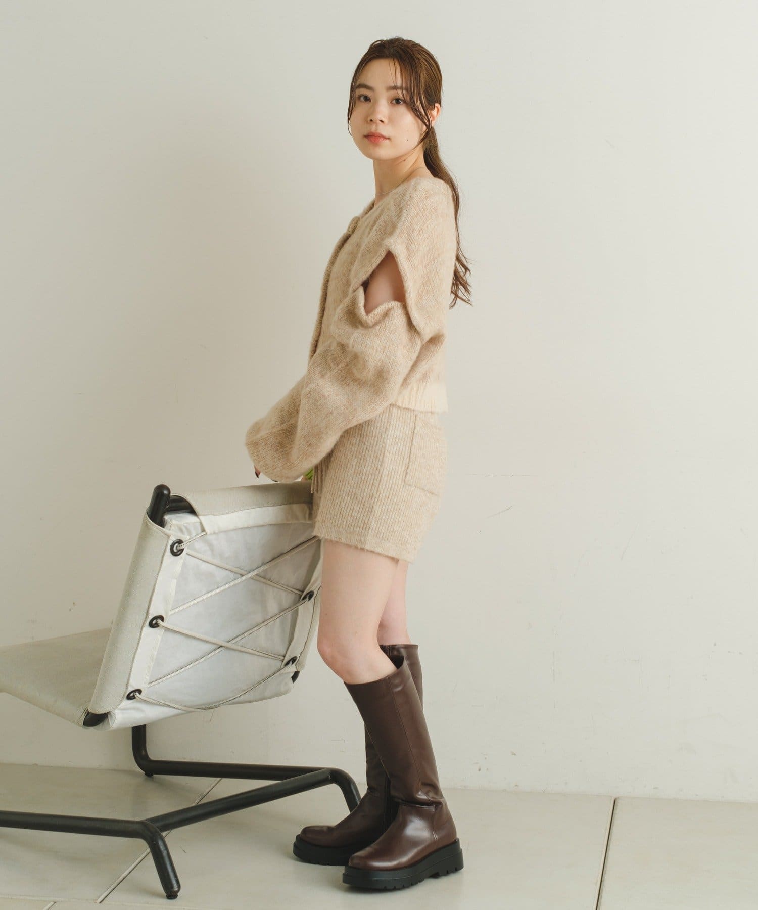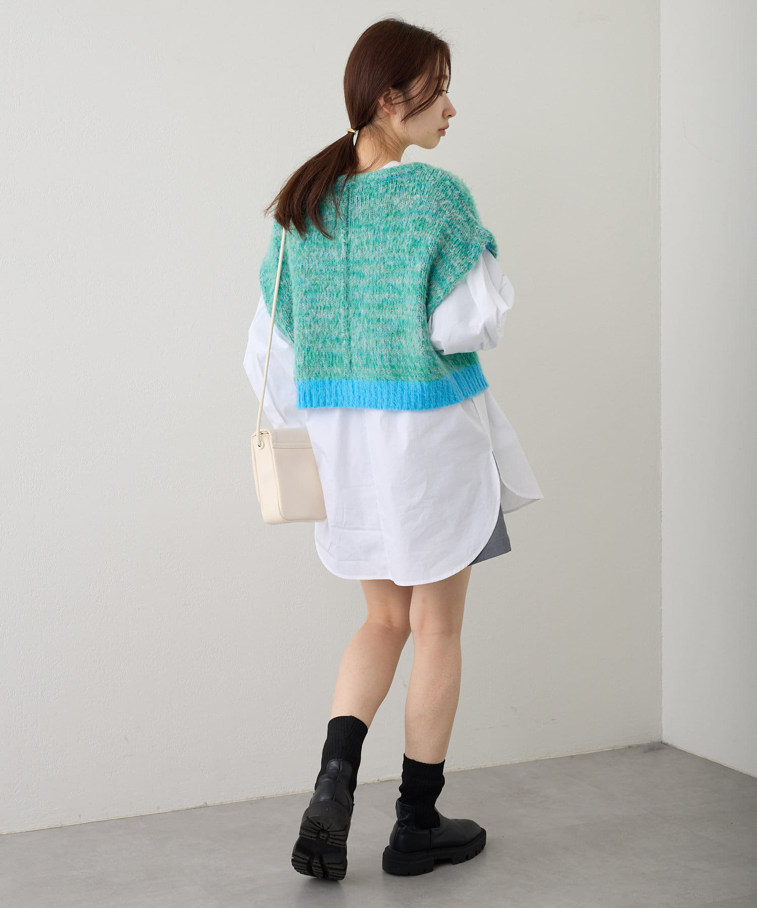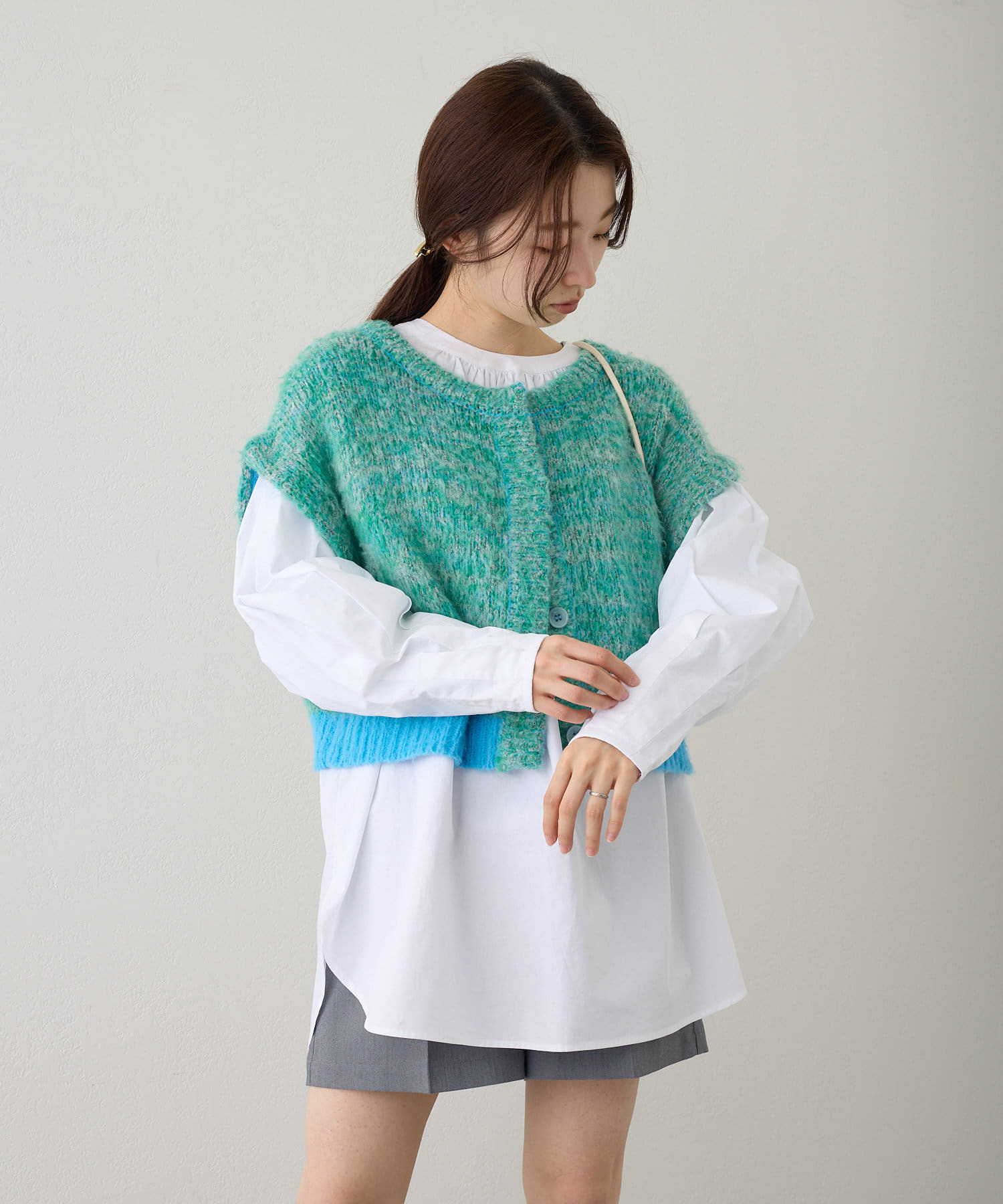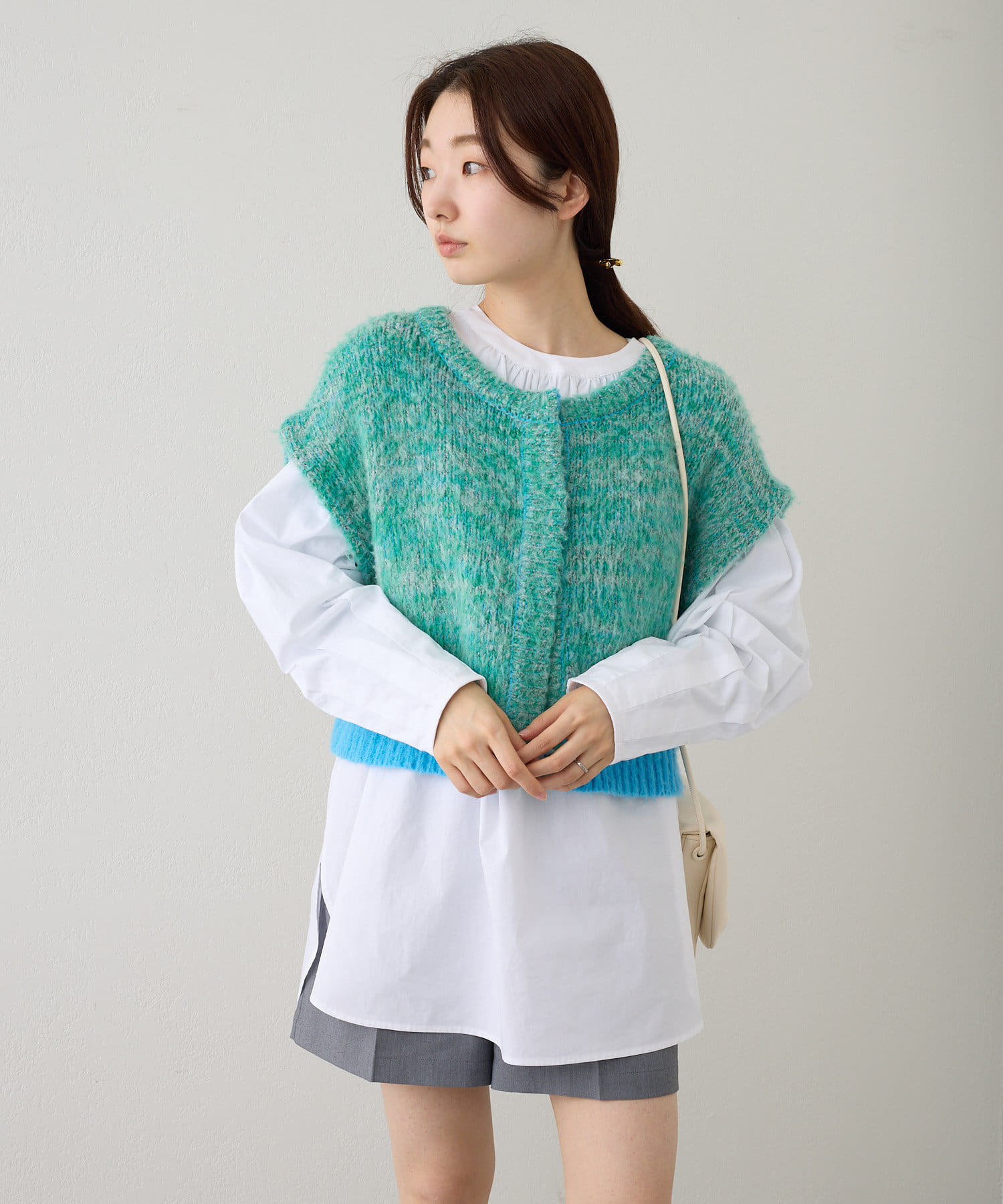短丈なので、ロングスカートやワンピースと重ねて着るのがおすすめです。