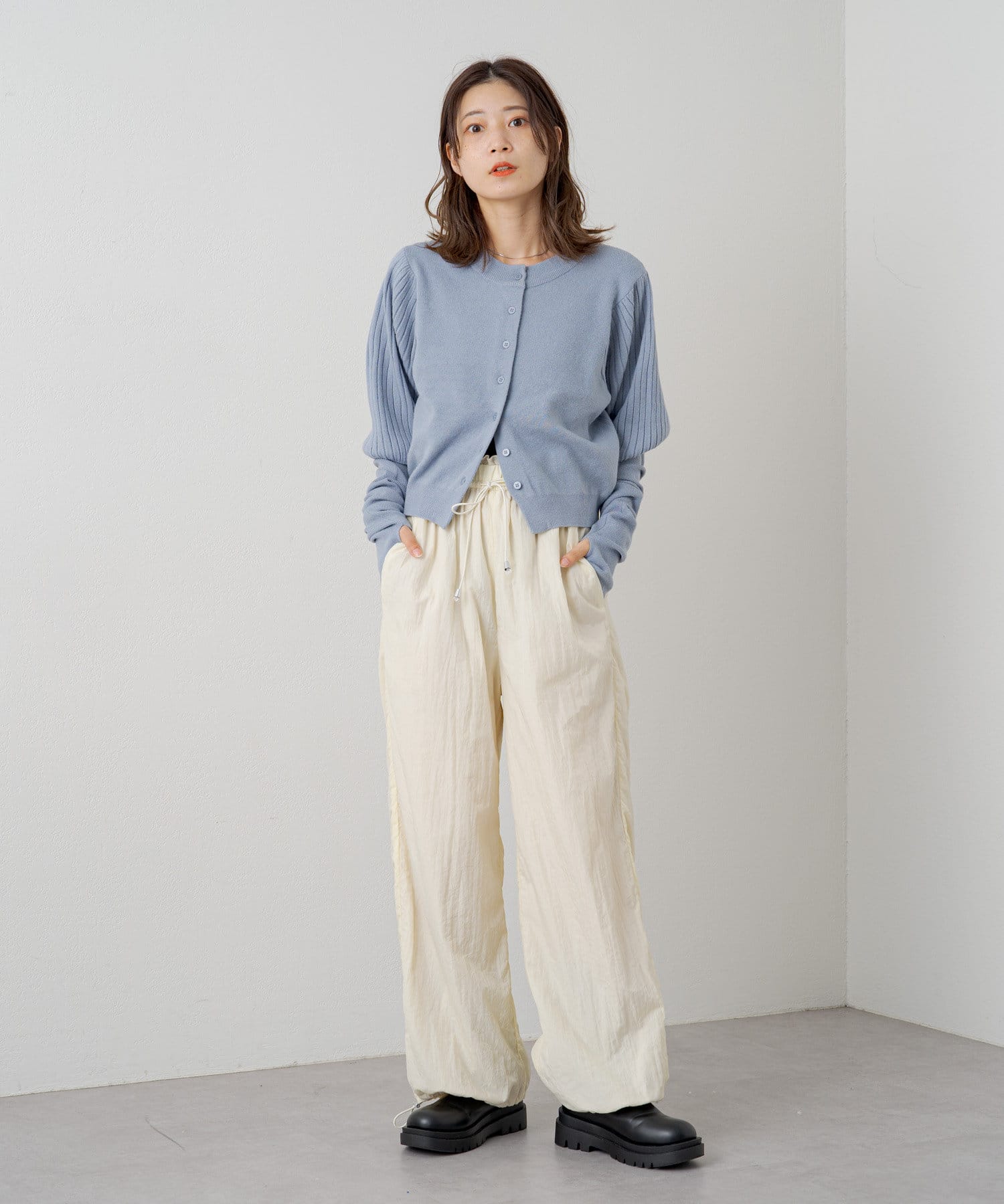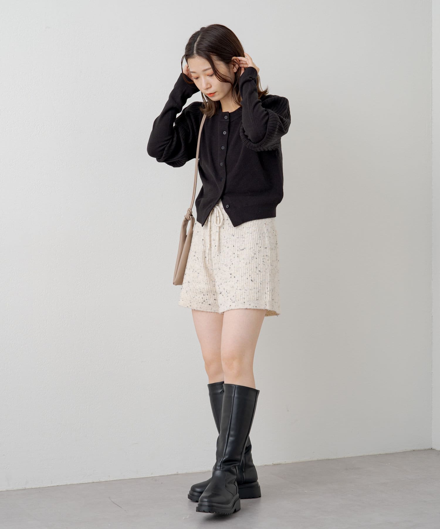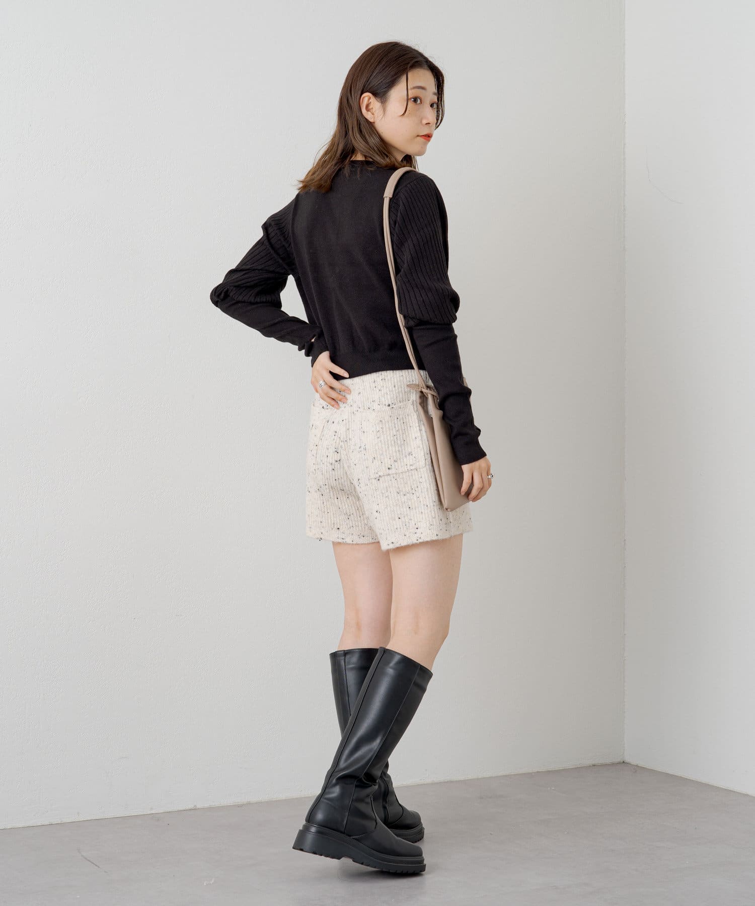 カーデの裾が短く、ボトムスに入れても入れなくてもバランスよく、前後どちらでも着まわせるのが良いです。