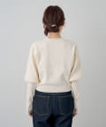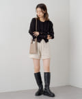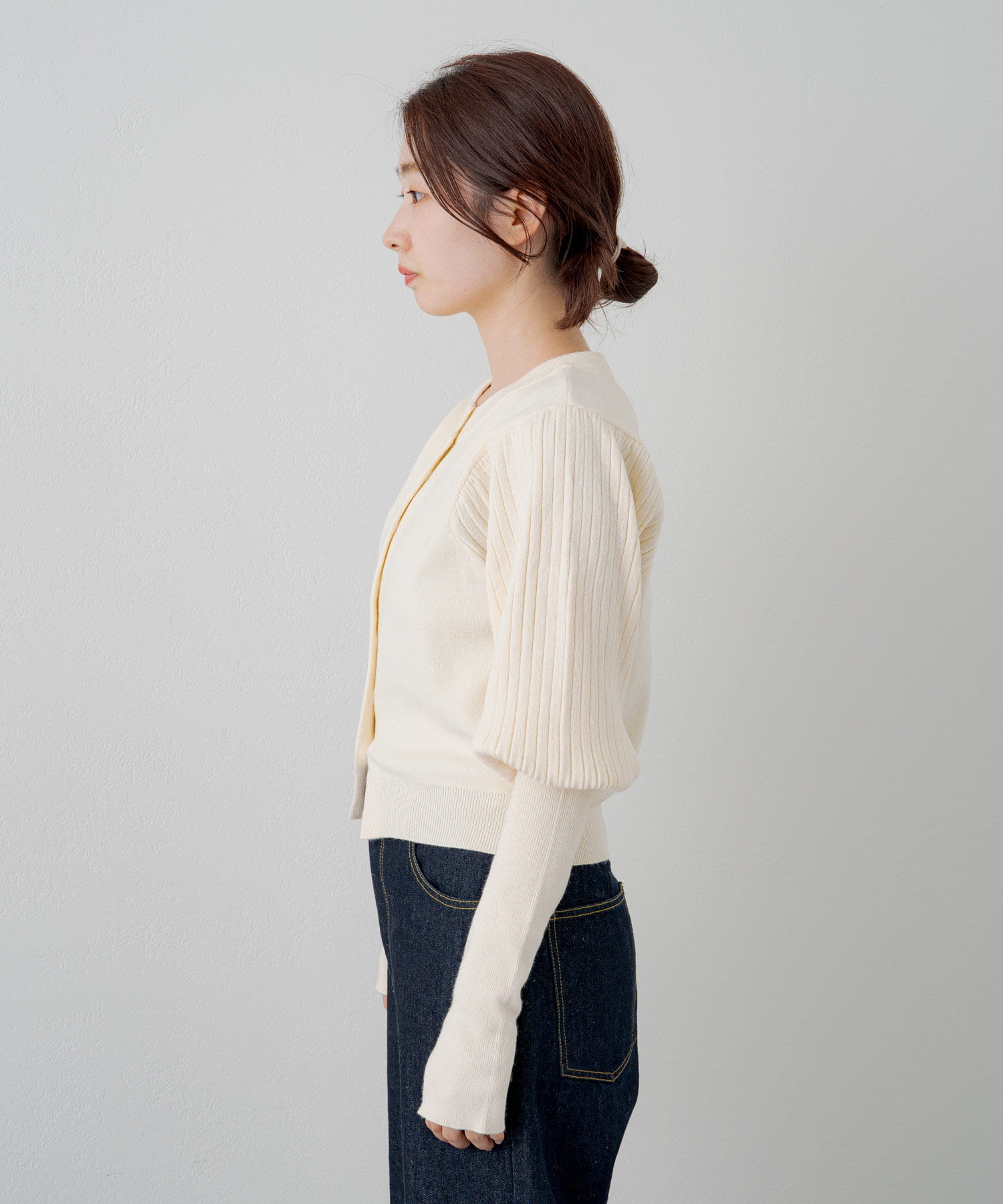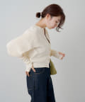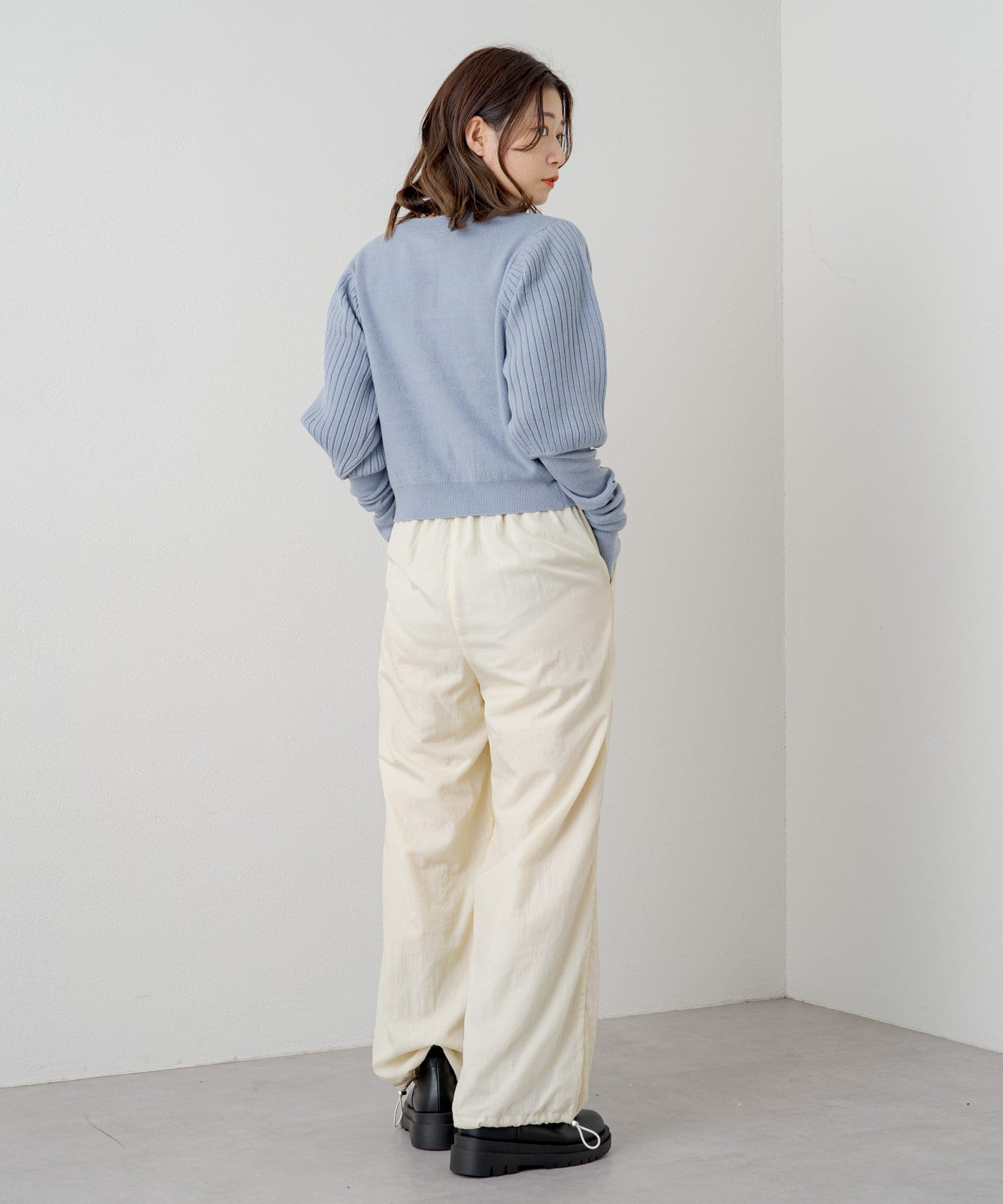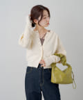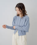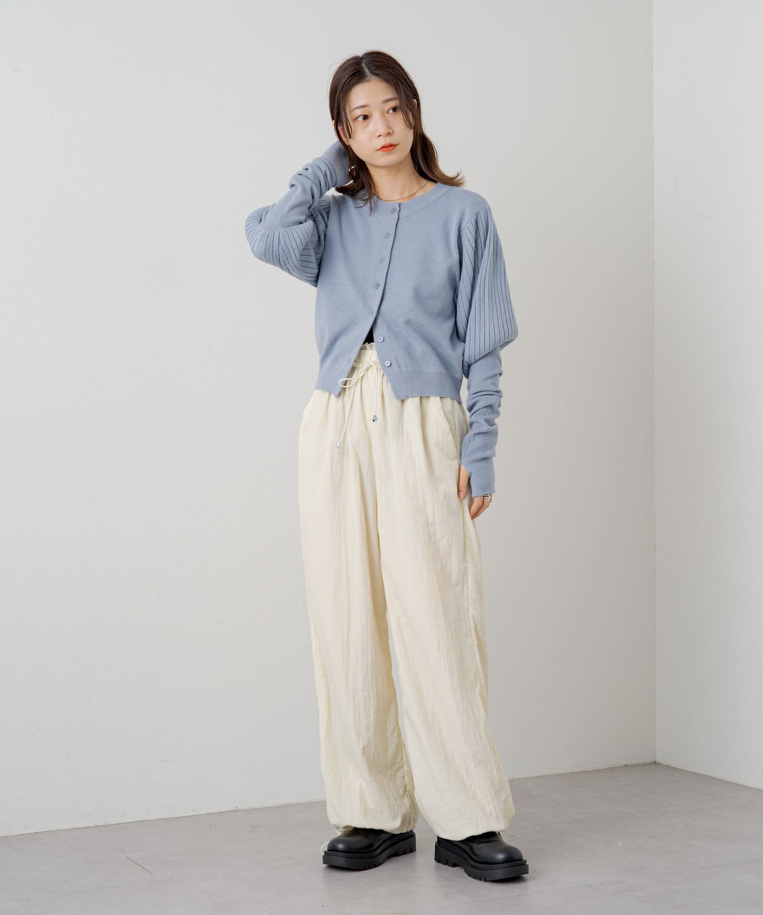 カーデの裾が短く、ボトムスに入れても入れなくてもバランスよく、前後どちらでも着まわせるのが良いです。