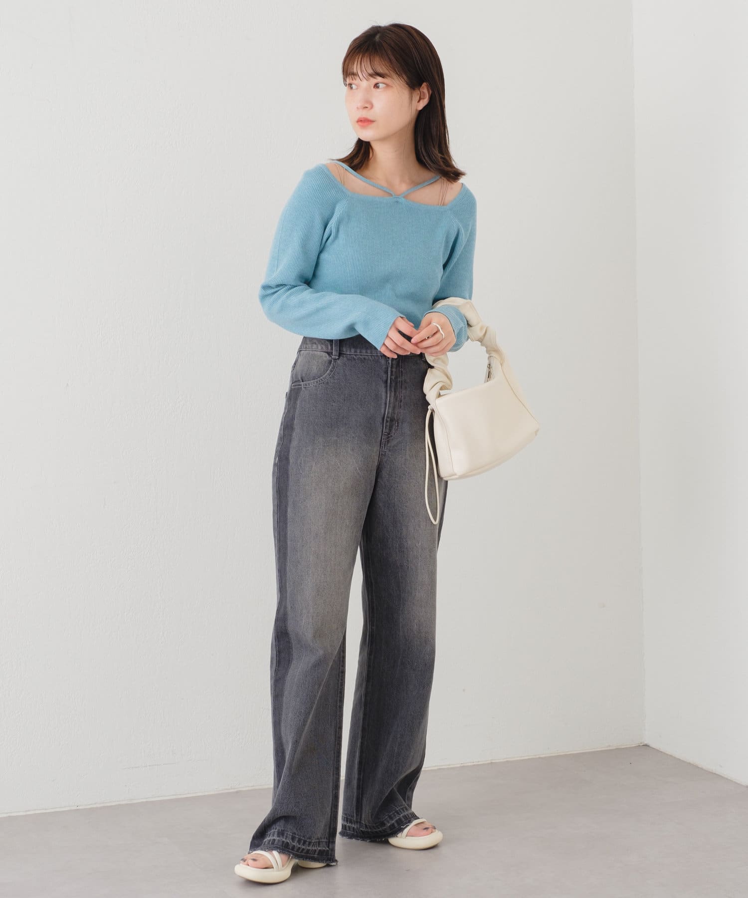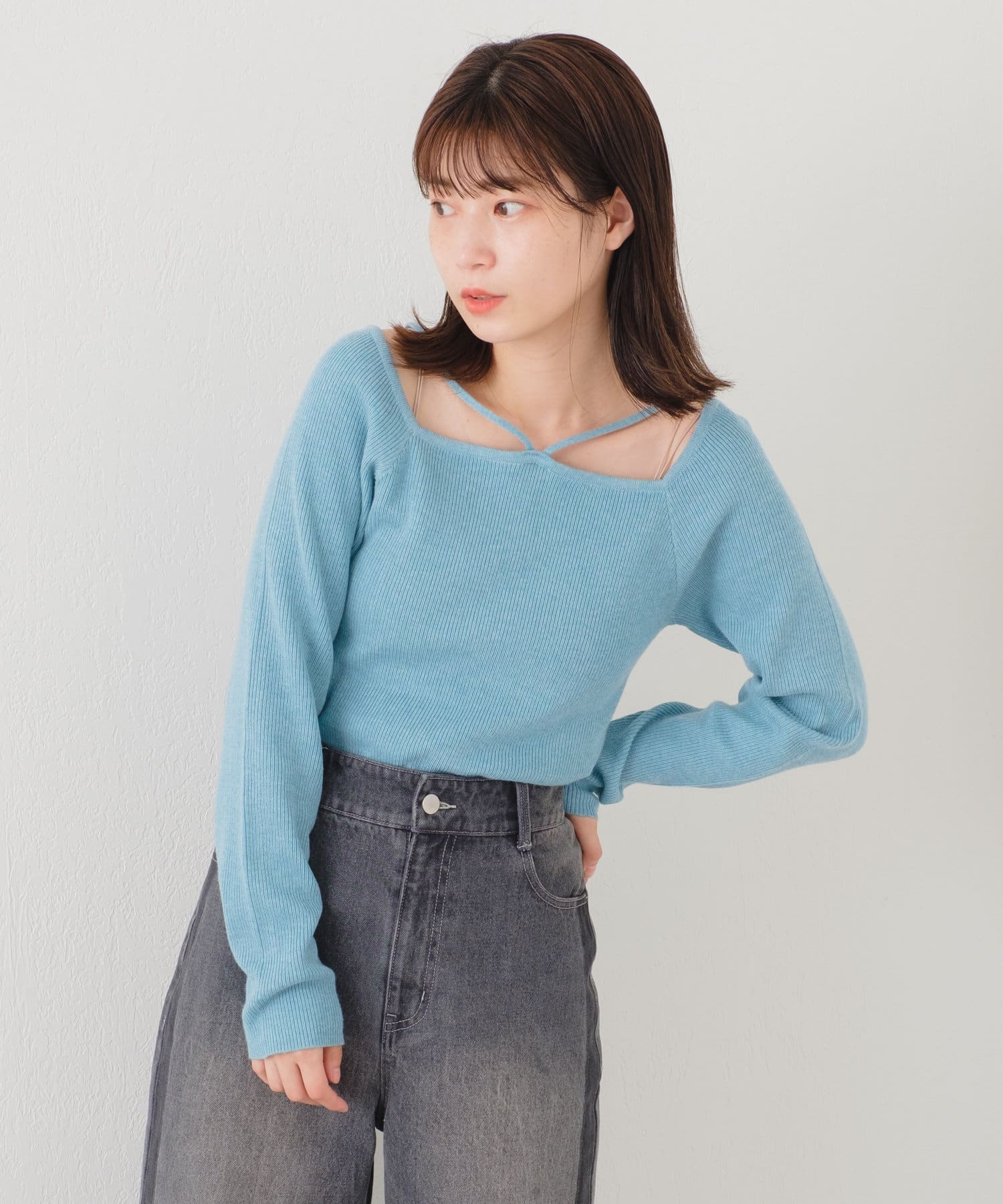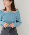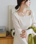 大きく開いたスクエアネックに紐デザインが特徴のニット。