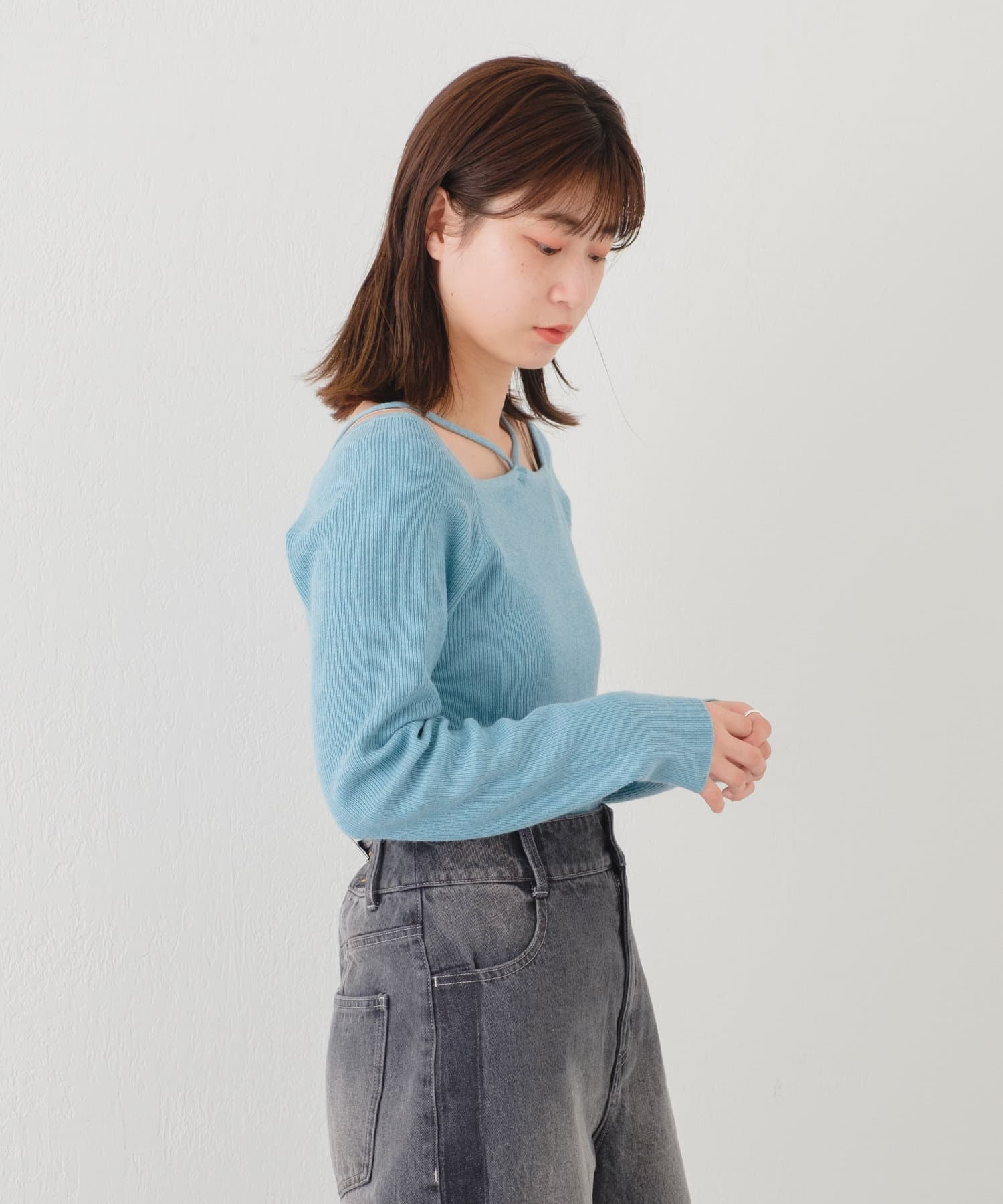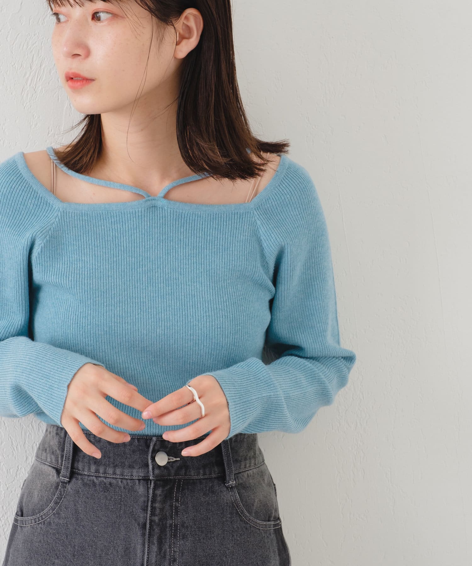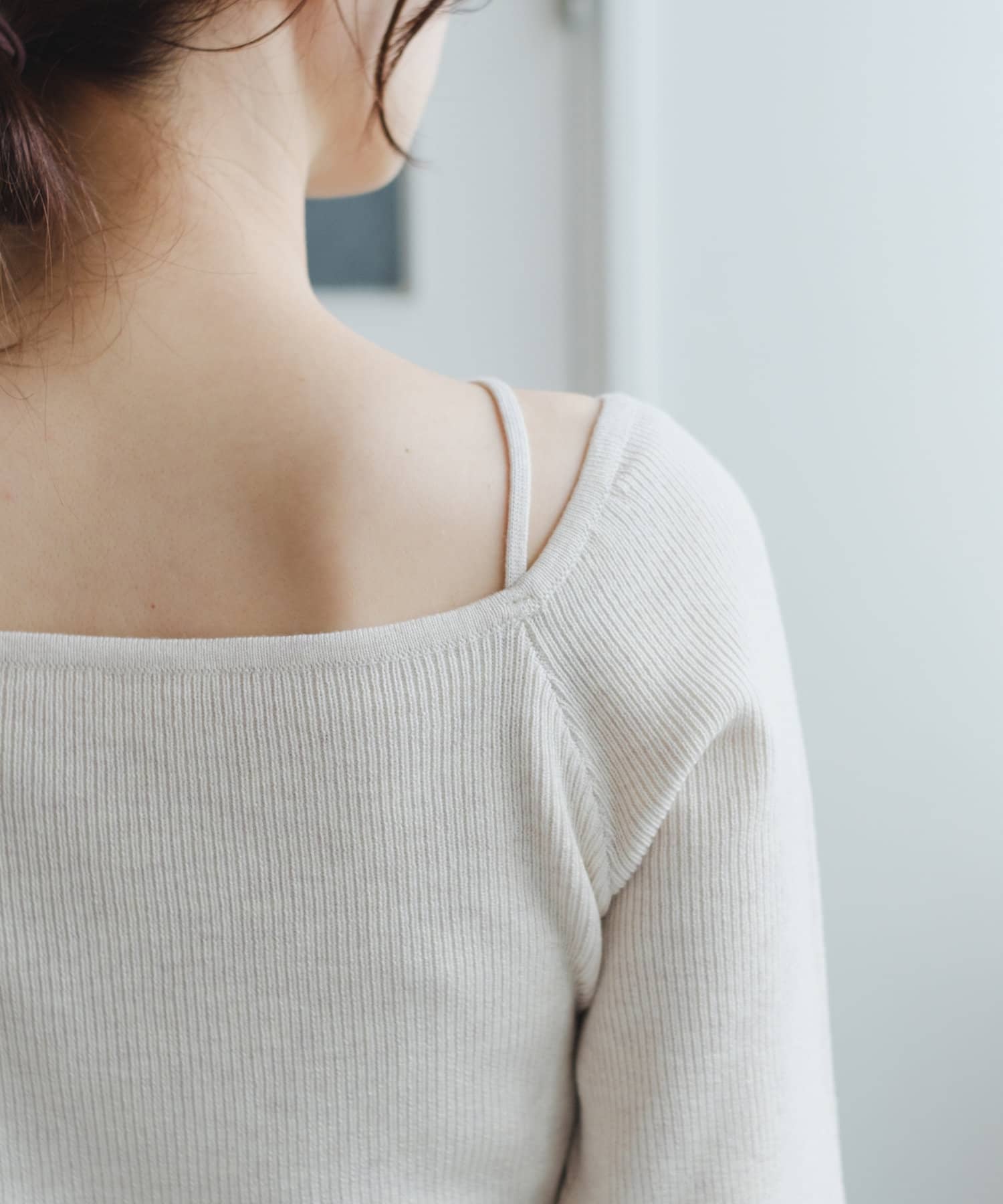 購入場所:店舗カーディガンを着る時のインナー用に購入しました。スクエアネックになっているので鎖骨のラインが綺麗に見えてとても可愛いです。紐のデザインのおかげでただのスクエアネックのニットと差がつけられるのも良い点だと思います。