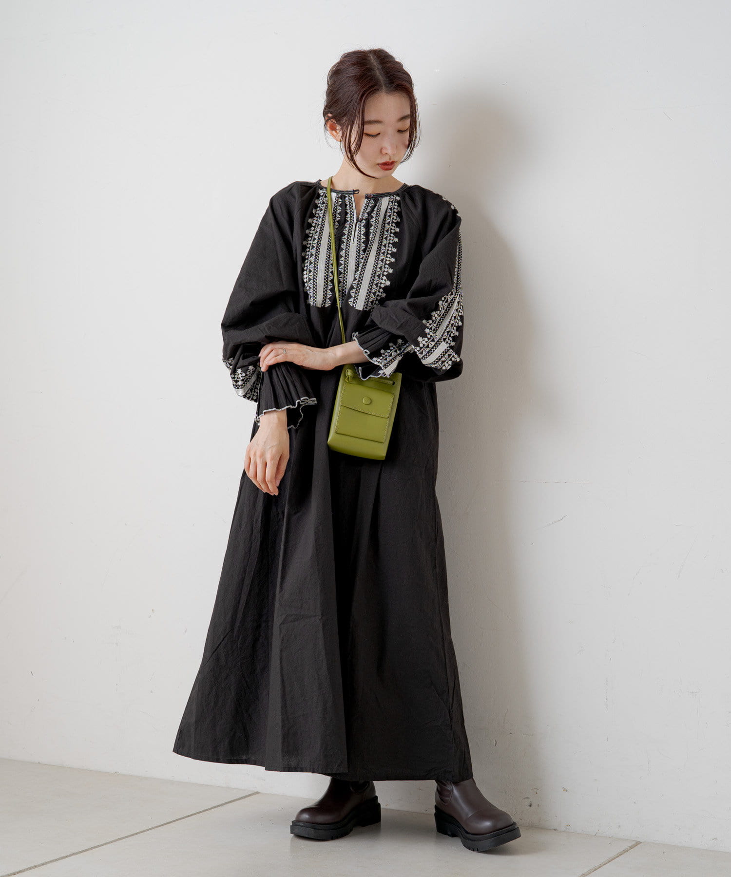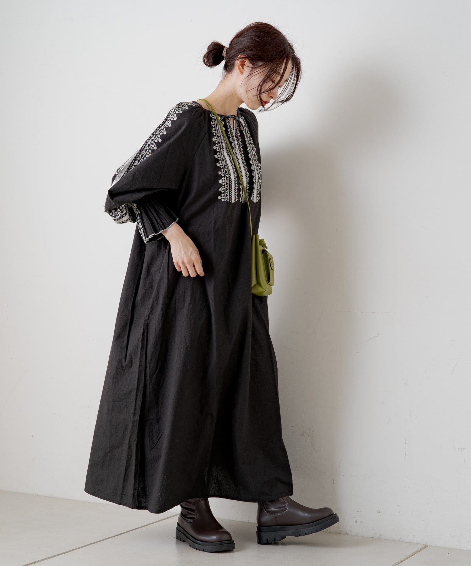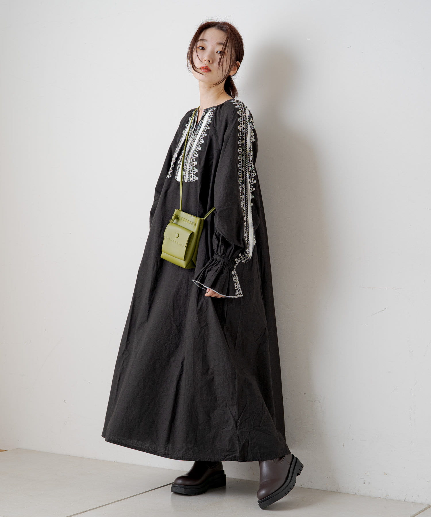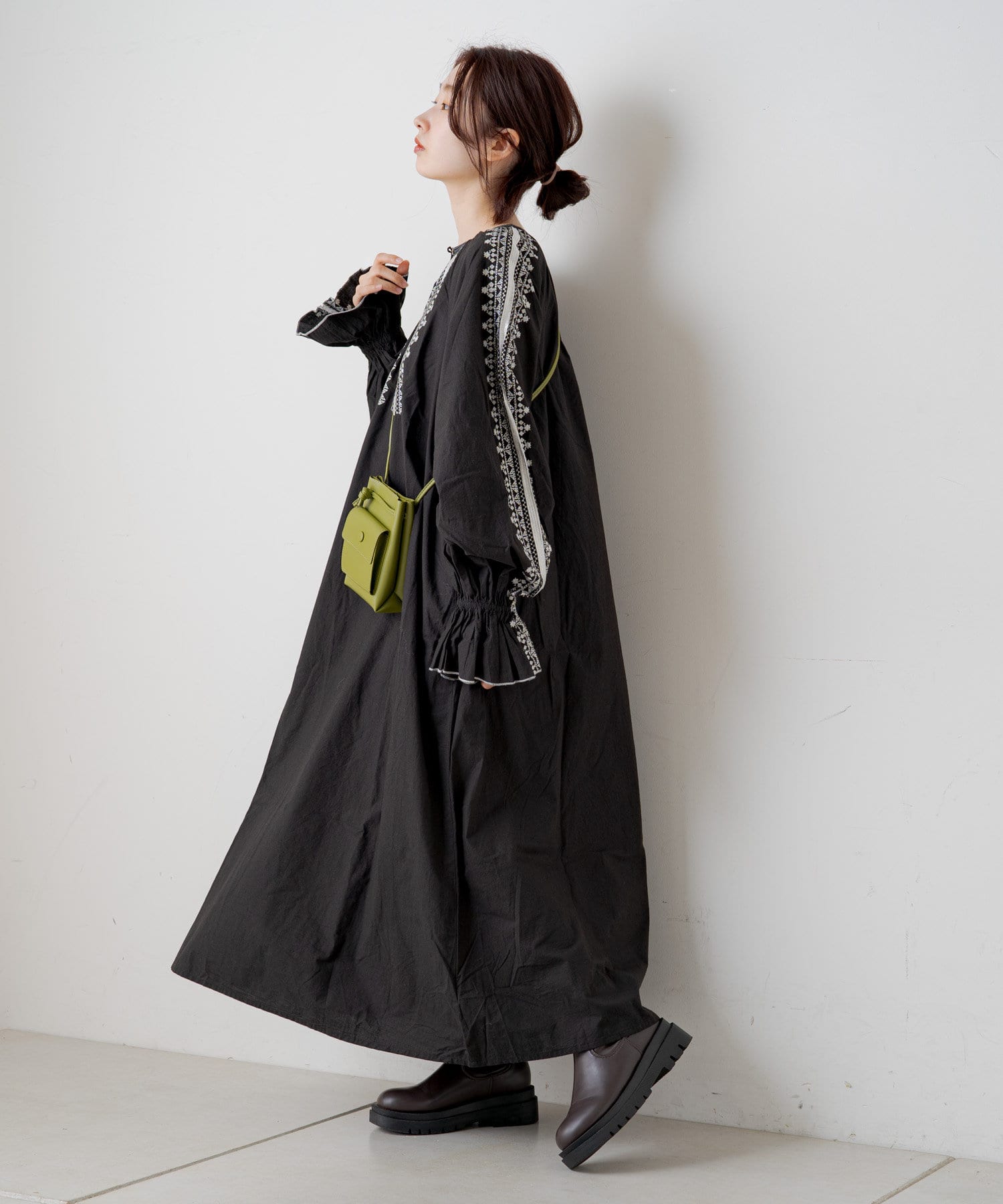 フロント、スリーブ、バッグに施された刺繍デザインが目を惹くワンピースが登場。