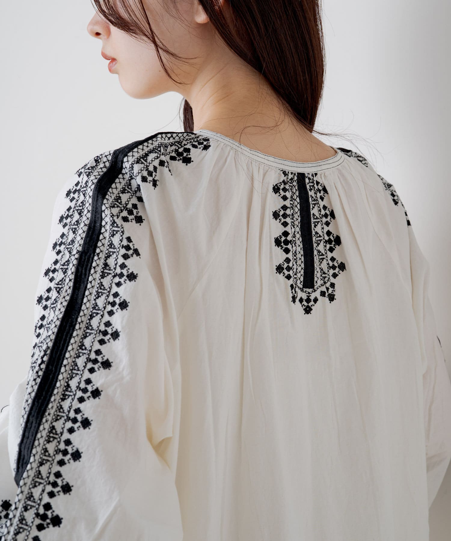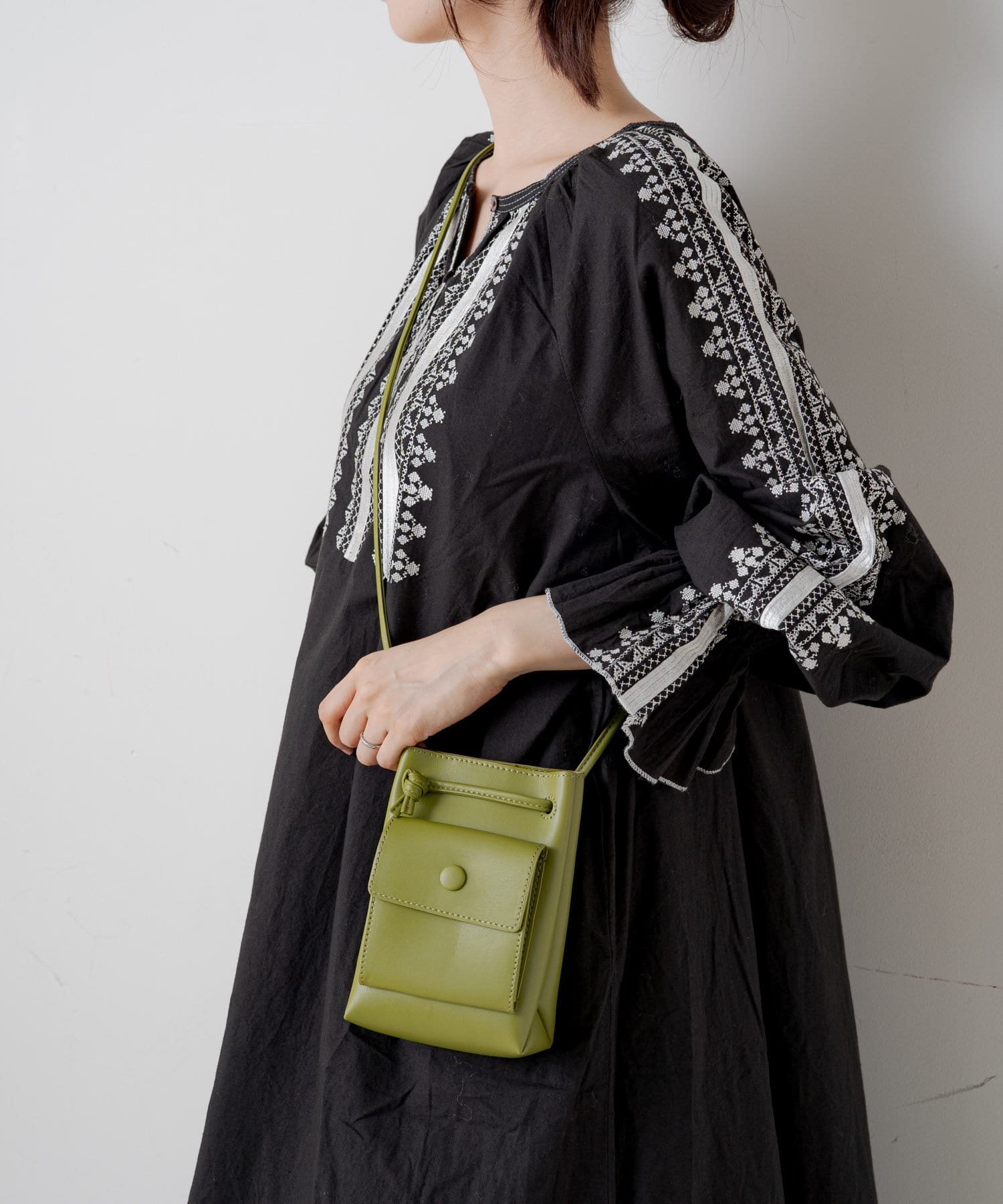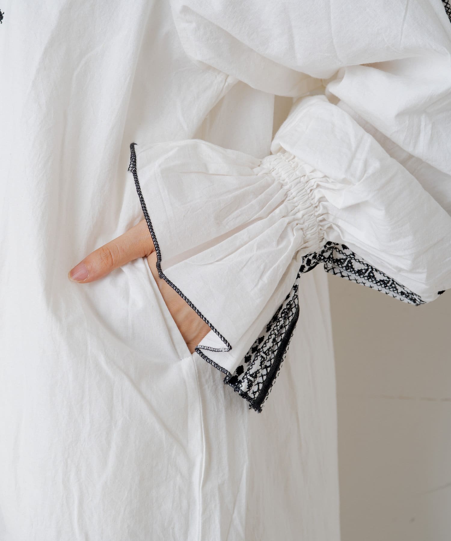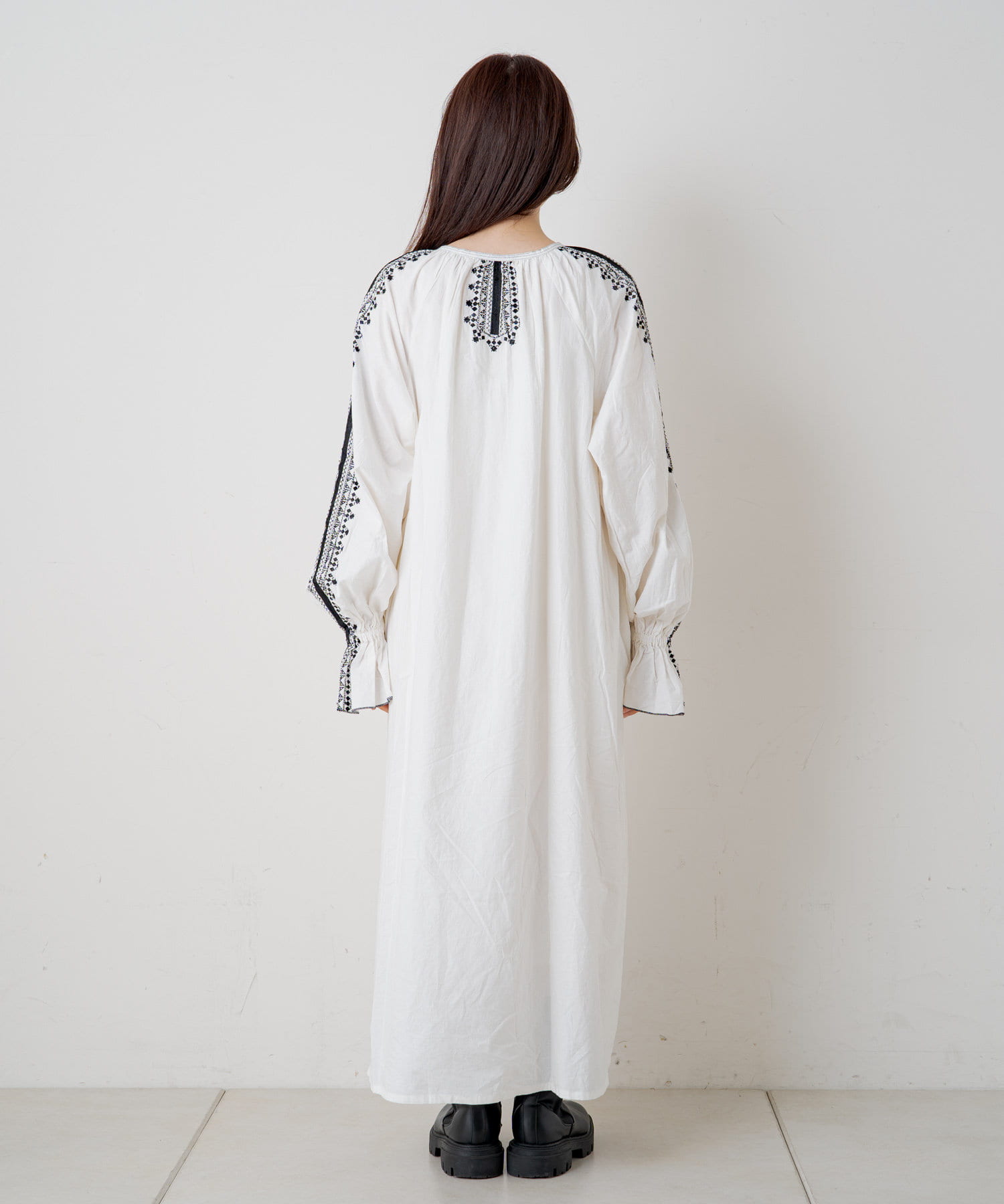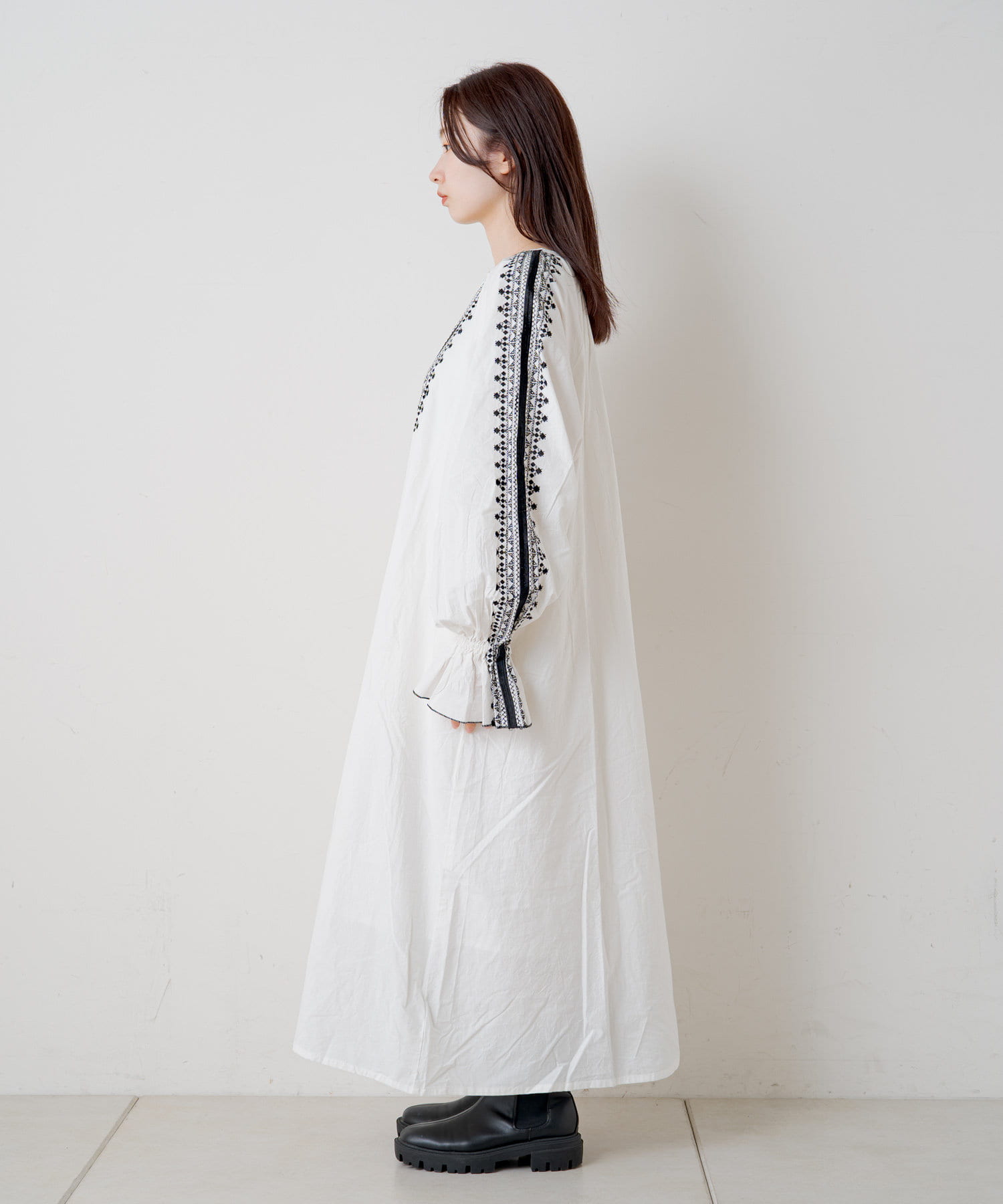 フロント、スリーブ、バッグに施された刺繍デザインが目を惹くワンピースが登場。
