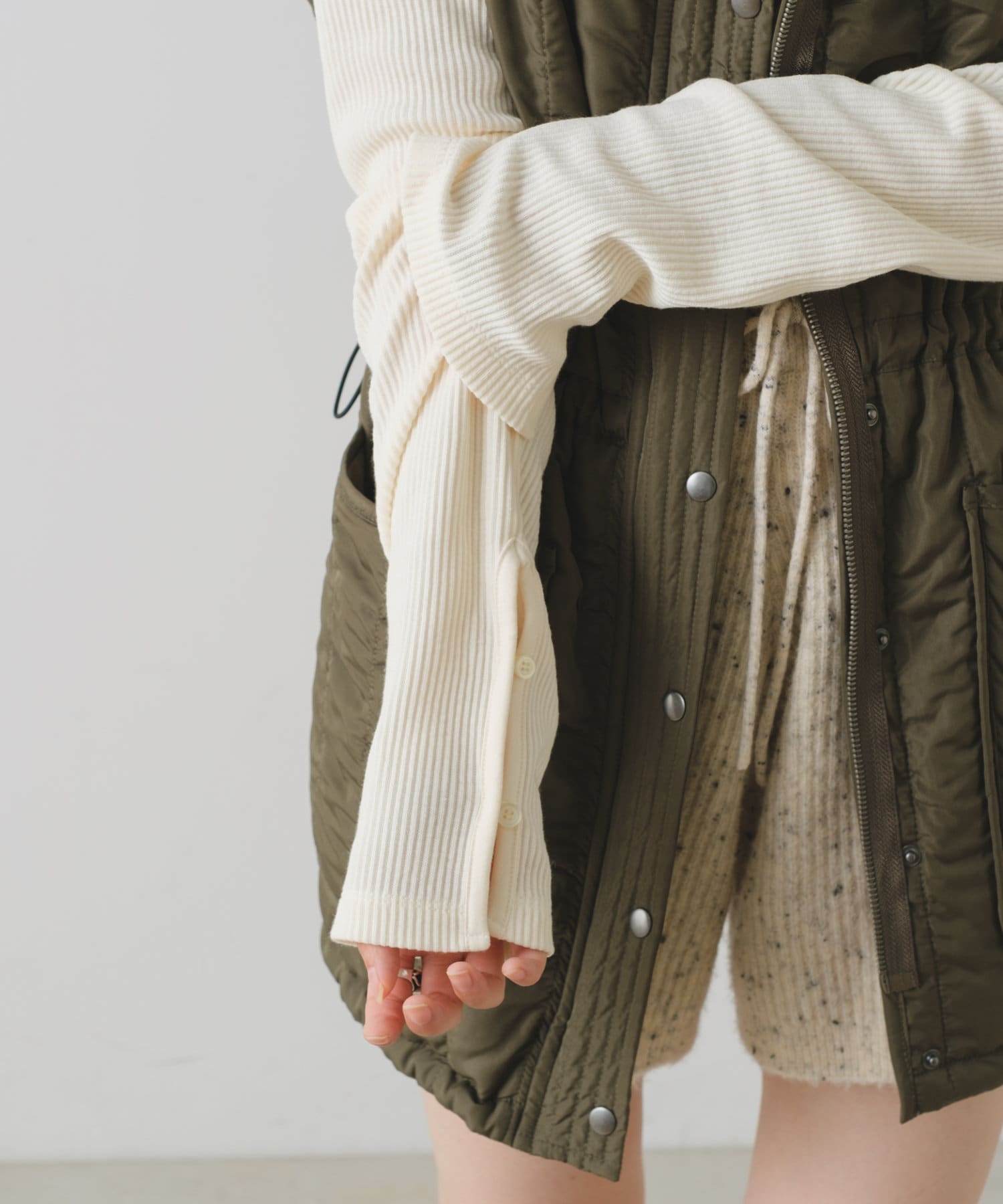 適度にフィットしたシルエットに、縦のラインを強調するリブ素材で細見えに。