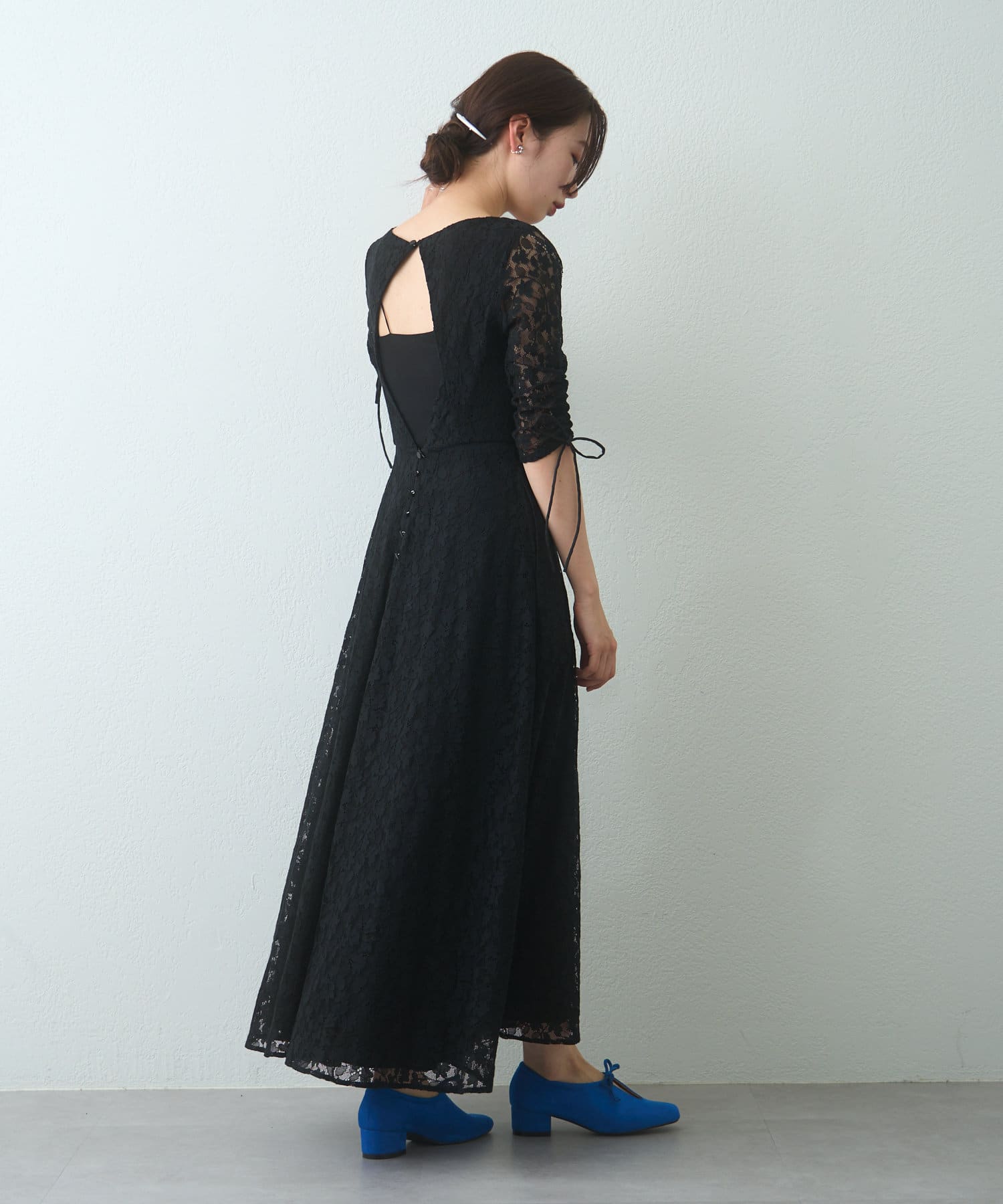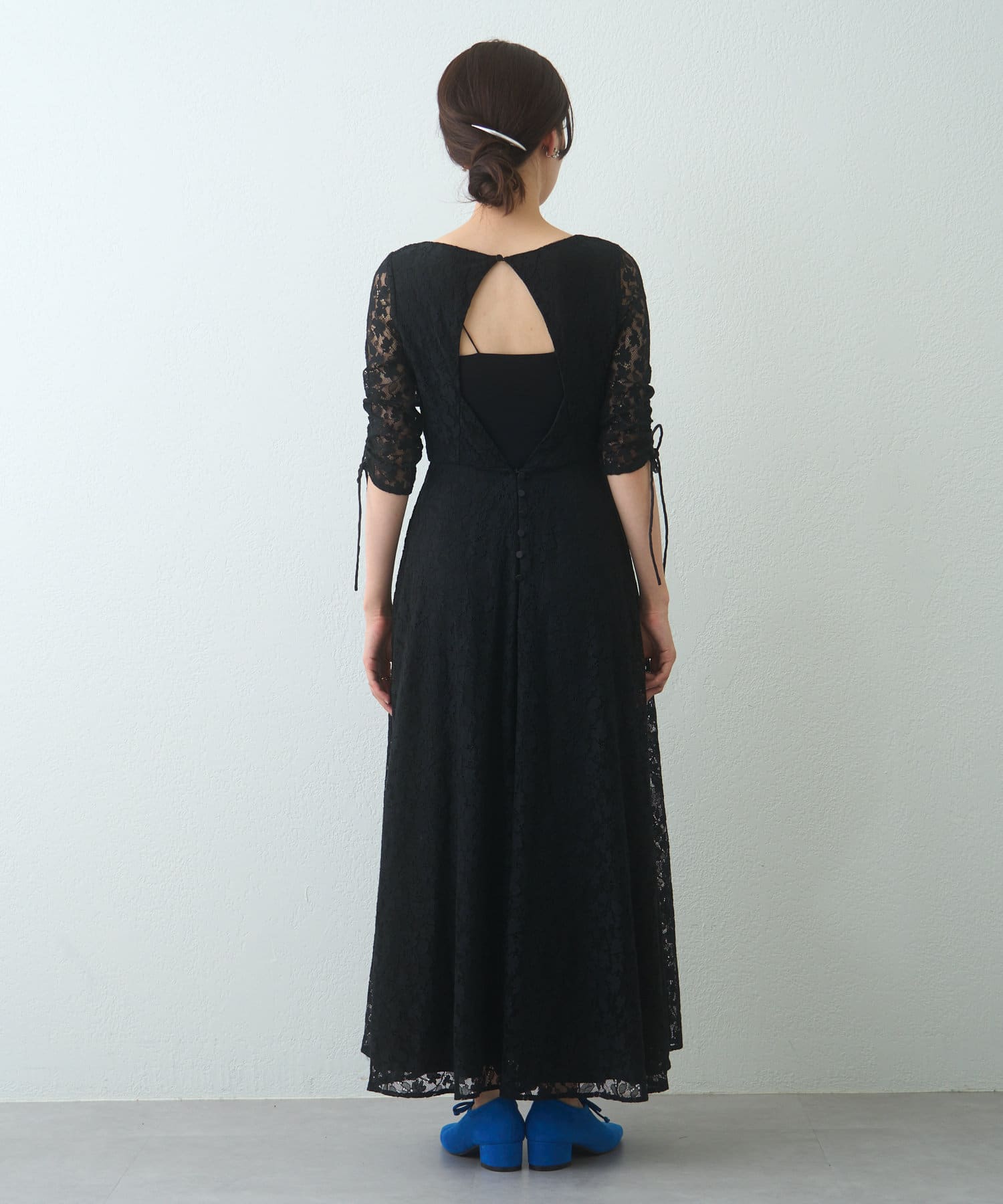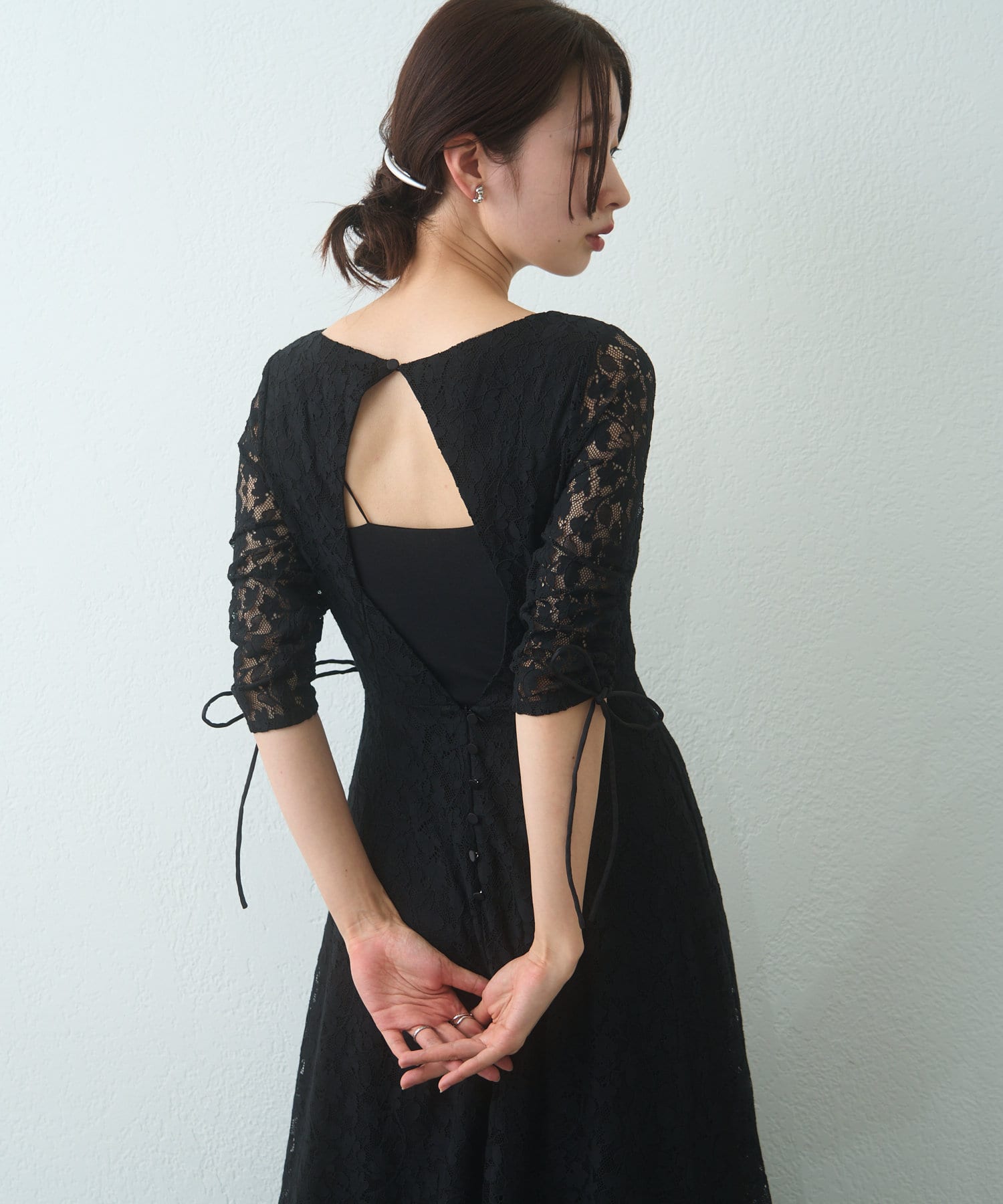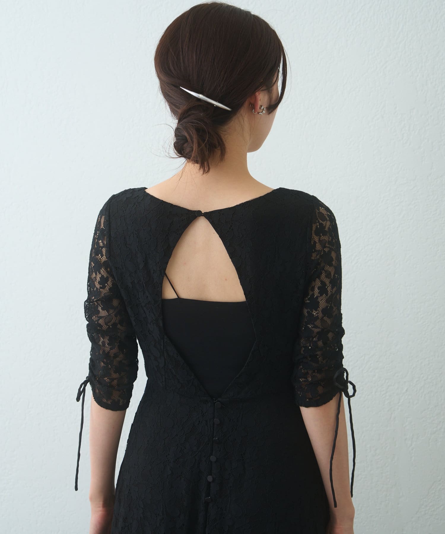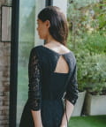 ざっくりと開いたバックスタイルがアクセントのレースドレス。