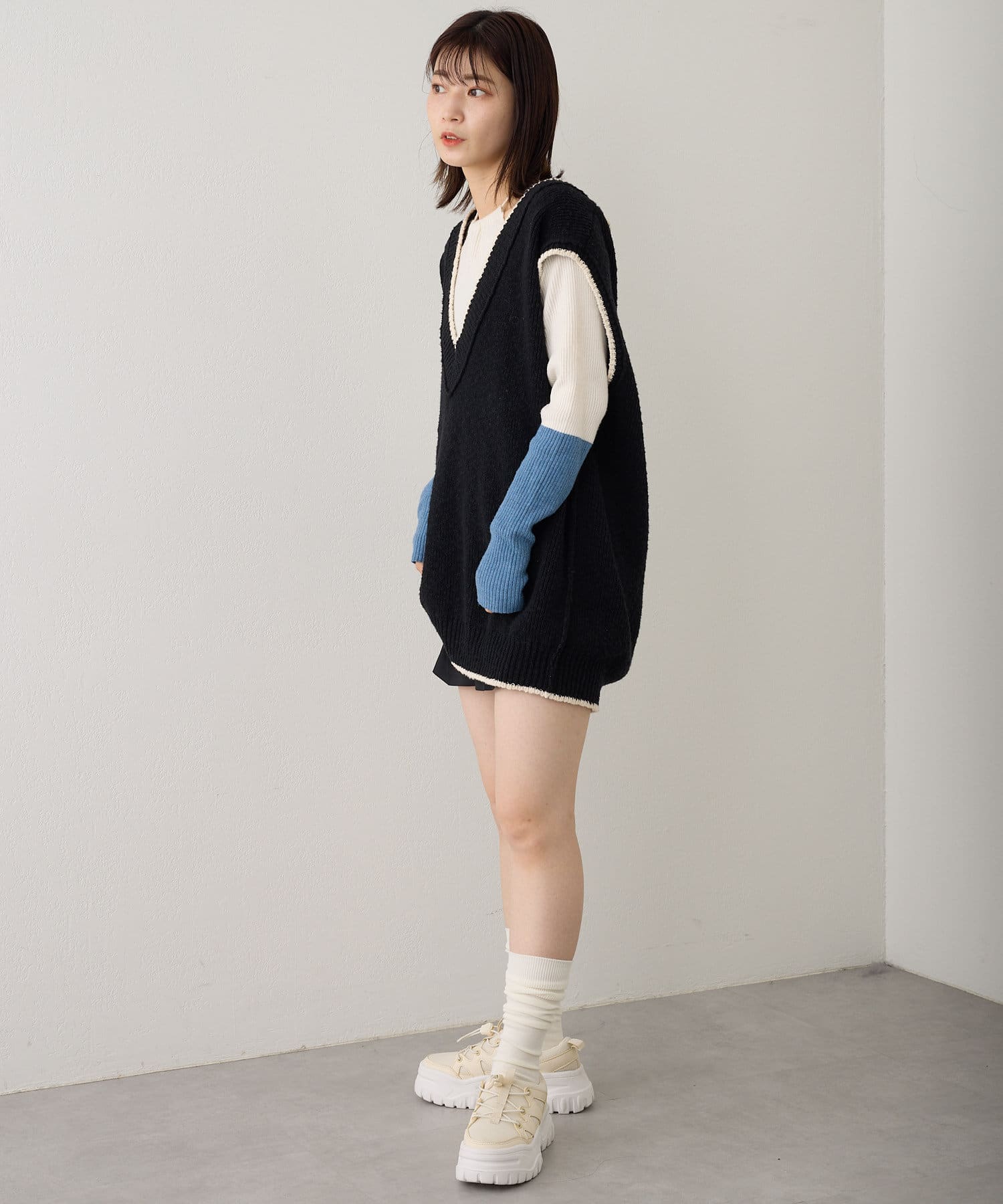 深めのVネックがレイヤードスタイルをさらに楽しくさせる一着。