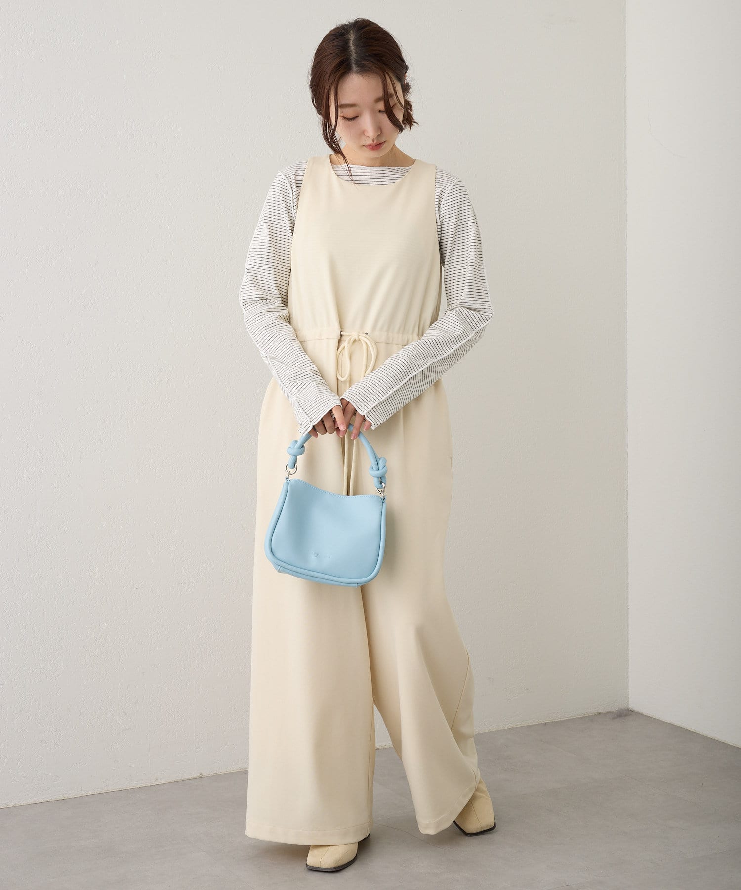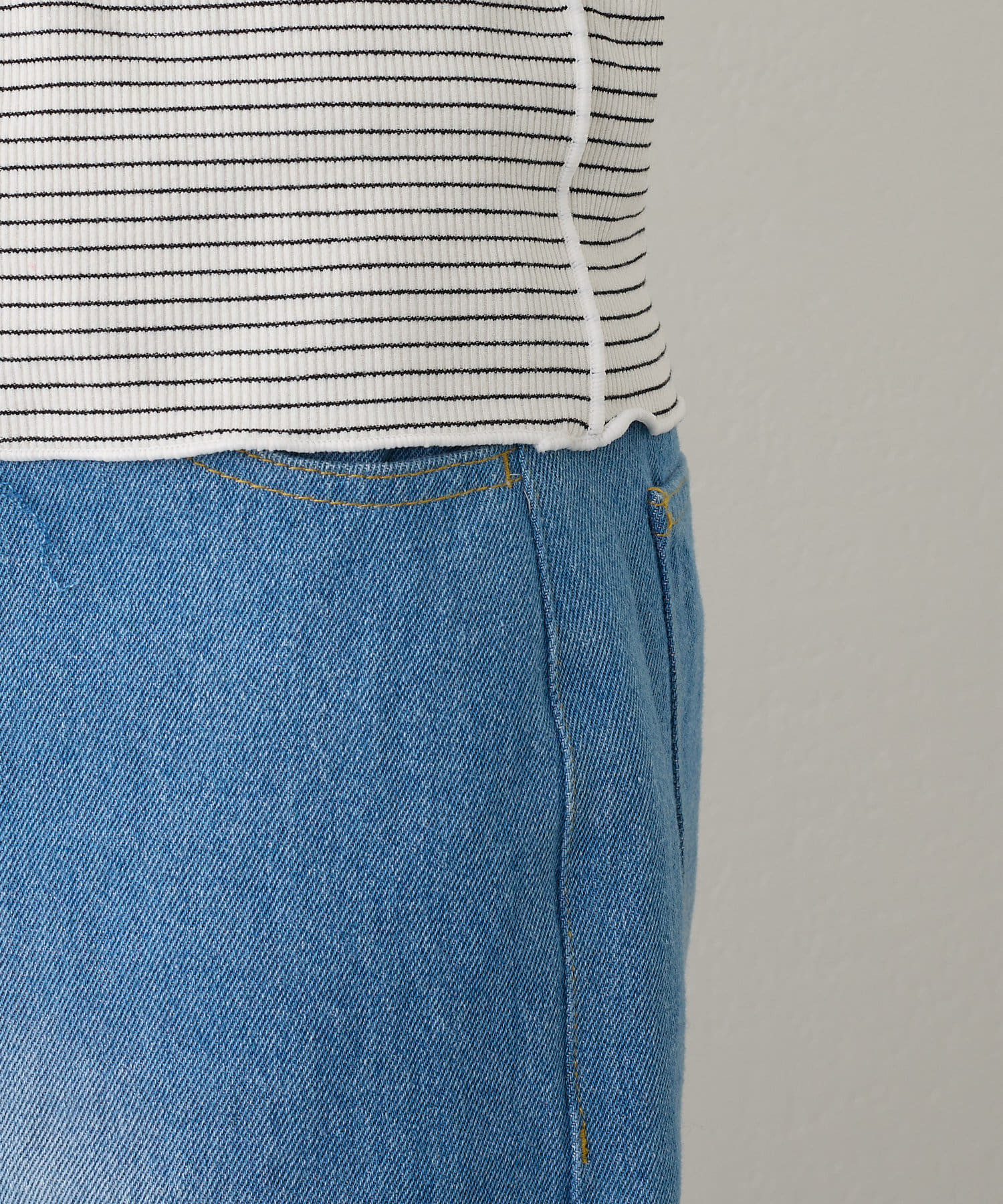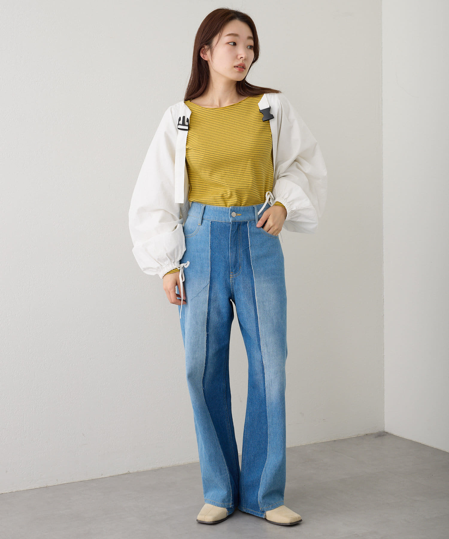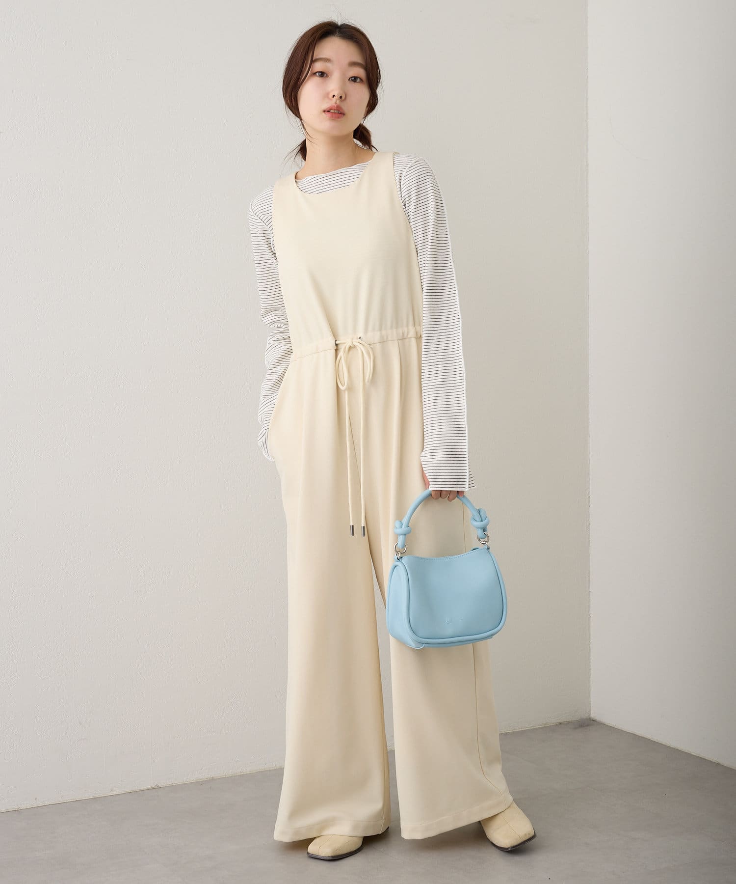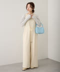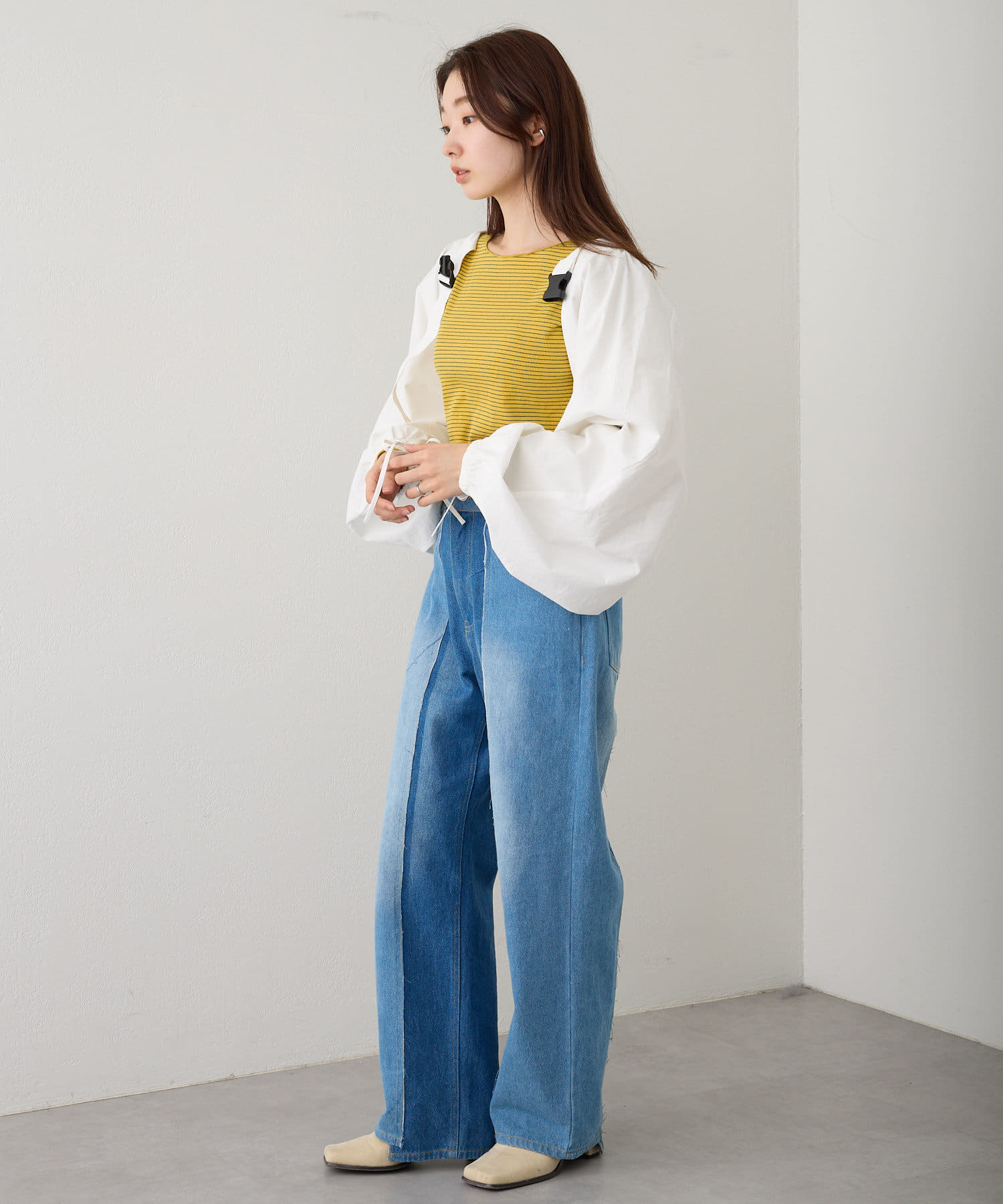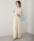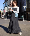 デニムやサロペットでカジュアルアイテムもフェミニンな印象に導きます。