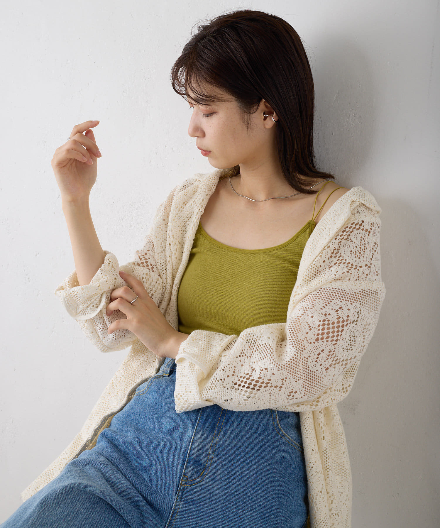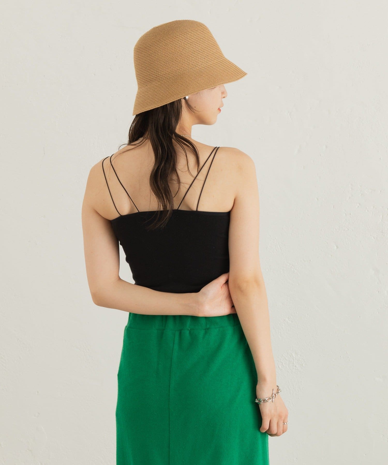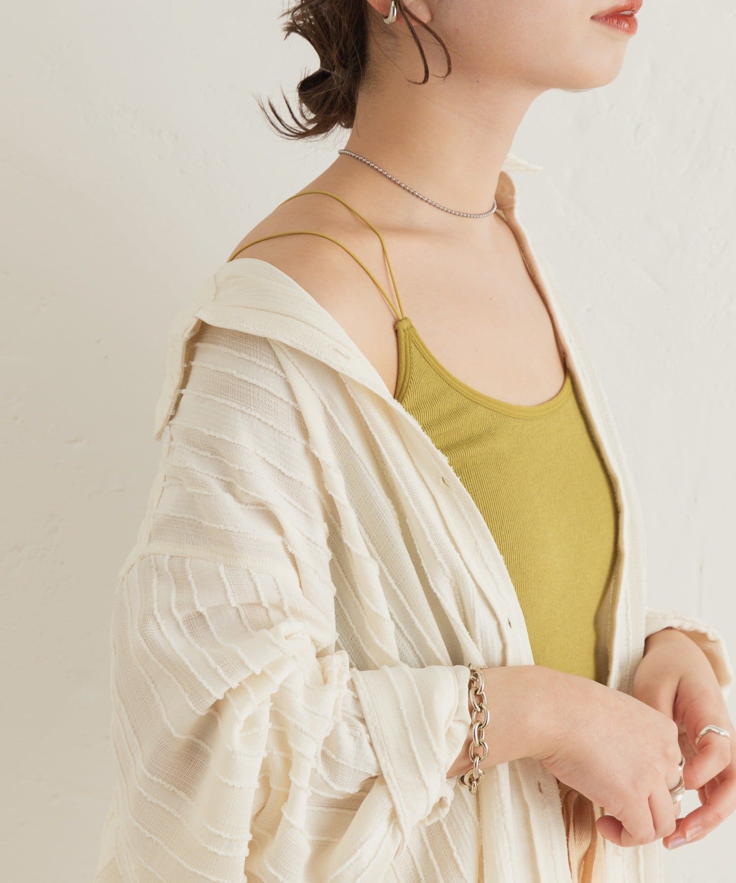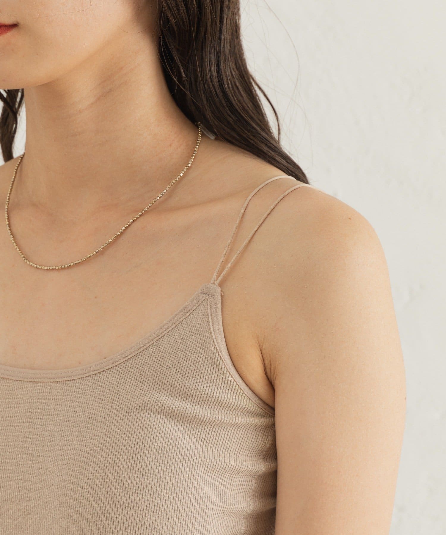 細い肩紐で女性らしい印象になるのでキャミワンピ合わせもぴったりです。