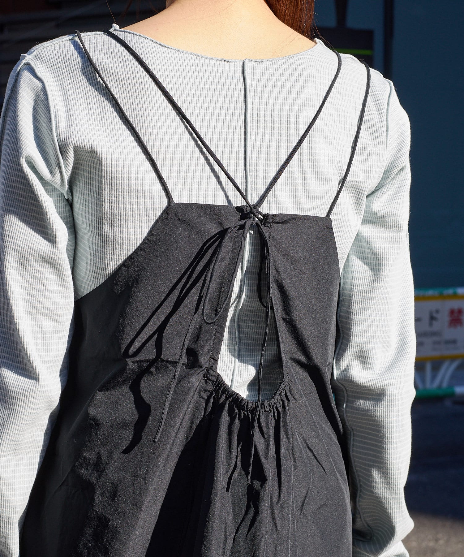 背中の開きやリボン結びがアクセントに。滑りの良いハリのある生地です。