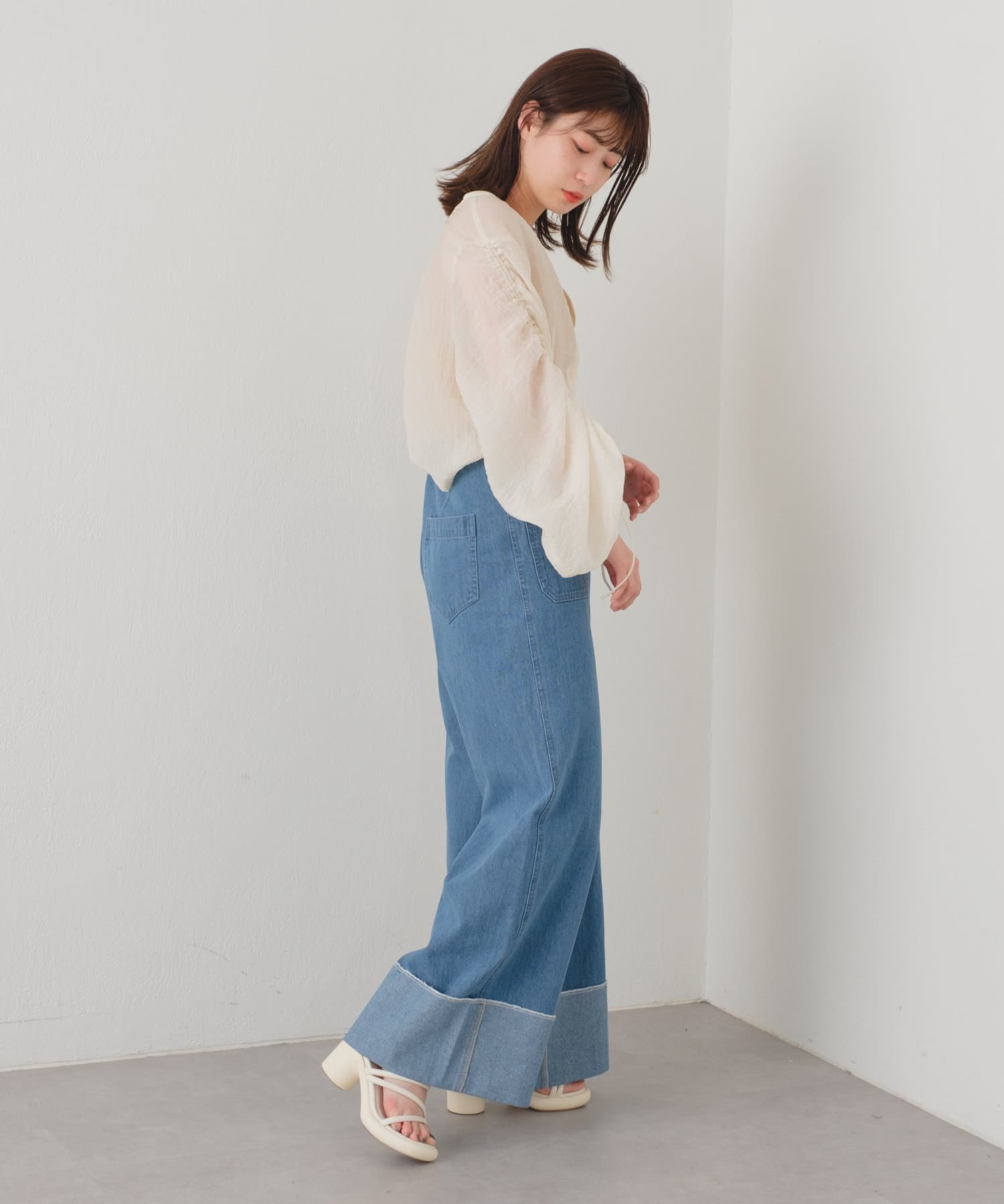 ショート丈なのでハイウエストボトムと相性抜群。