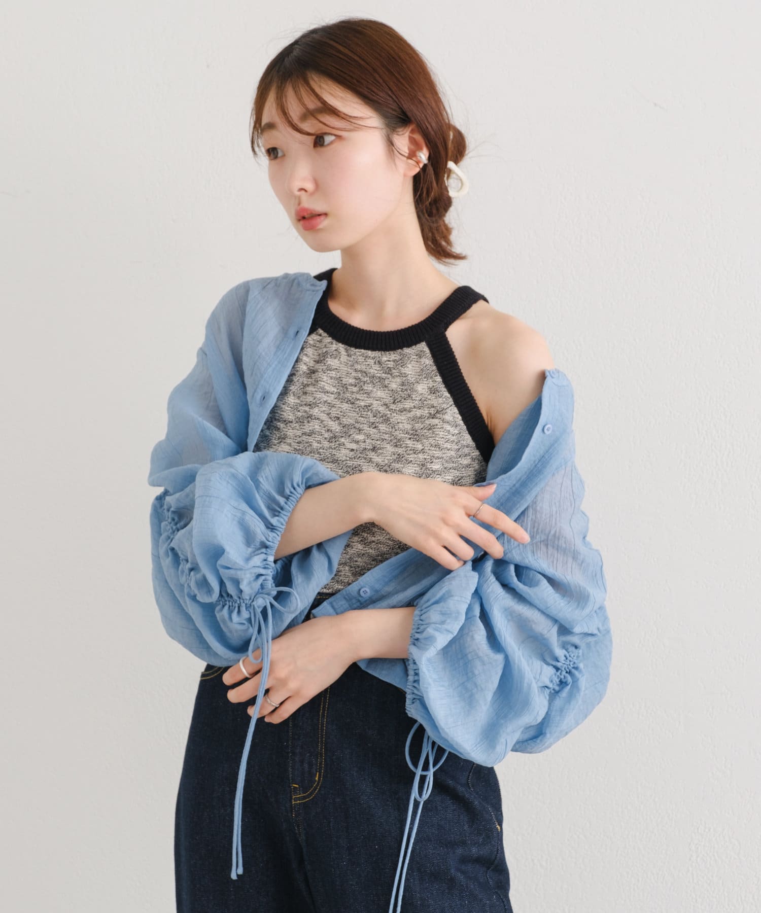 デザイン性あるシャーリング袖で1枚でも様になるアイテムです。