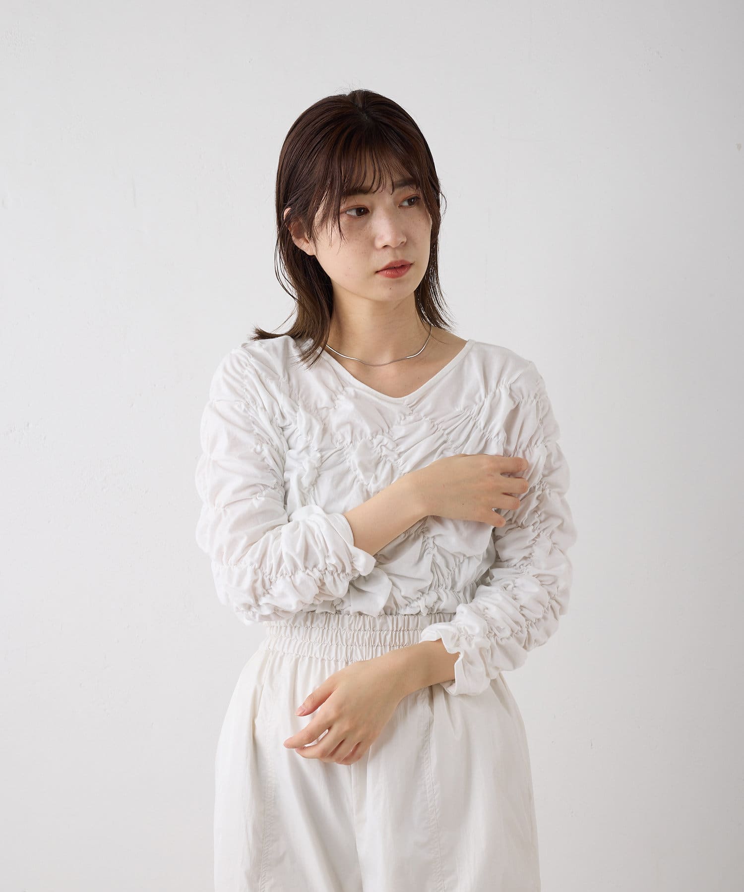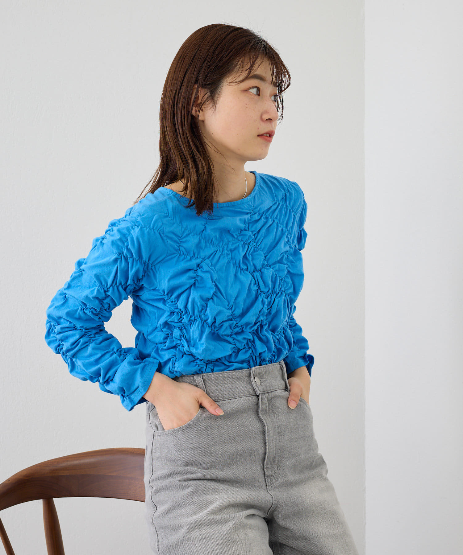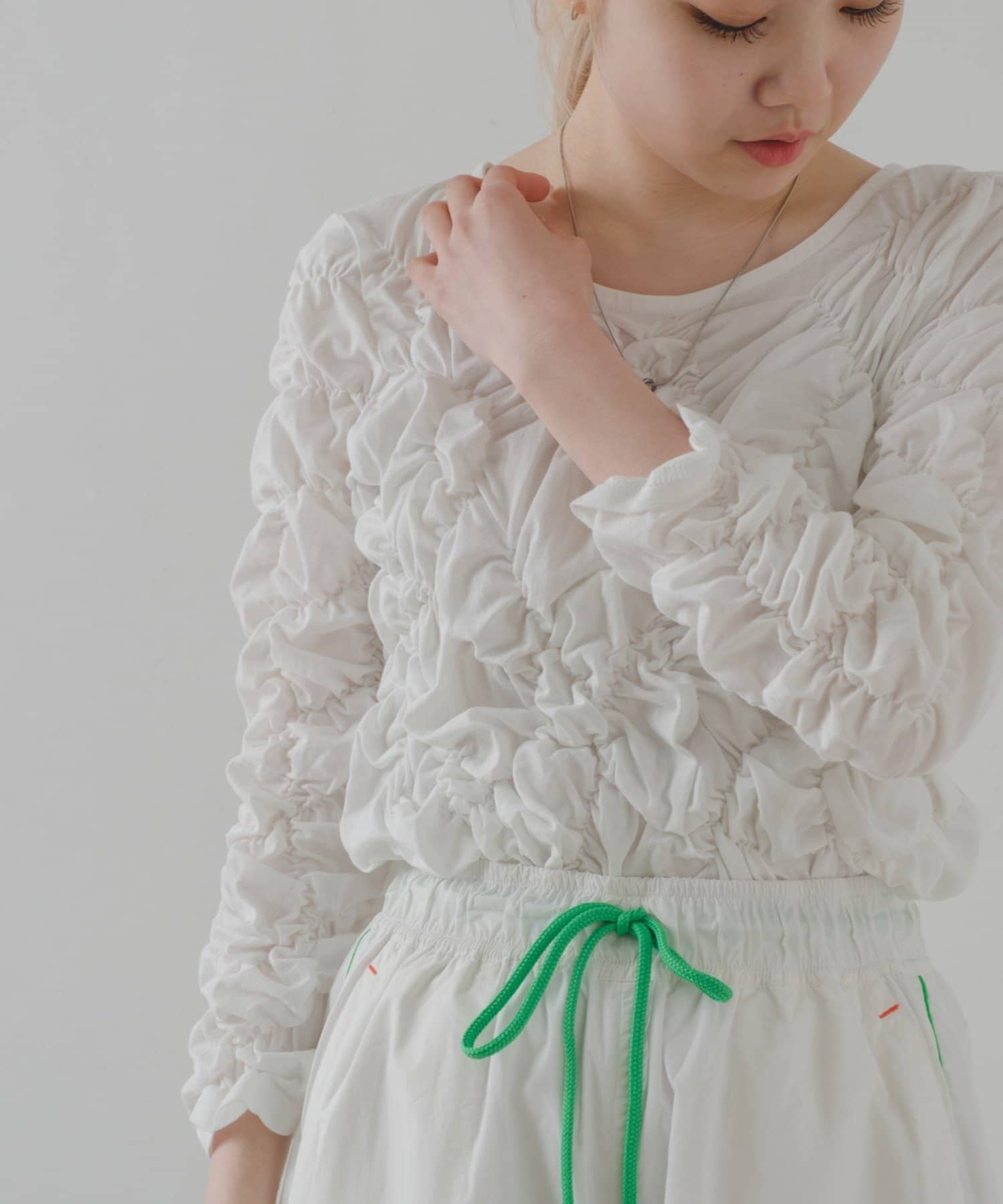 春注目のシャーリングデザインが全体に施された、立体感のあるデザイン。
