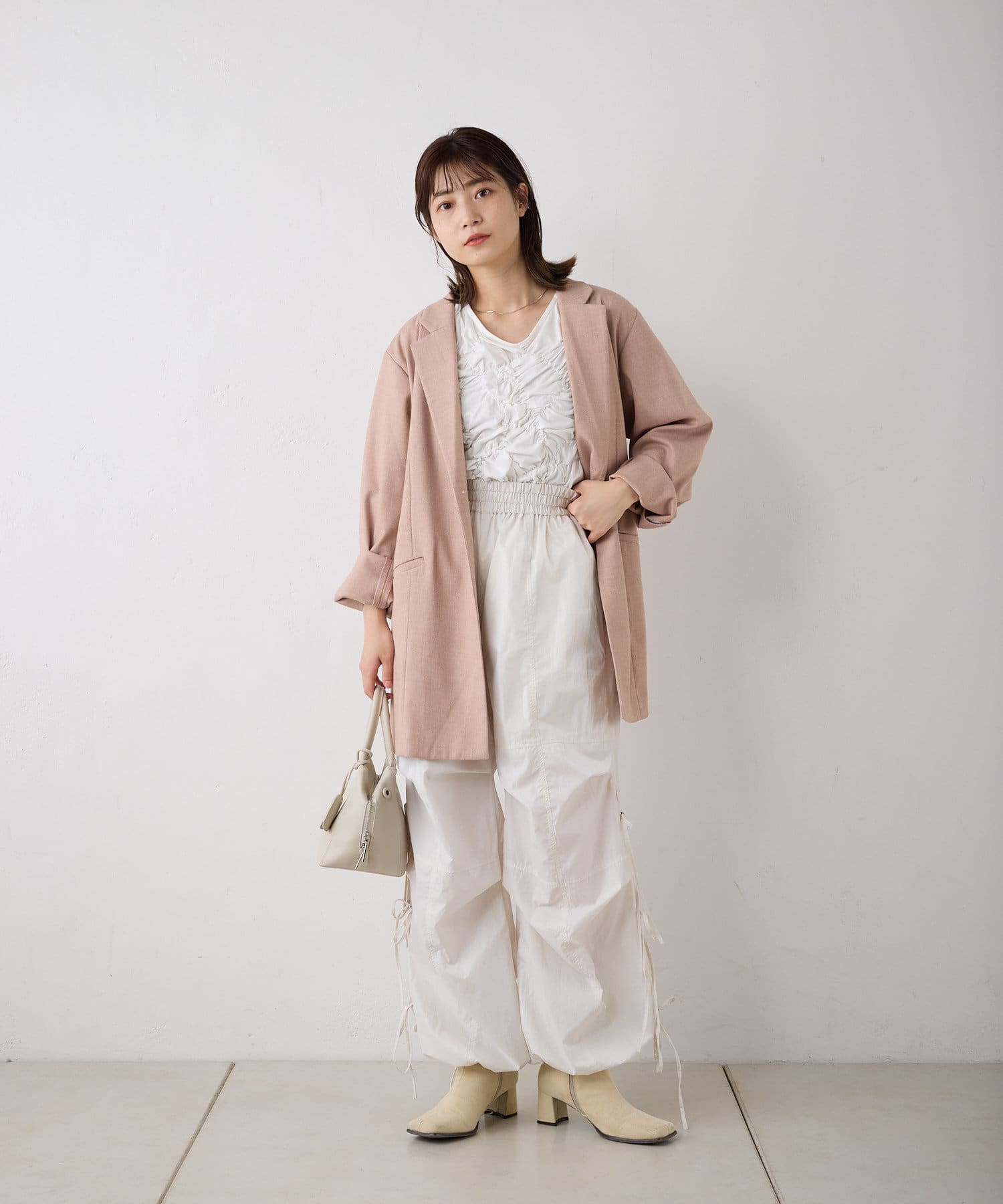 TOPSに表面感があるので、カーゴパンツやデニムなどカジュアルなボトムを合わせるのがおすすめ。