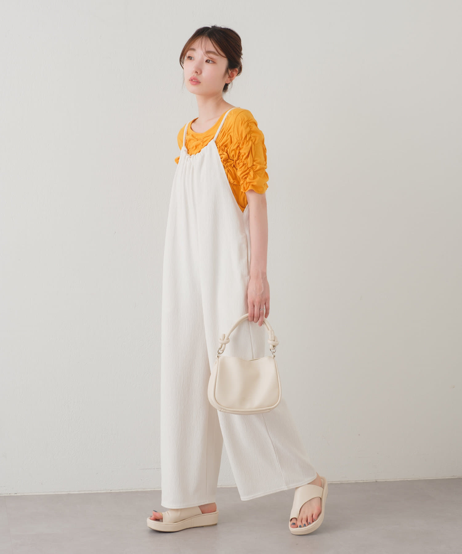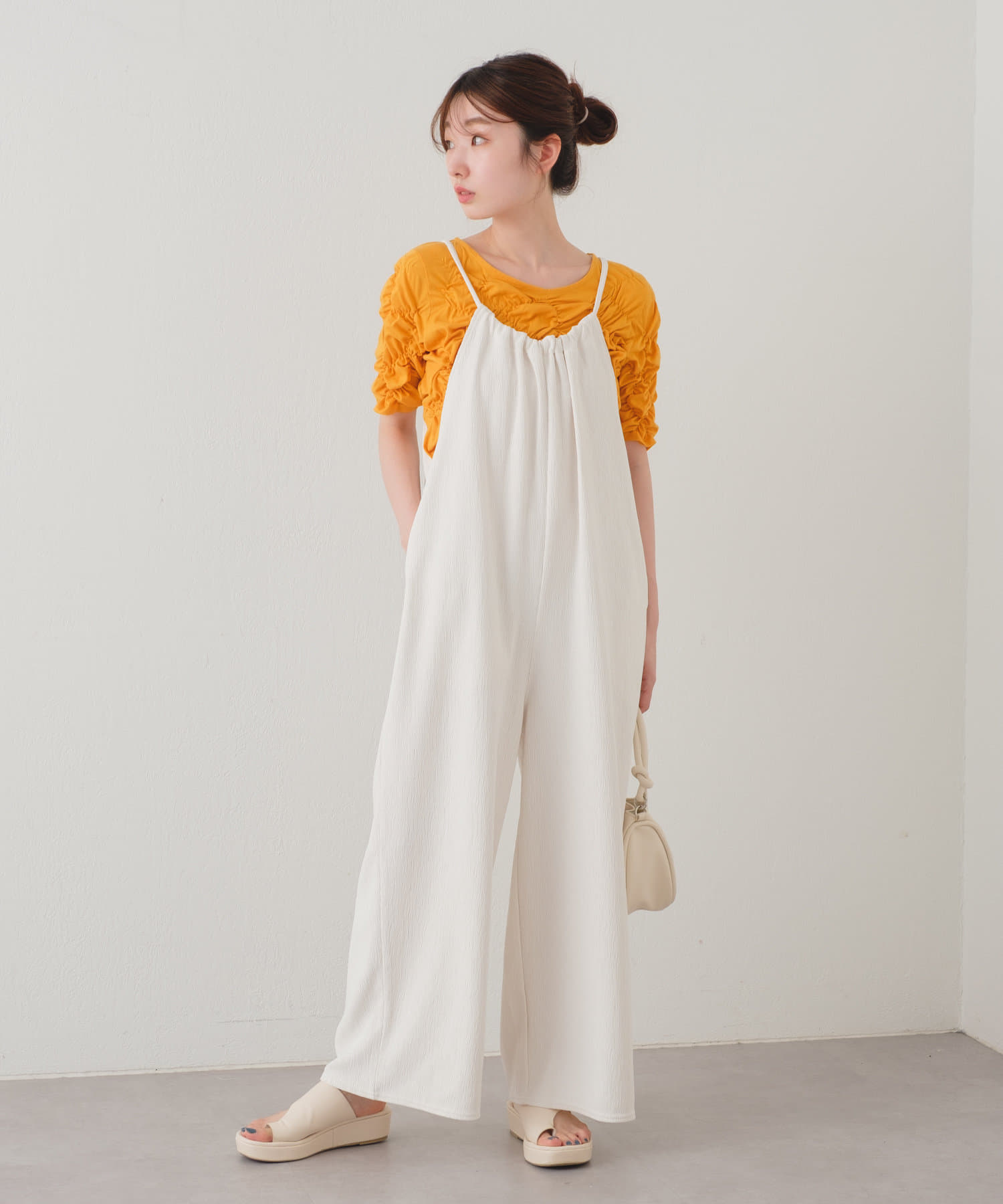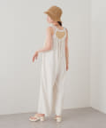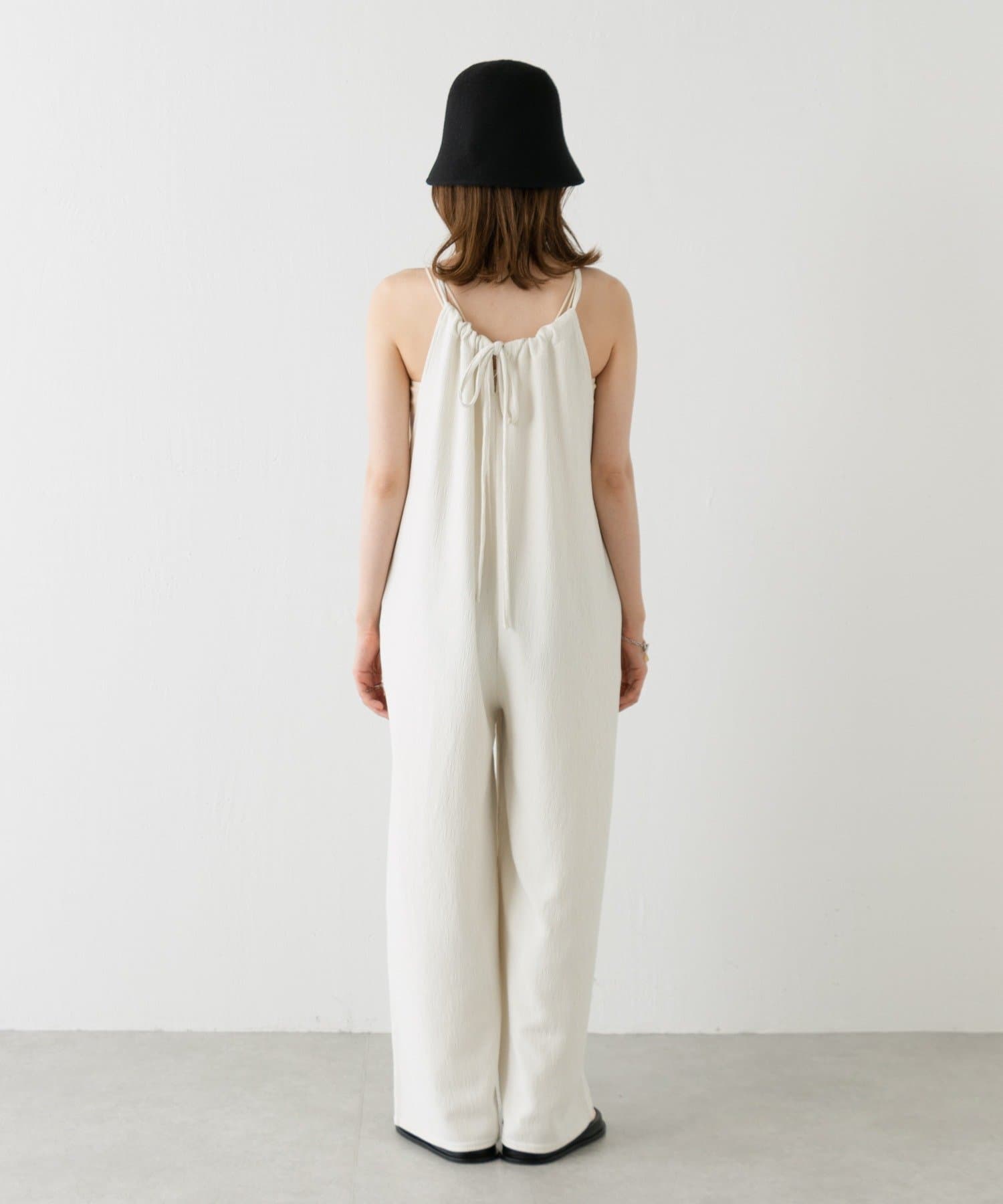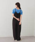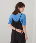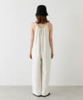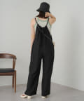 ゆったりとしたリラックスできるシルエットながらも表面感ある素材でこなれた印象が叶うサロペット。