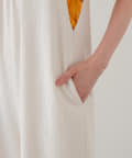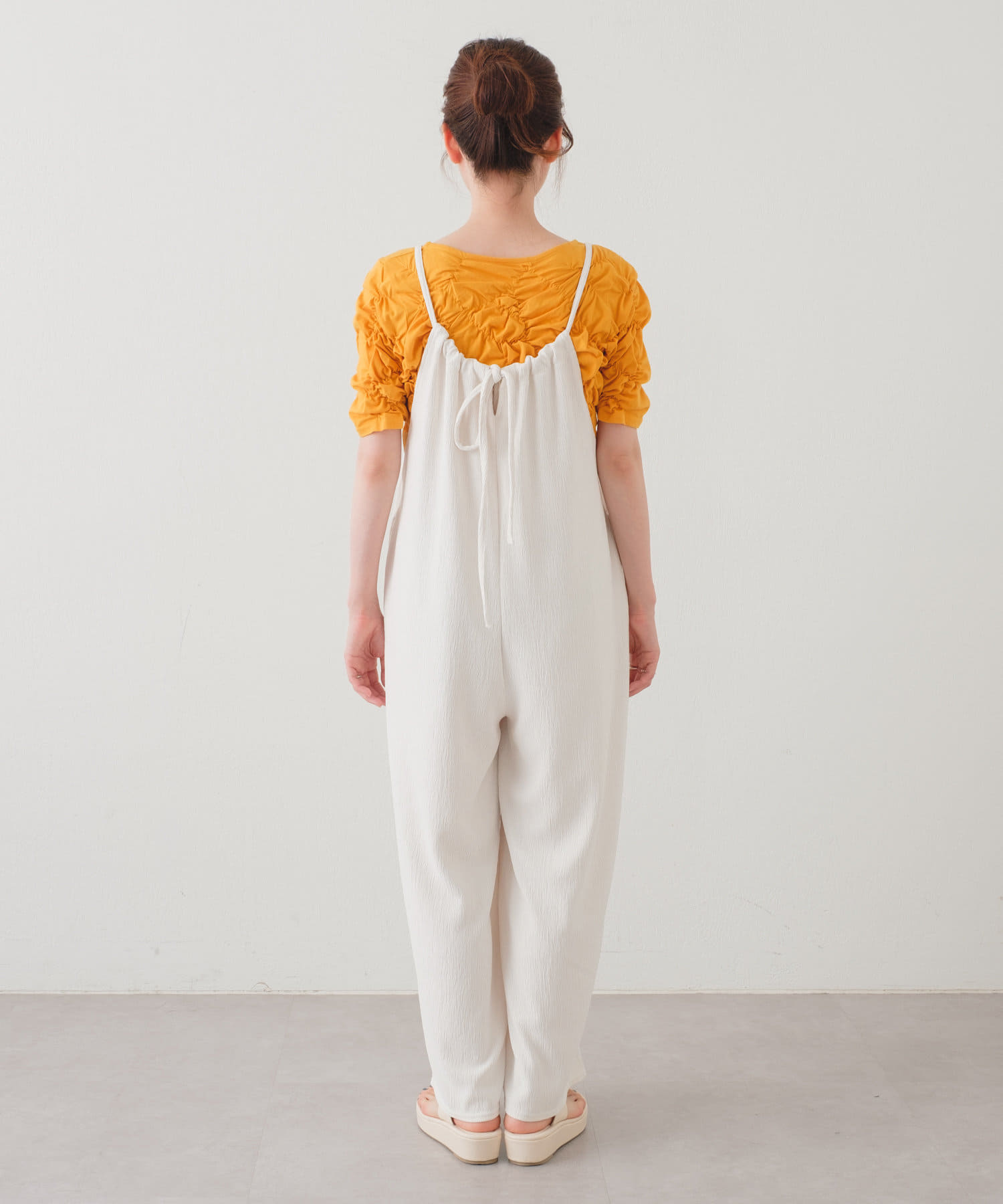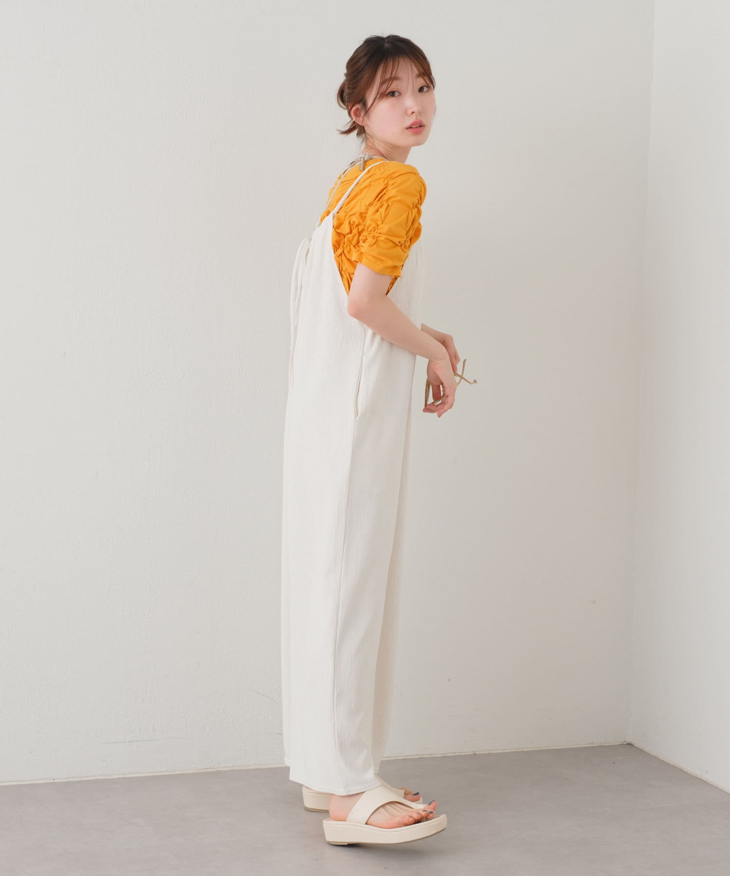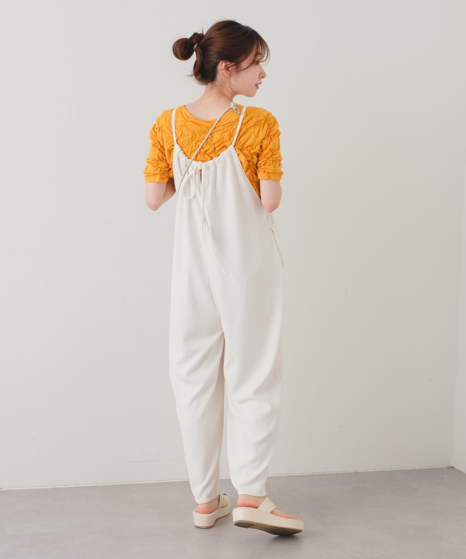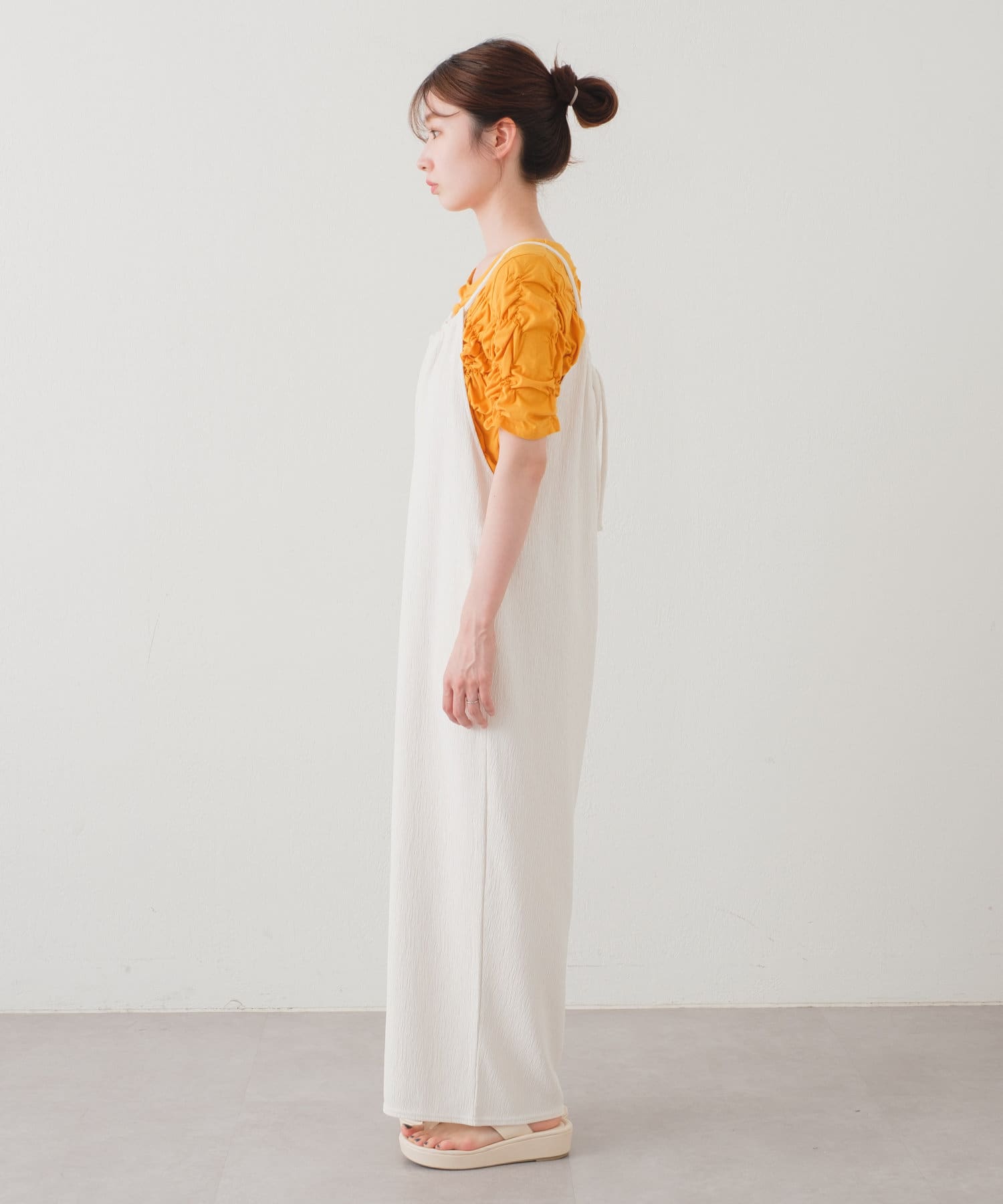 ゆったりとしたリラックスできるシルエットながらも表面感ある素材でこなれた印象が叶うサロペット。
