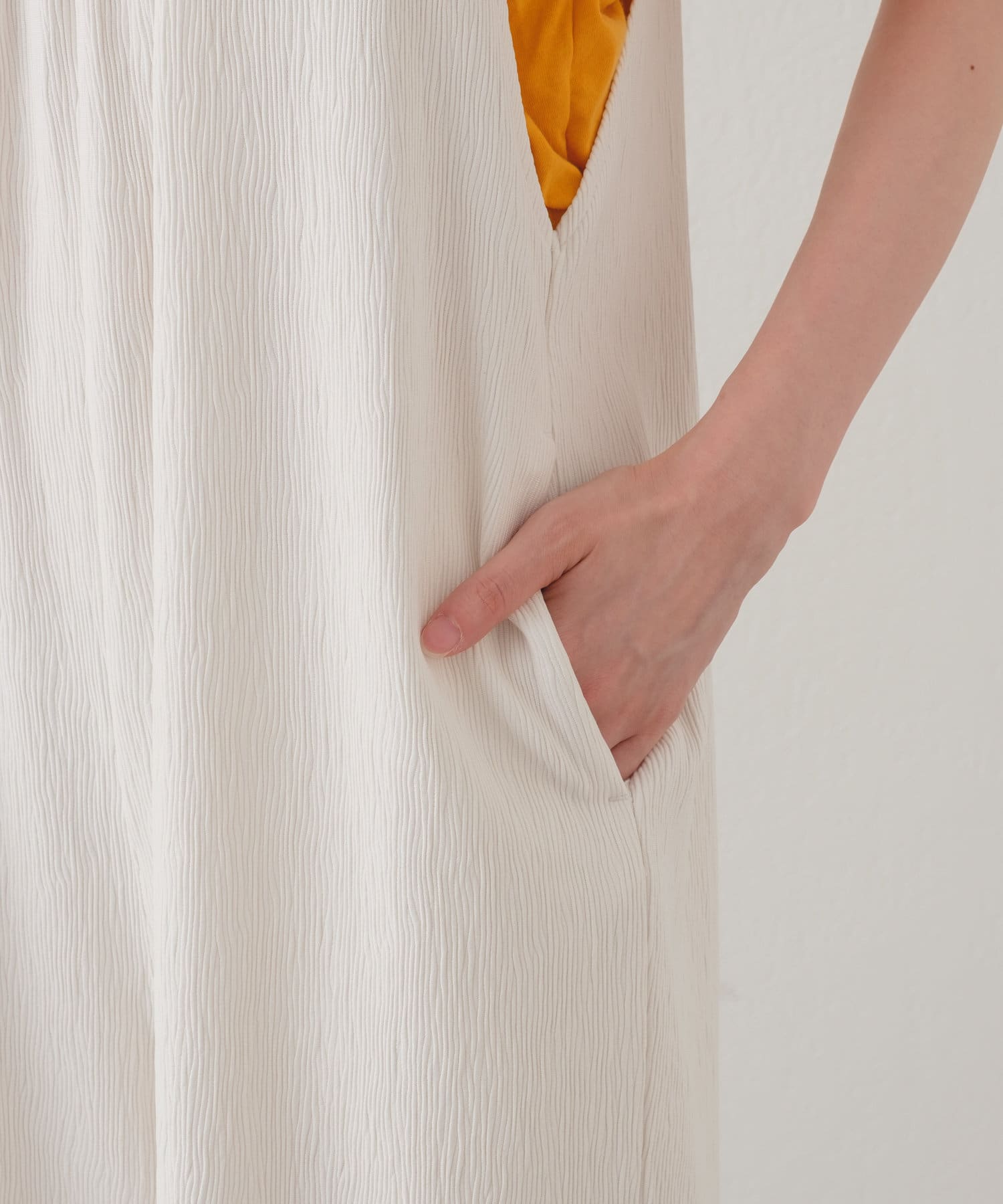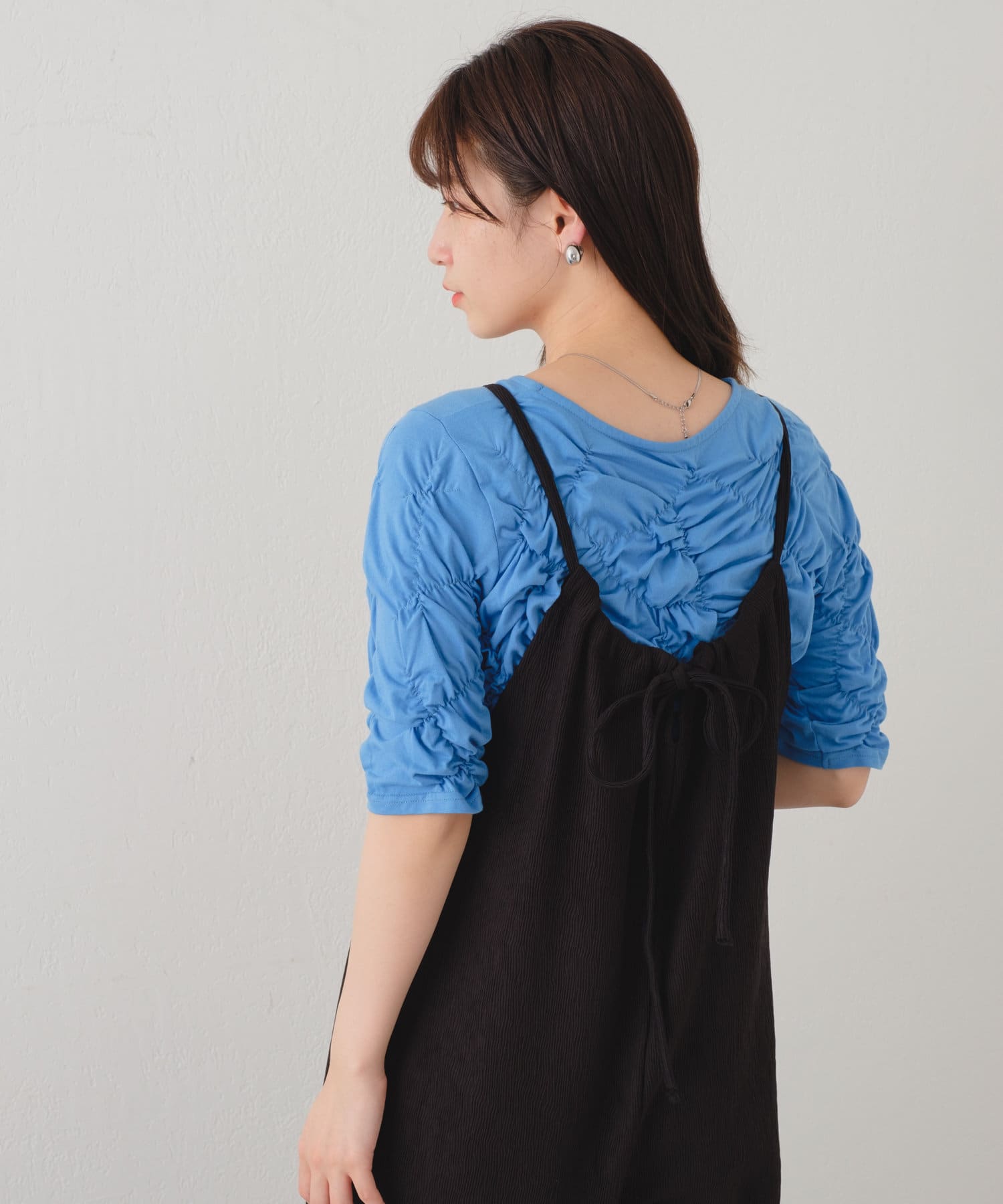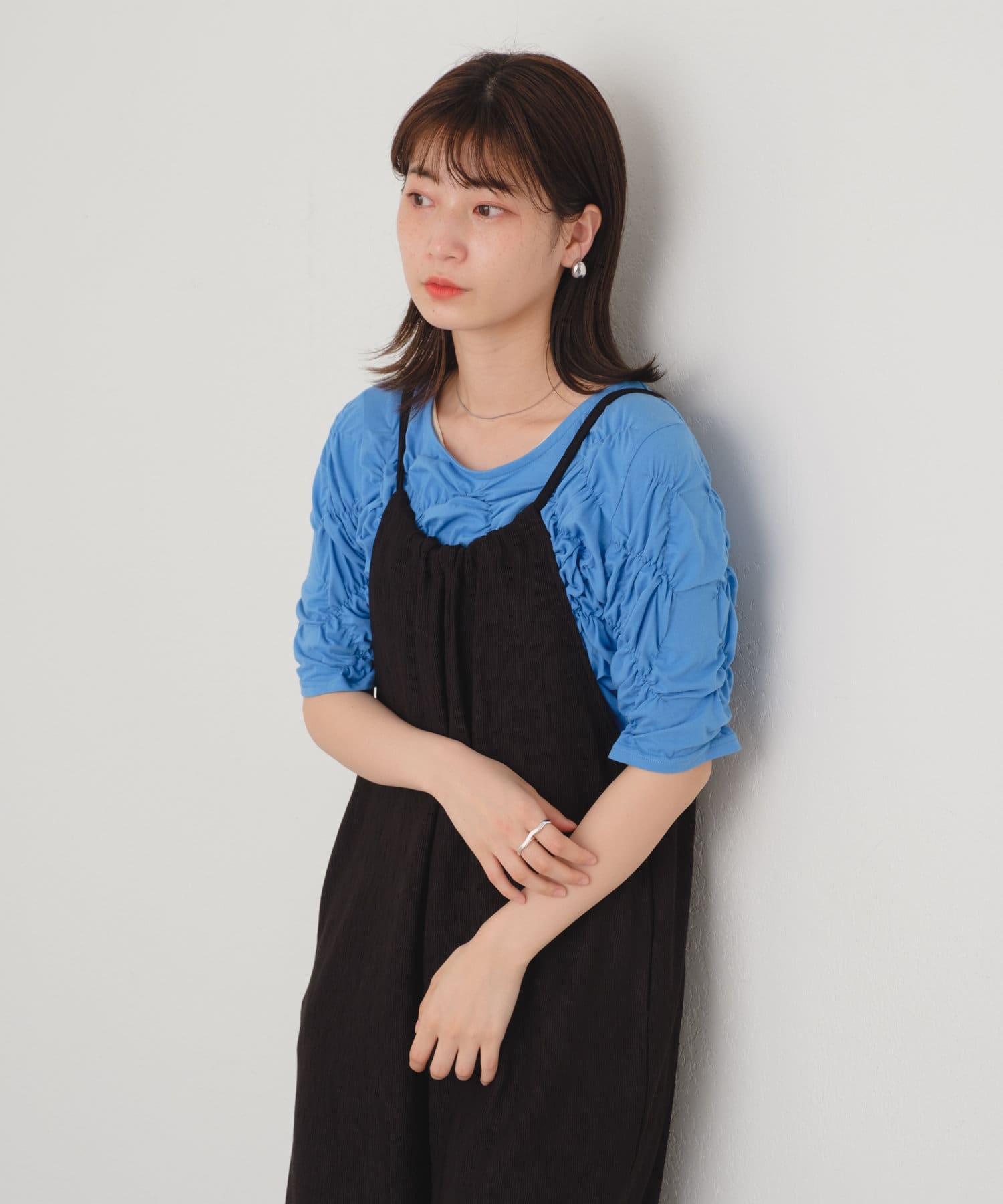 軽い素材なので、タンクトップやキャミソールと合わせて頂くと夏場の季節も涼しげなスタイリングが完成します。