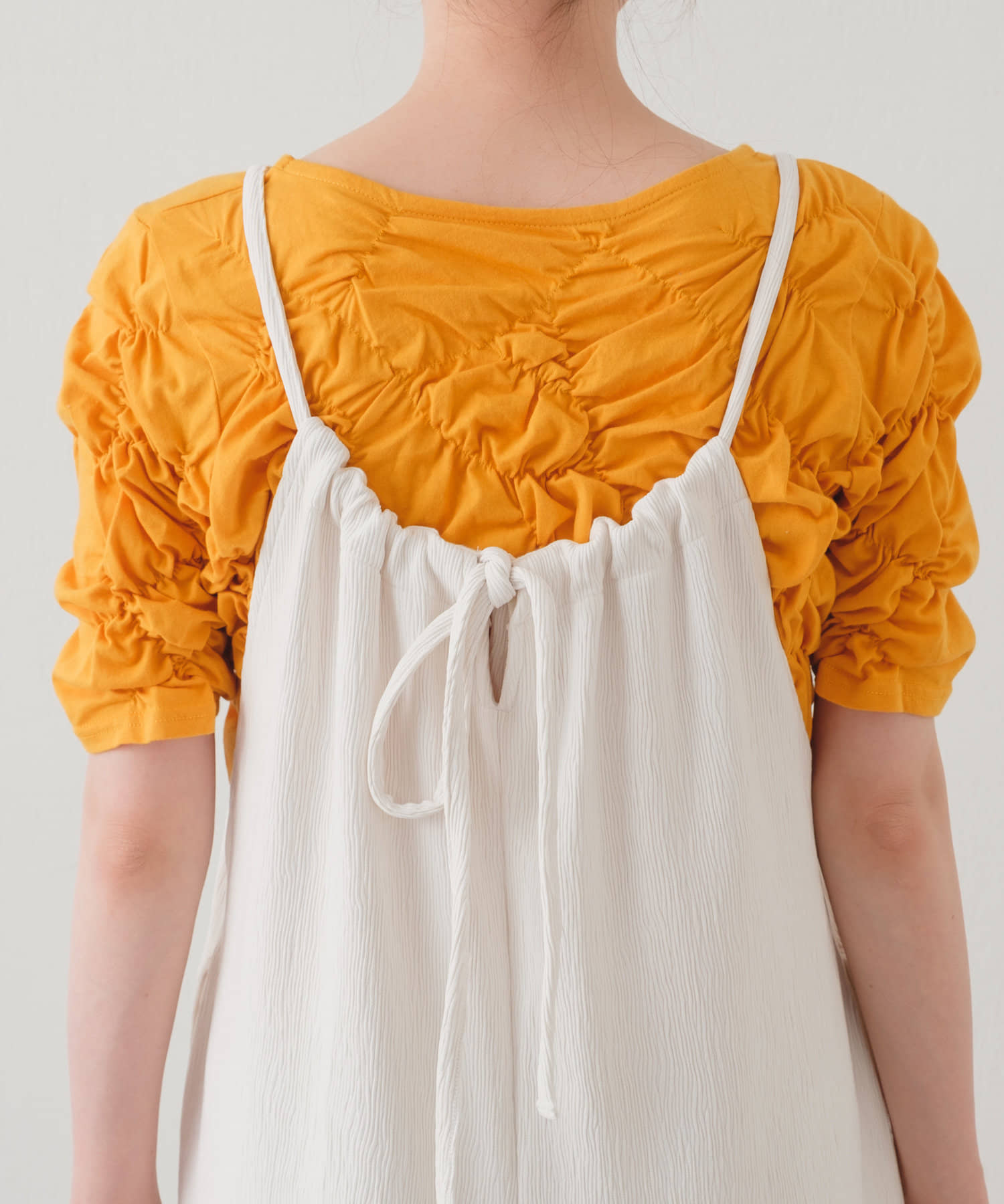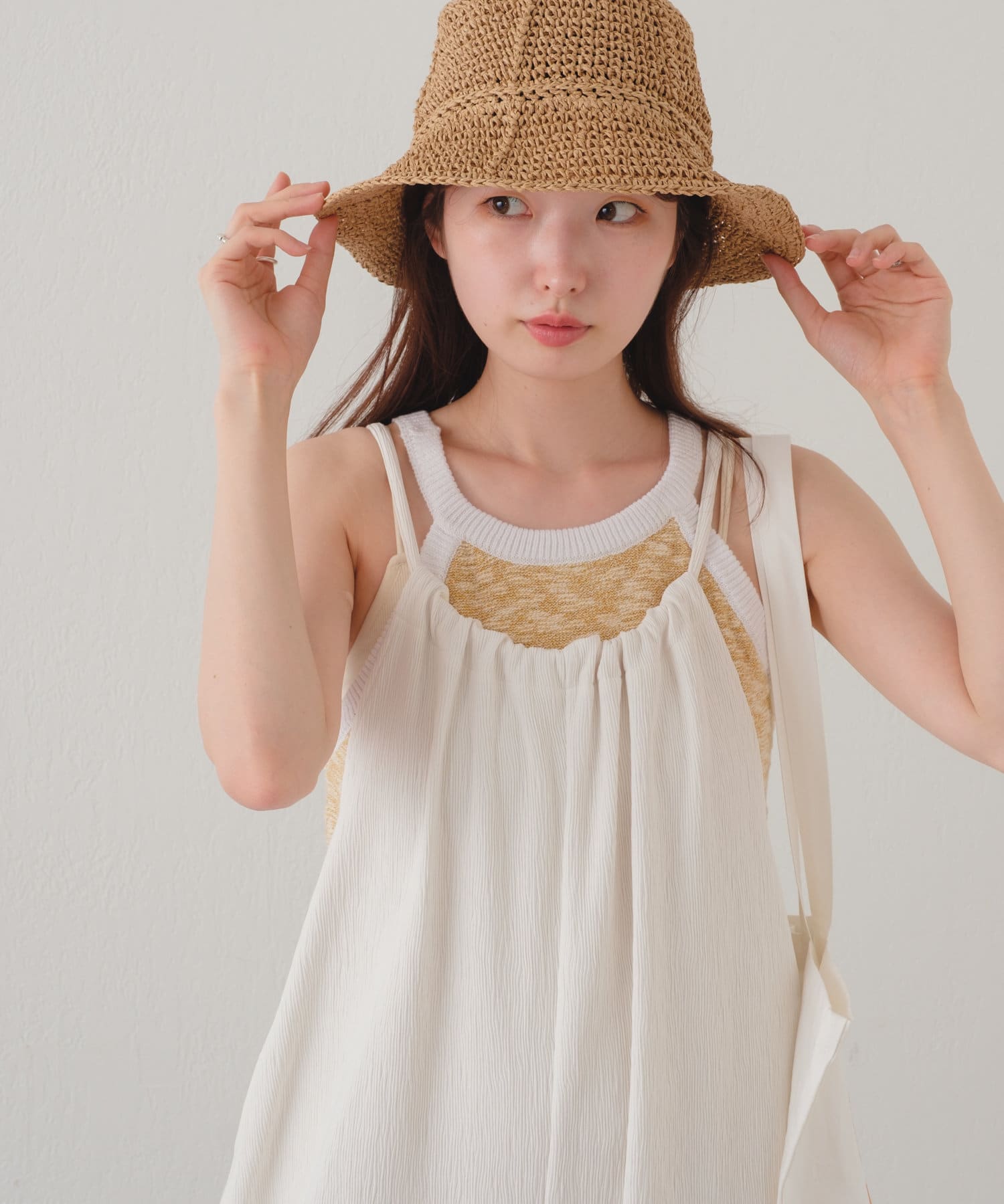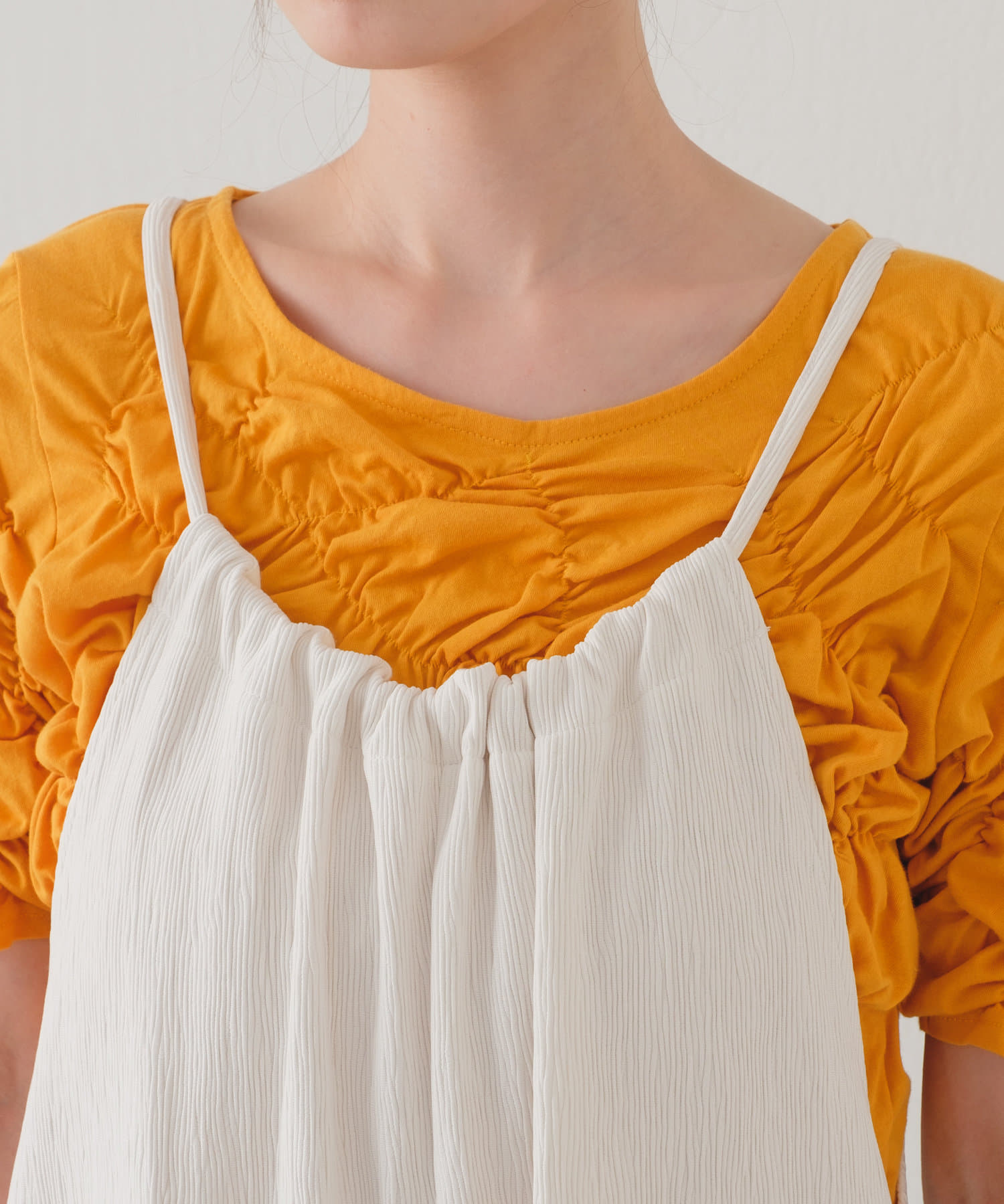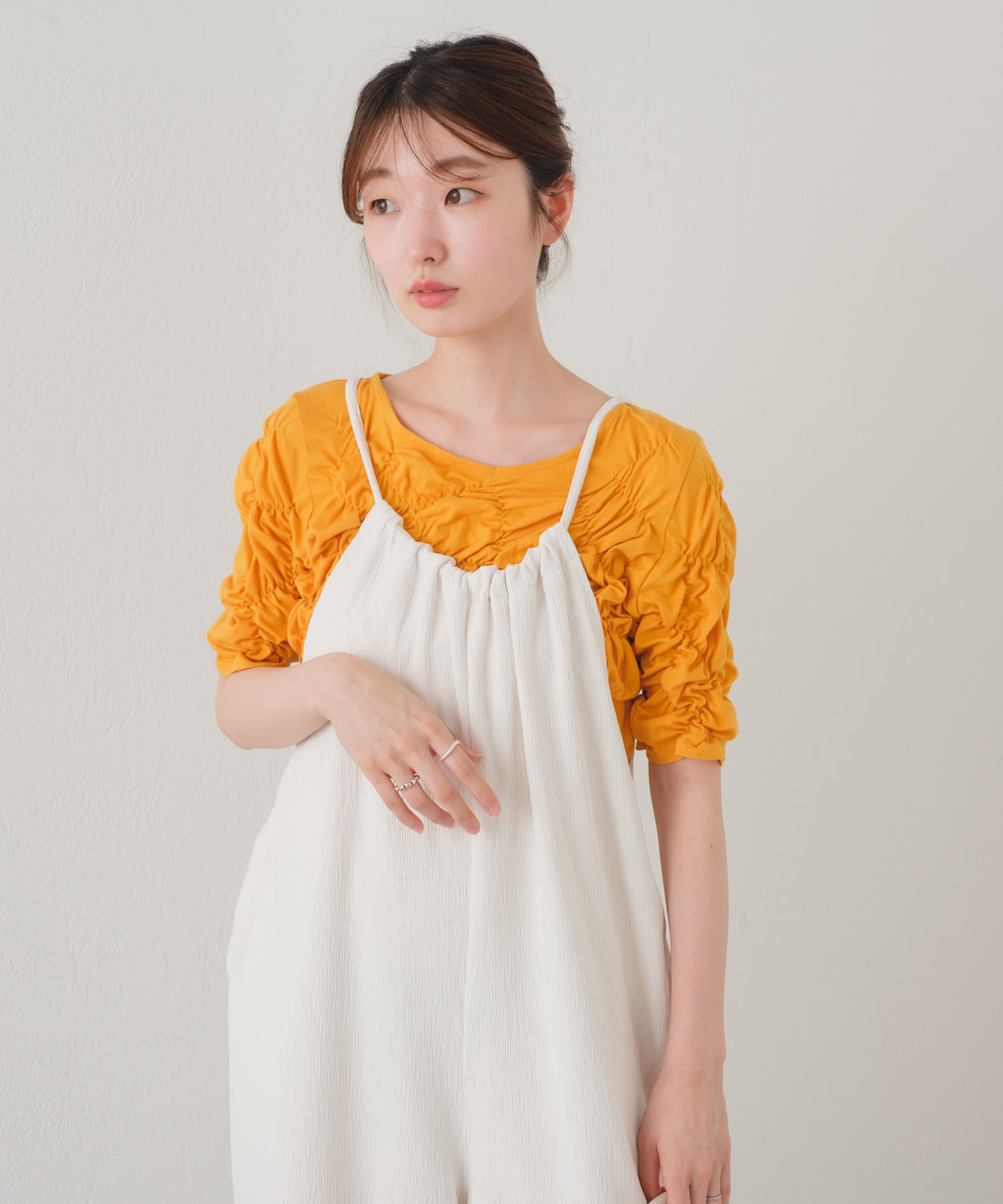 軽い素材なので、タンクトップやキャミソールと合わせて頂くと夏場の季節も涼しげなスタイリングが完成します。