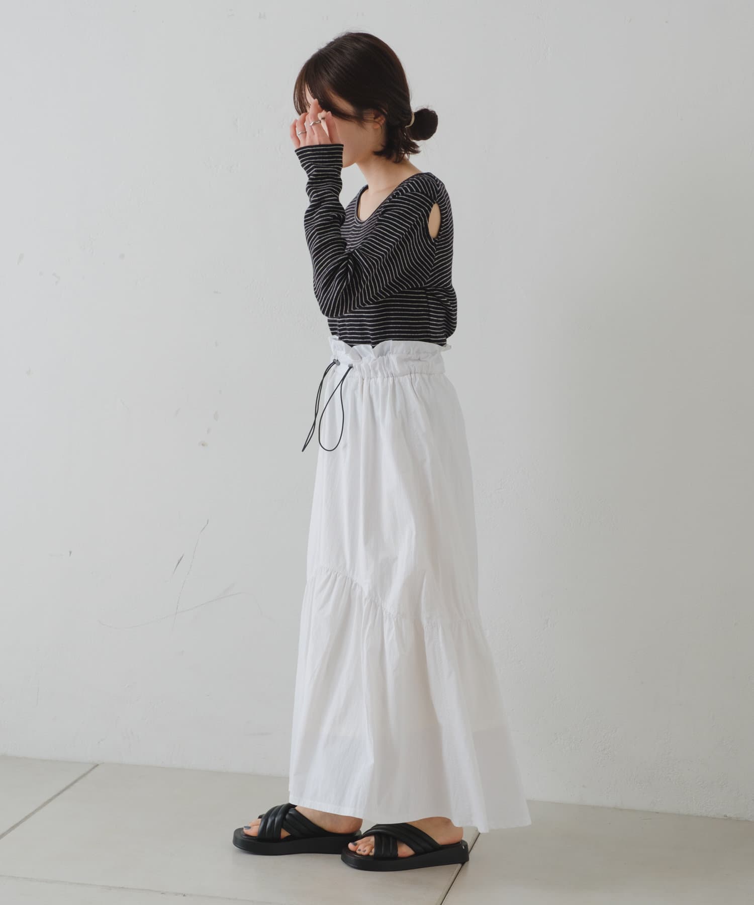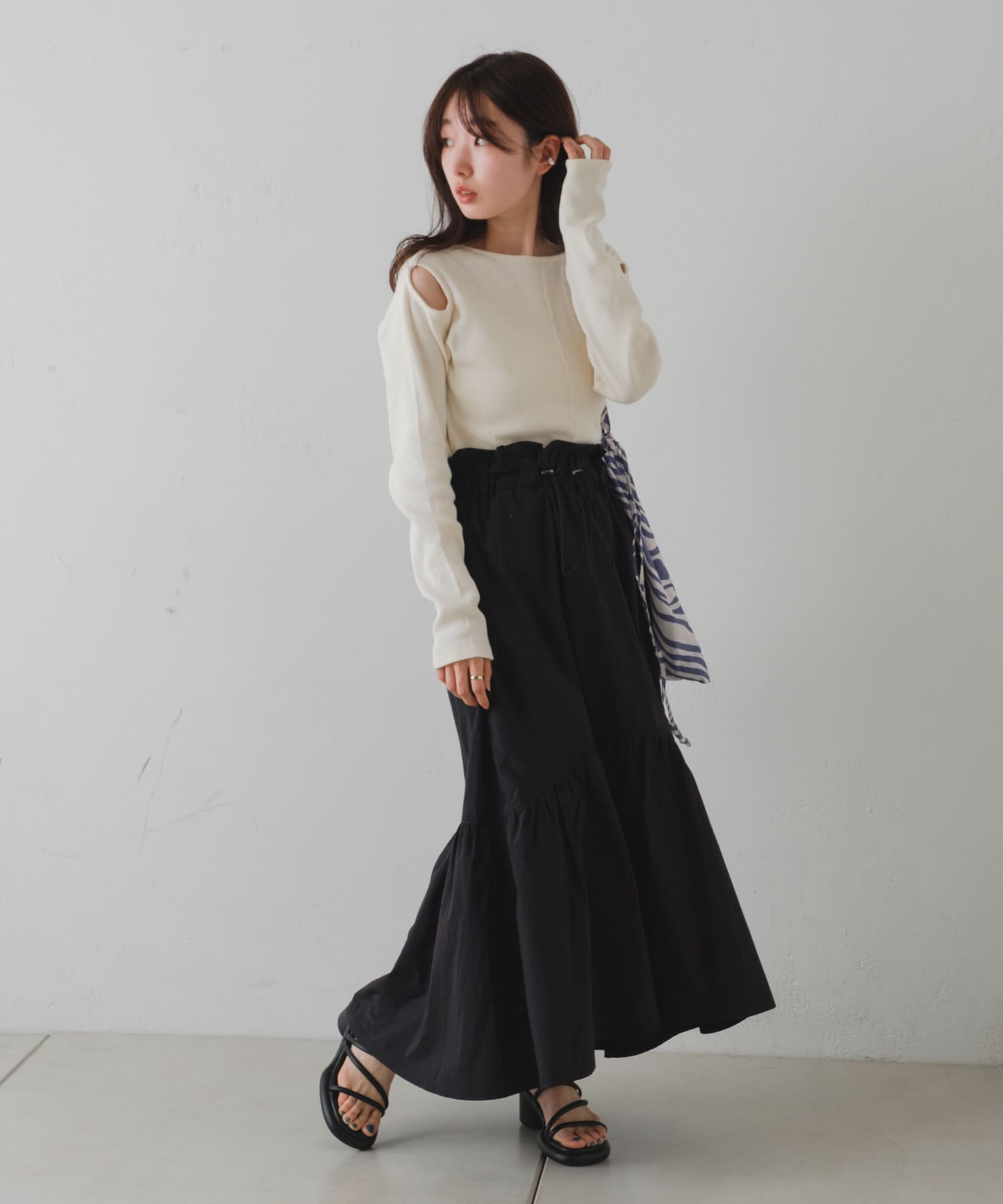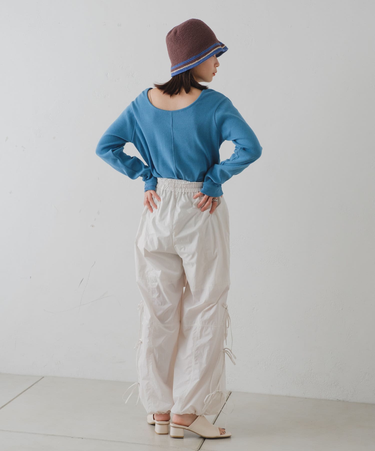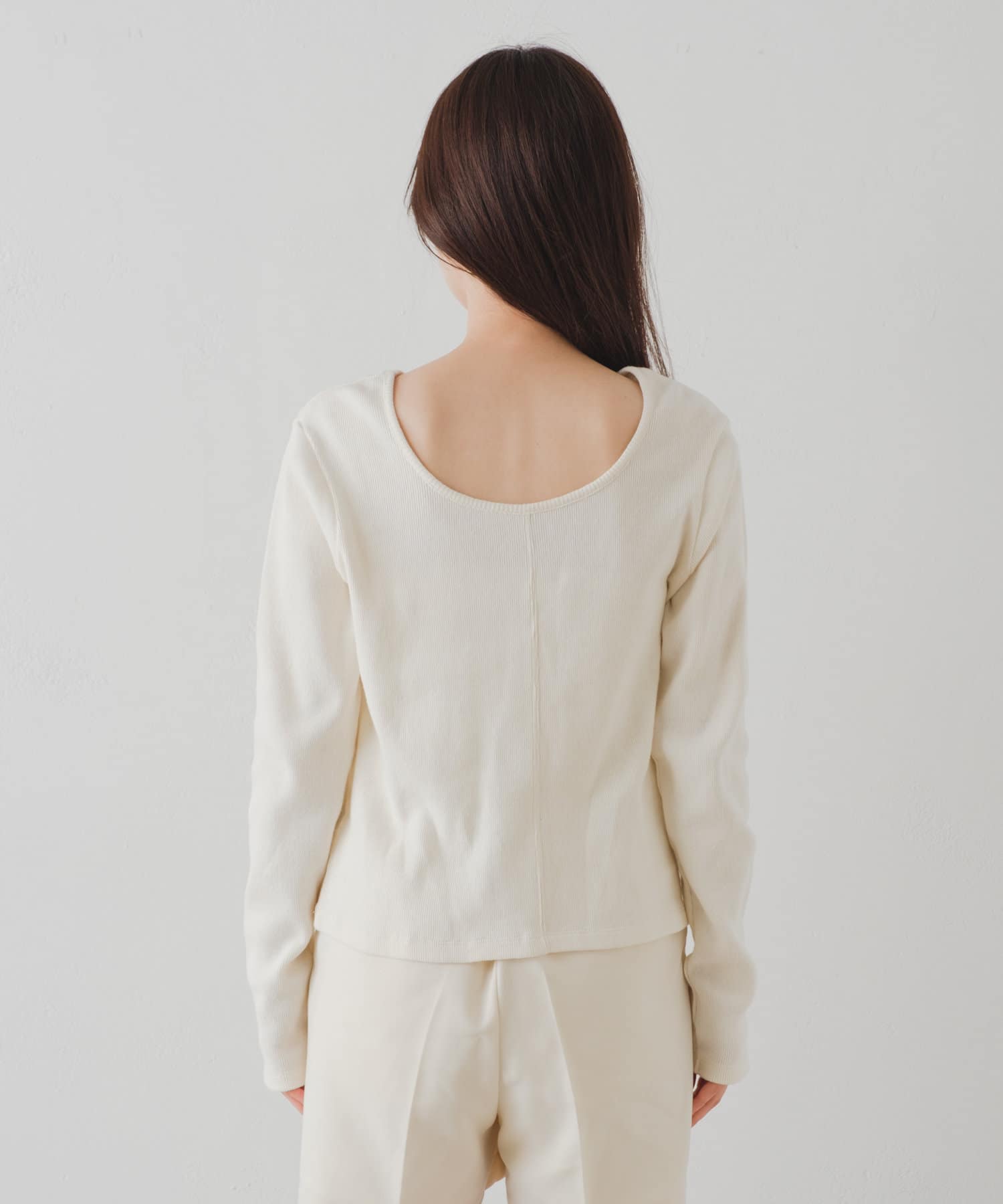前後どちらでも着用頂けるので、首周りの開き具合やスリットの位置をスタイリングに合わせて変化を付けて着用可能◎