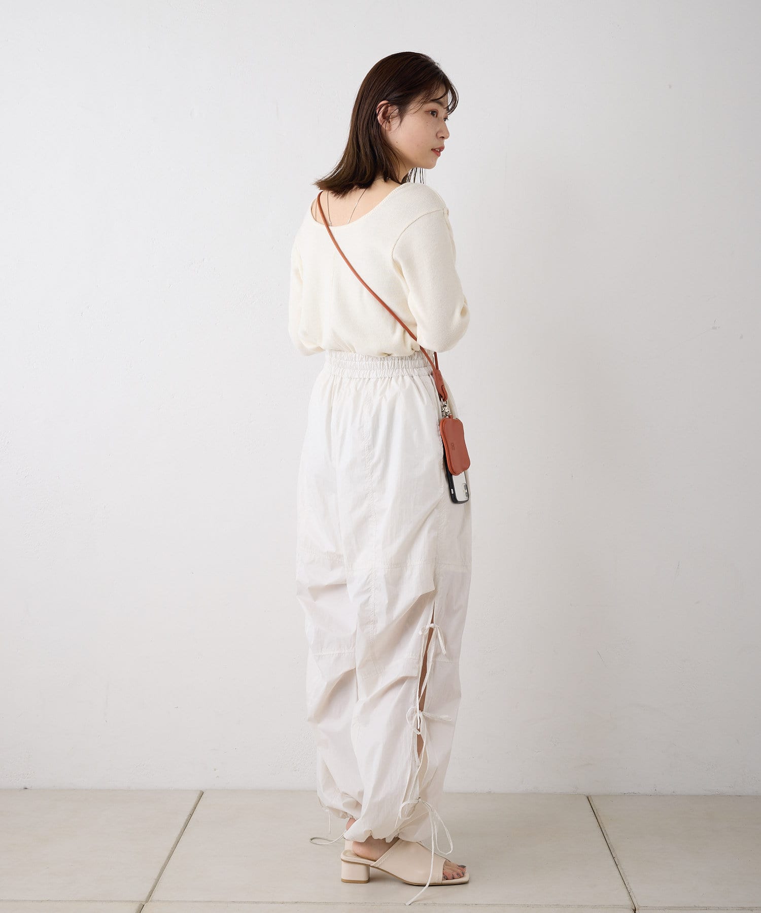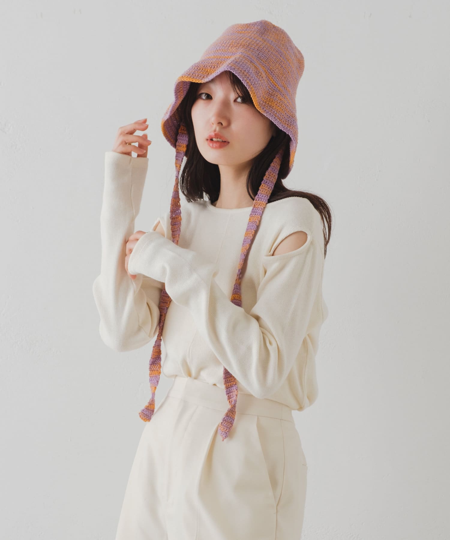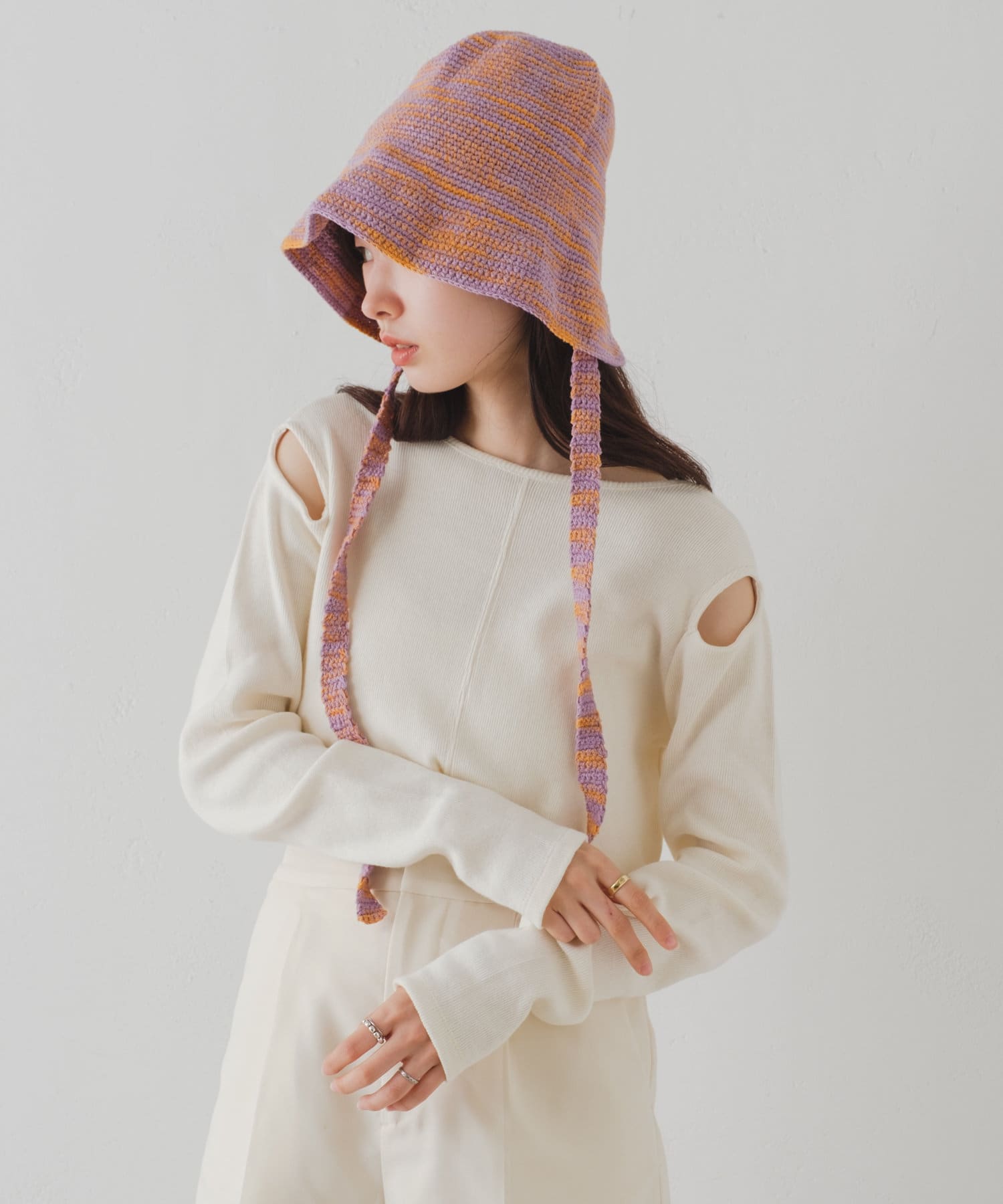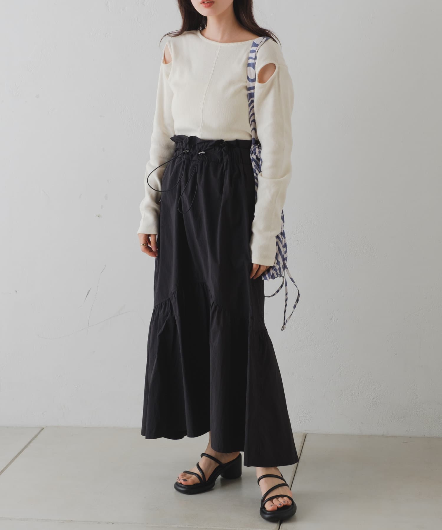 前後どちらでも着用頂けるので、首周りの開き具合やスリットの位置をスタイリングに合わせて変化を付けて着用可能◎