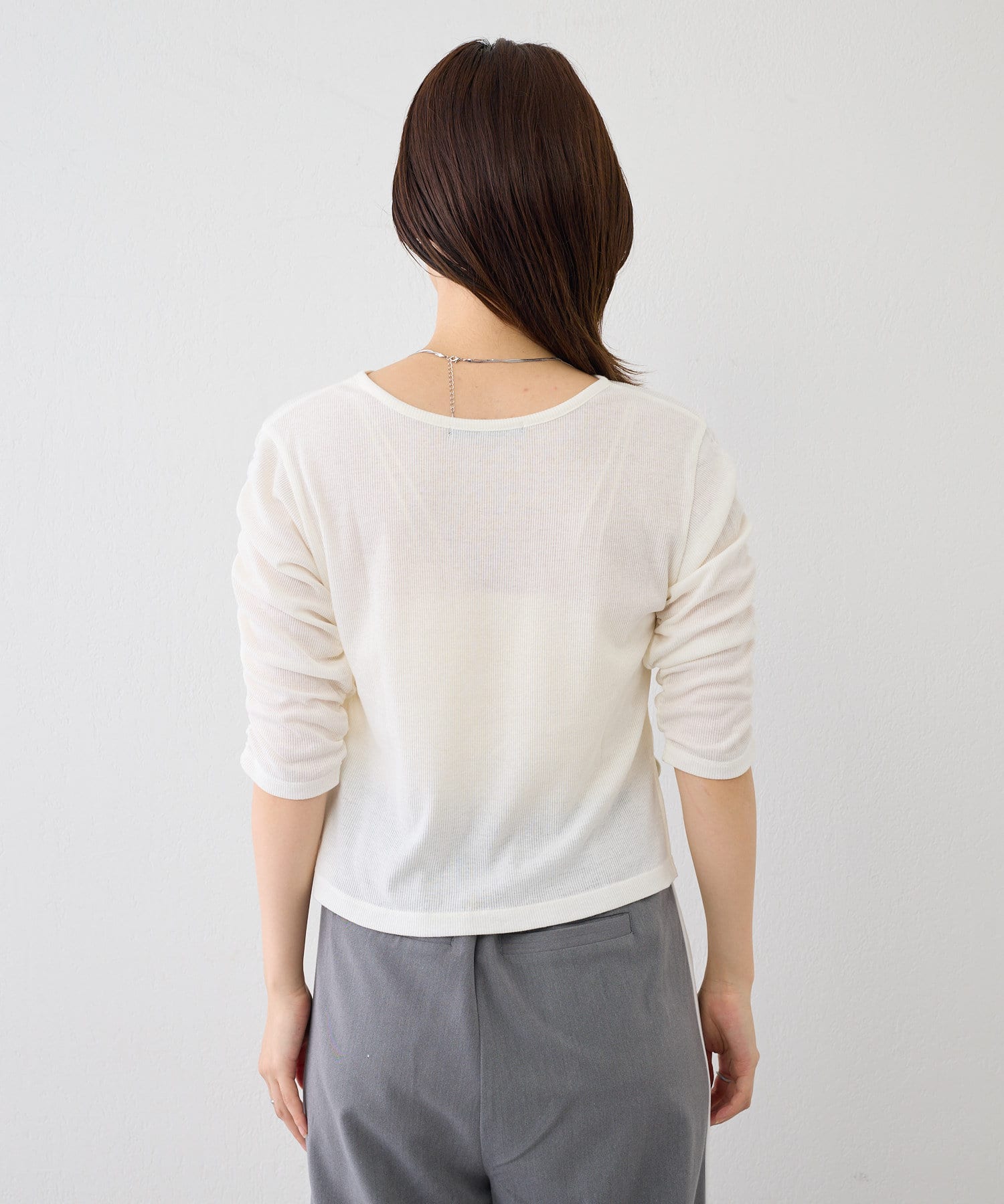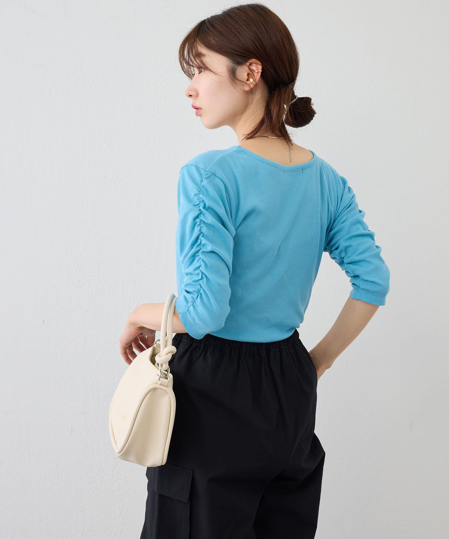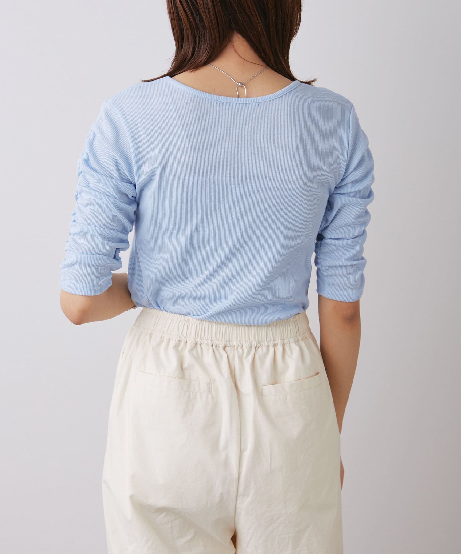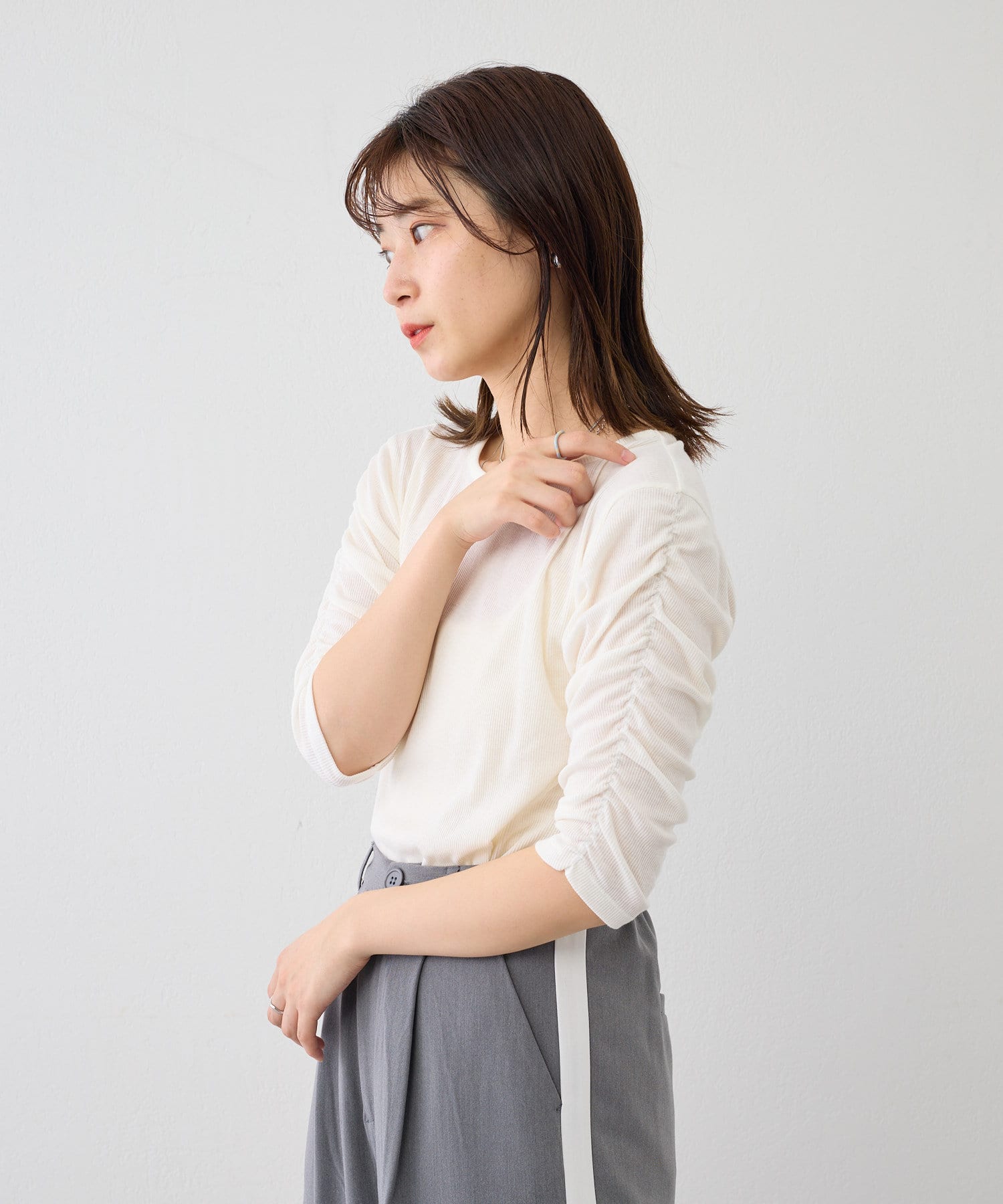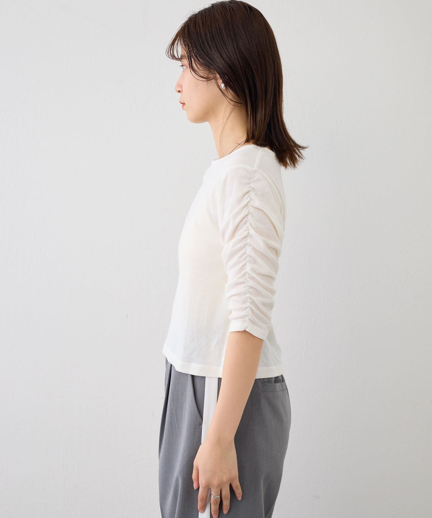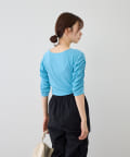 袖にあしらわれたシャーリングがポイントの5分袖Teeが登場。