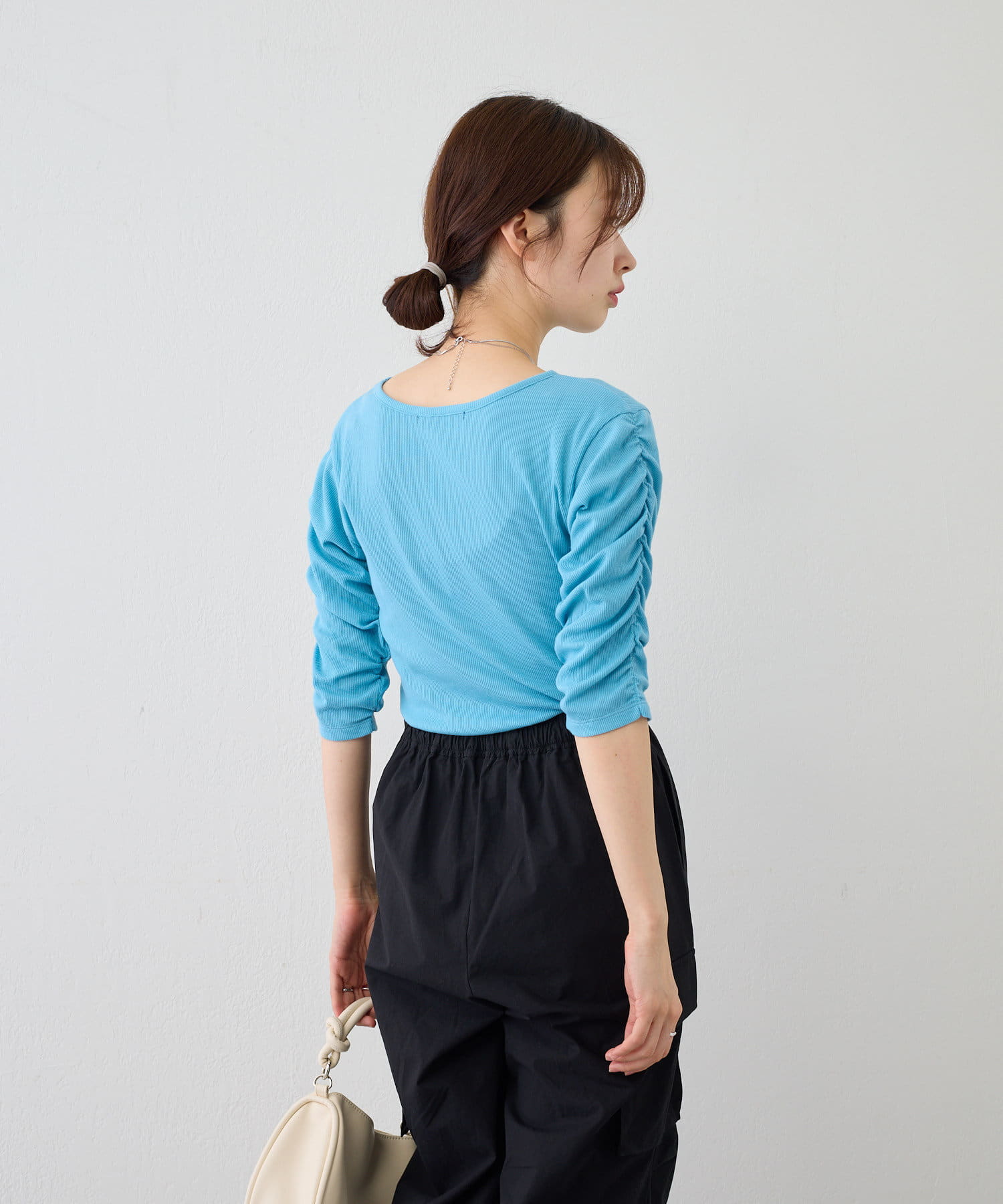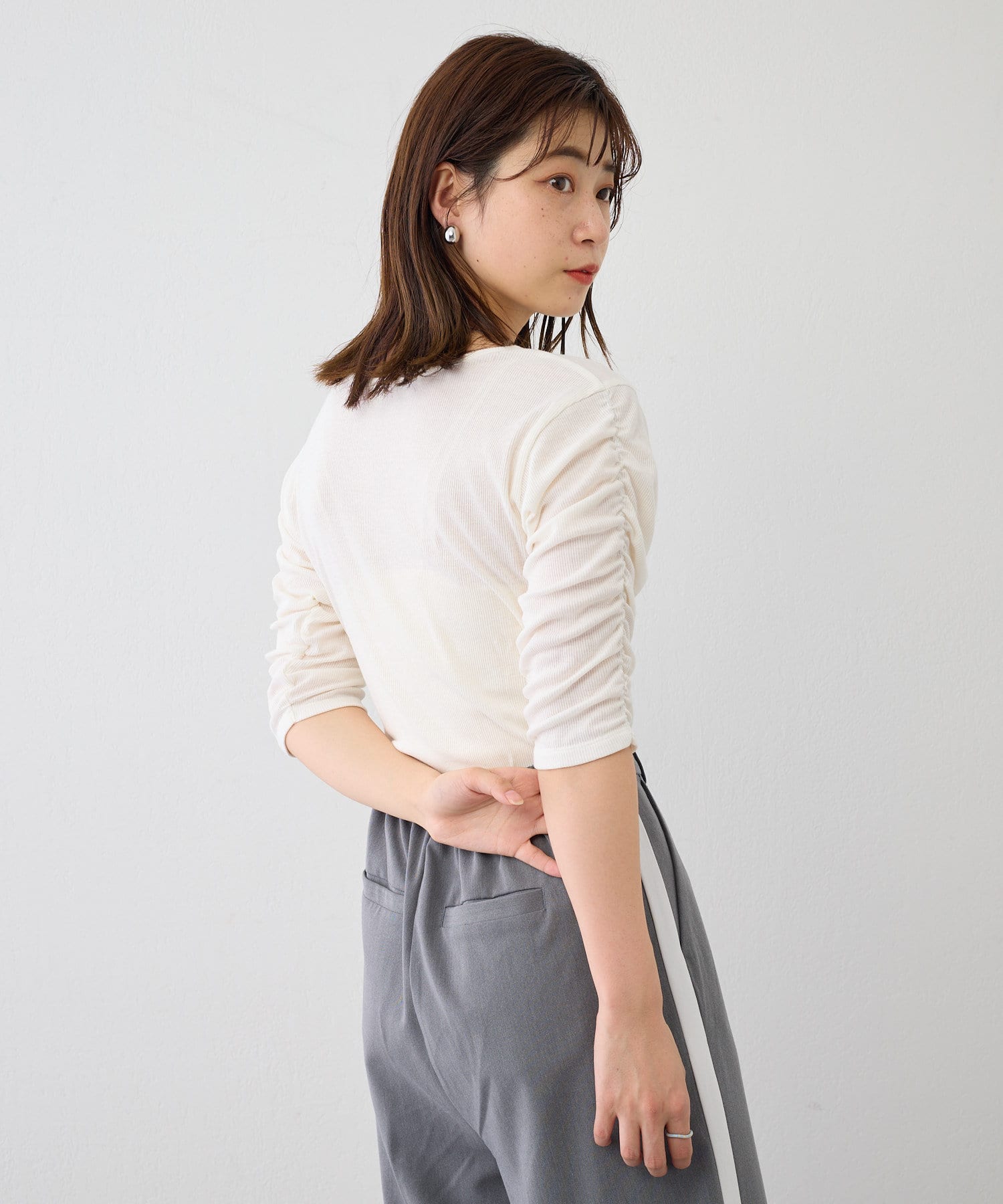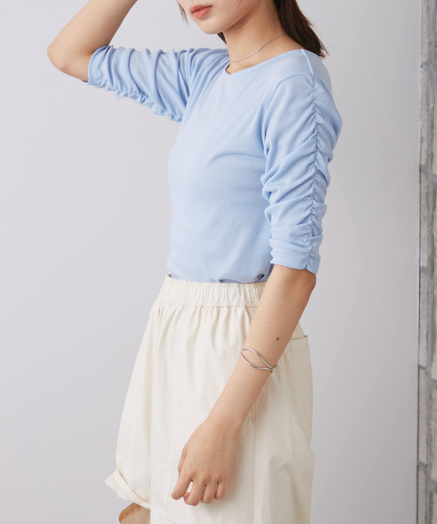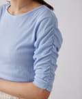 袖シャーリングが目を惹く5分袖カットソー