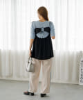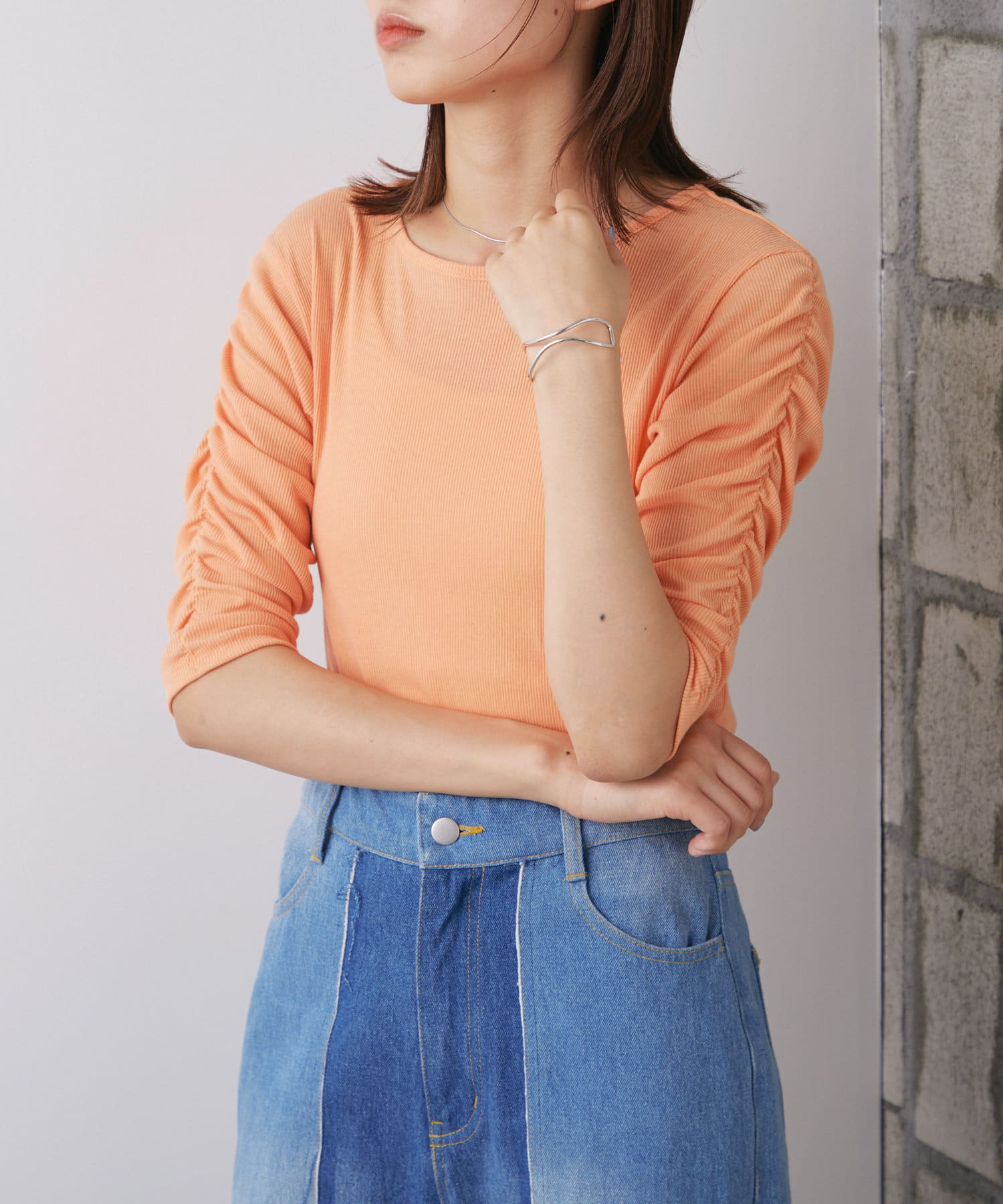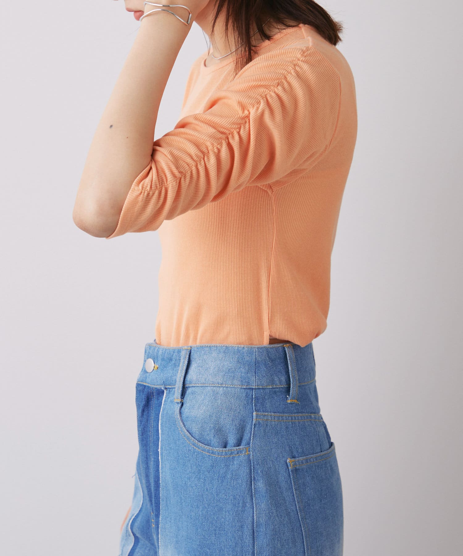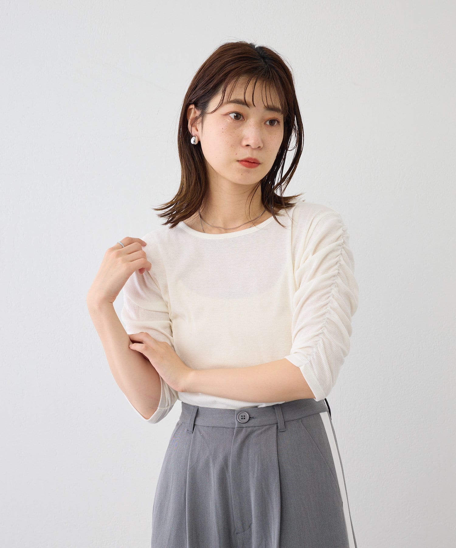 袖シャーリングが目を惹く5分袖カットソー