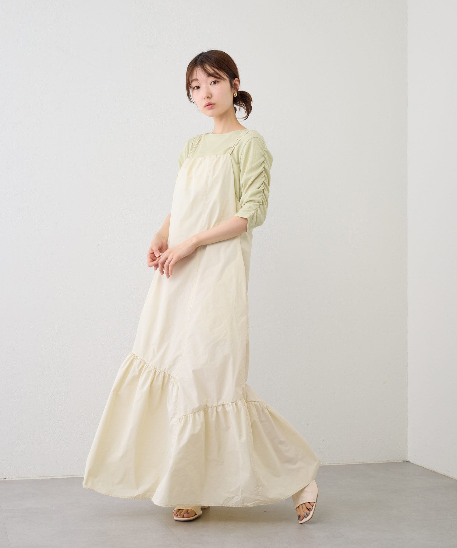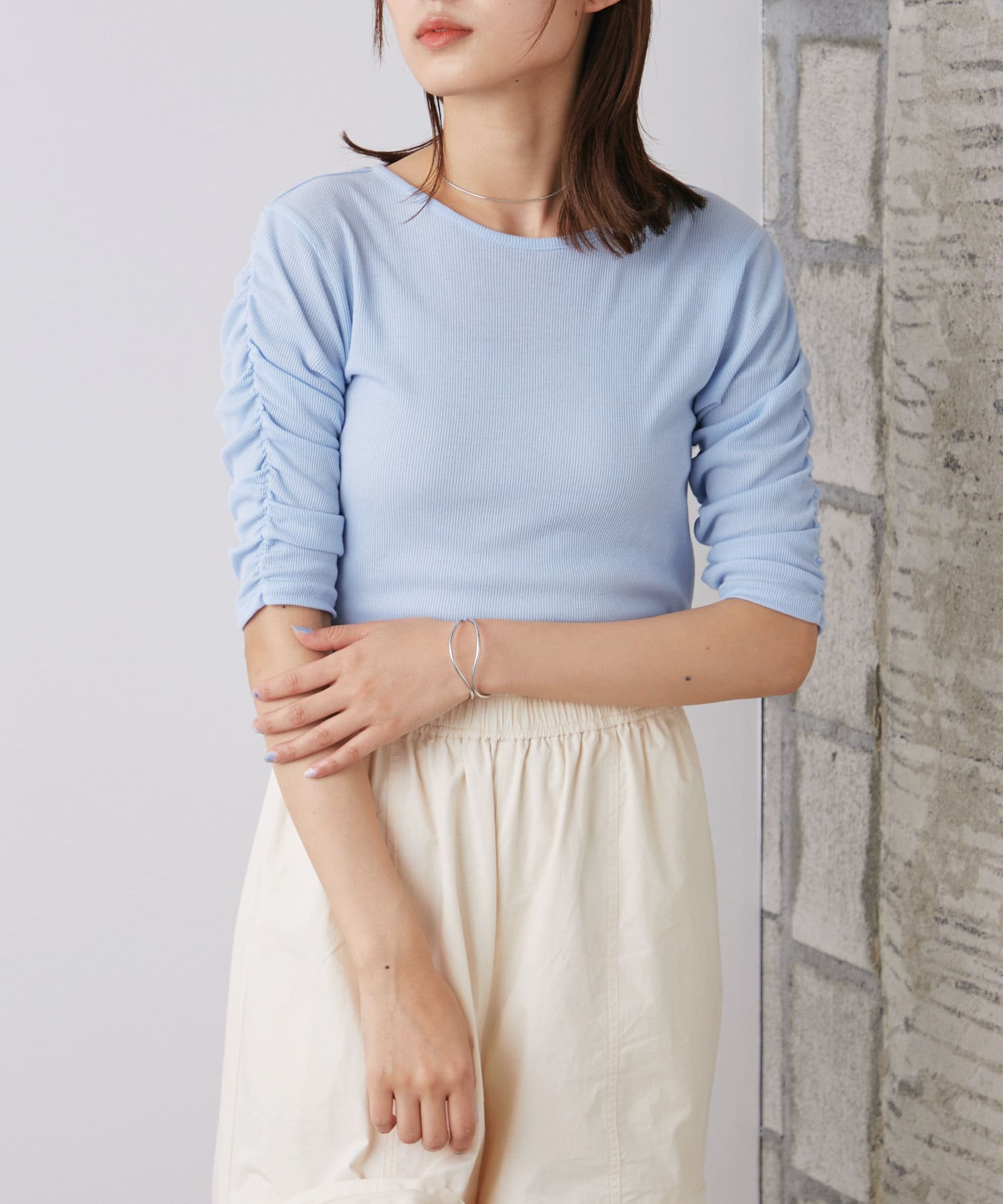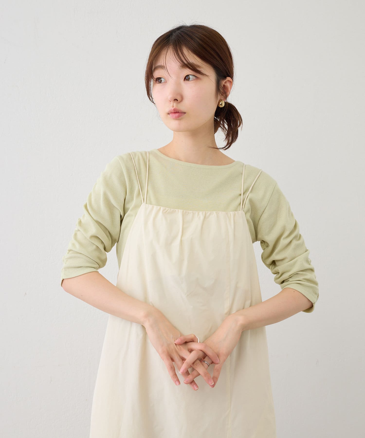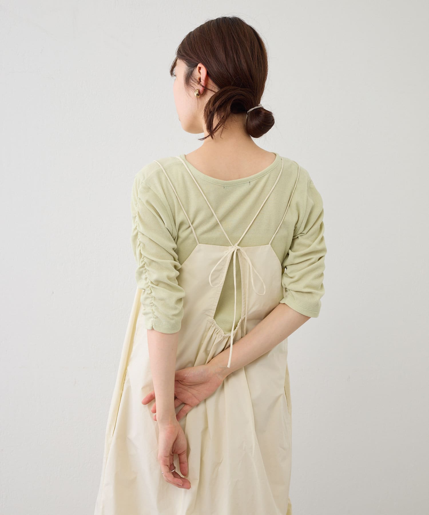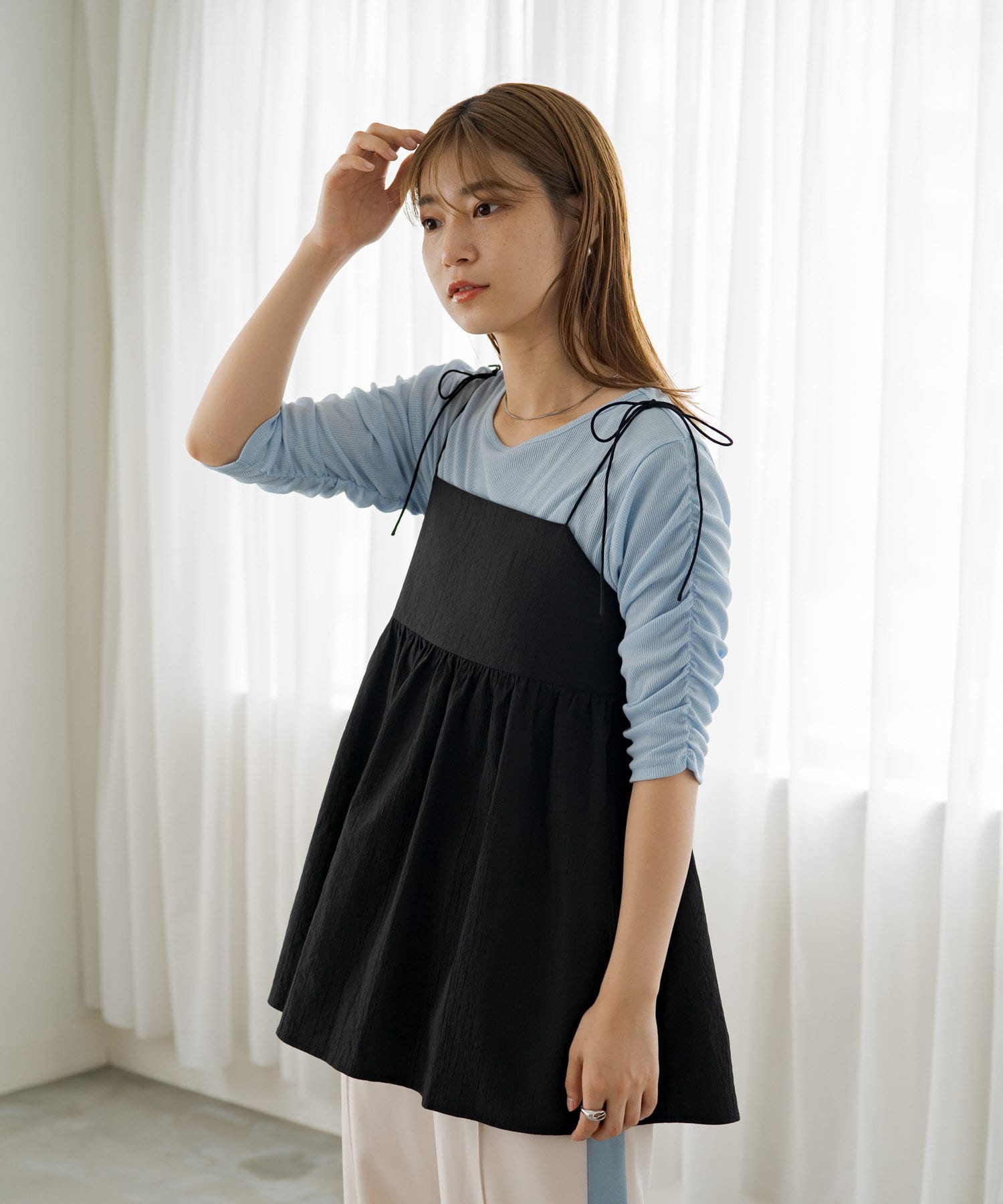 袖シャーリングを活かして主役級トップスとしても、キャミワンピースのインナーとしても使える万能アイテム。