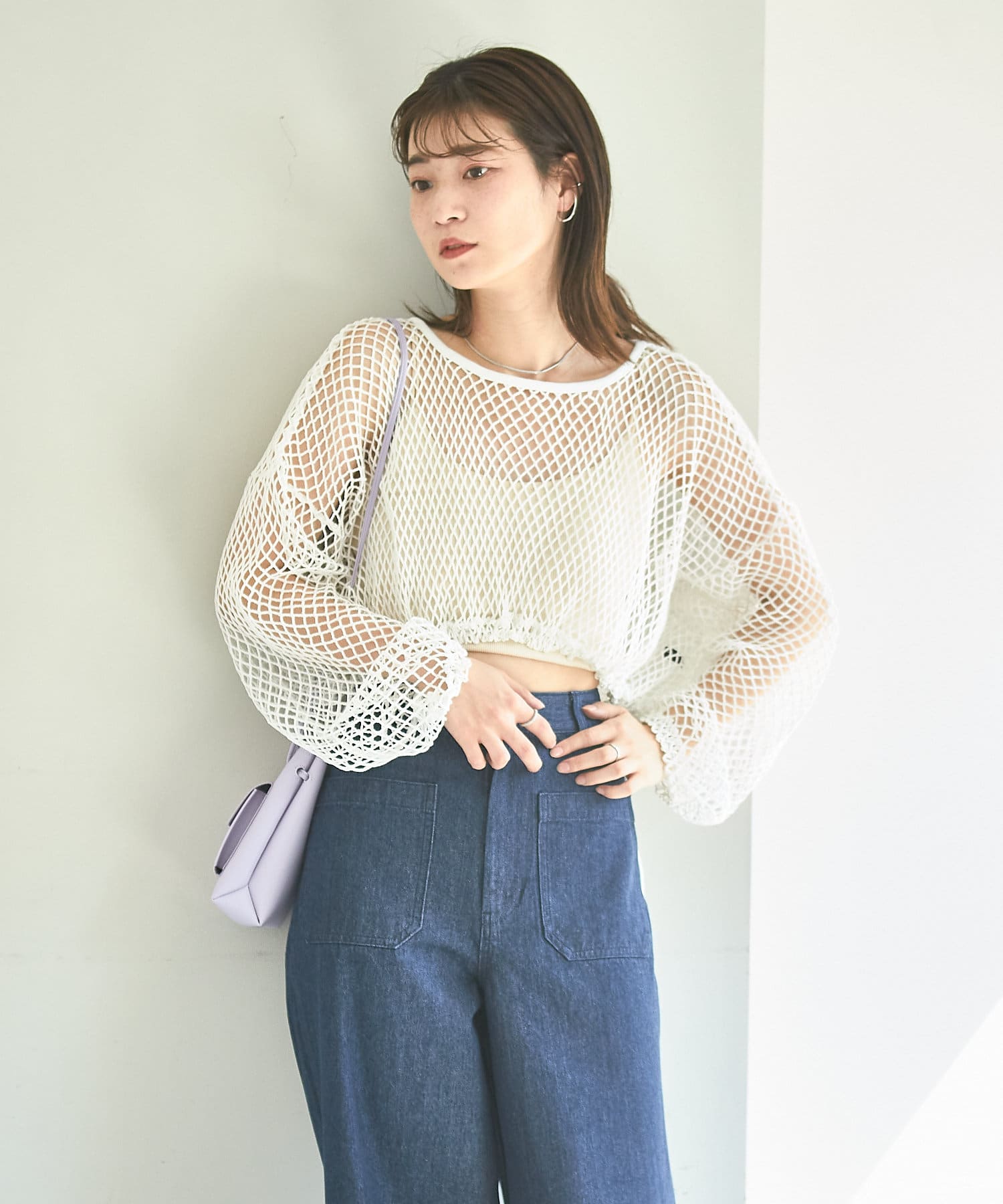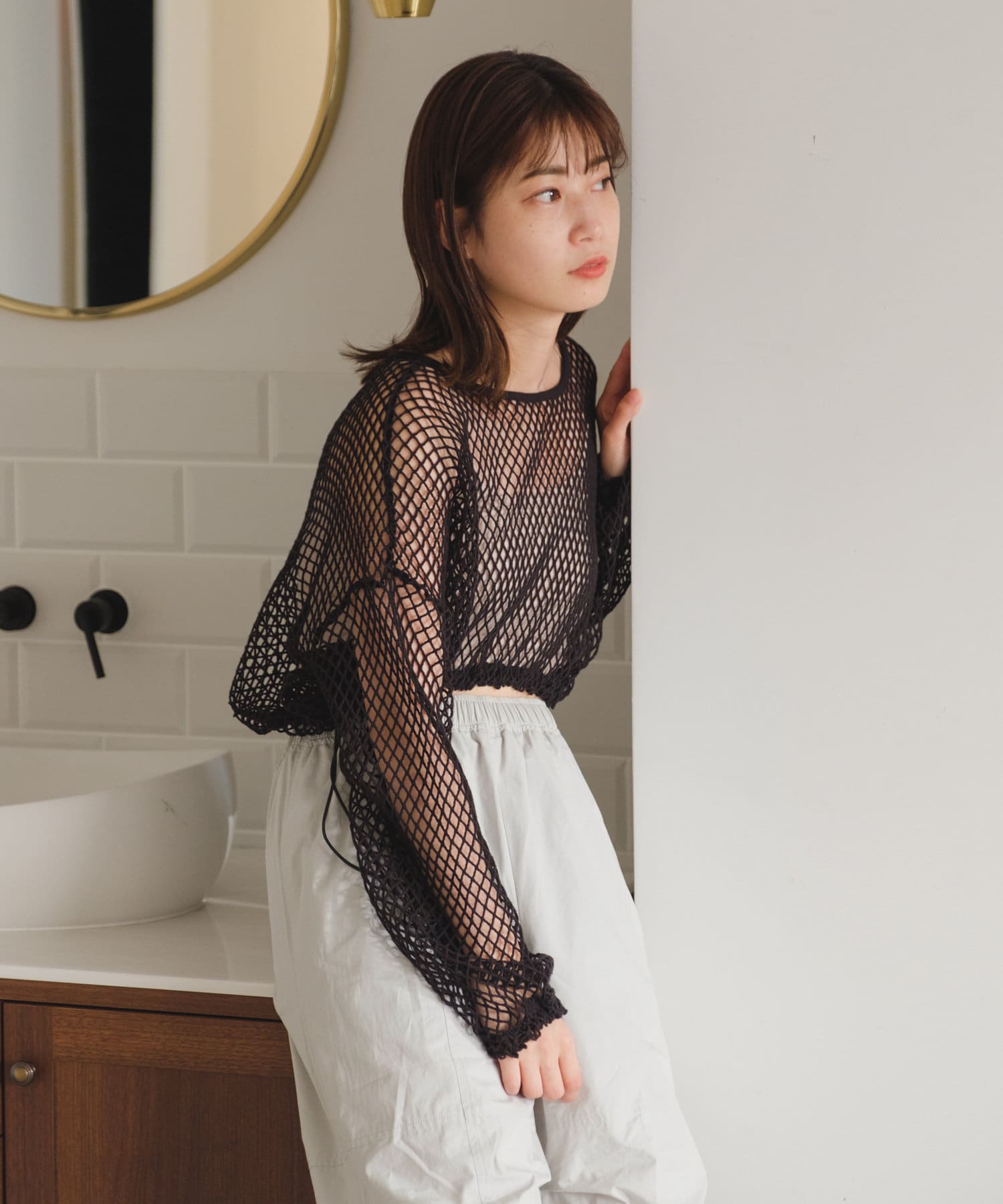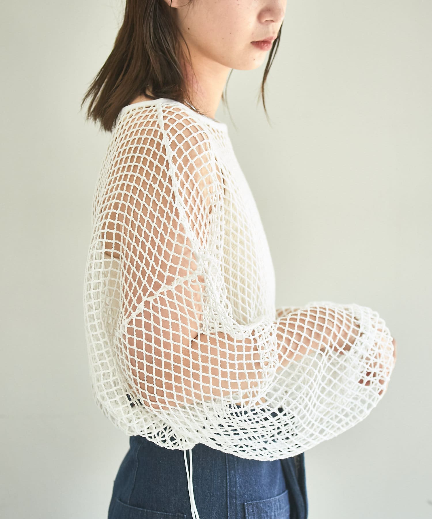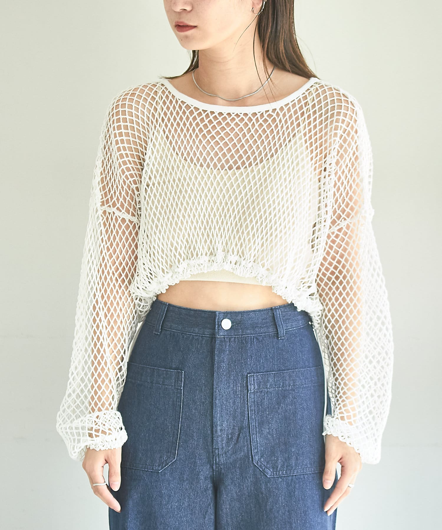 クロップド丈なのでハイウエストボトムはもちろん、キャミワンピースの上から被ってもバランスよく決まります。