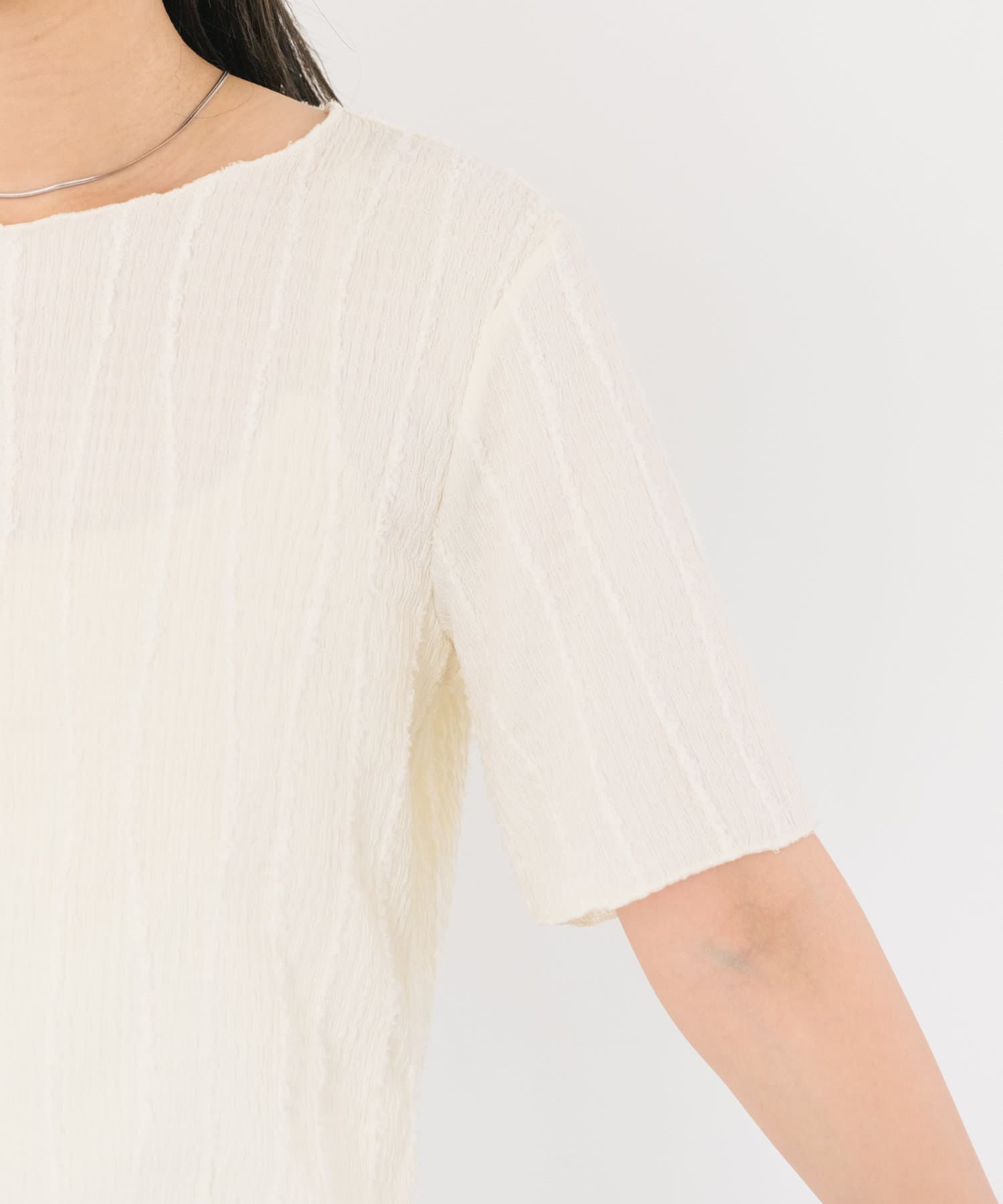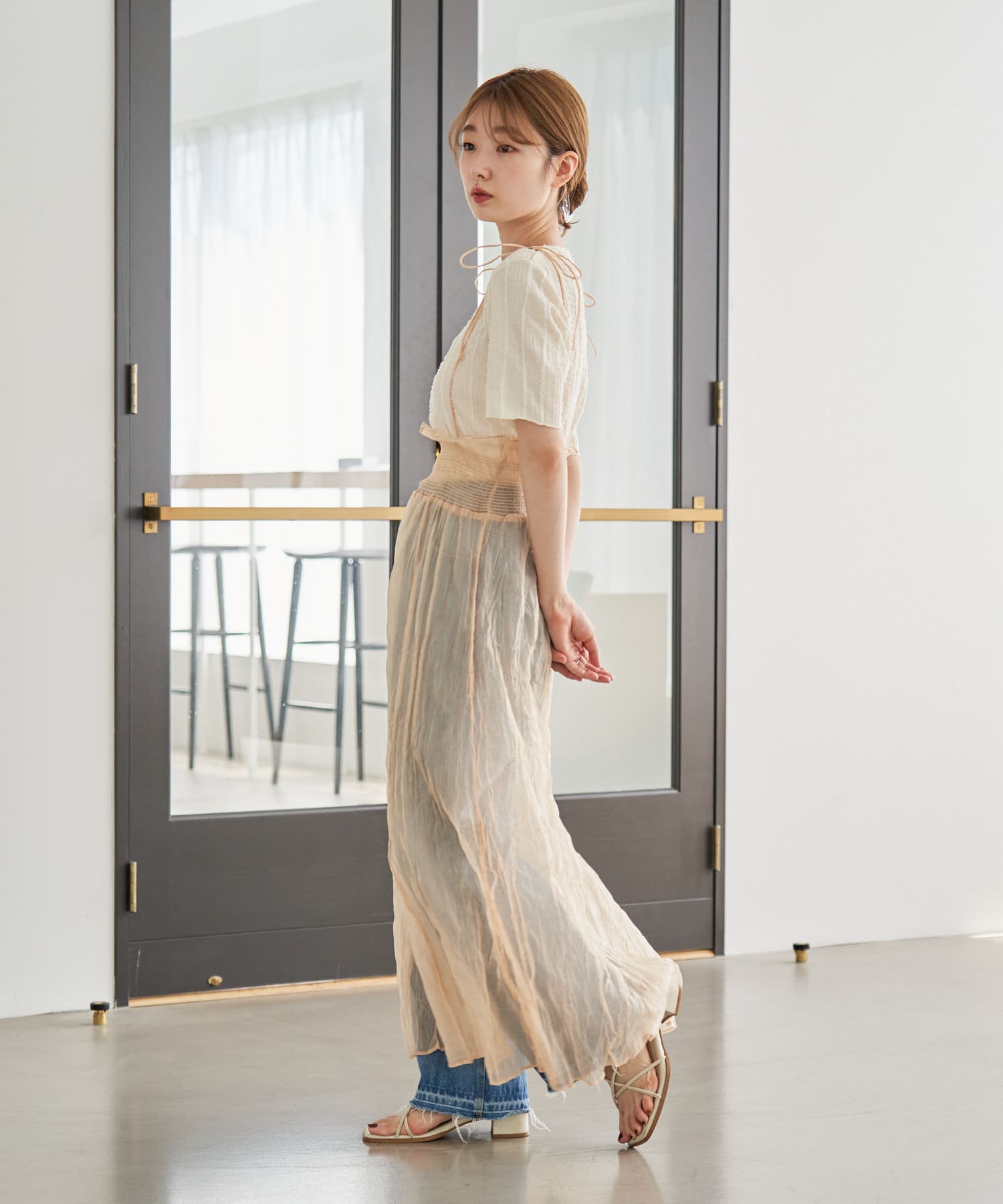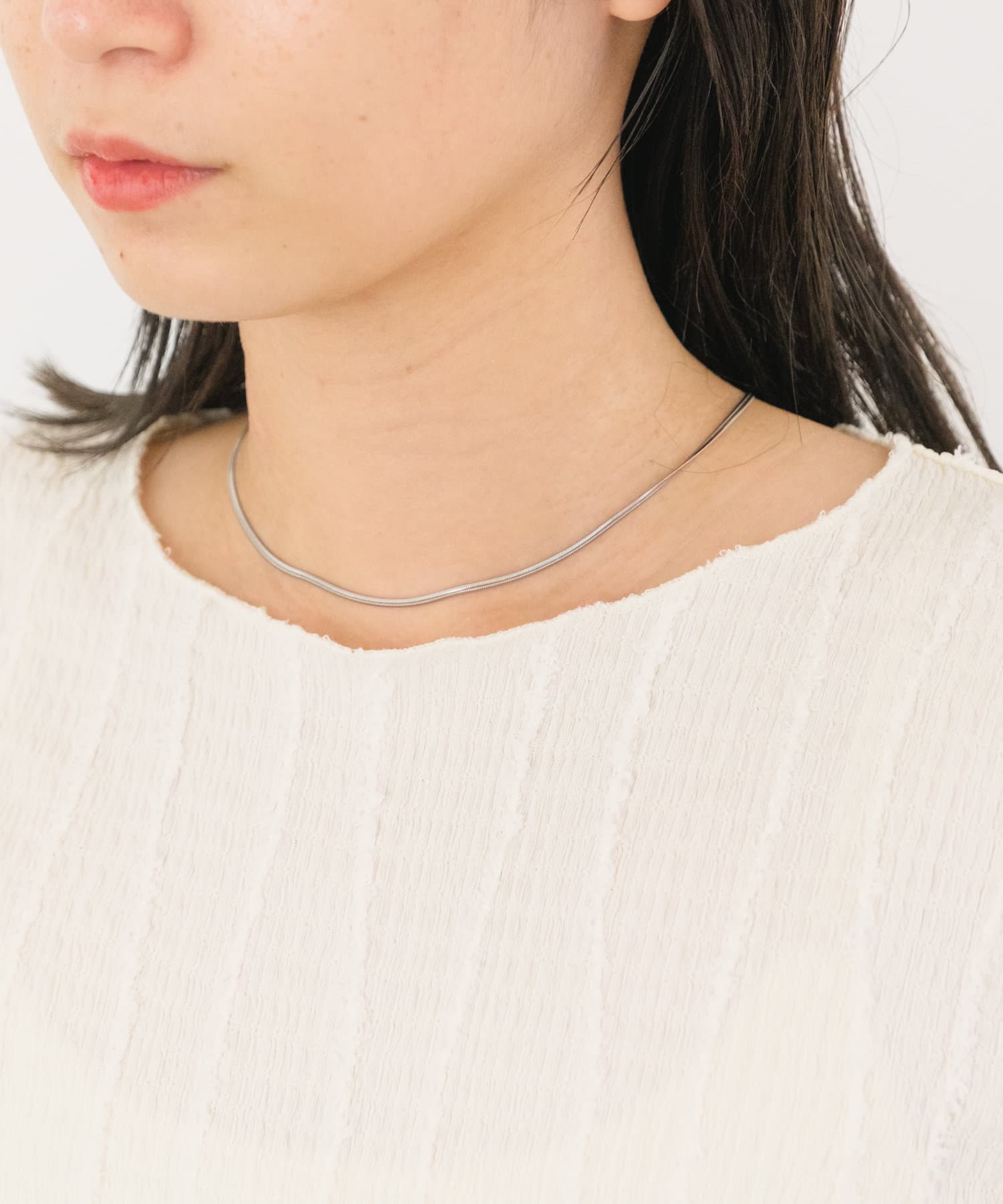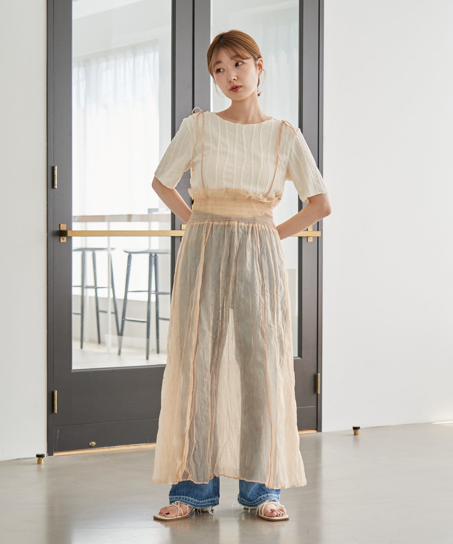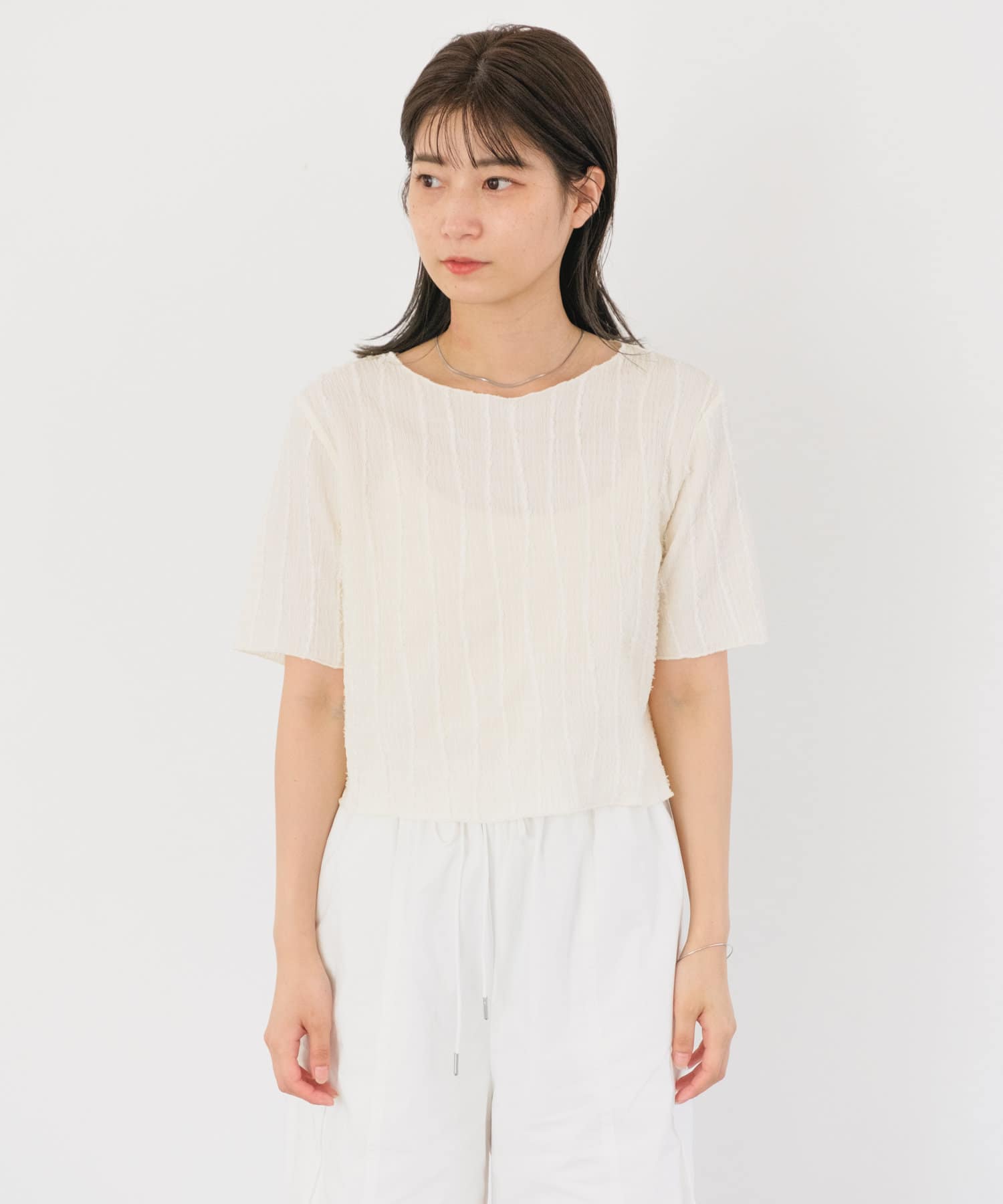 スッキリとした首周りや、程良い透け感が女性らしい印象に。
