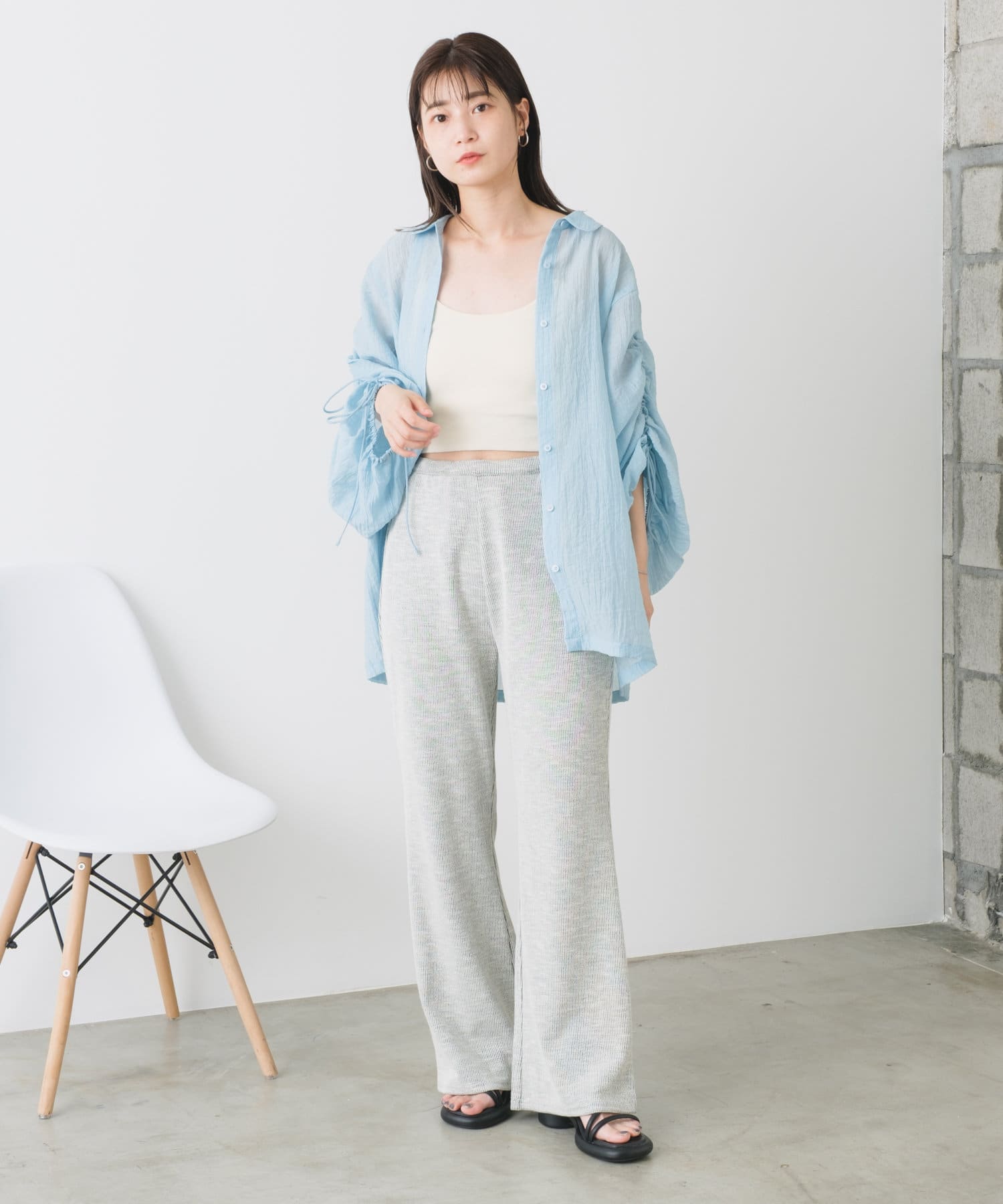 キャミソールに羽織や、腰回りの隠れるロンTeeなどゆったりとしたシルエットが合わせていただきやすいです。