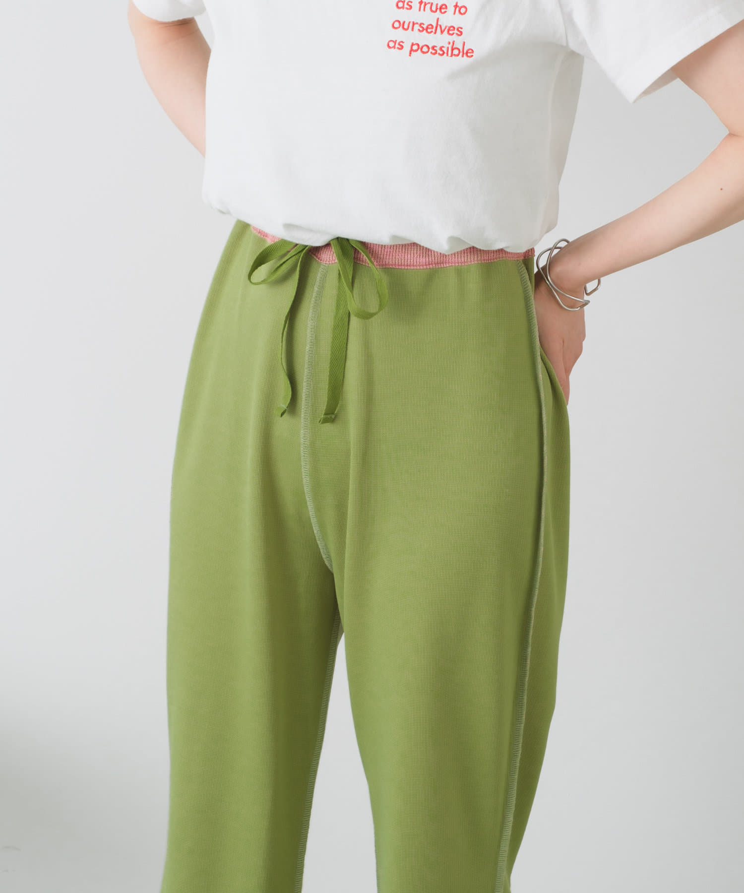 スリムなシルエットですが、ウエストはゴム、生地にも伸縮性がある為