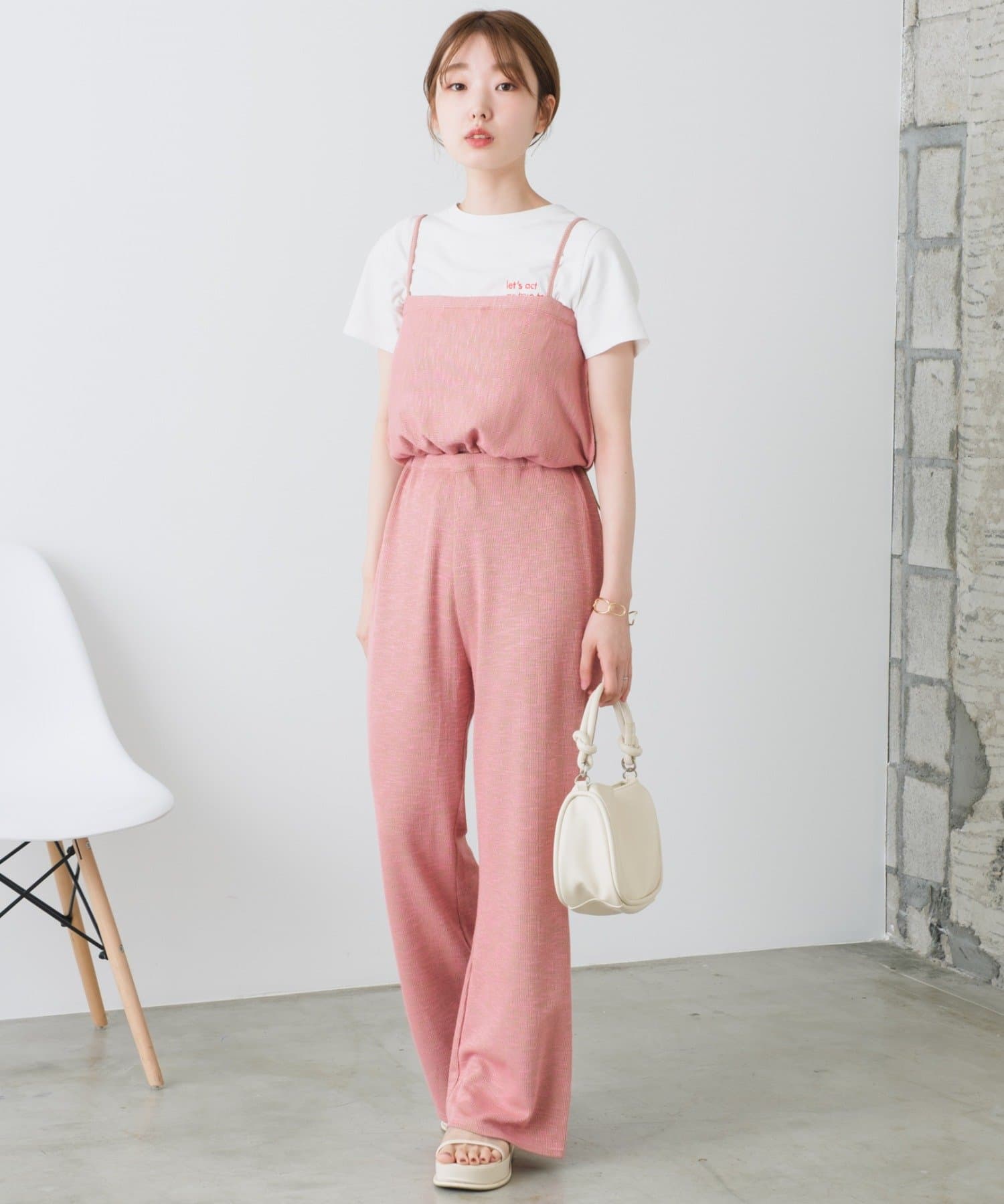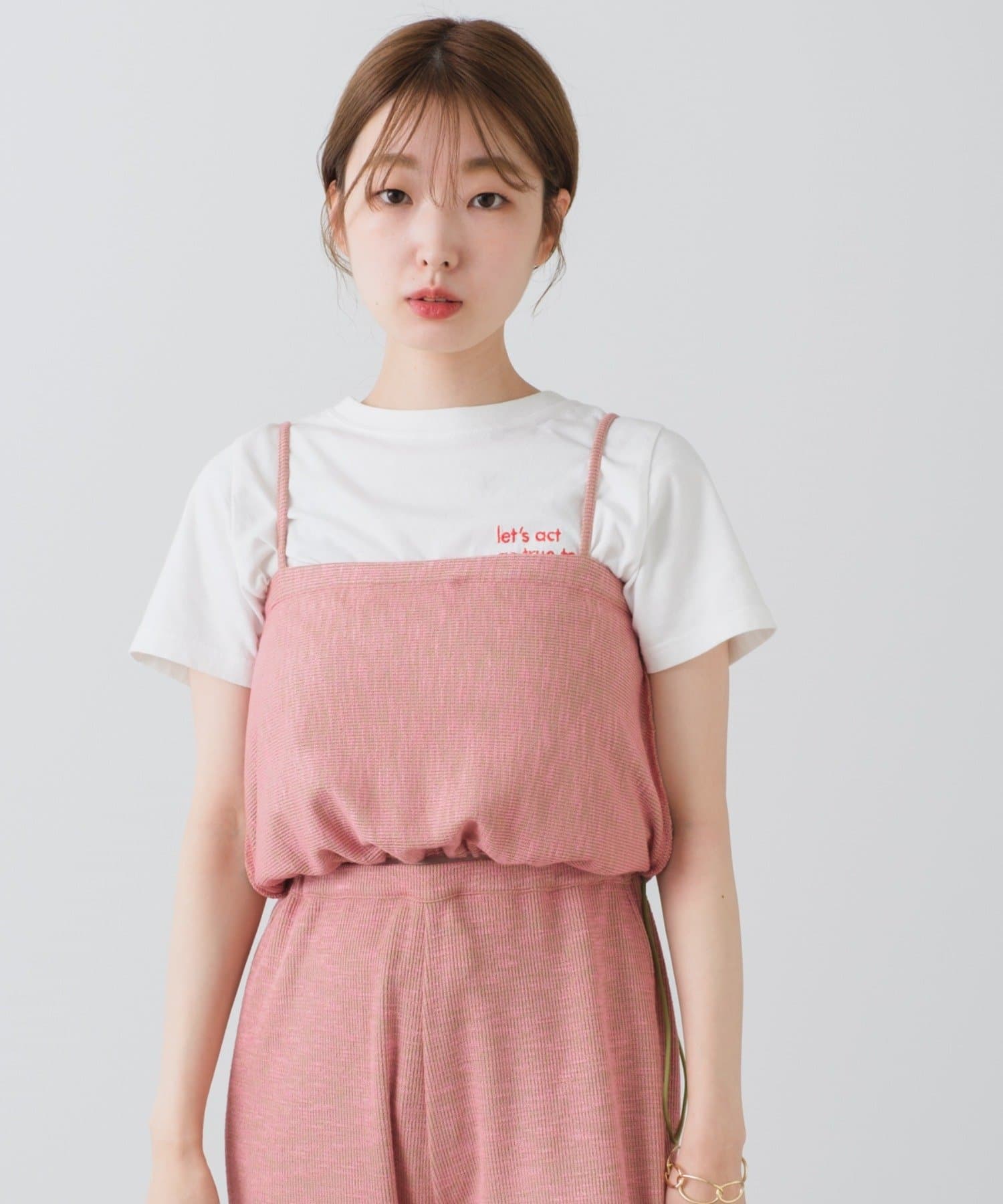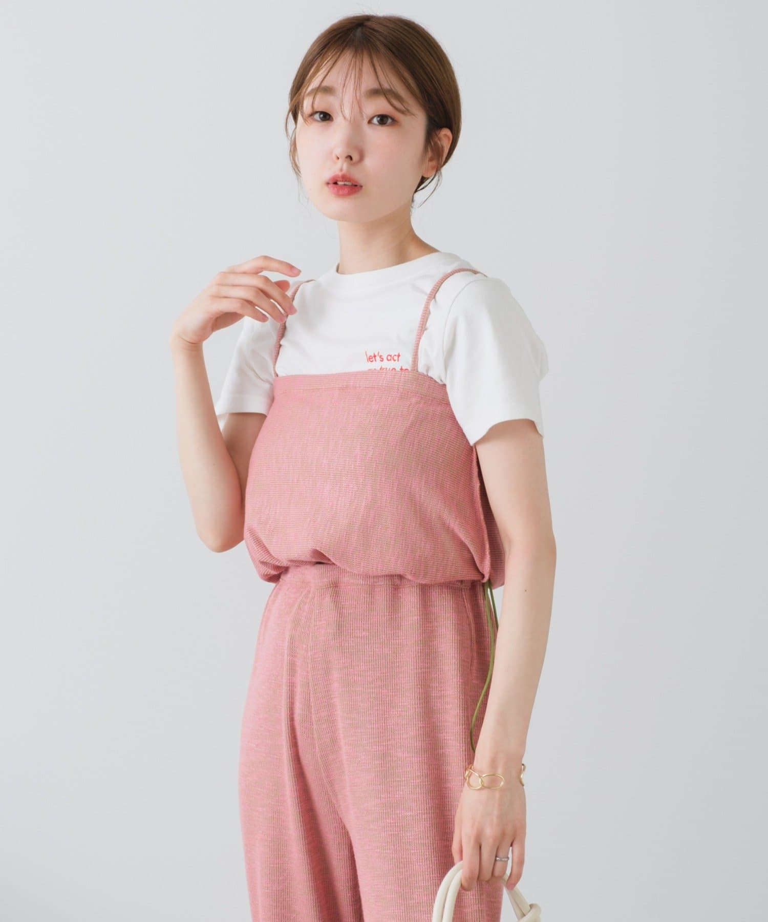 夏場はTシャツやタンクトップと合わせて。肌寒い時期にはロンTeeやブラウスの上から重ねてもお洒落です。