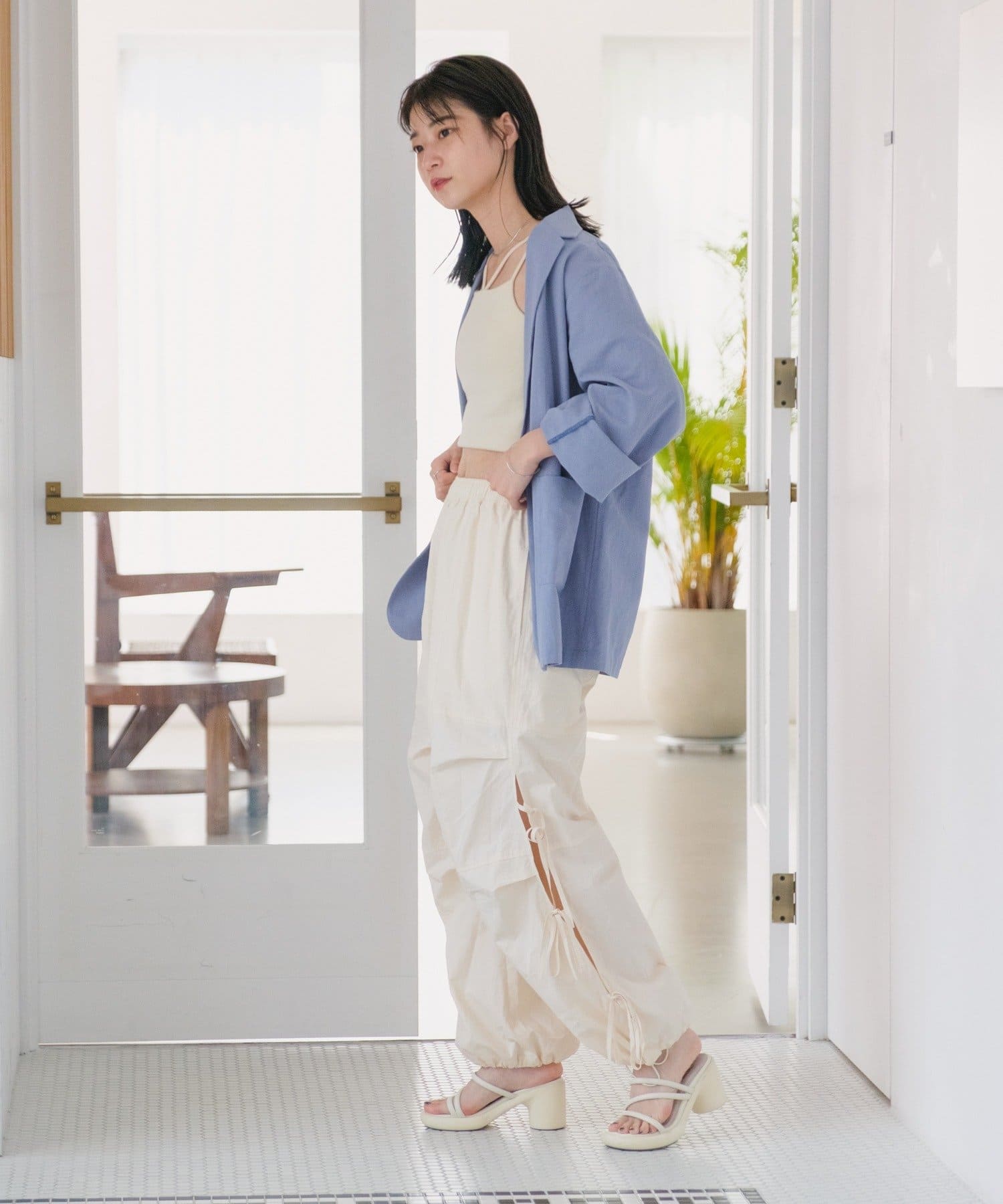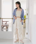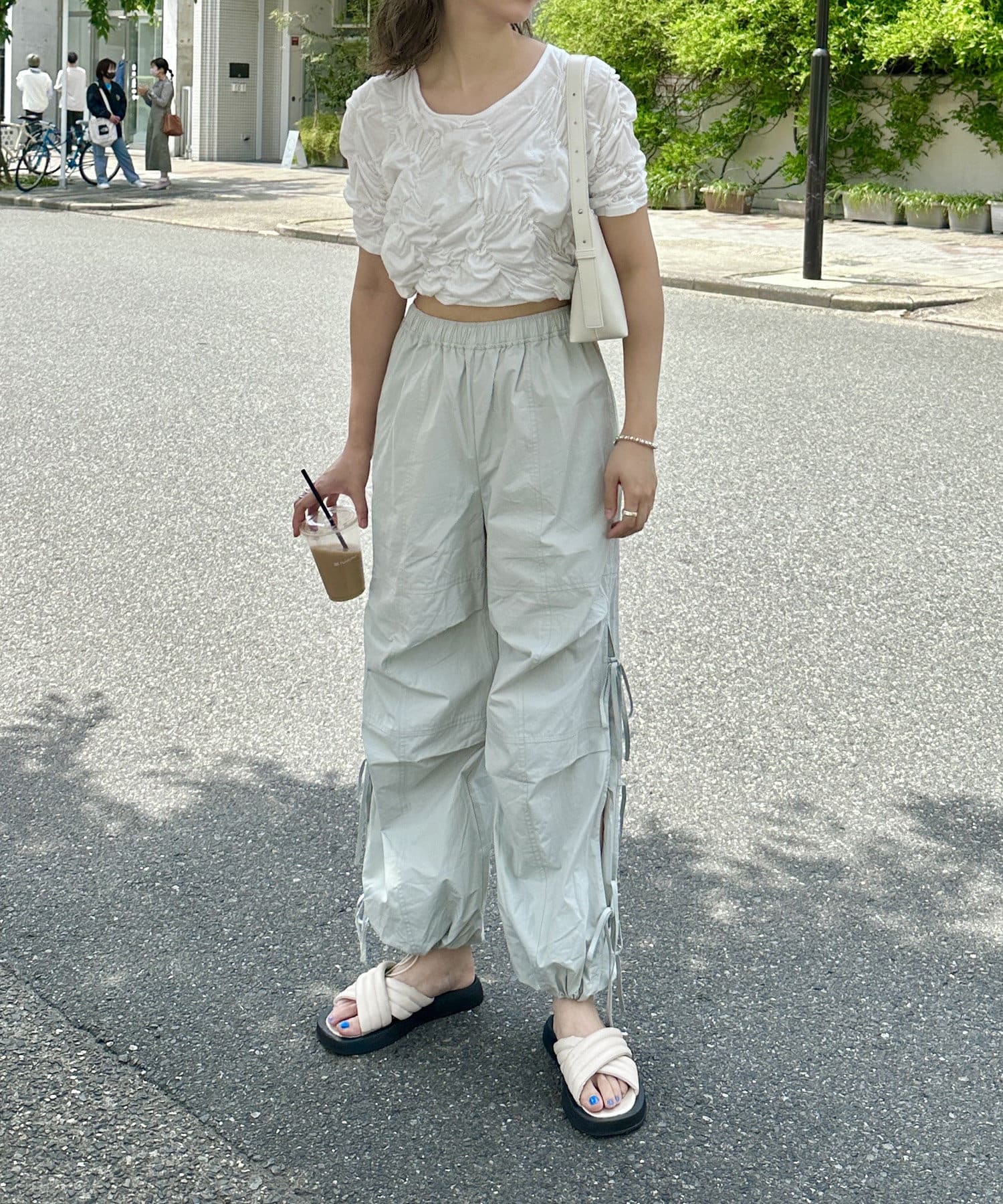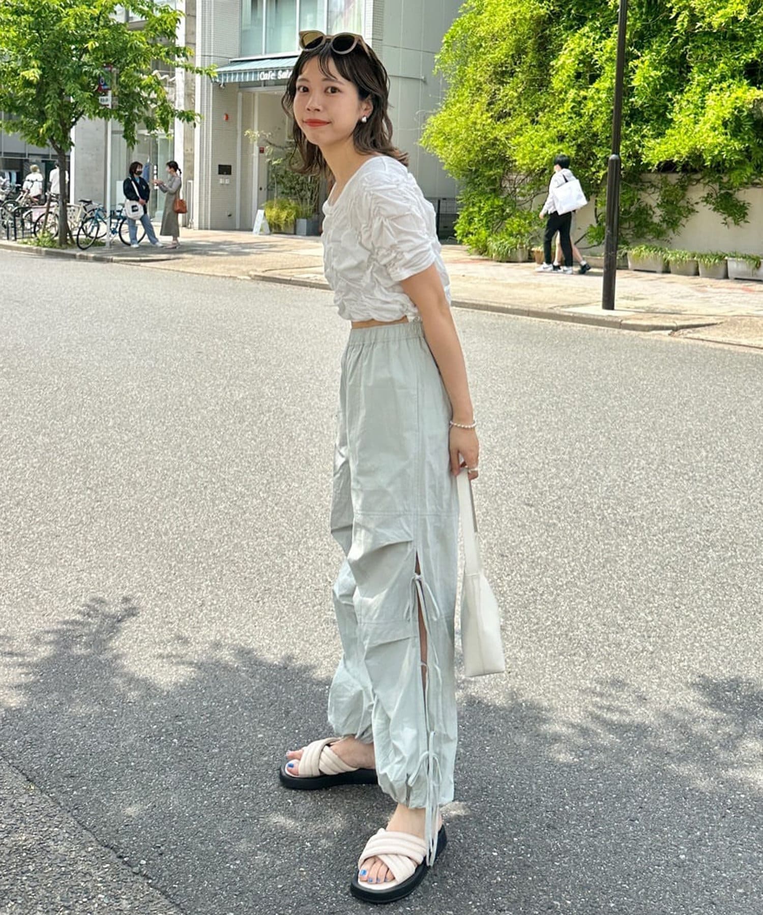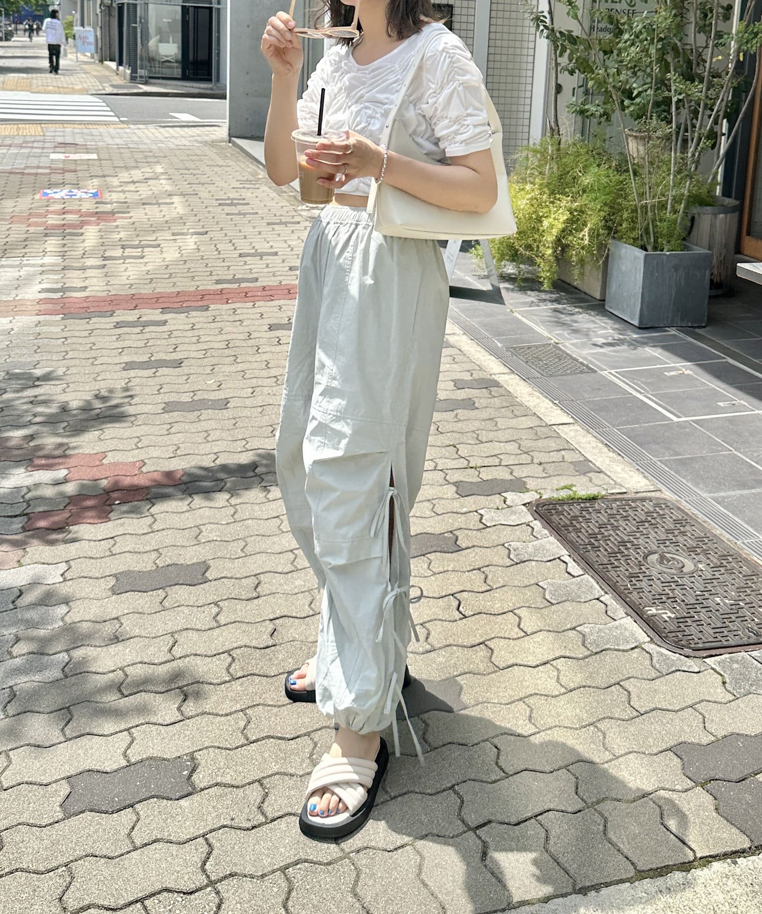 ボリューム感のあるパンツなのでクロップド丈トップスやタンクトップなど