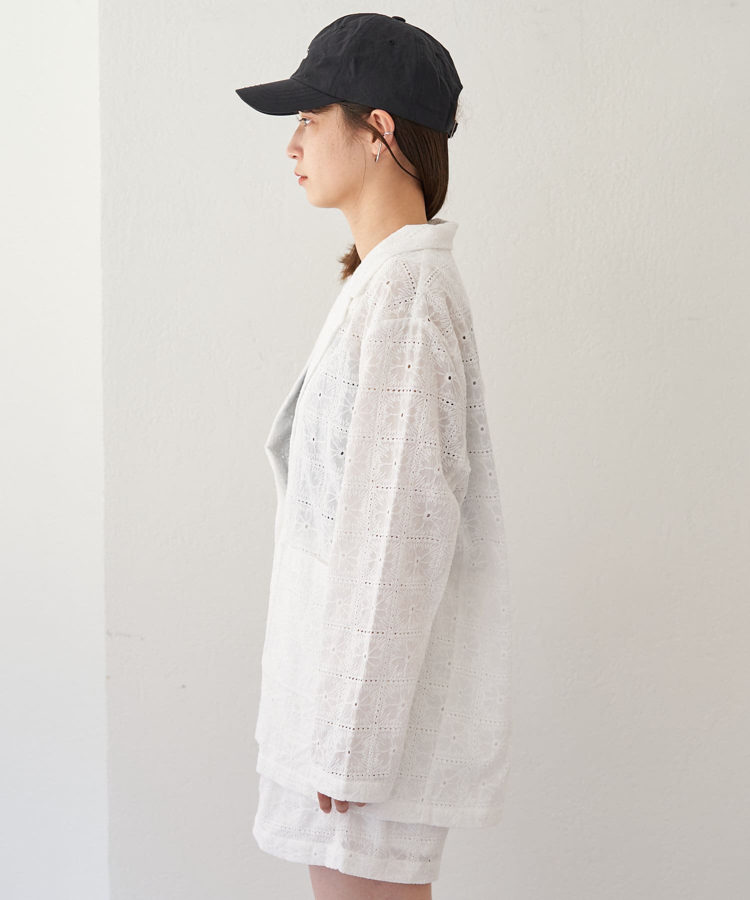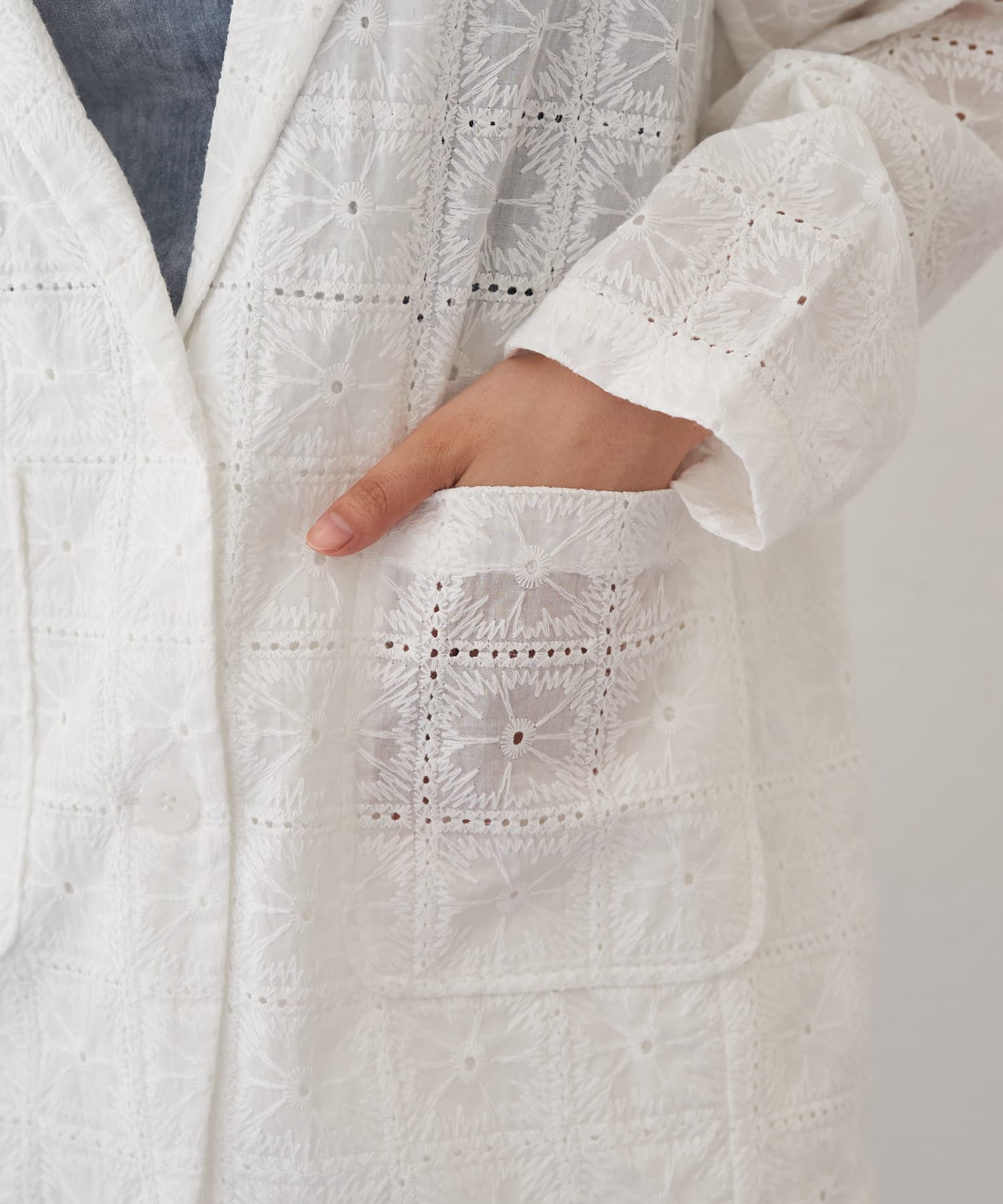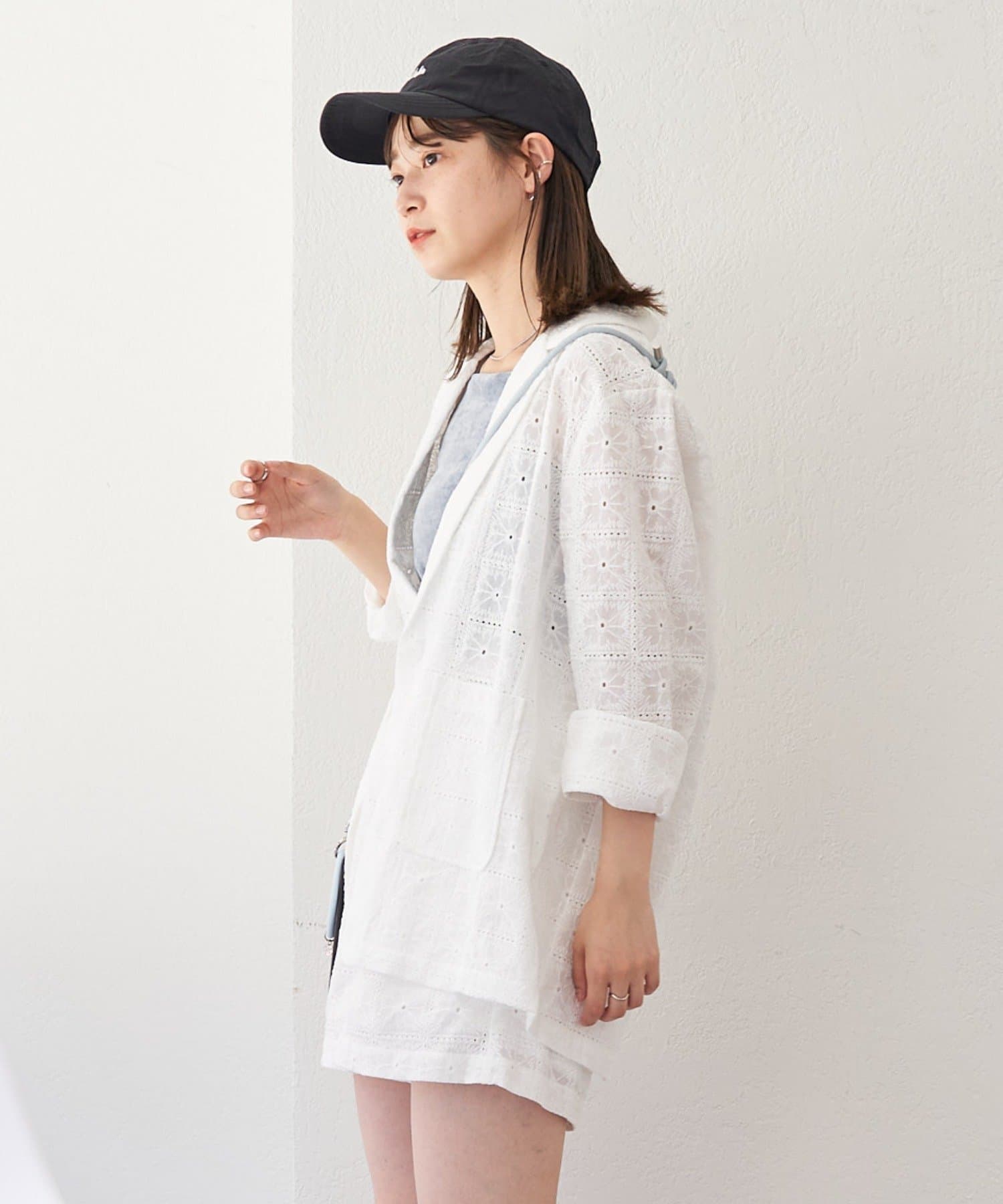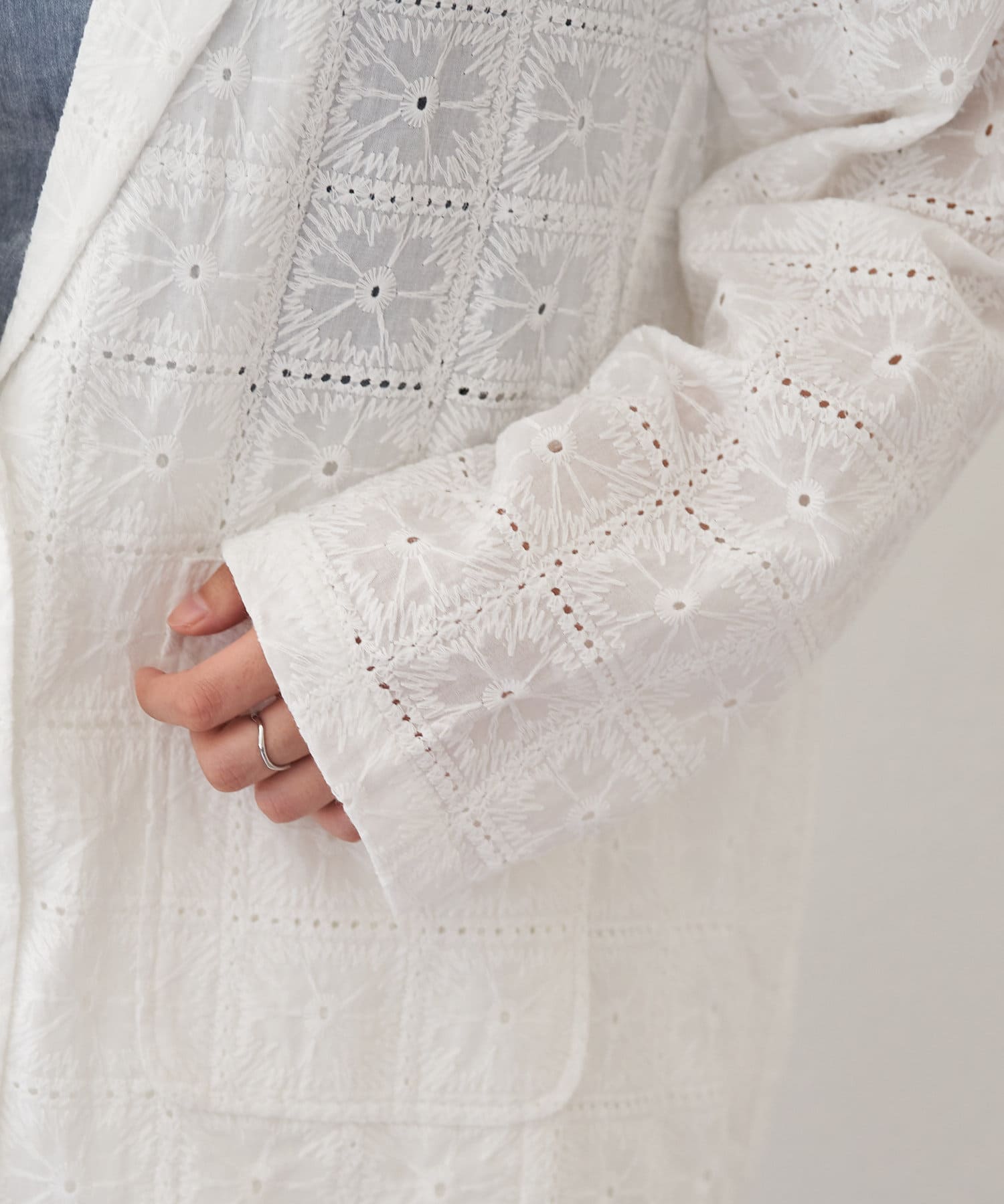 程よく甘めで柔らかい印象になるアイレットレースジャケットが登場。