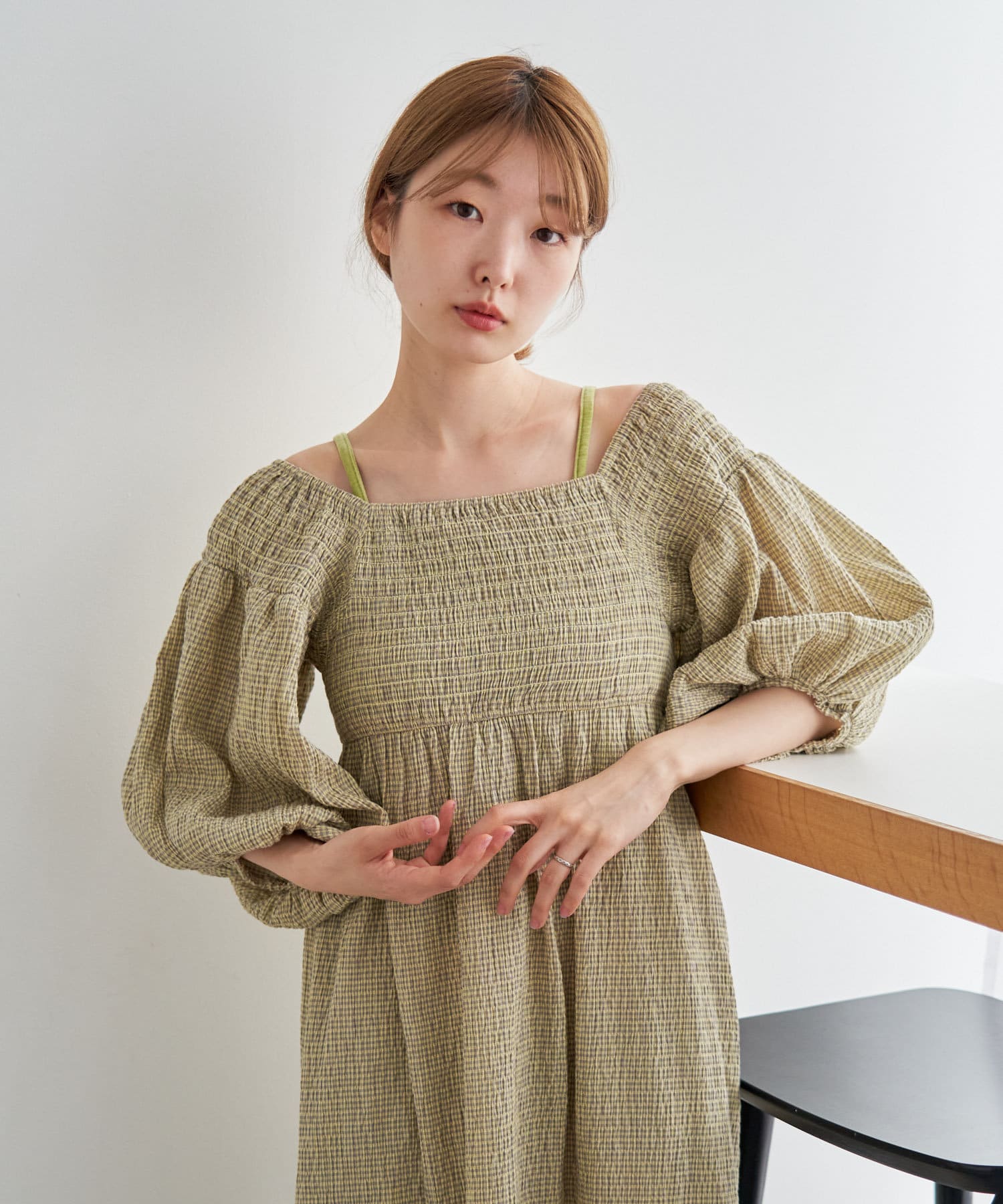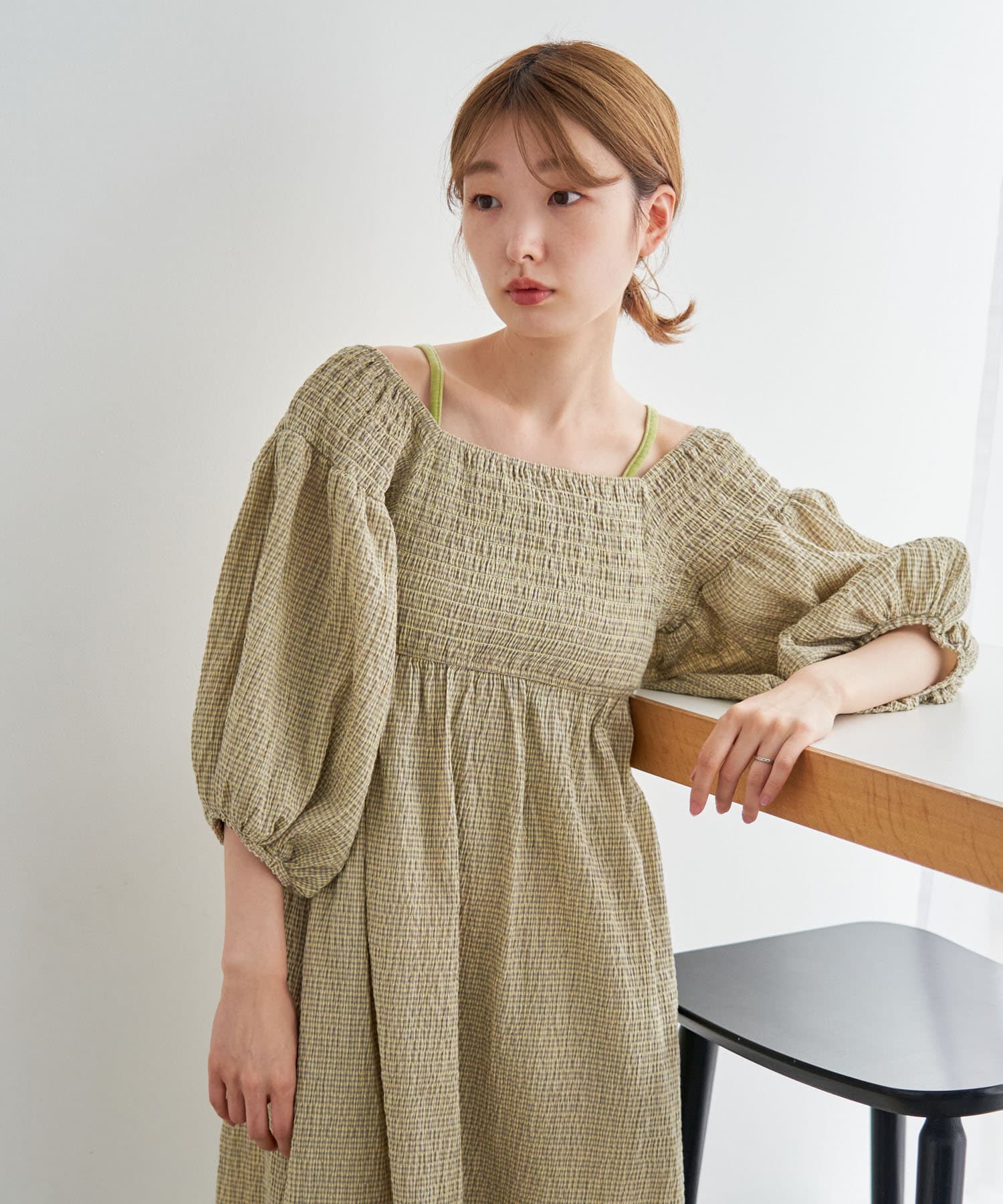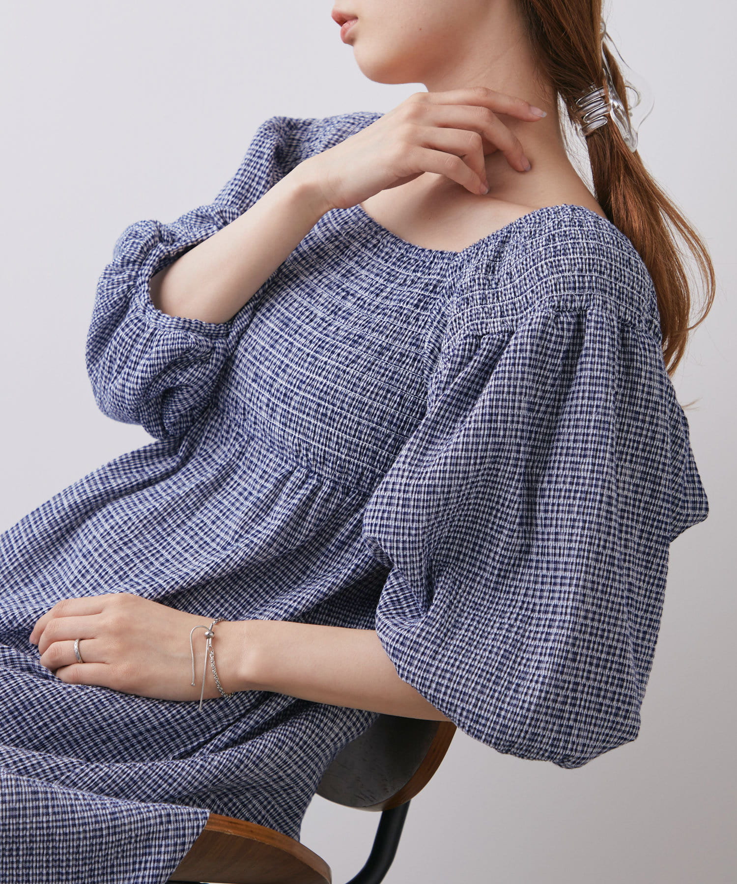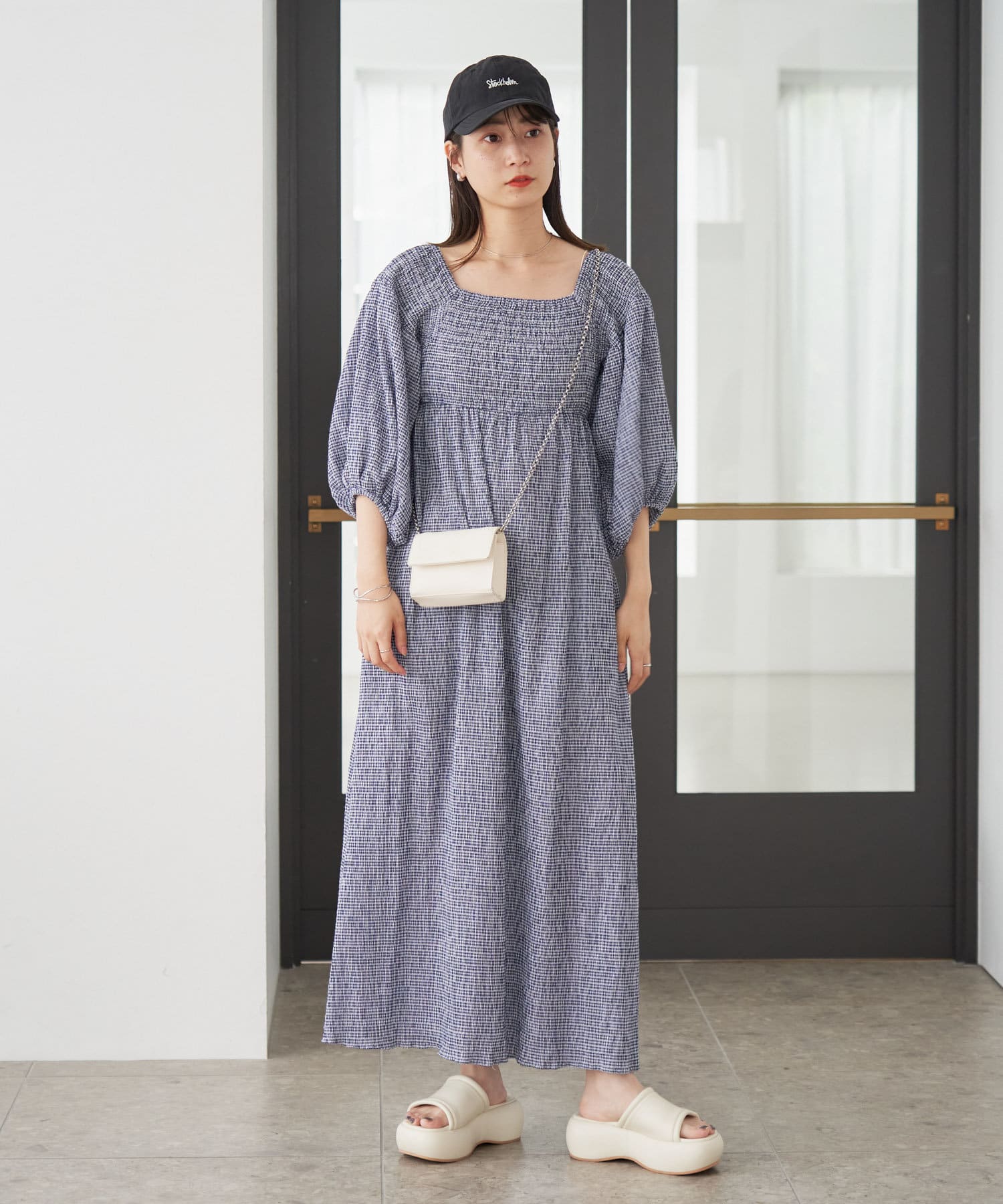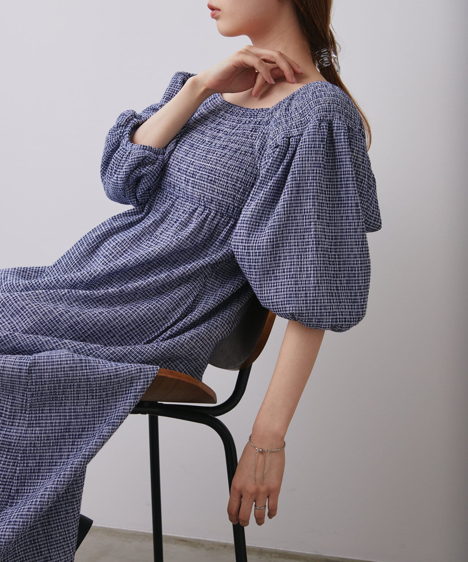 ギンガムチェックとシャーリングデザインが女性らしいワンピース。