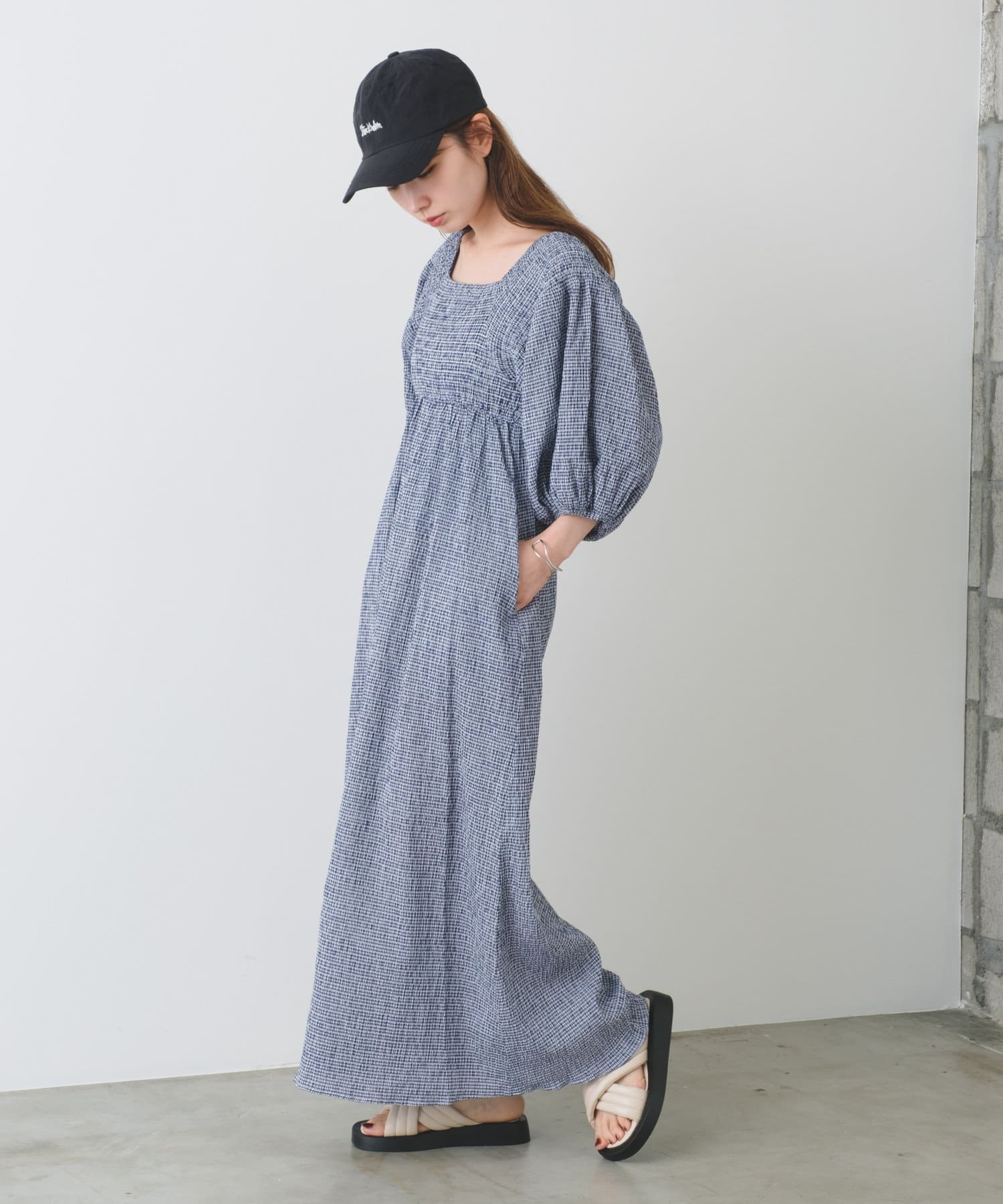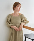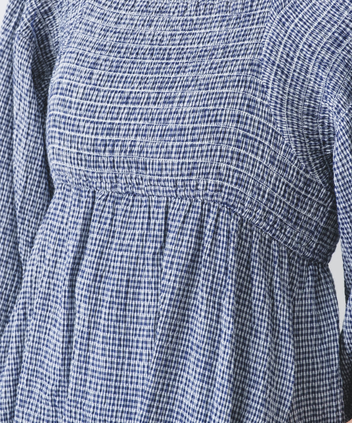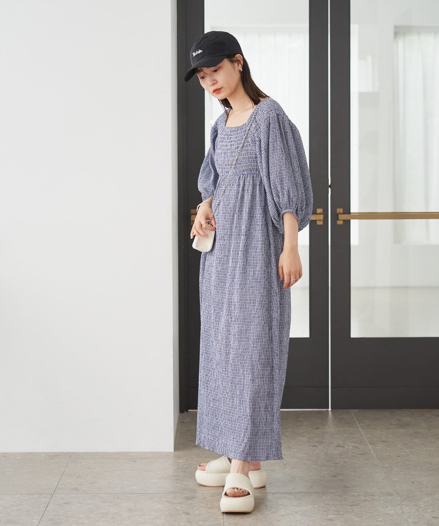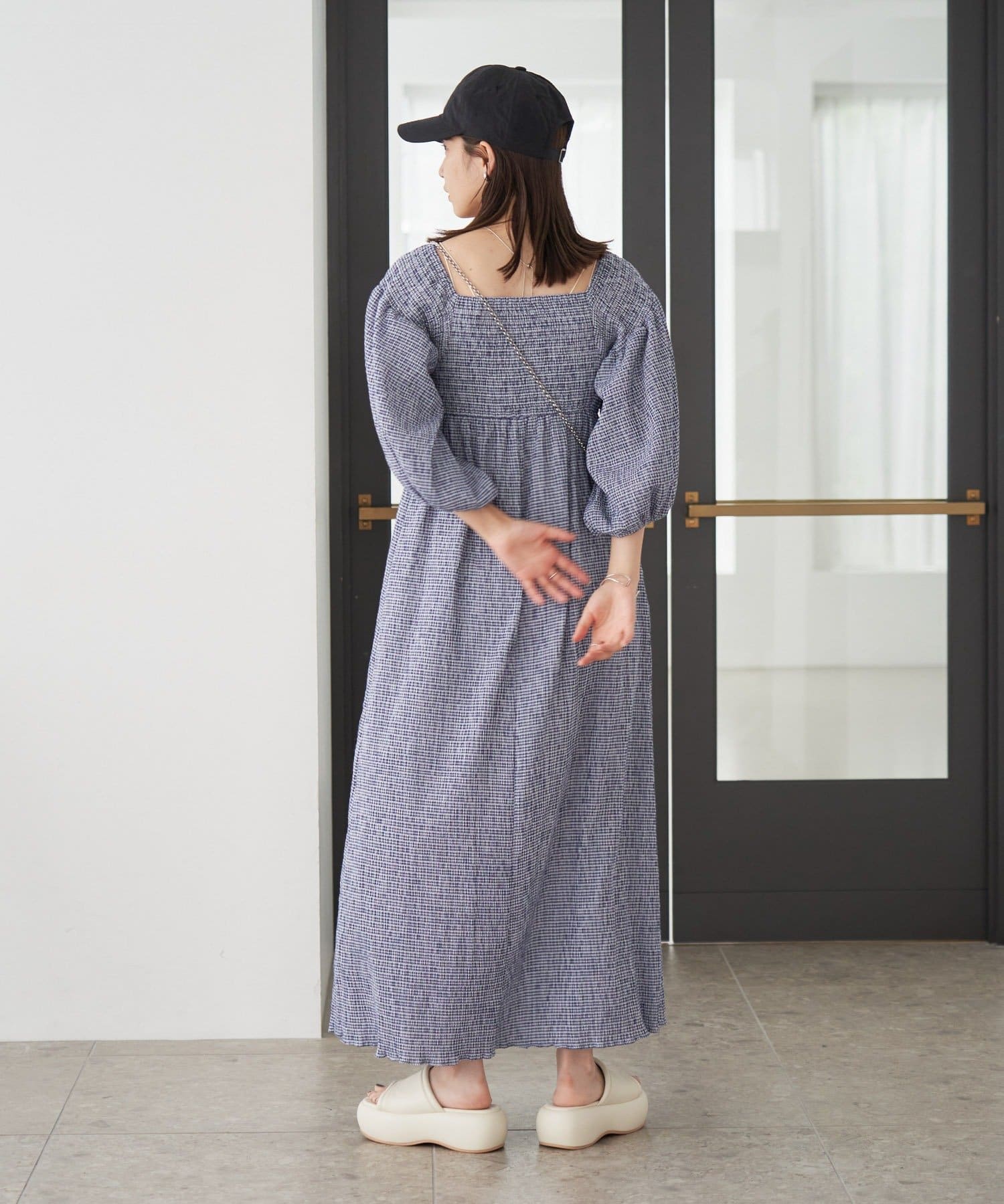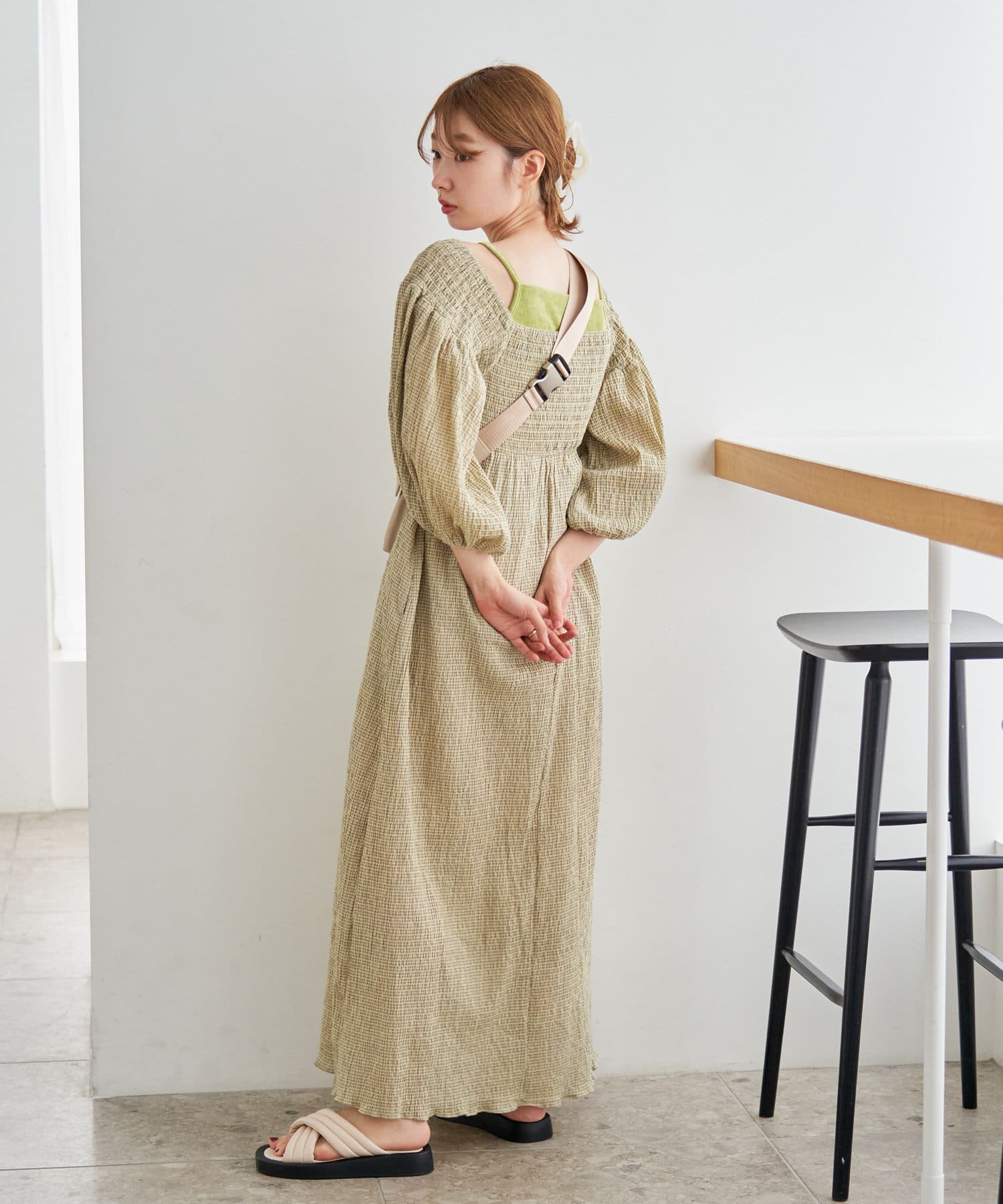 ギンガムチェックとシャーリングデザインが女性らしいワンピース。