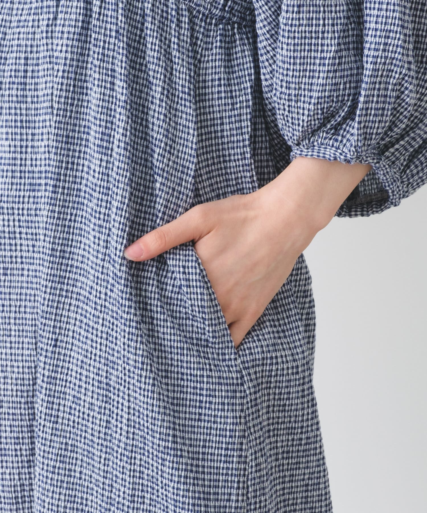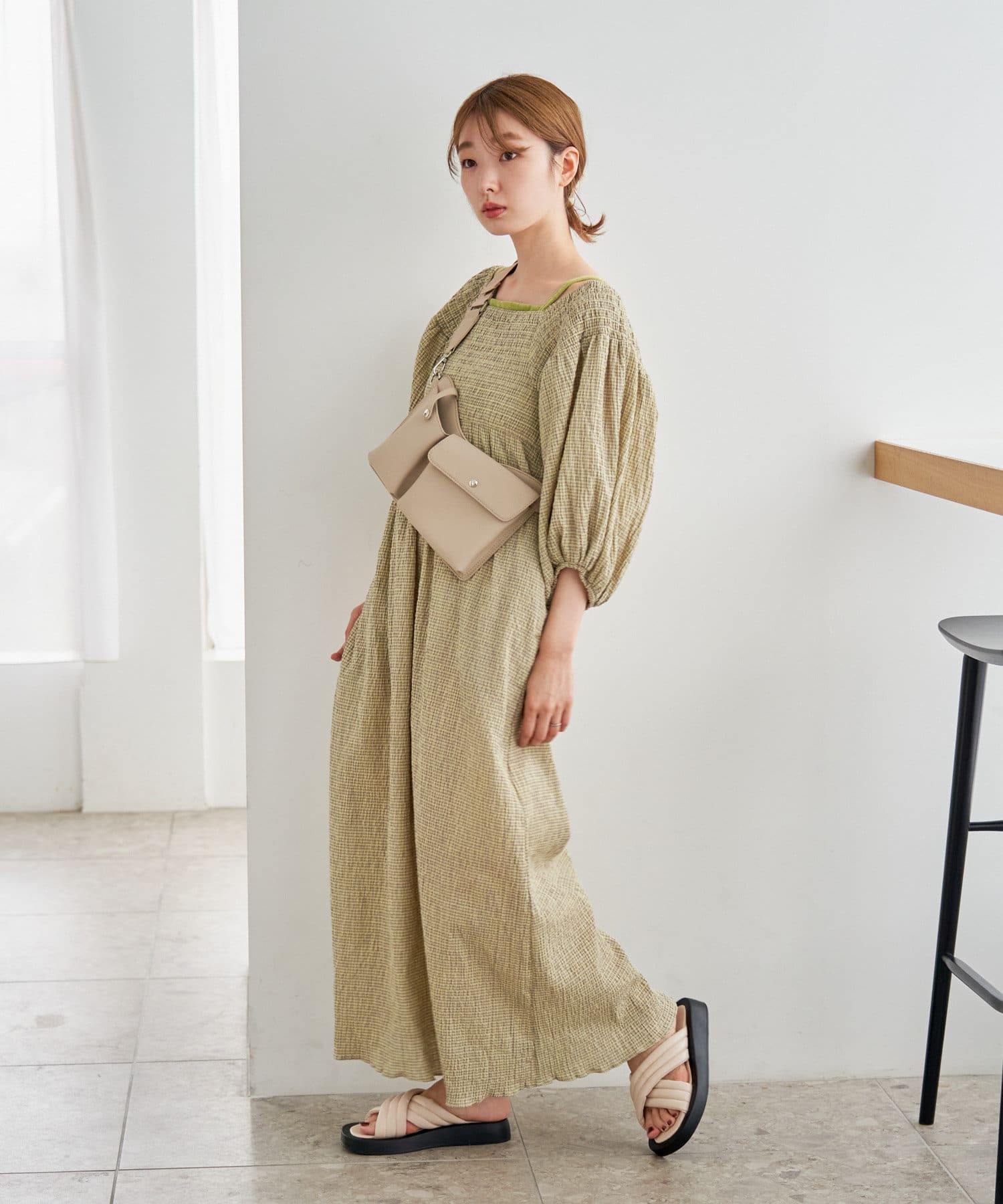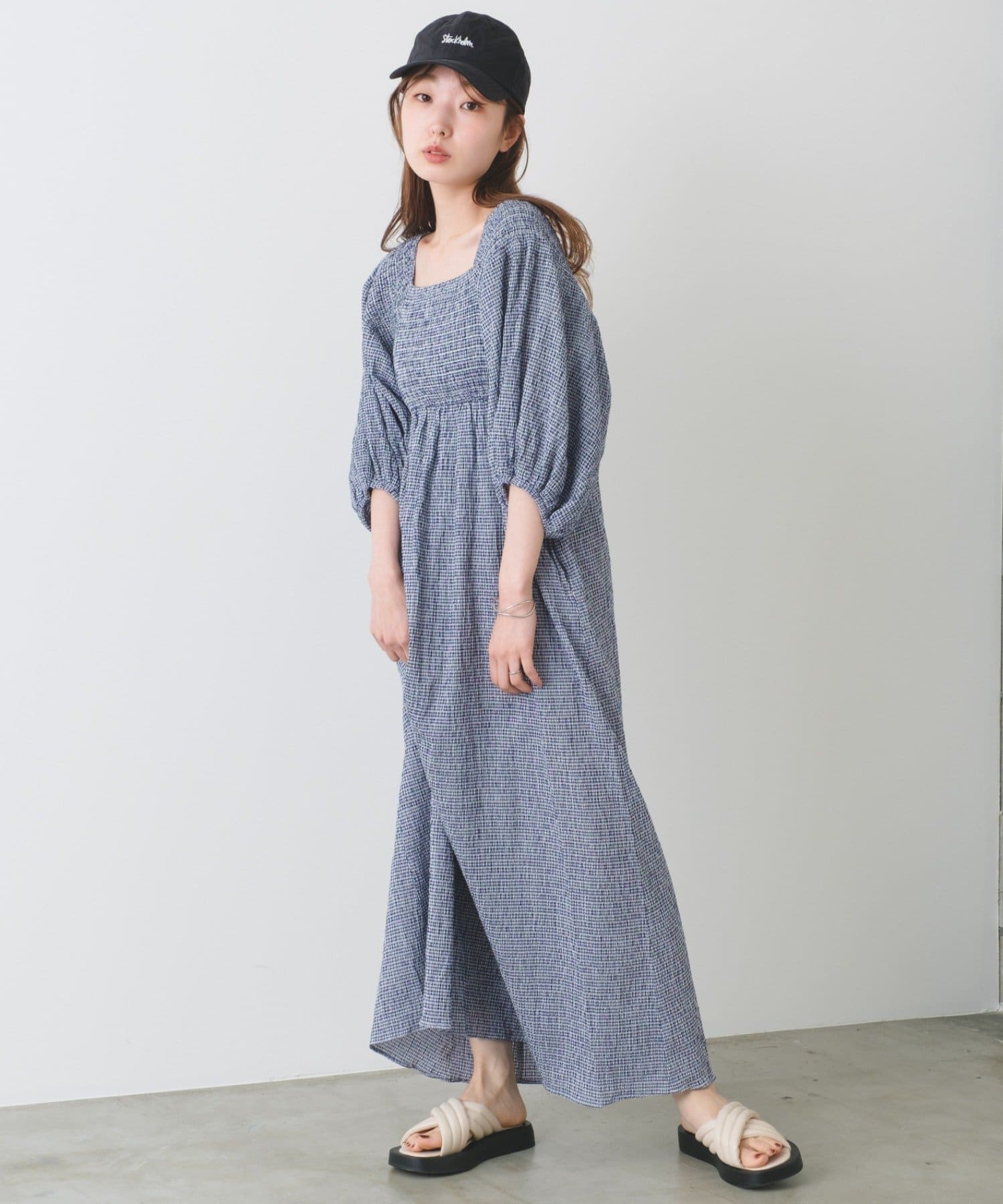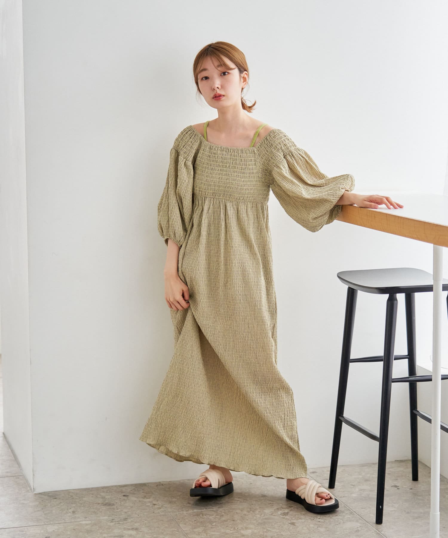 ギンガムチェックとシャーリングデザインが女性らしいワンピース。