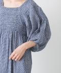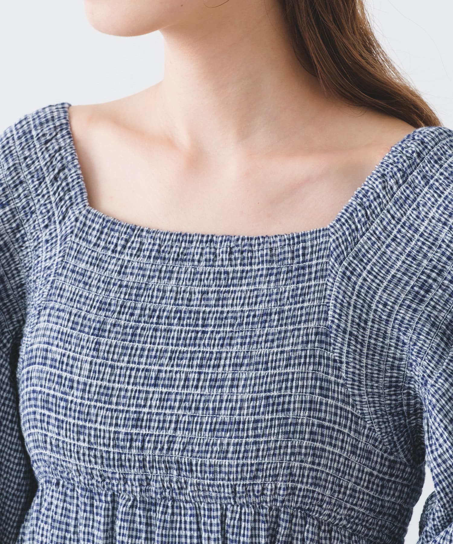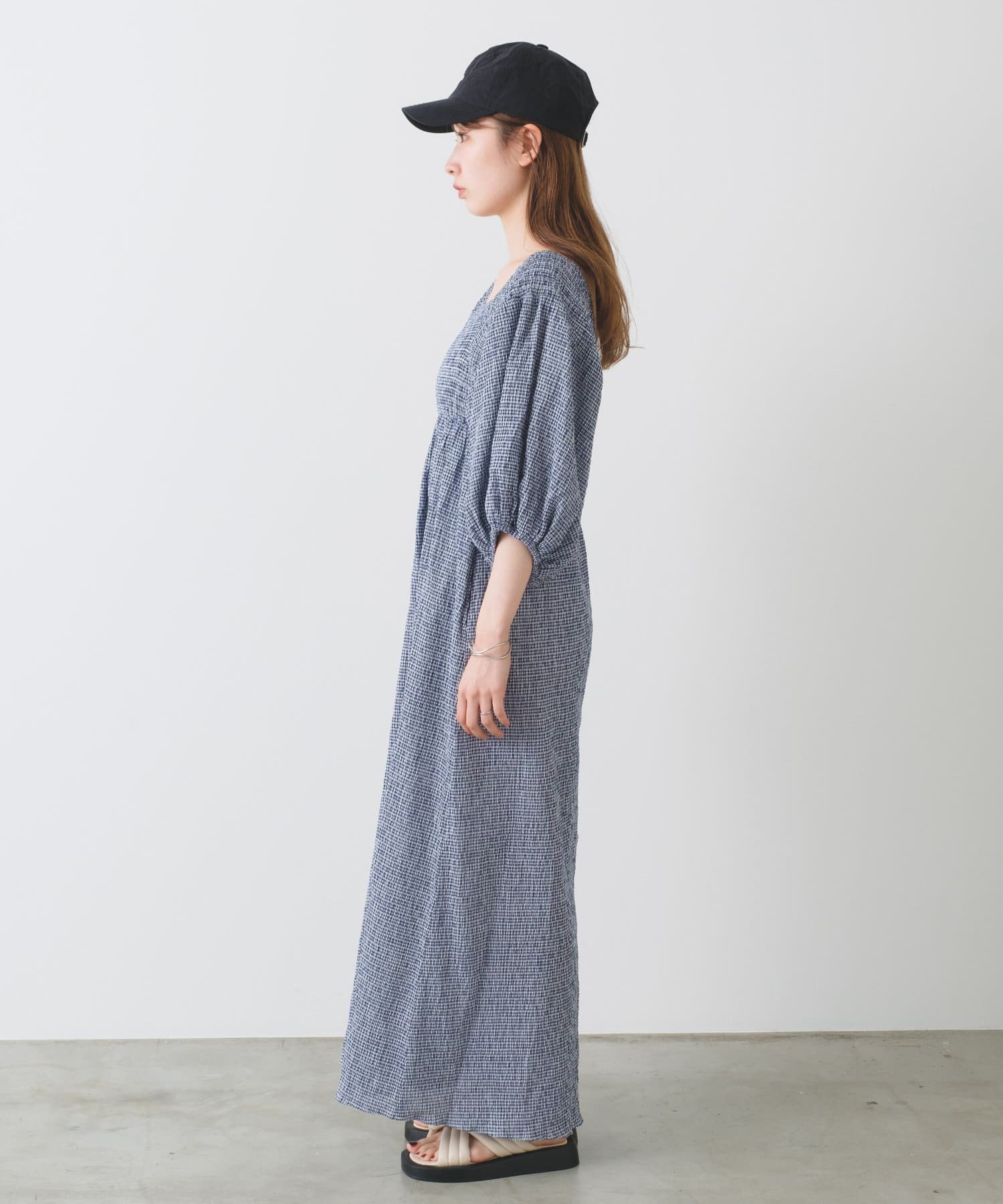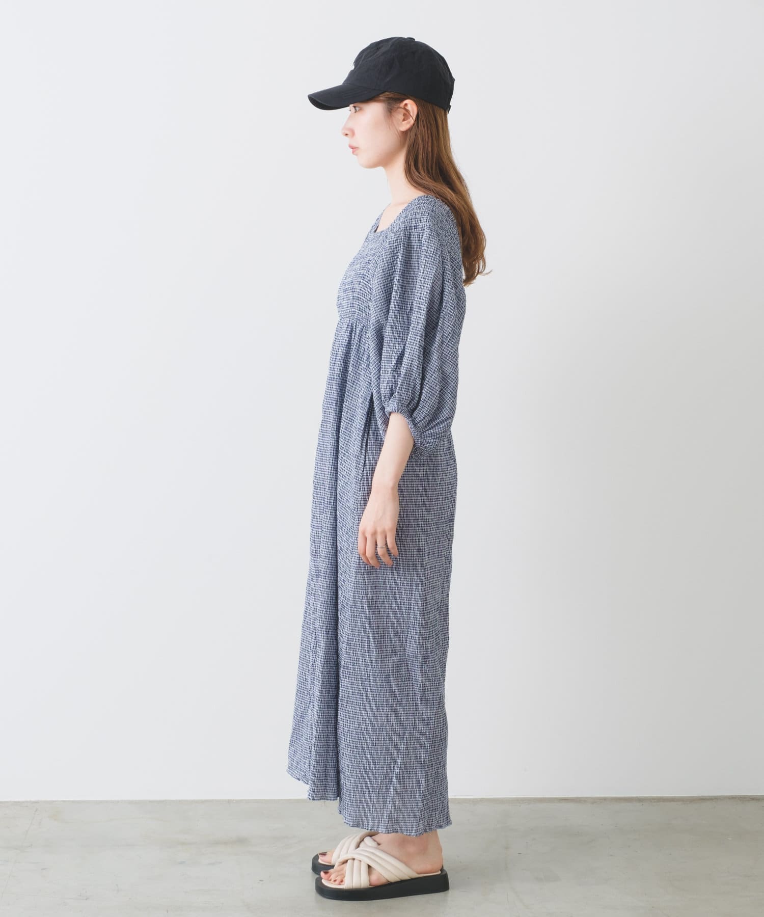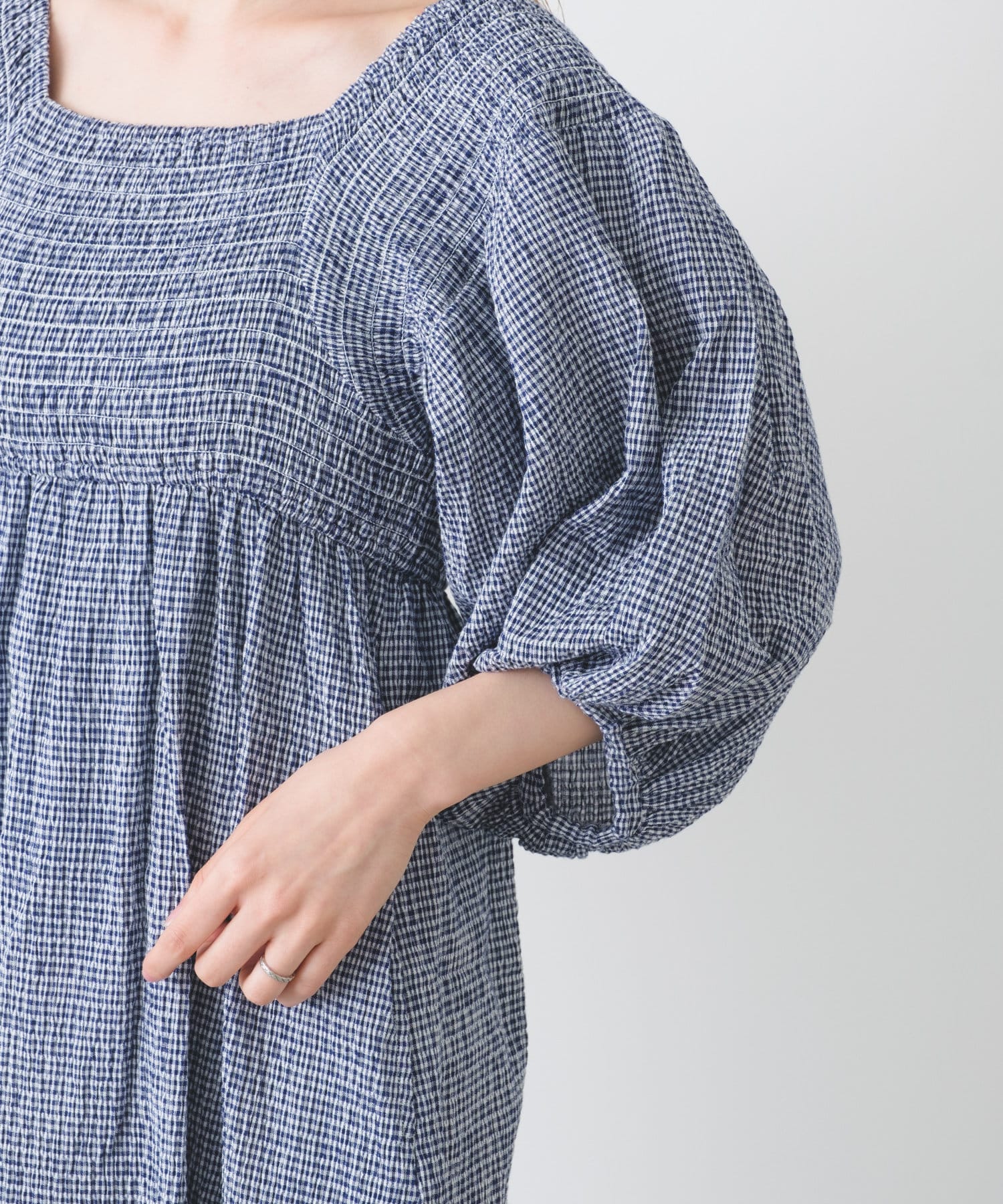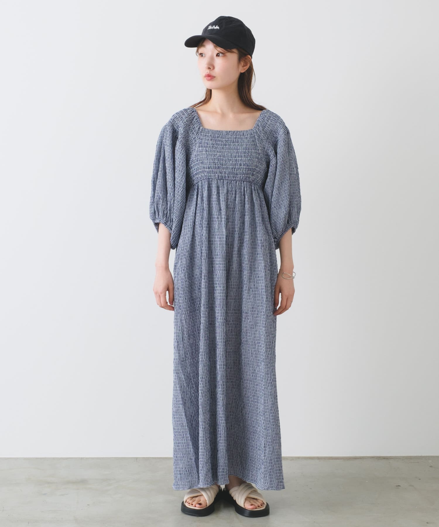 ギンガムチェックとシャーリングデザインが女性らしいワンピース。