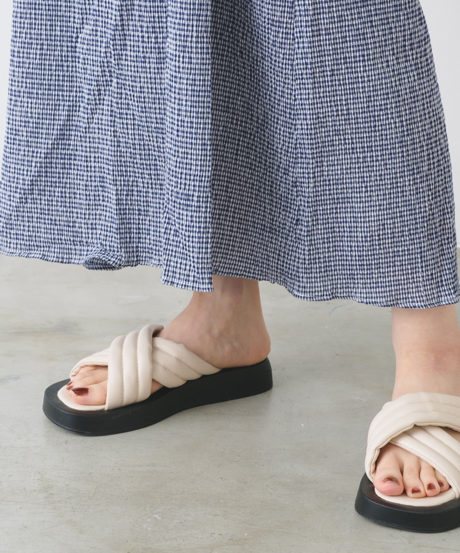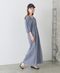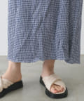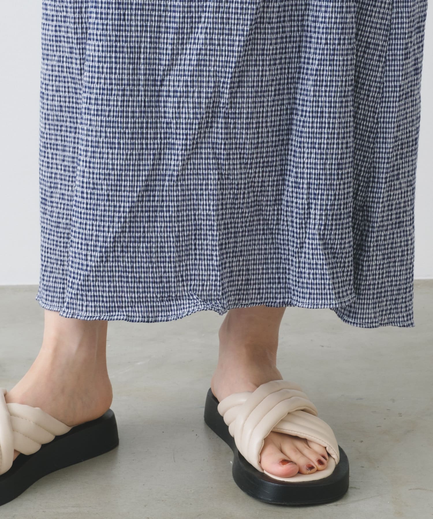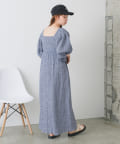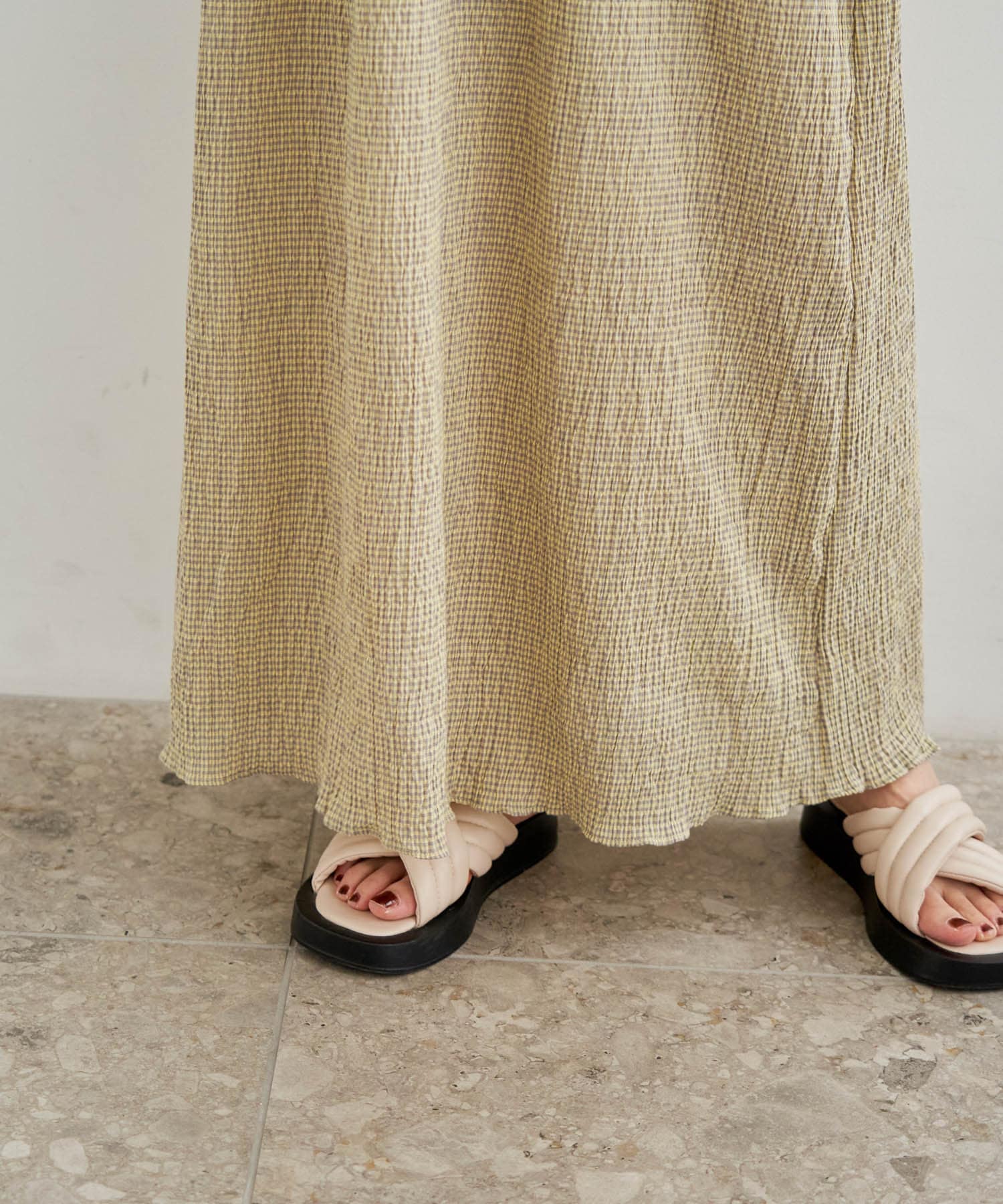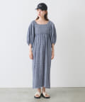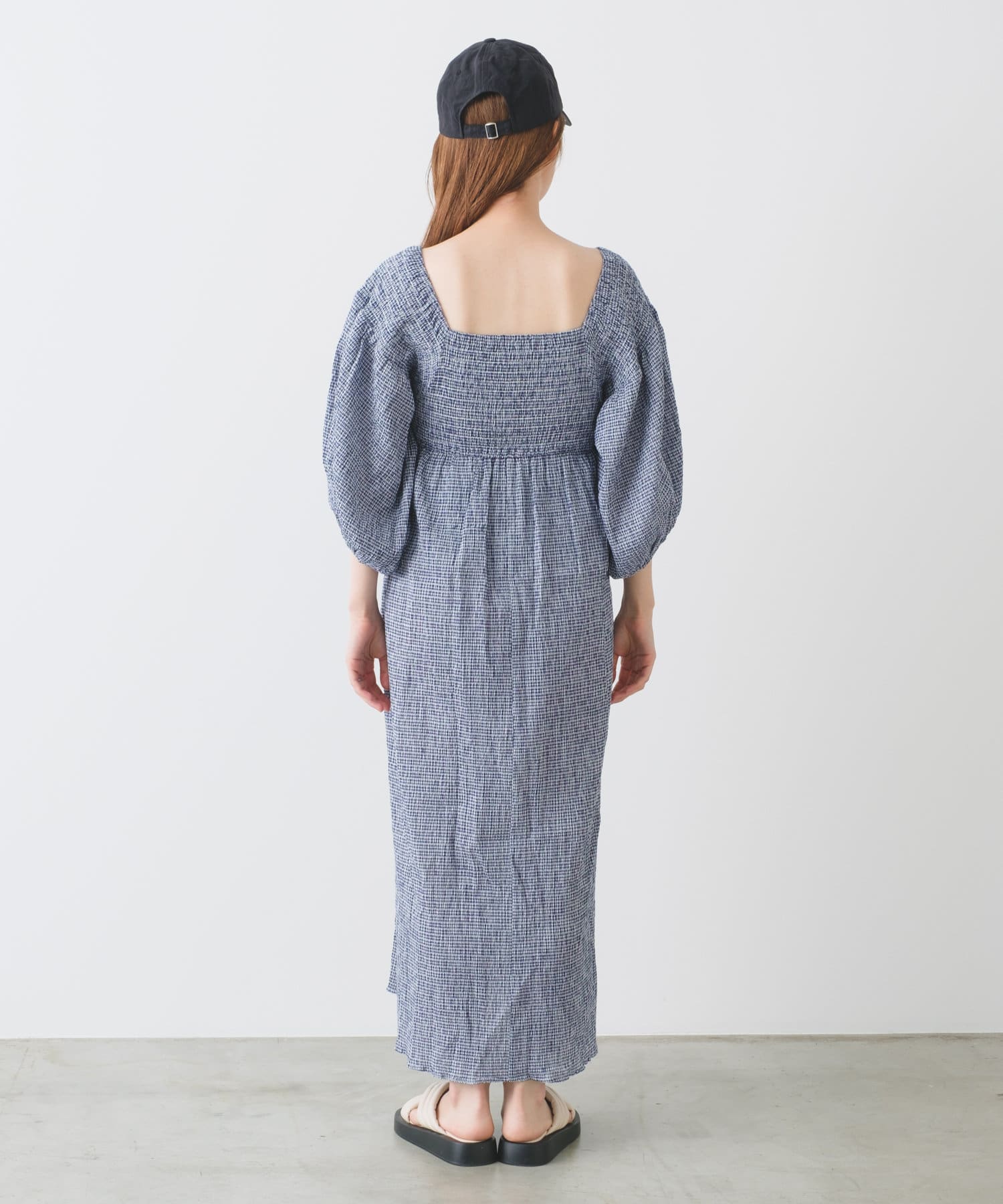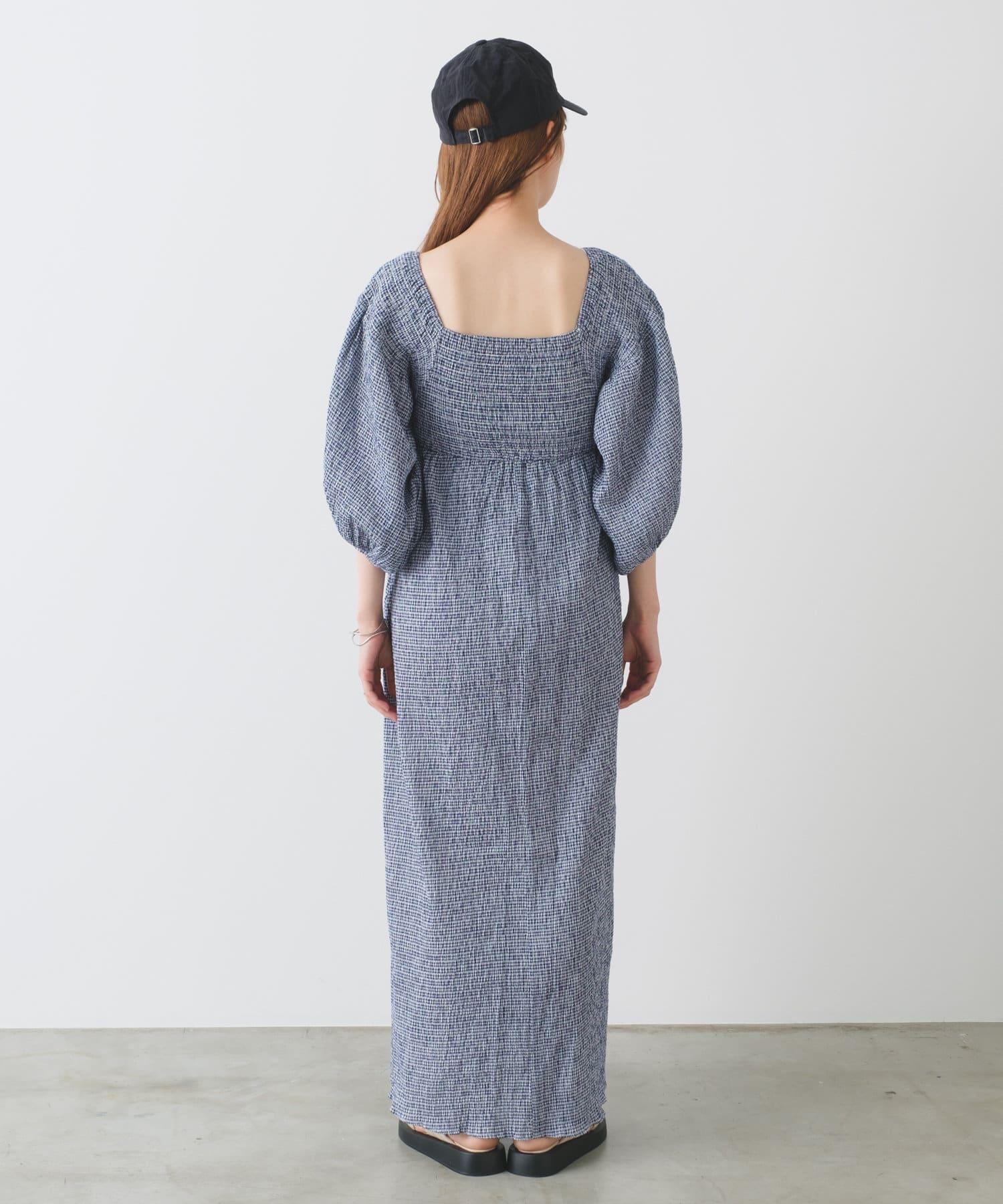 ギンガムチェックとシャーリングデザインが女性らしいワンピース。