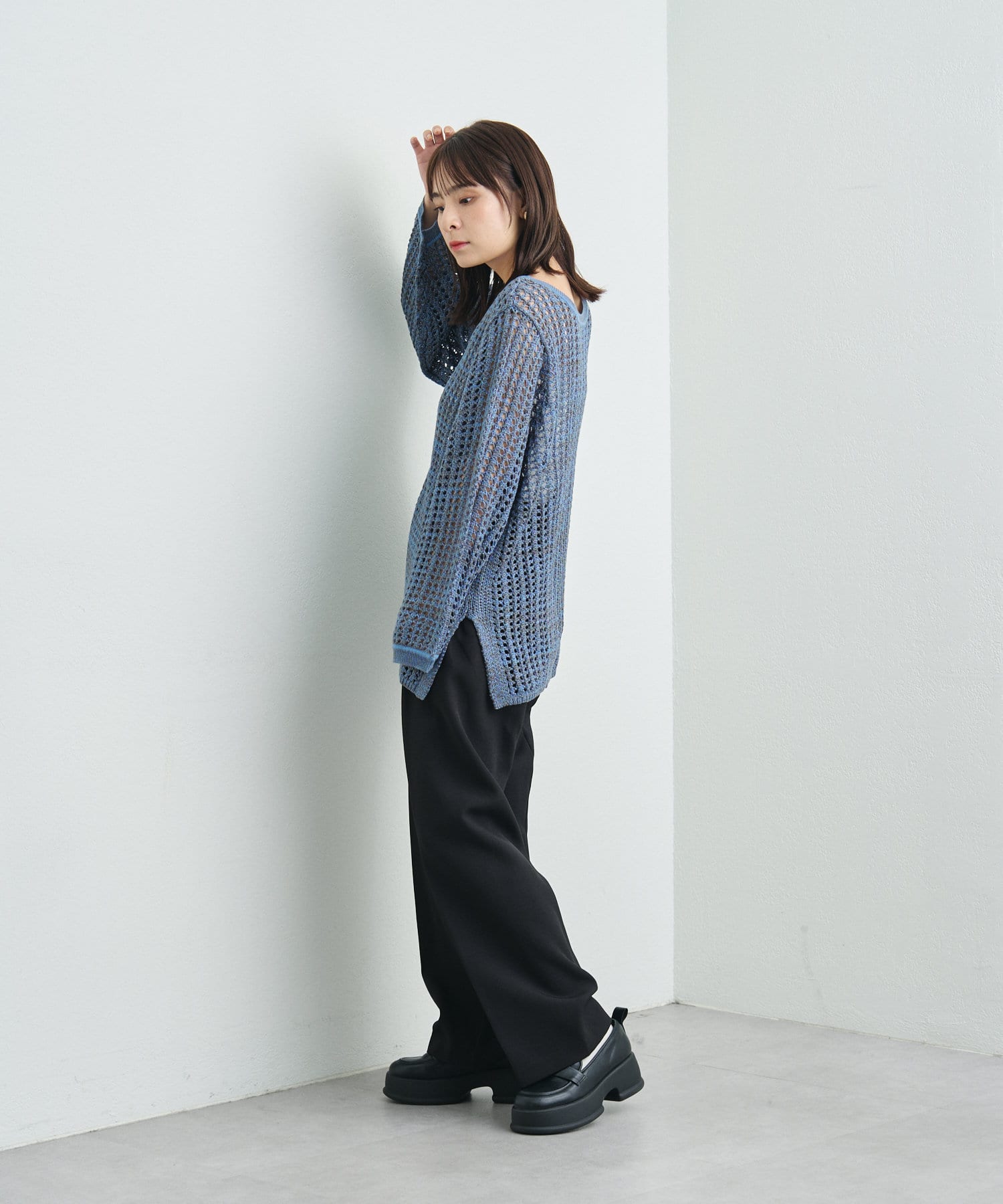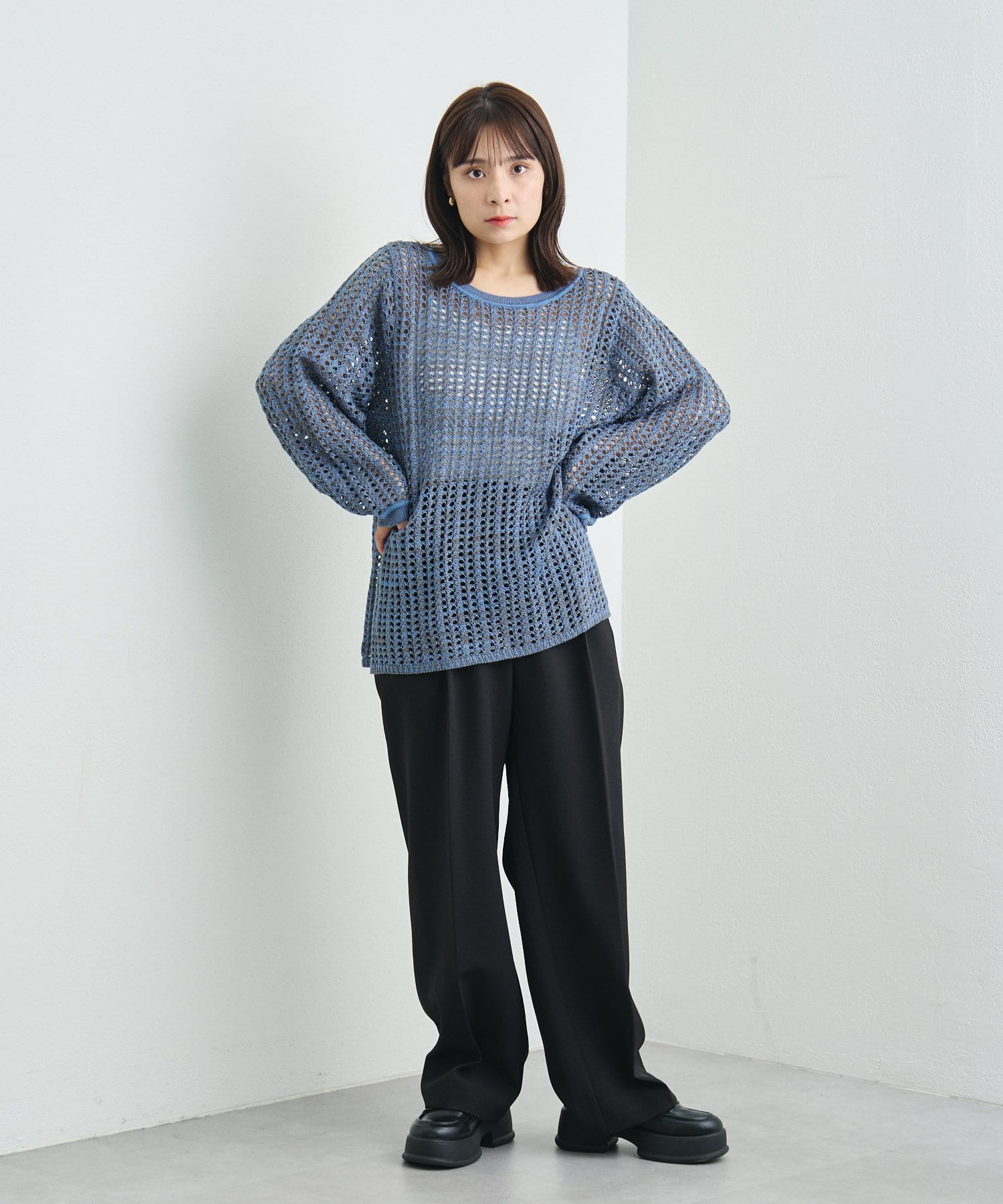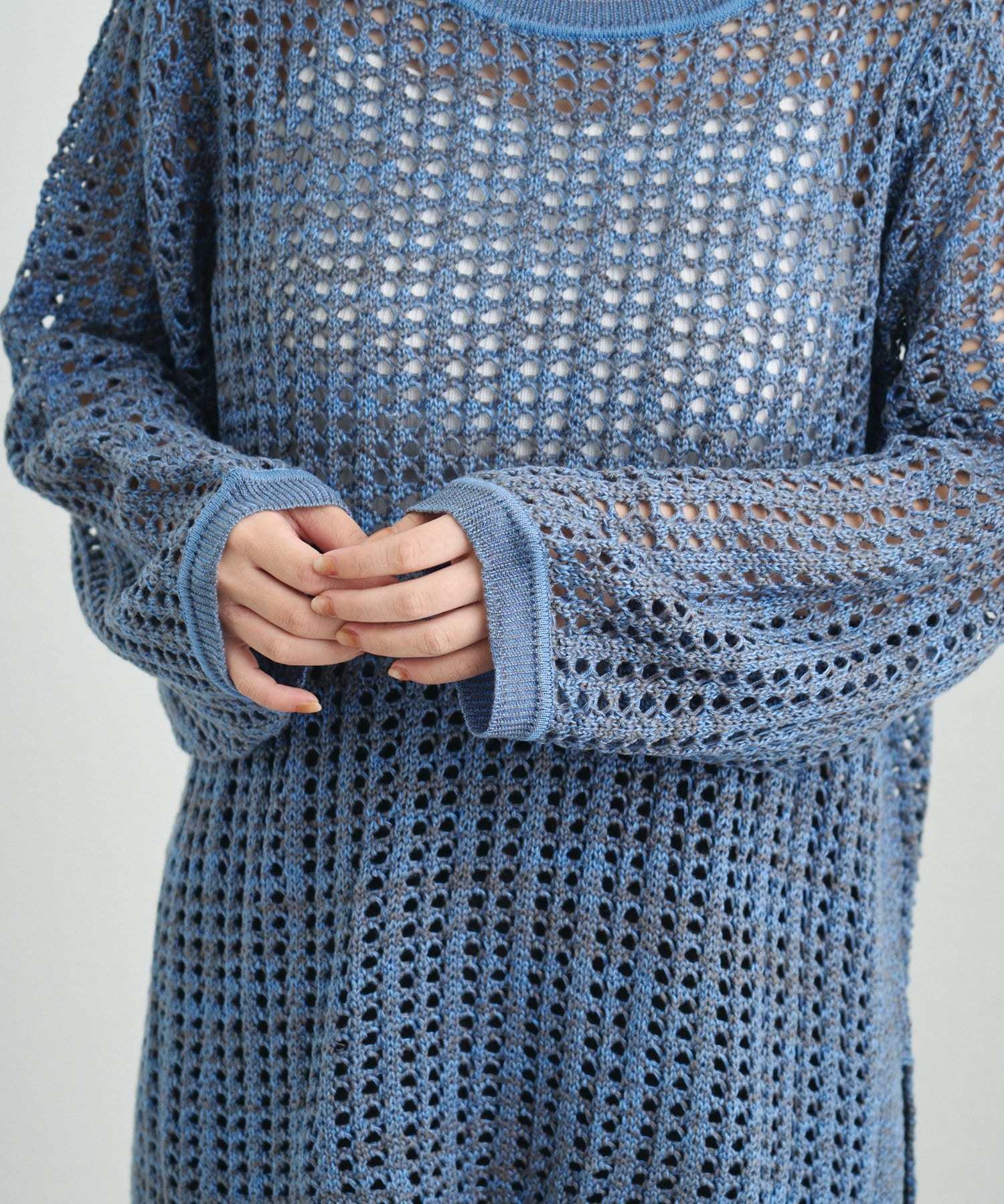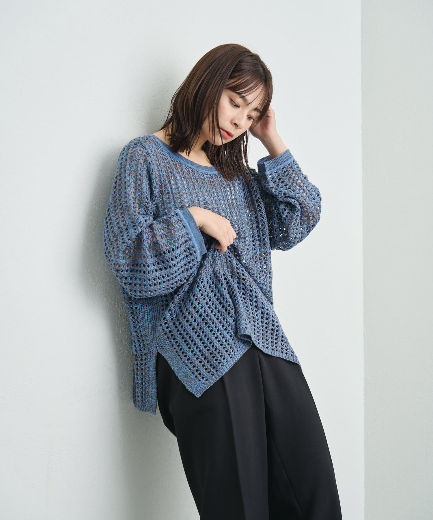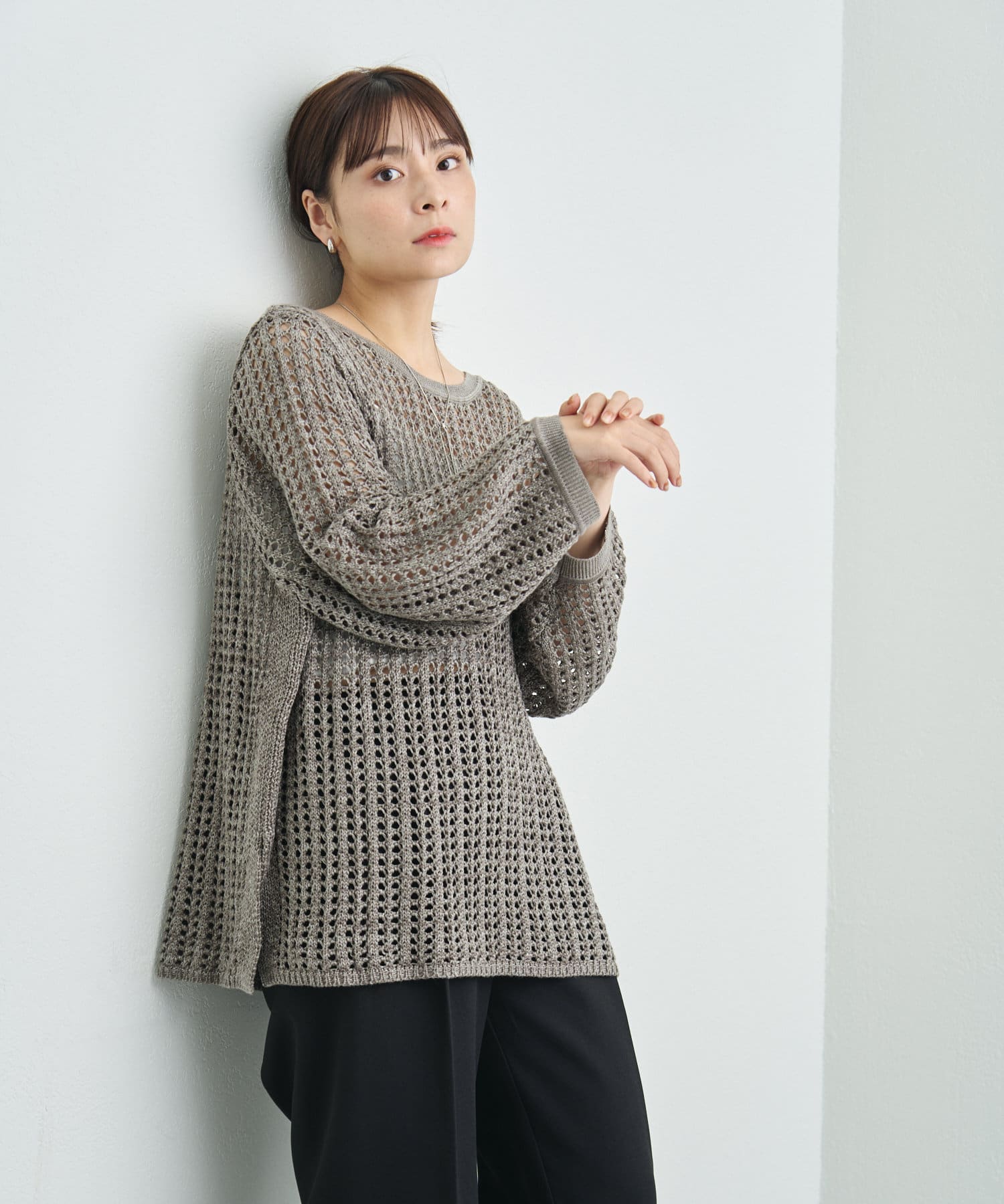 混じり気のある生地感が目を惹く透かし編みニット