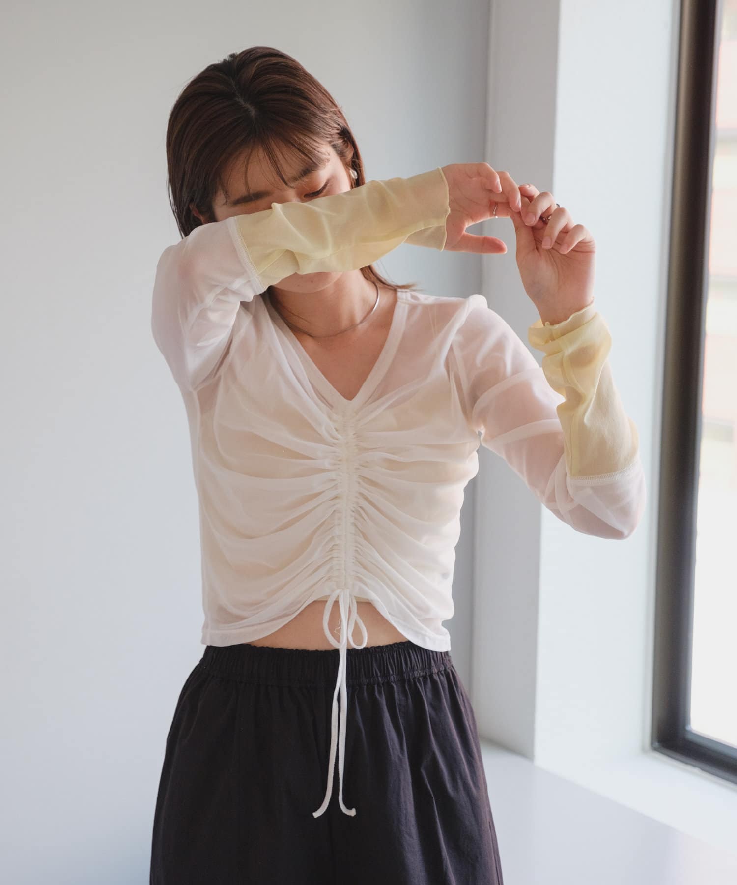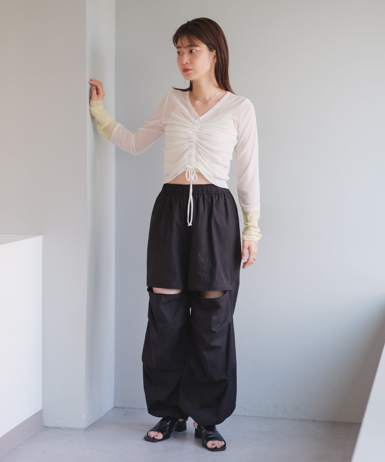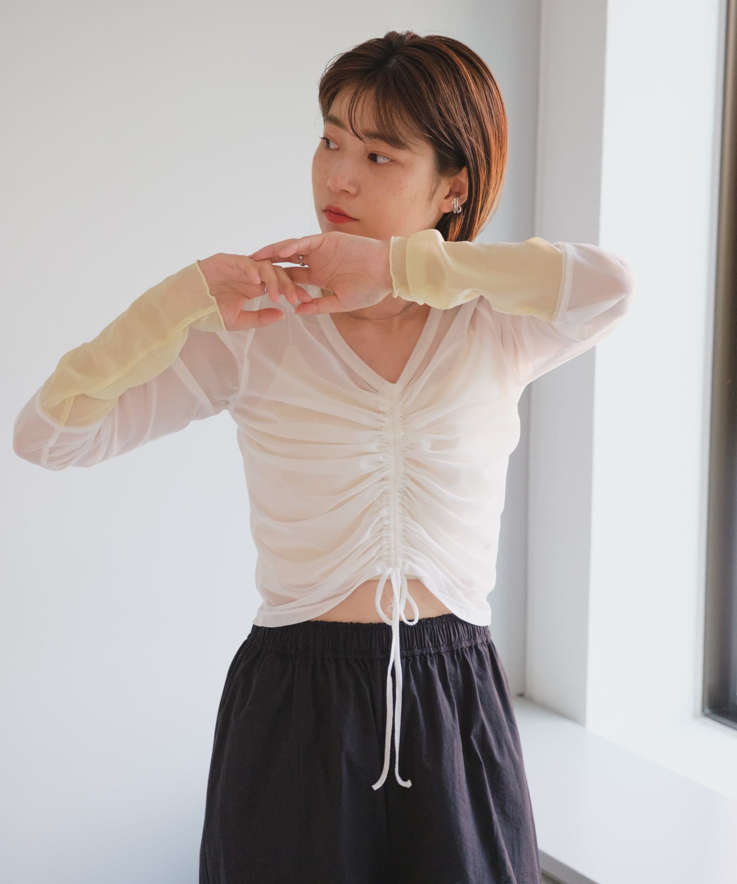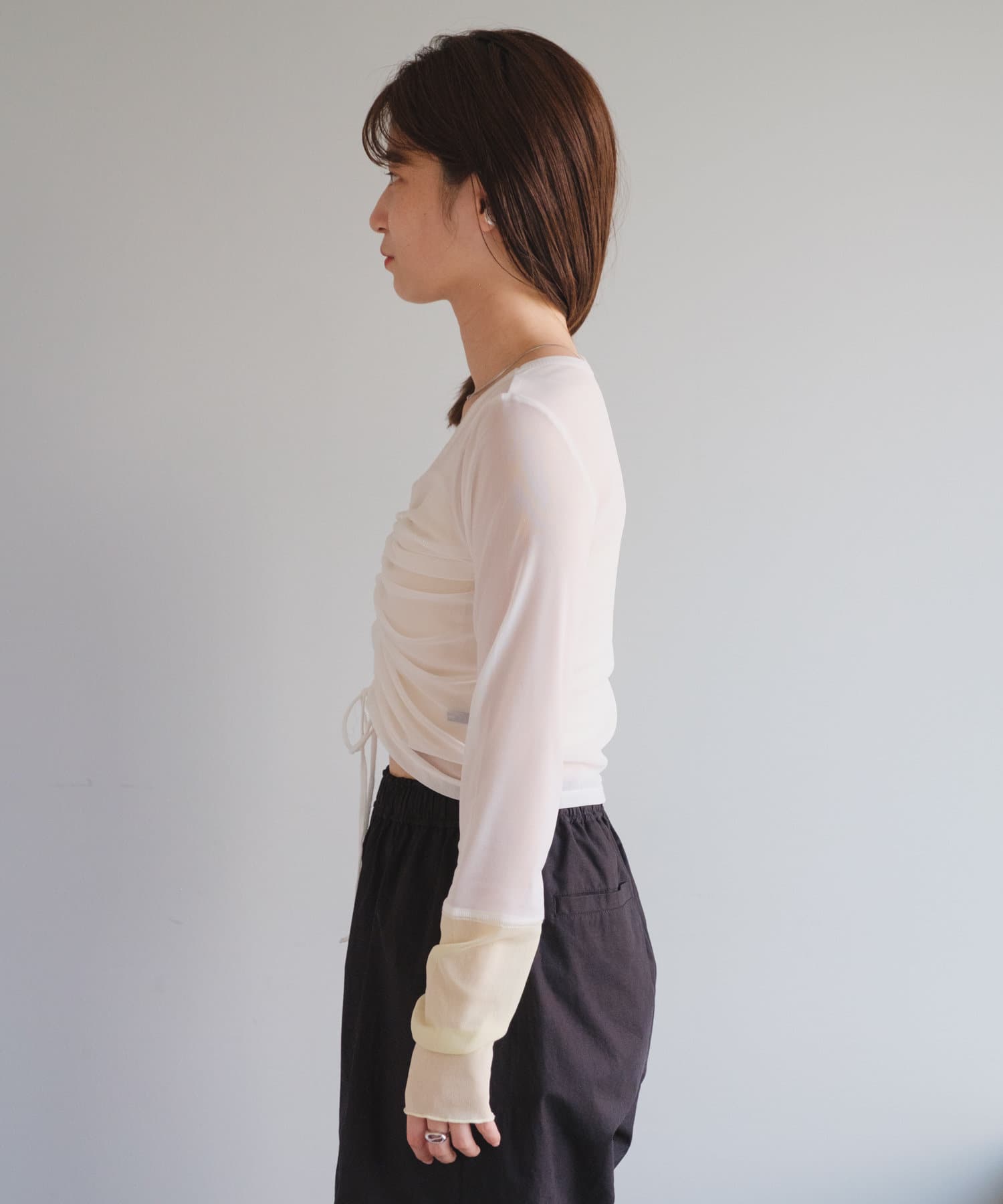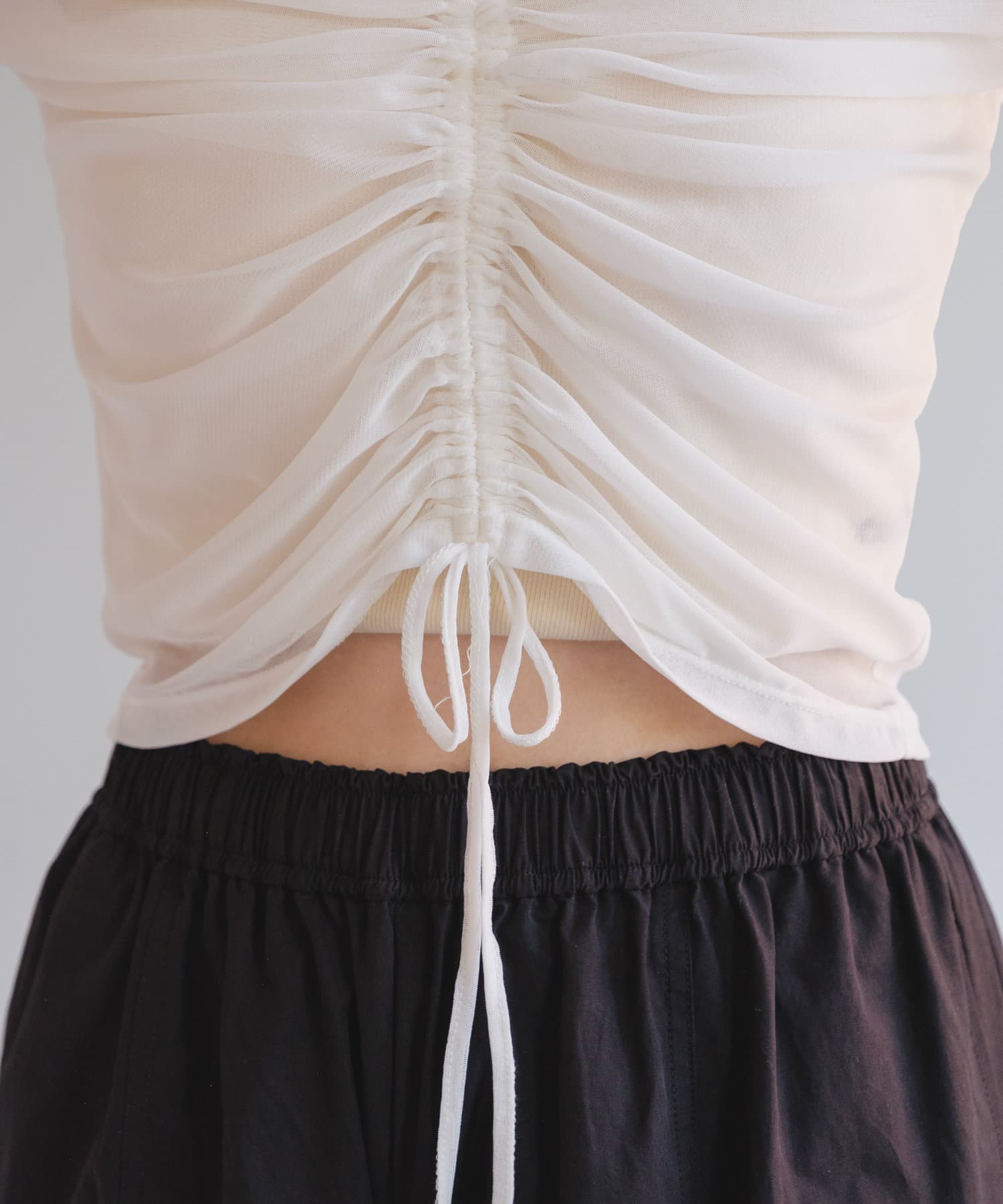 シャーリングは裾の紐で調節可能なので、シルエットの変化を楽しめます。