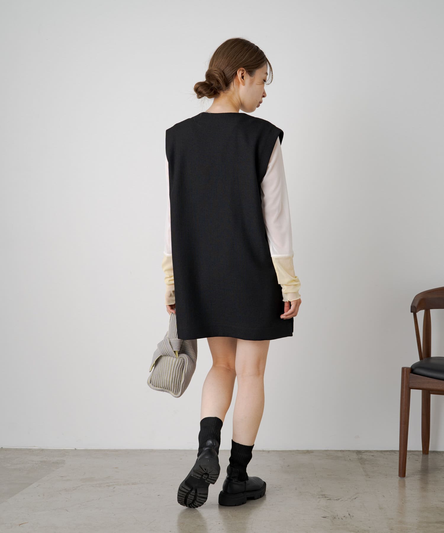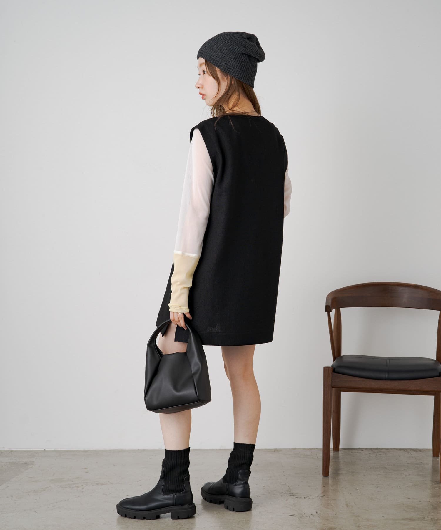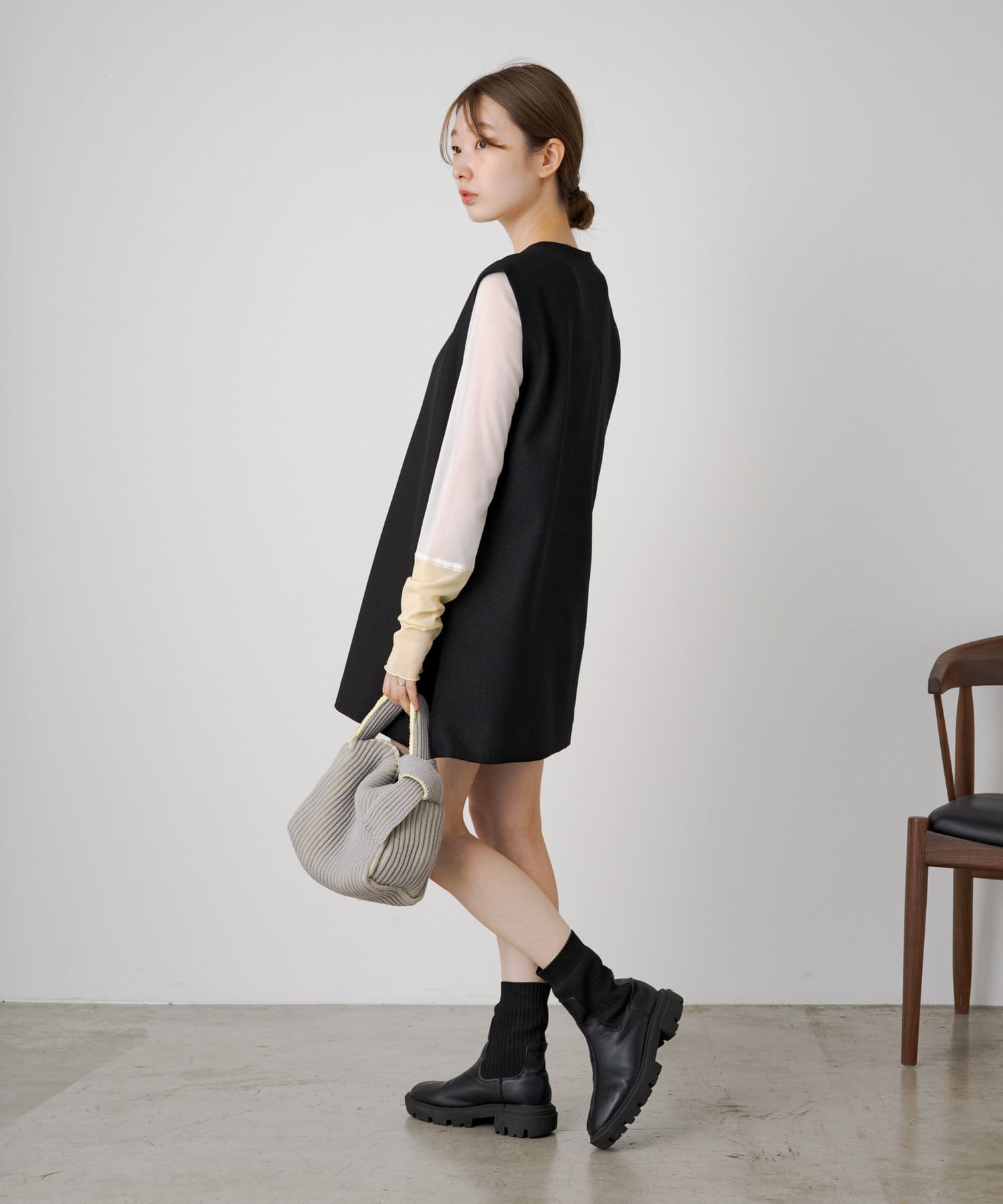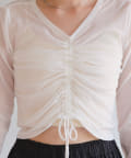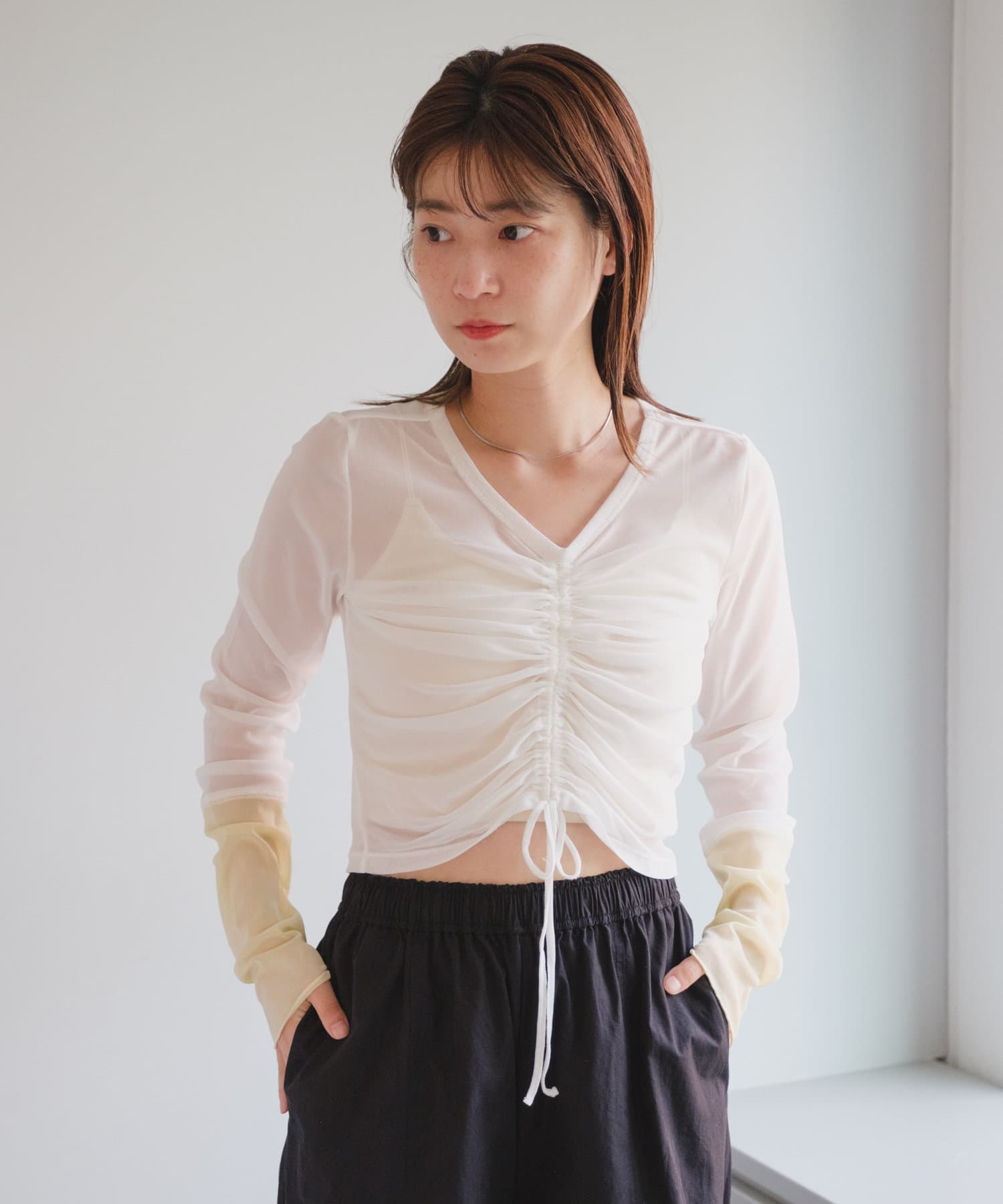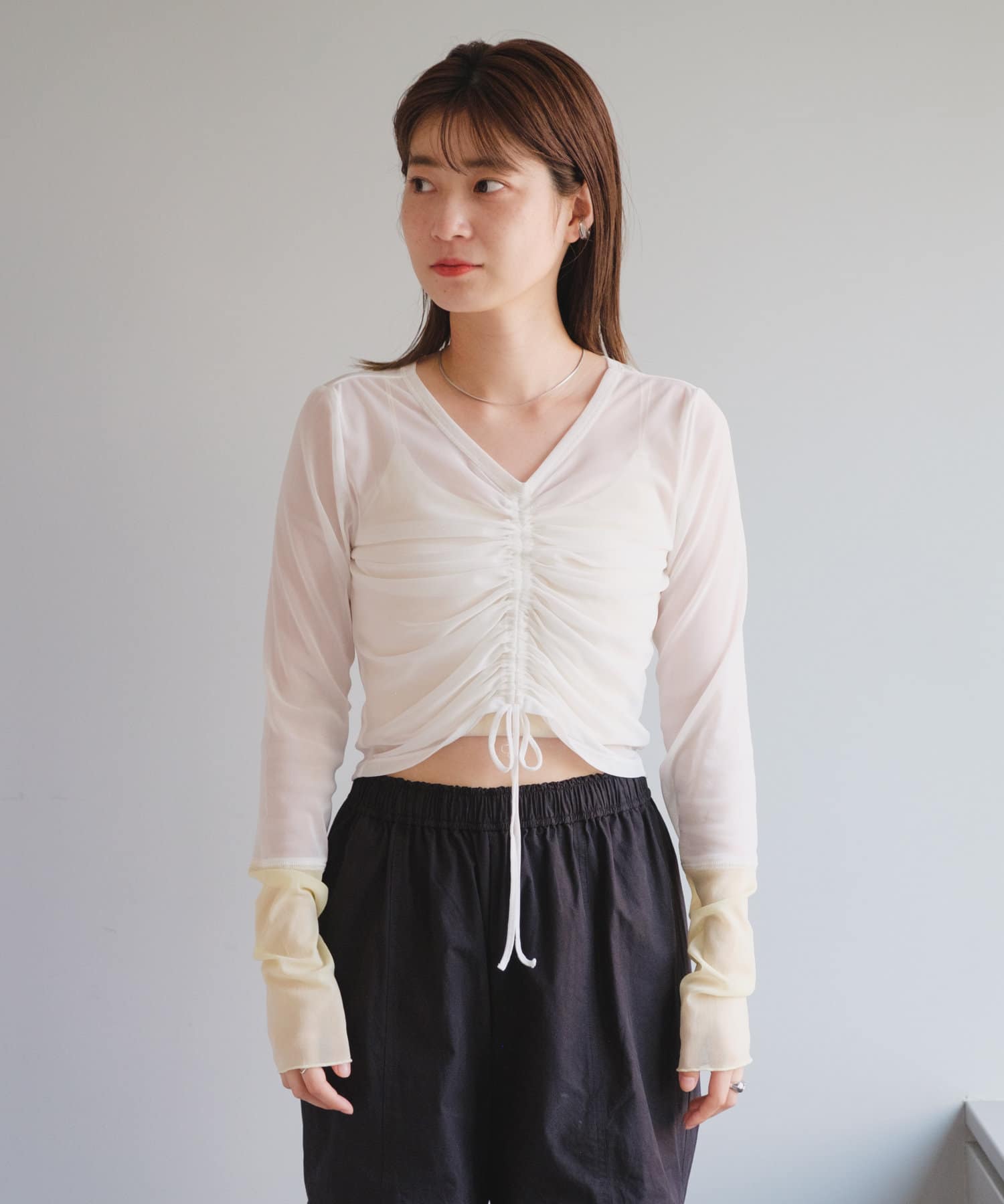 シャーリングは裾の紐で調節可能なので、シルエットの変化を楽しめます。
