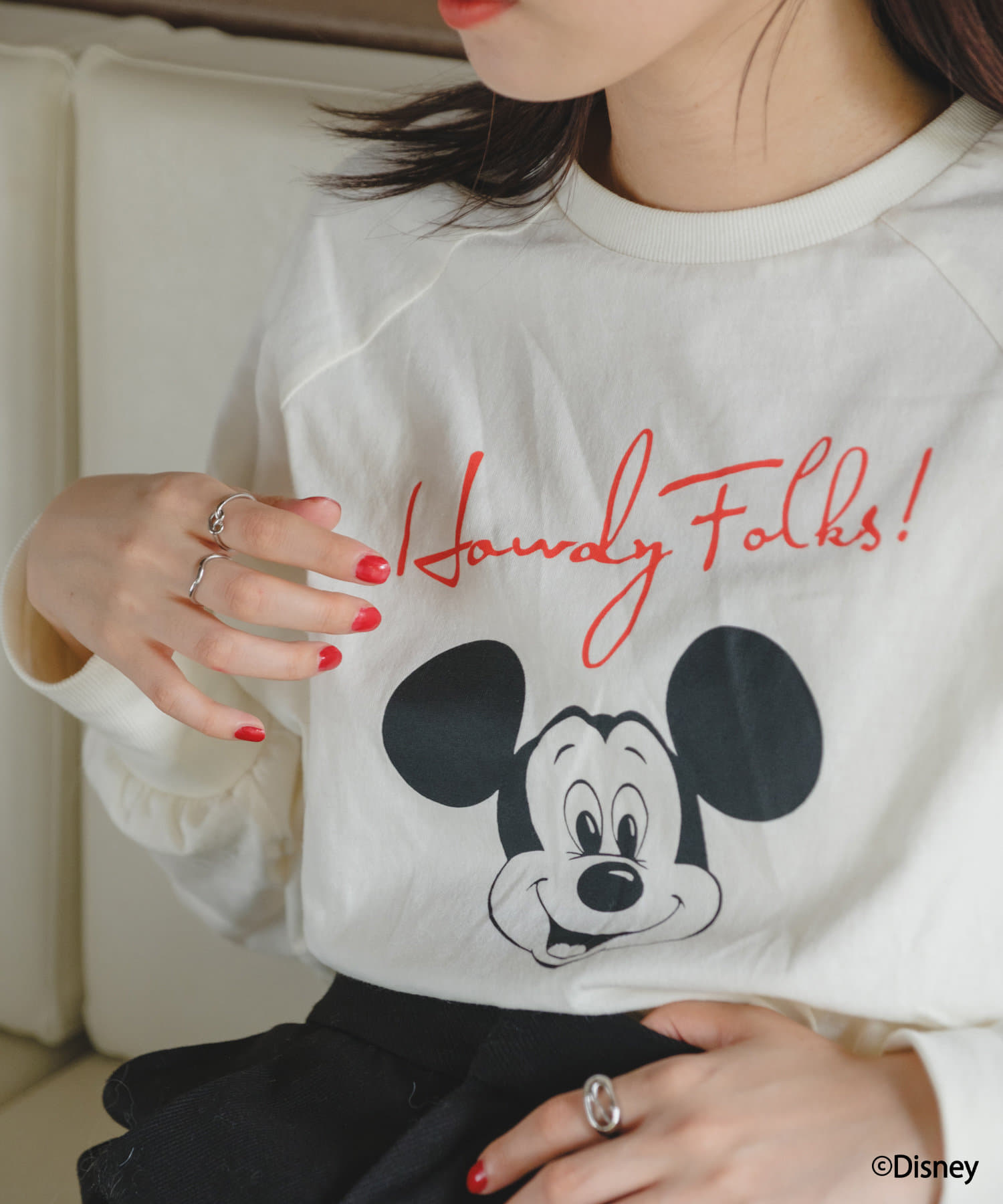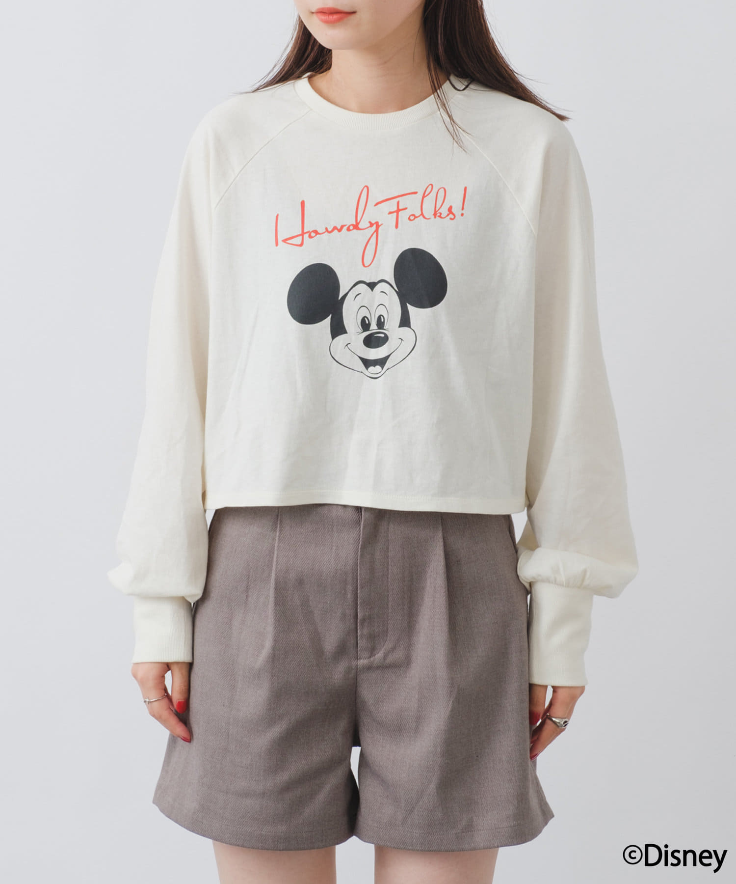 ミッキーだけど主張激しくなくて◎。丈がかなり短いので、ハイウェストのボトムスと合わせるか、シャツを中に着たり、ワンピースの上から着たりしようと思います。