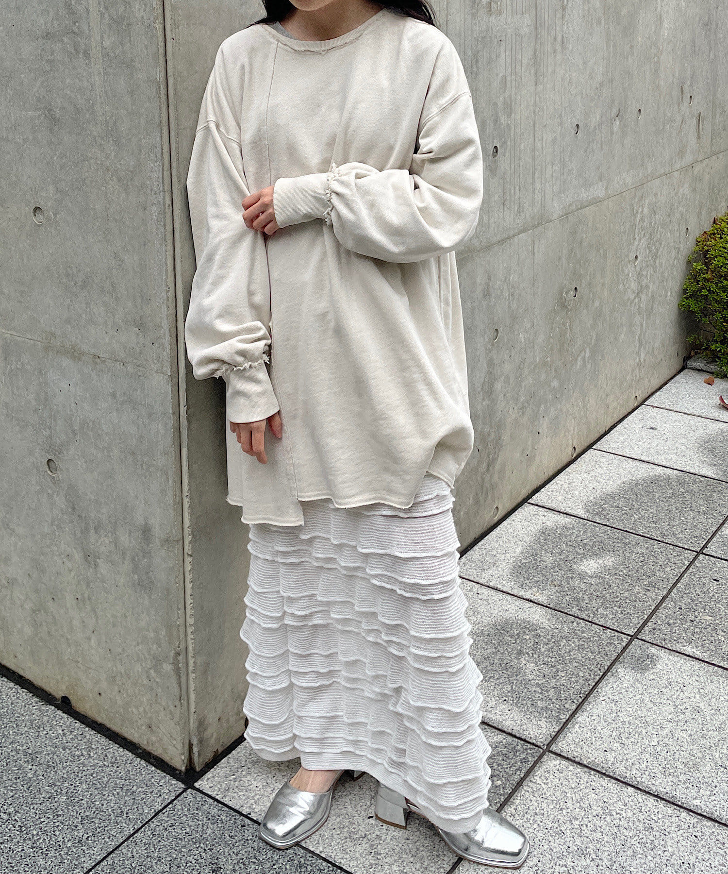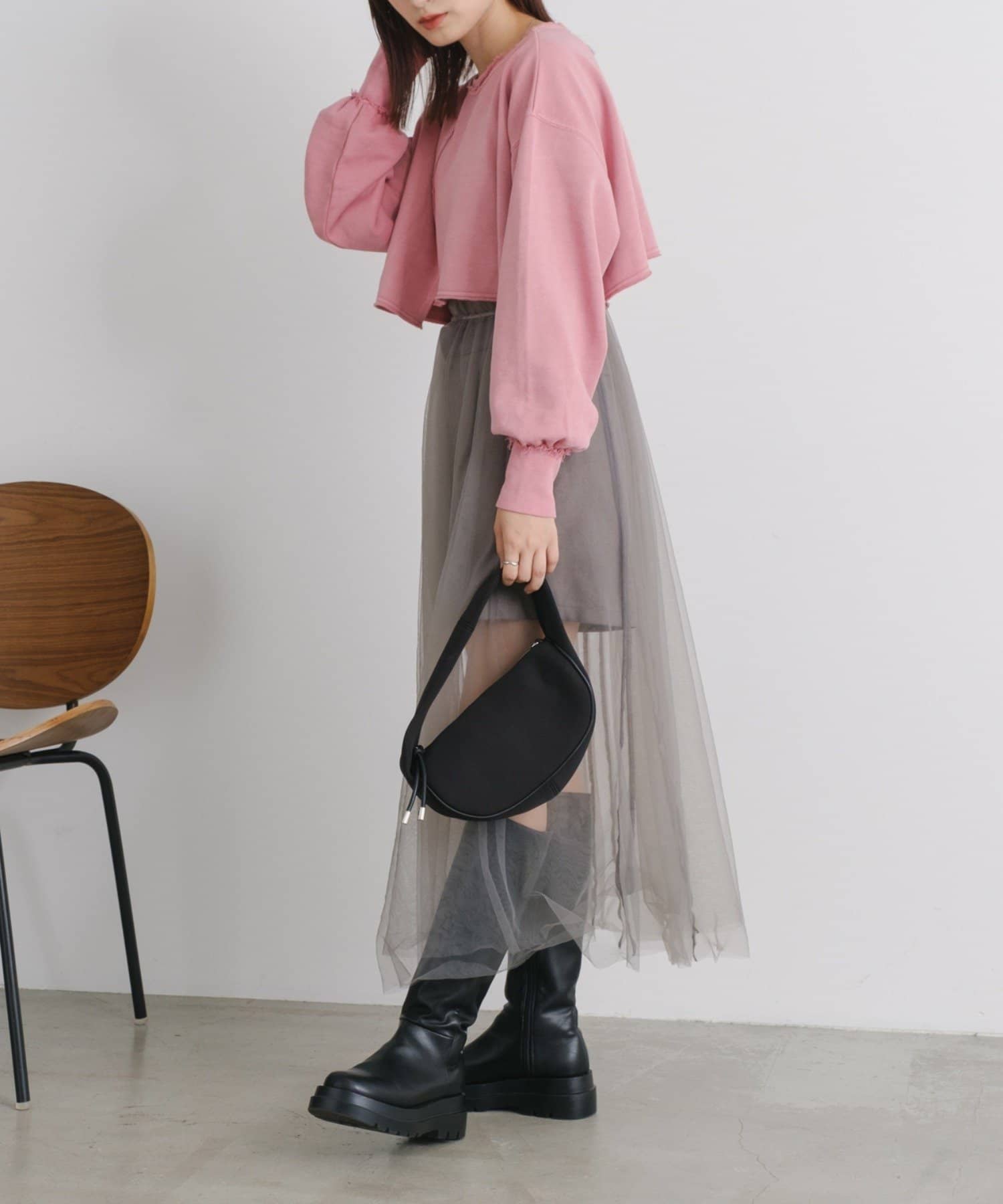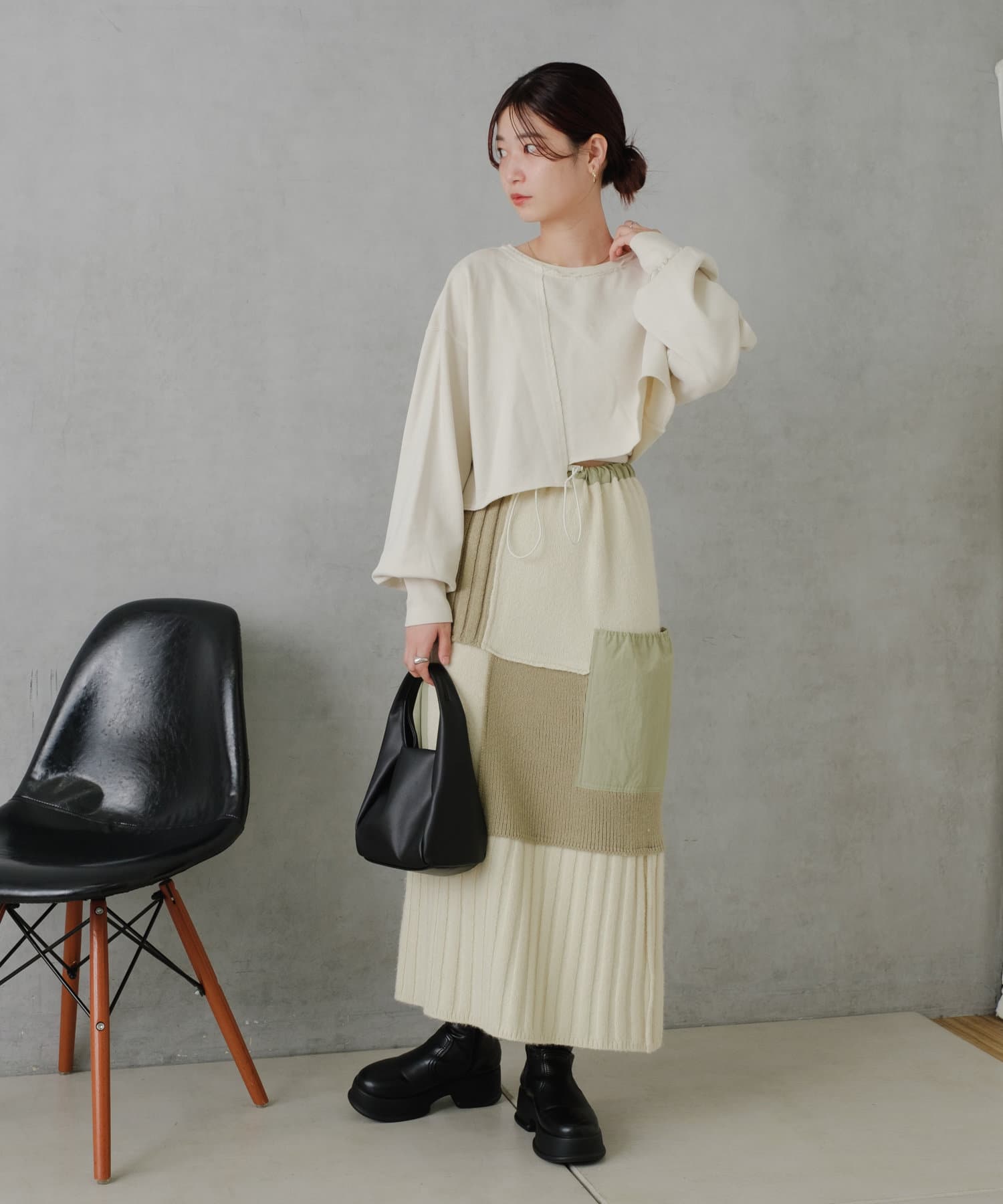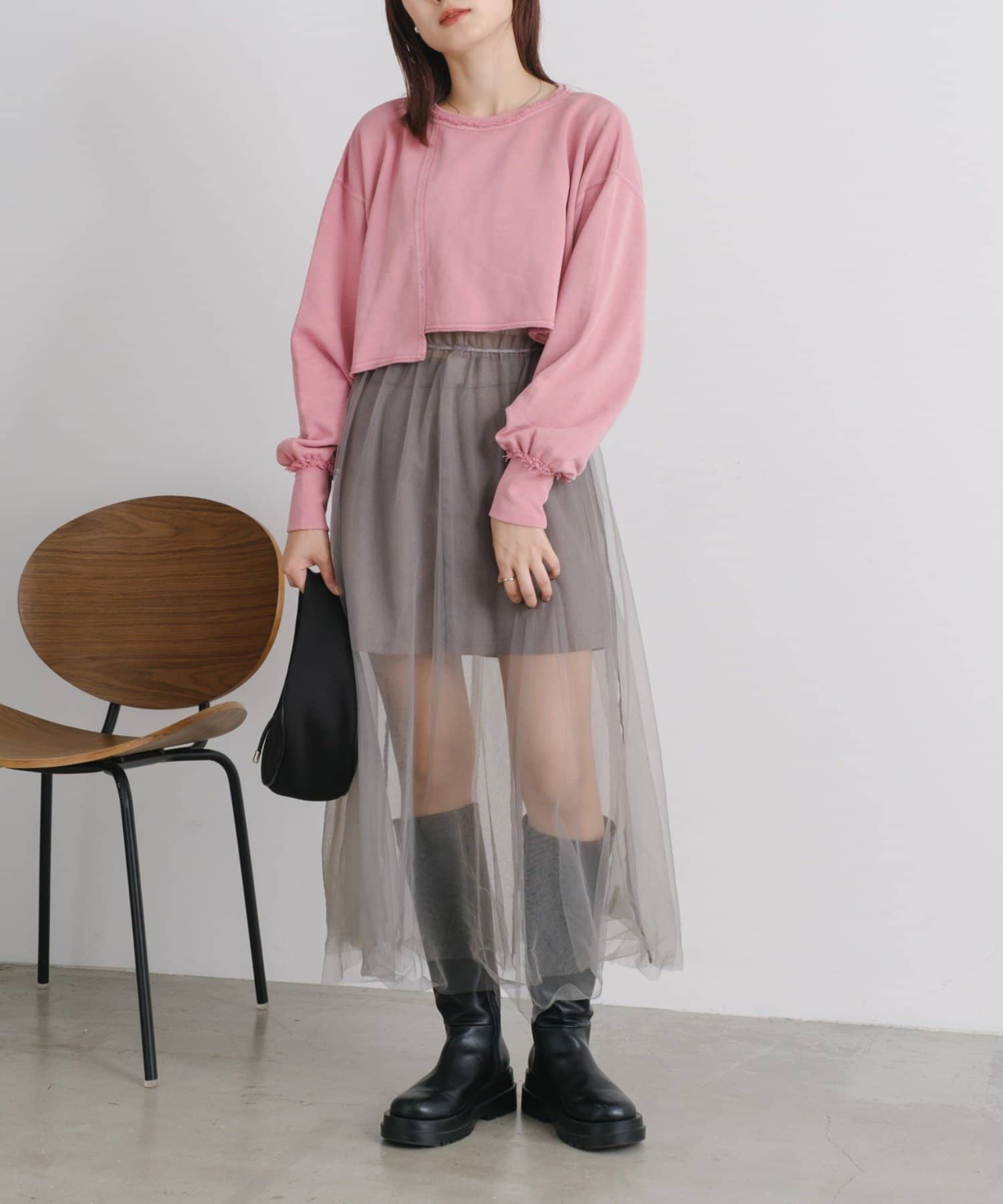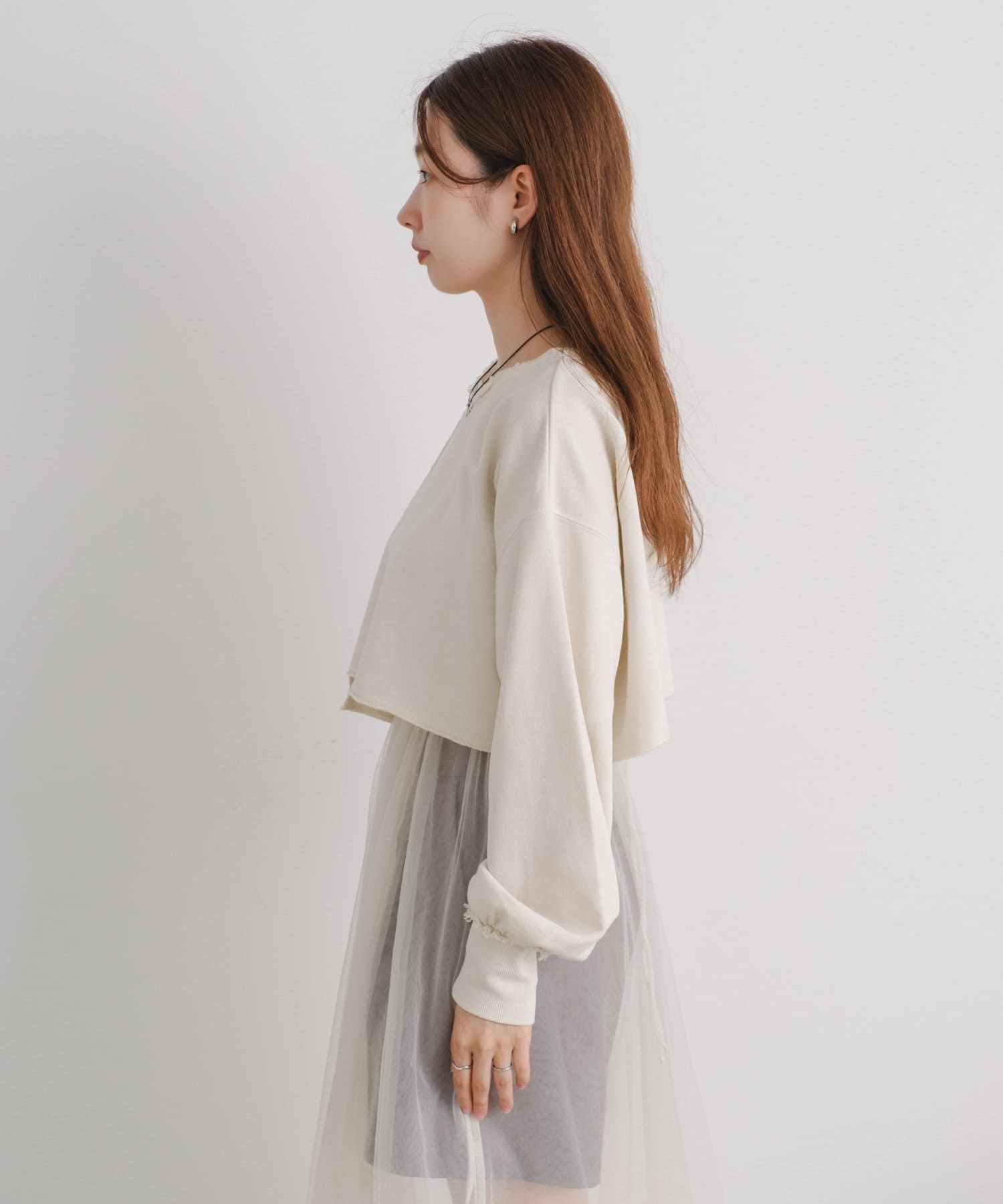 Sサイズはワイドパンツやロングスカートの他、キャミワンピースの上から被るなどのレイヤードスタイルもバランスよく着ていただけます。